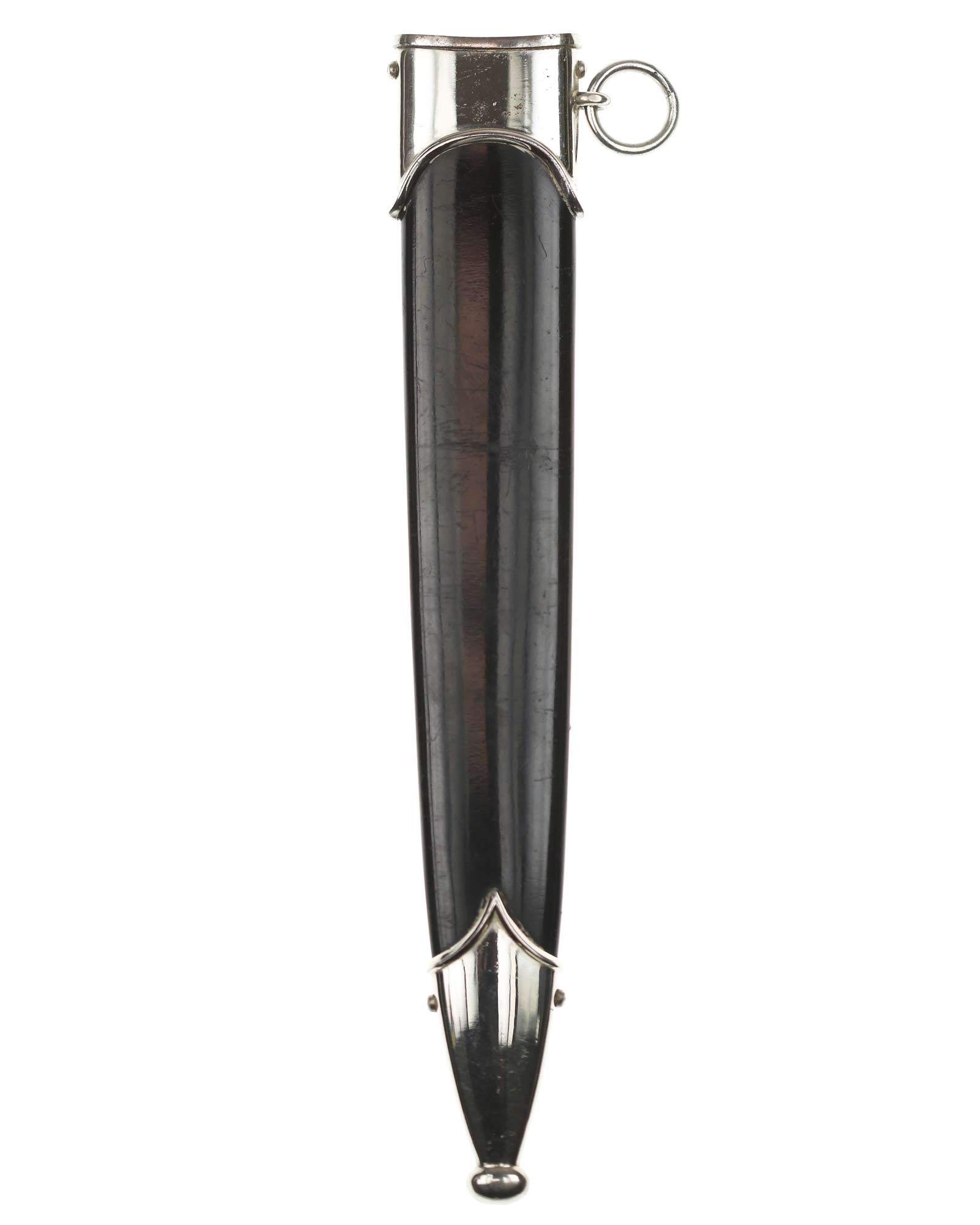 Scabbard: The scabbard shell is completely straight. The scabbard, all in all, is in a very fine condition. The scabbard mounts continue the theme of matching patination, and are both in excellent condition. These mounts are retained by the original screws.