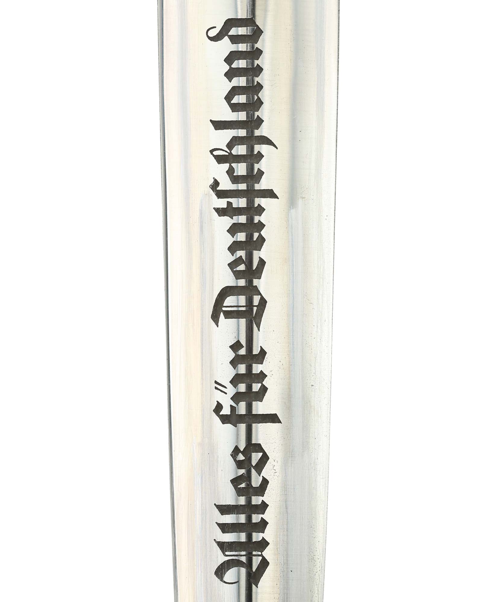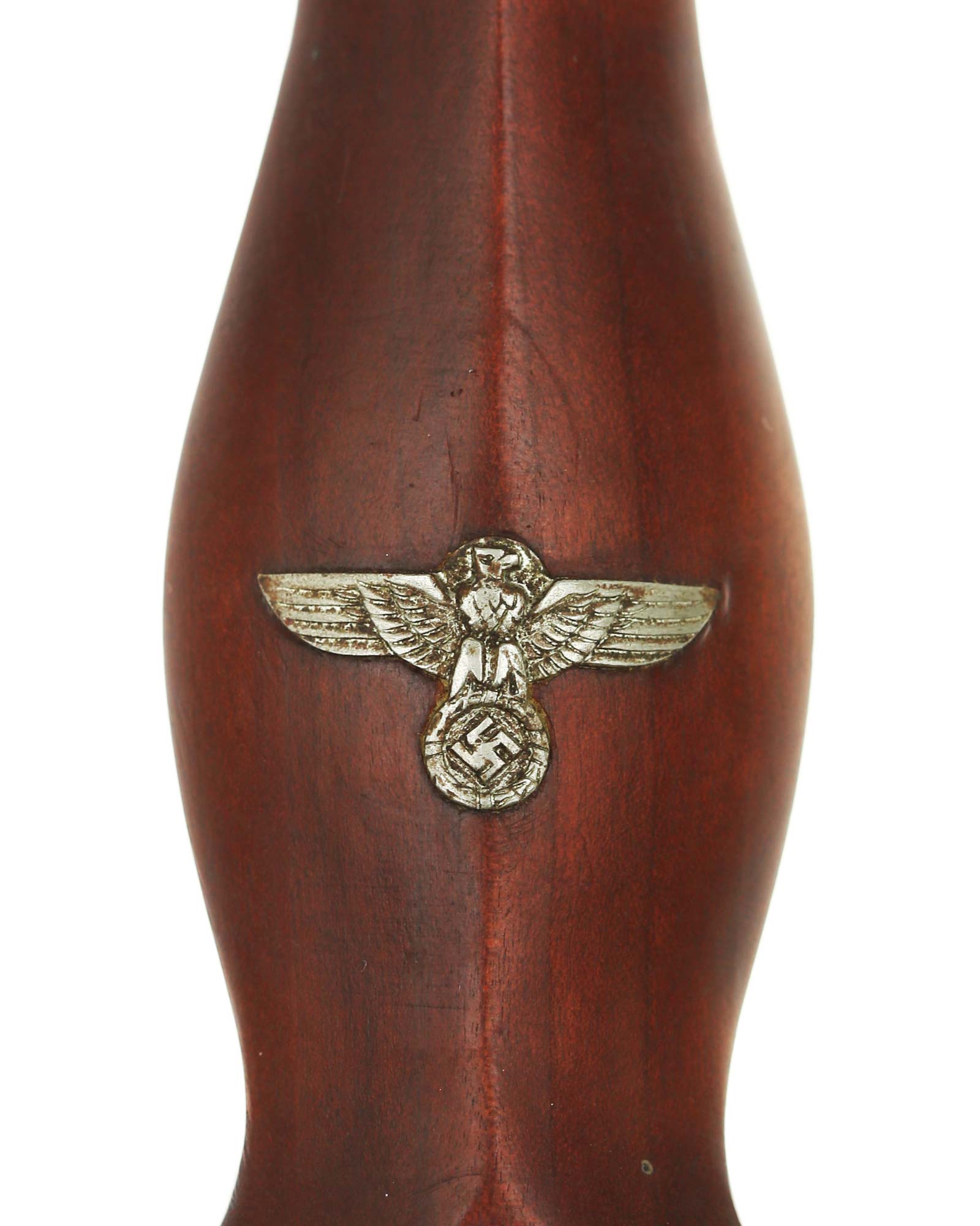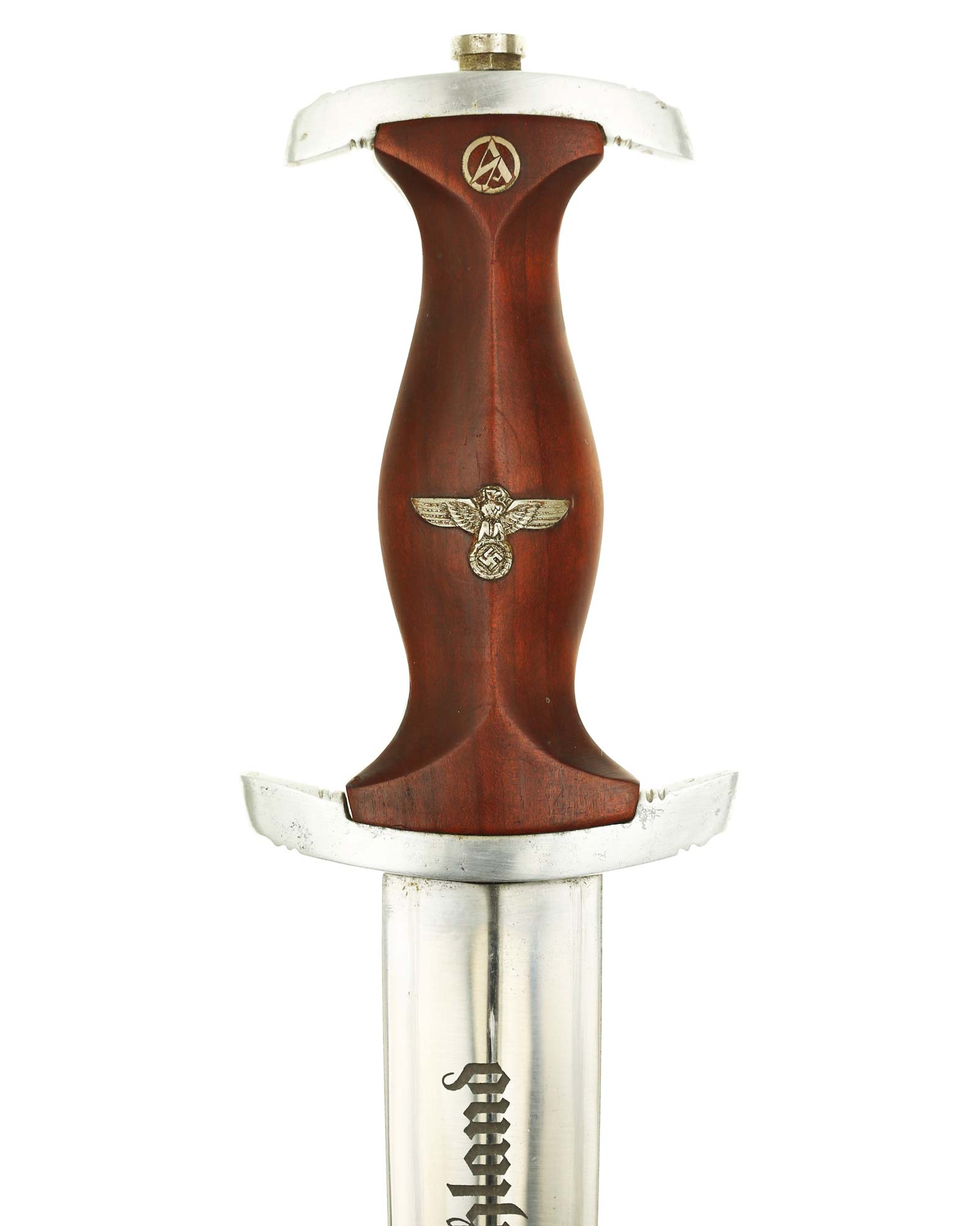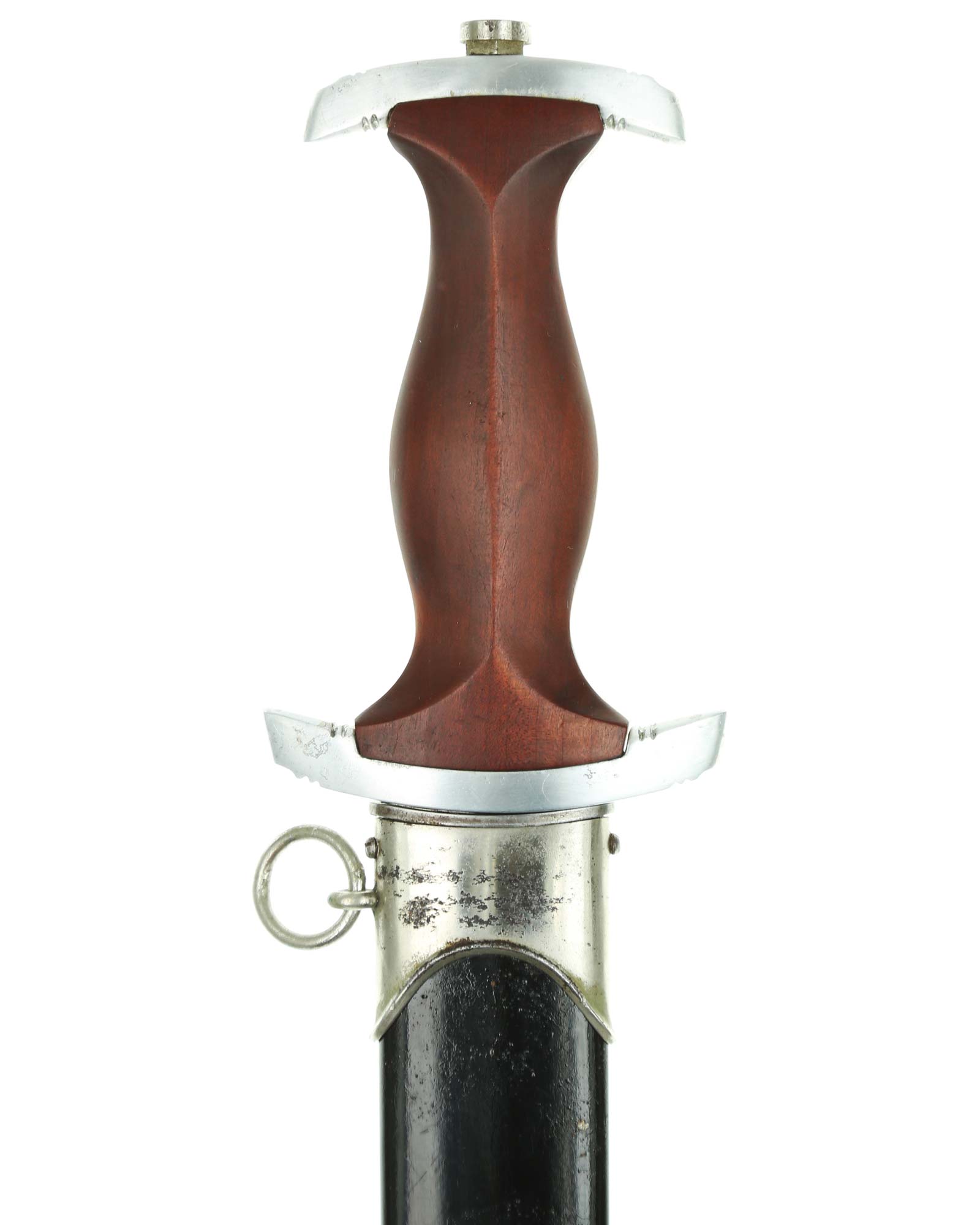 Grip: The grip has extremely high ridge contours, the center ridge being almost sharp to the touch. The wood is most beautiful, with a close grain that runs throughout both sides. The SA runes button is perfectly placed and has no hits to the enamel. The grip eagle is a very fine example. The bird retains all of the detail; the head, breast and wing feathering, talons and wreathed swastika are all crisp. The grip is in perfect condition and fits the crossguards.