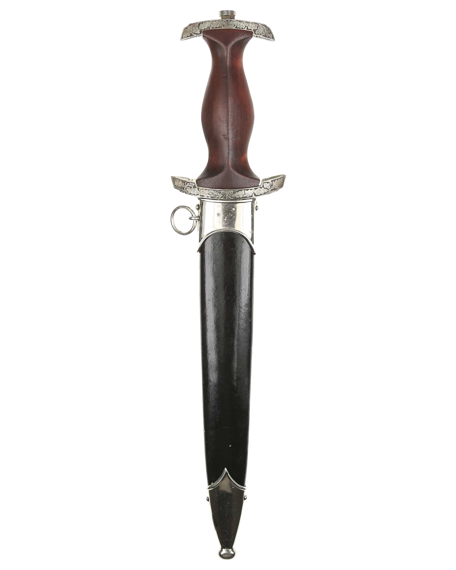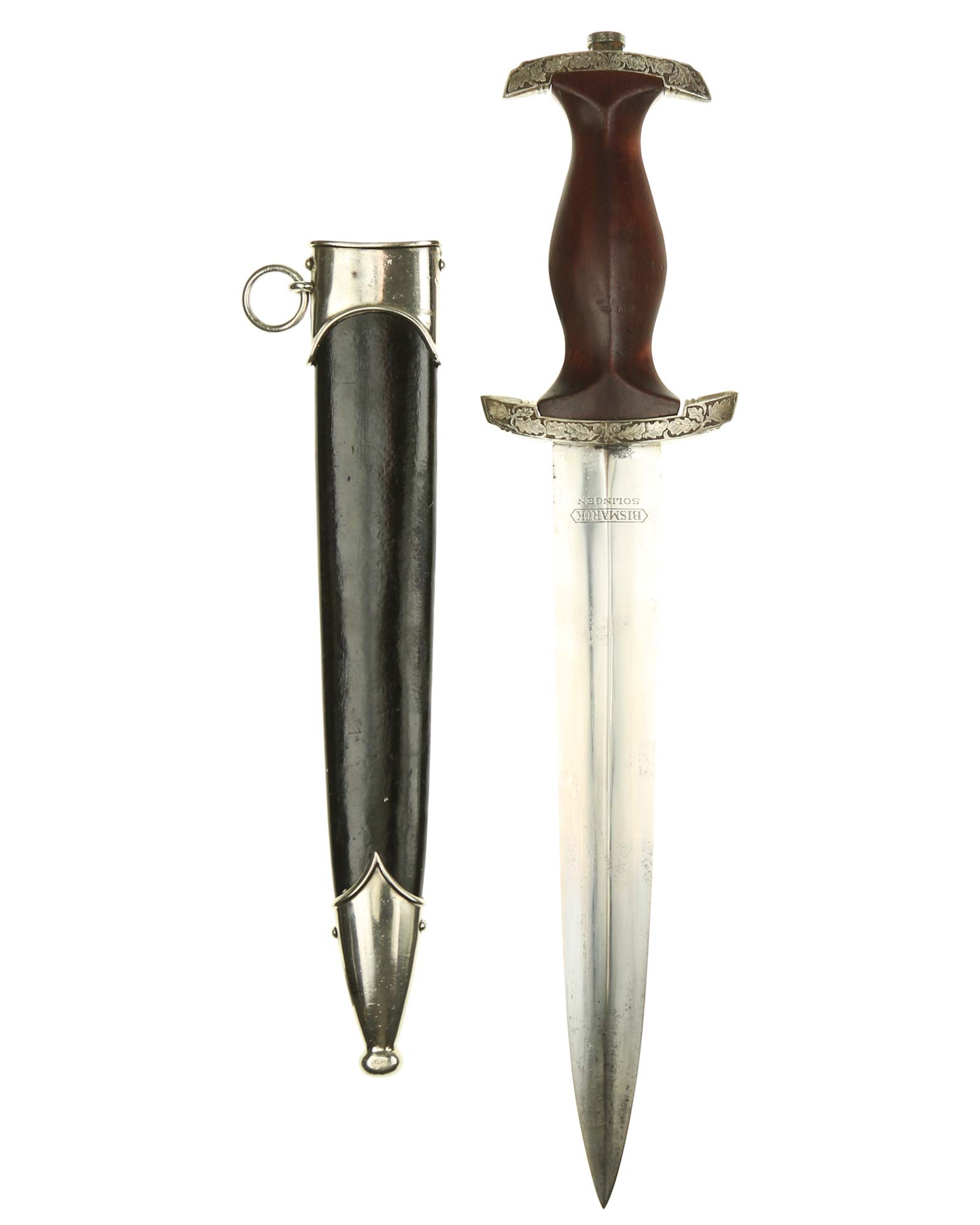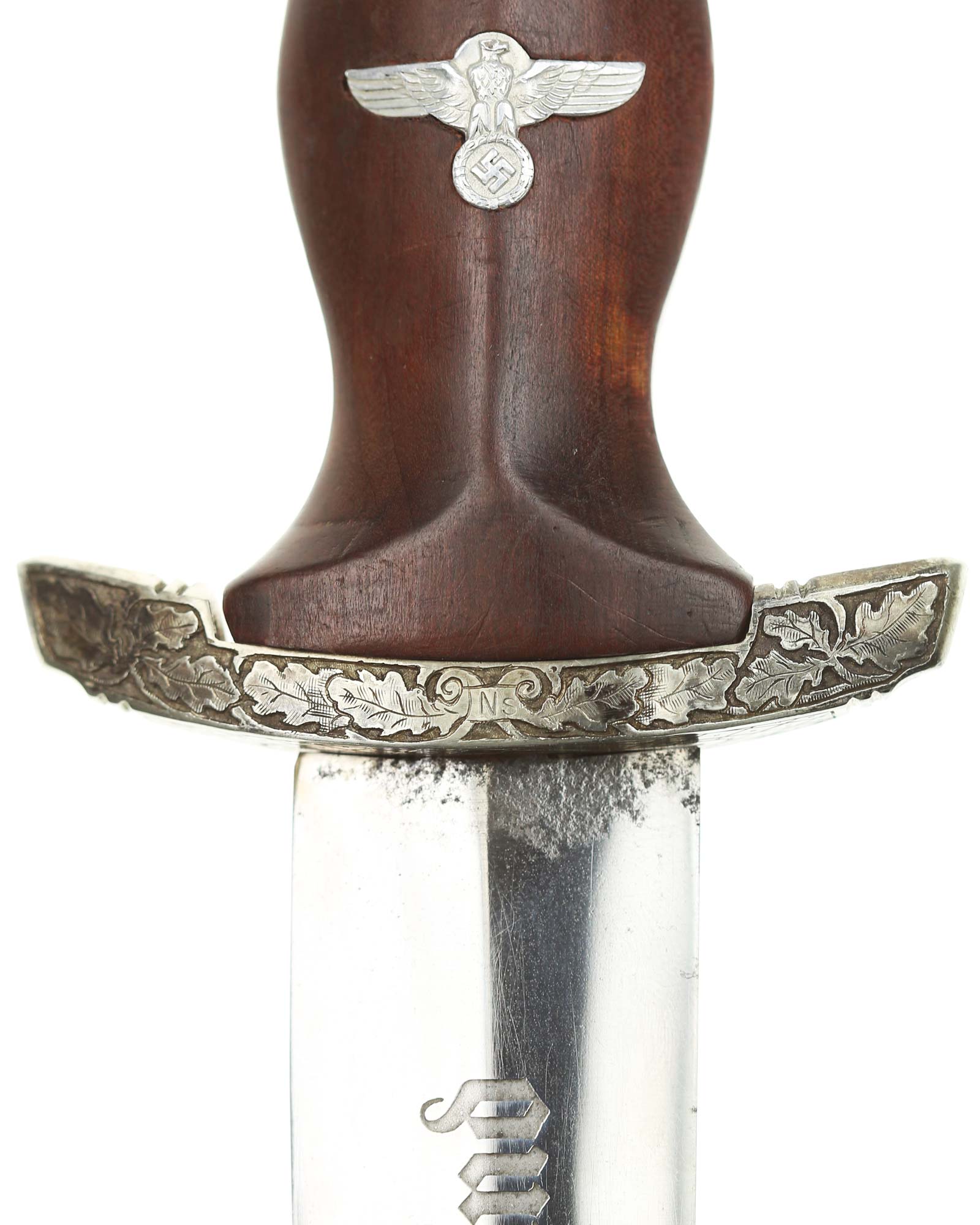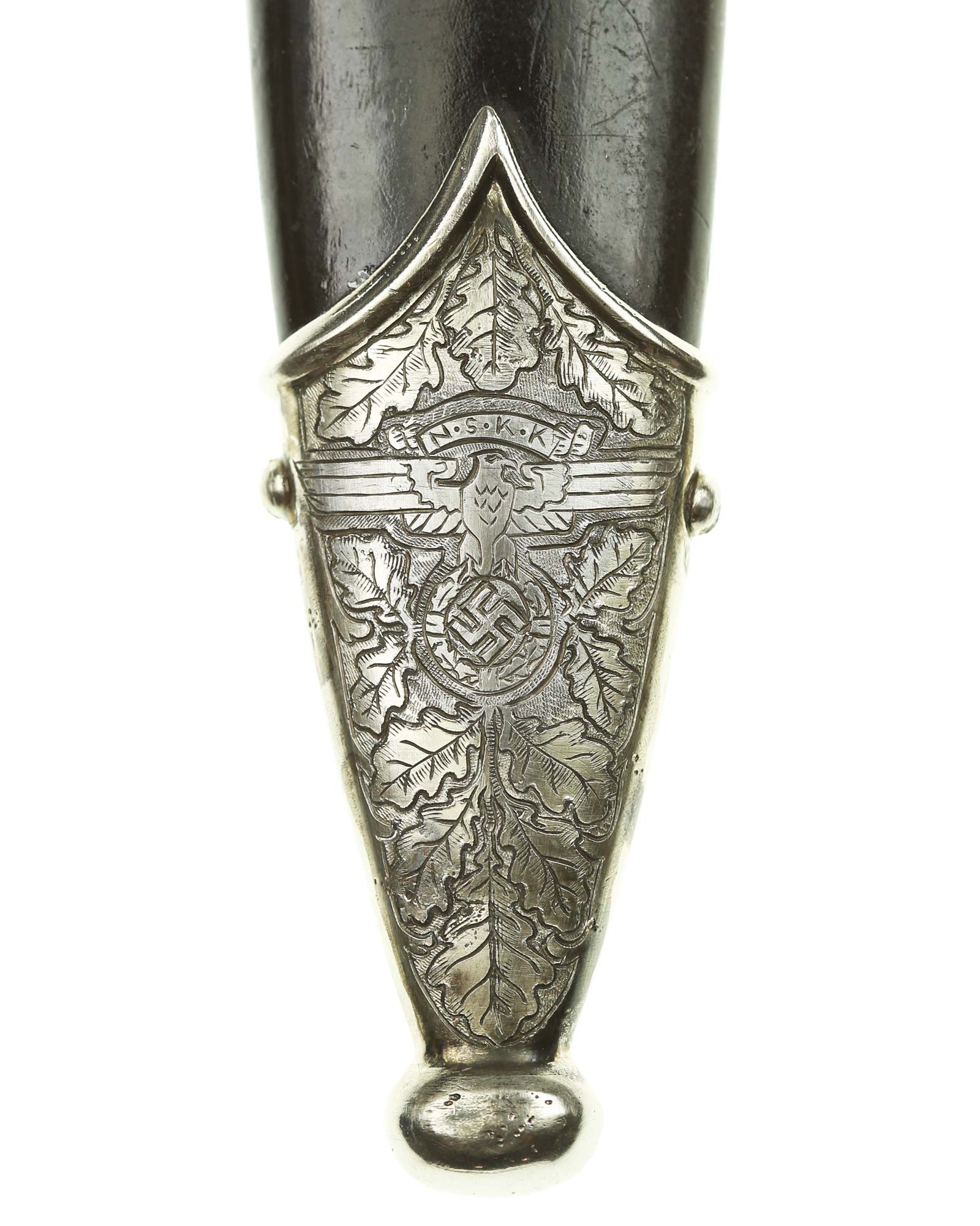 This NSKK [National Socialist Motor Corps] Dagger in EXC++ condition. Model 1933. The total length is 37.4 cm. Early Nickel fittings, lower guard with "Ns" stamp. Maker mark on the blade: August Müller (BISMARCK) Solingen.