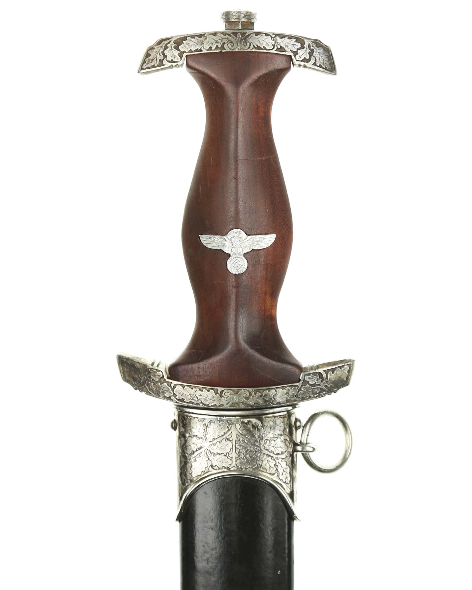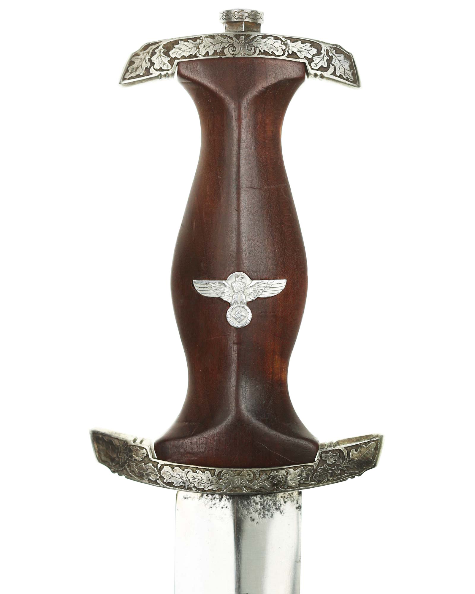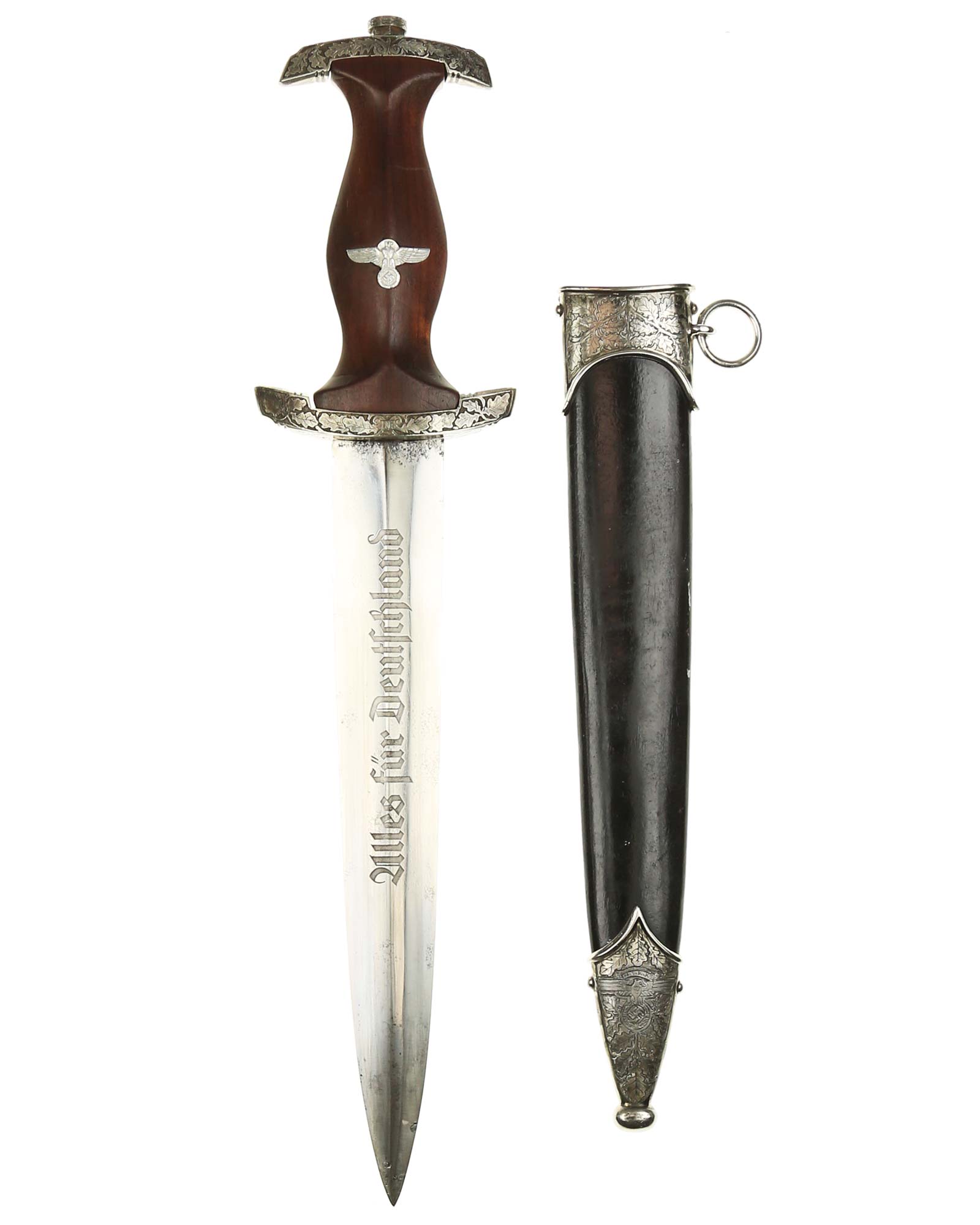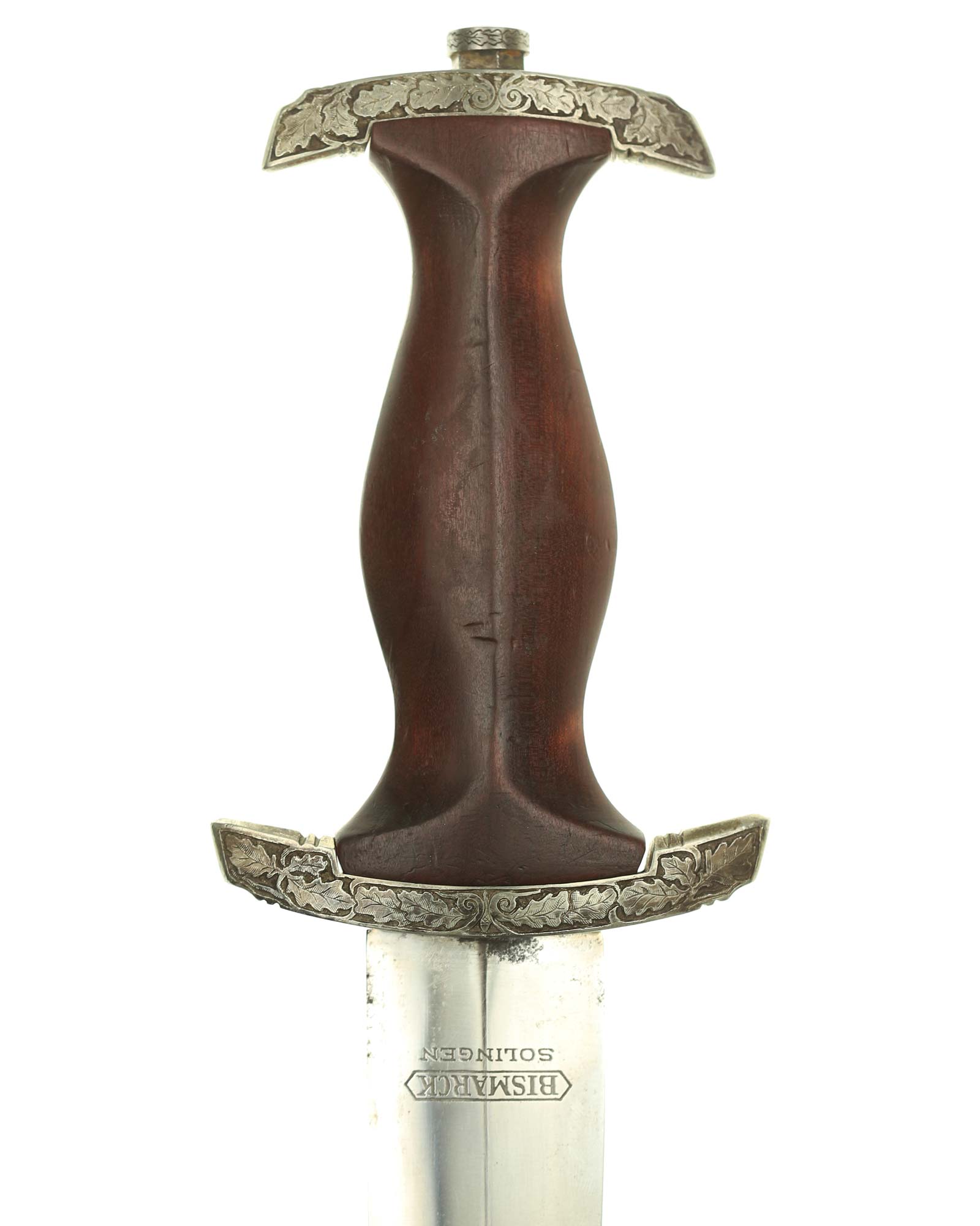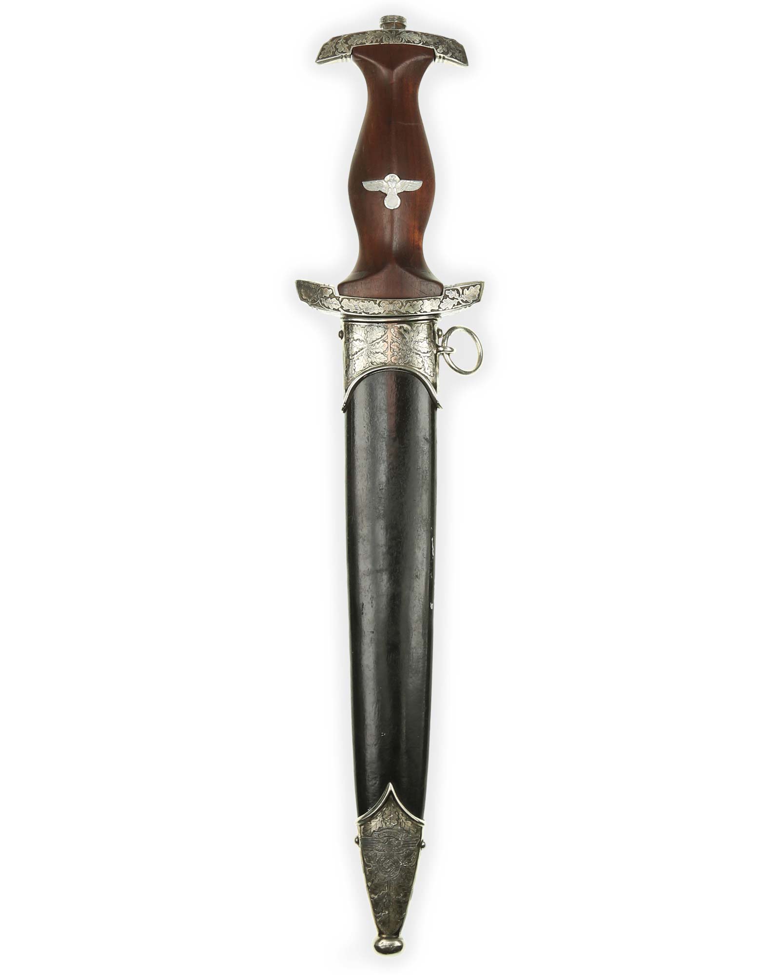This NSKK [National Socialist Motor Corps] Dagger in EXC++ condition. Model 1933. The total length is 37.4 cm. Early Nickel fittings, lower guard with "Ns" stamp. Maker mark on the blade: August Müller (BISMARCK) Solingen.