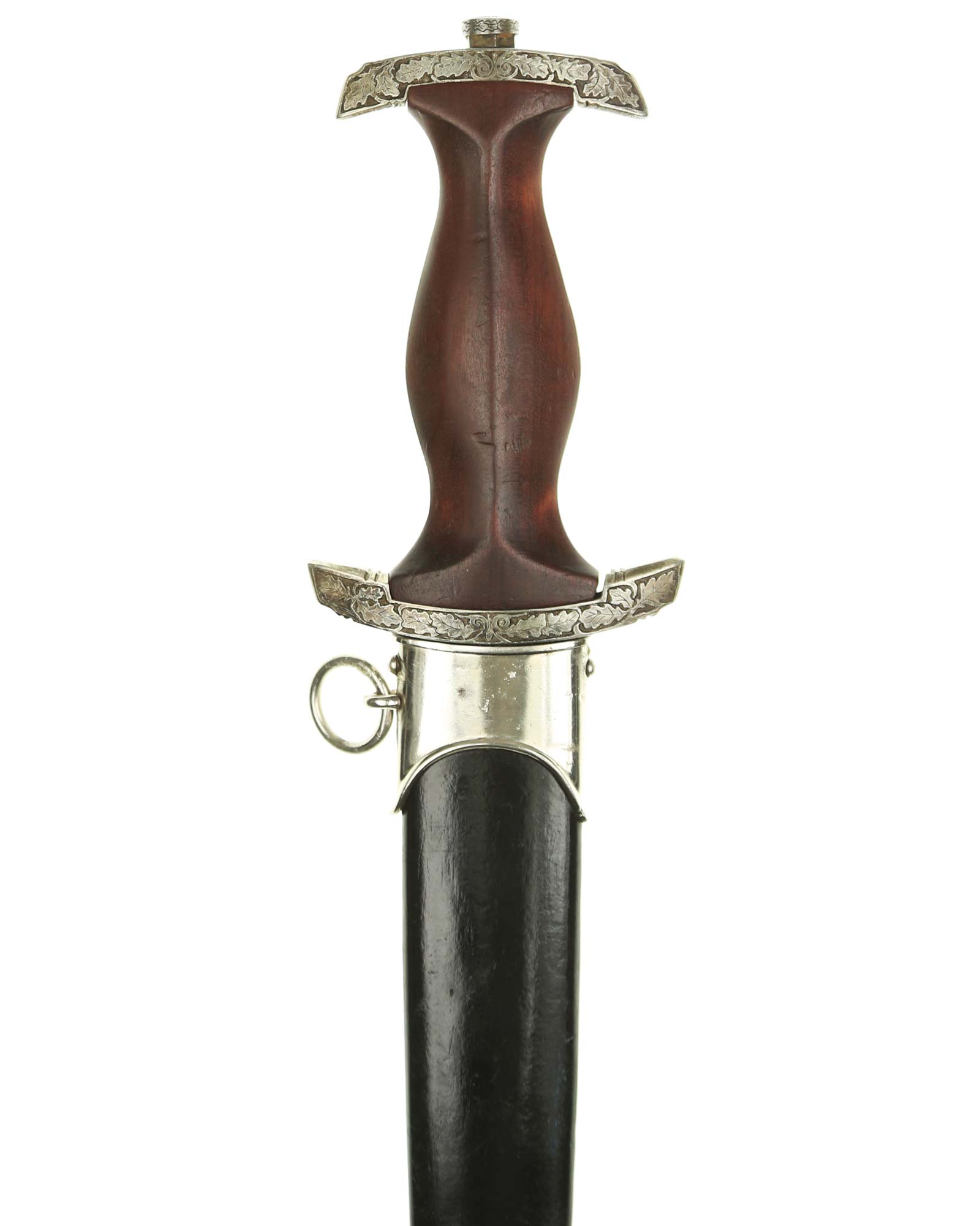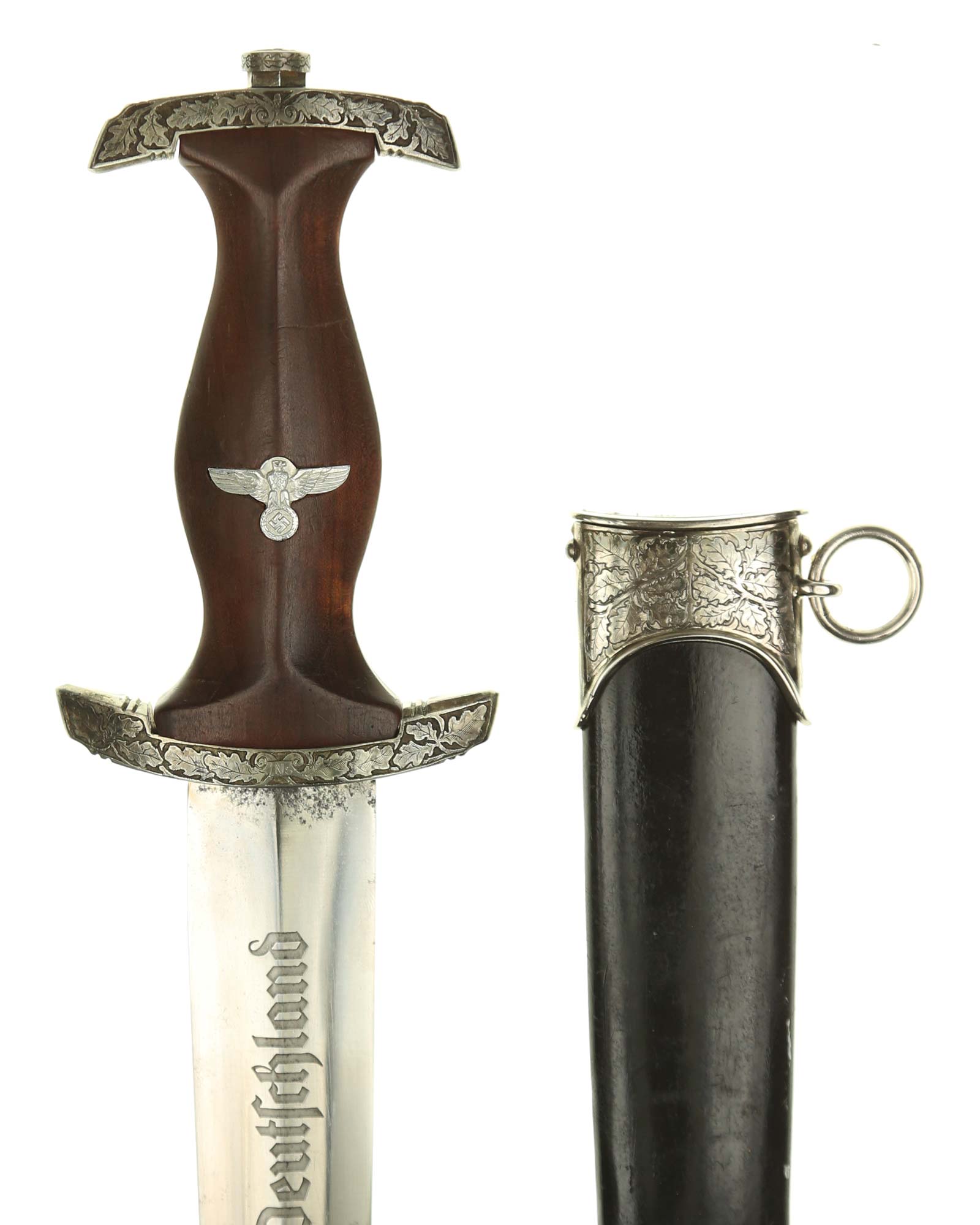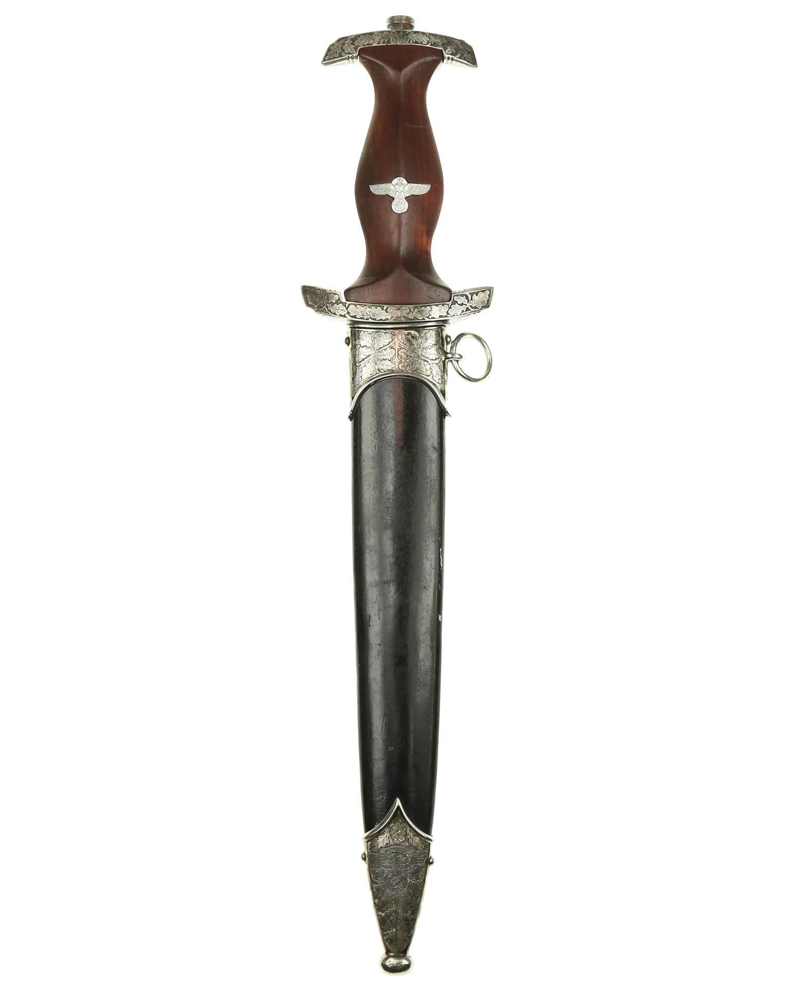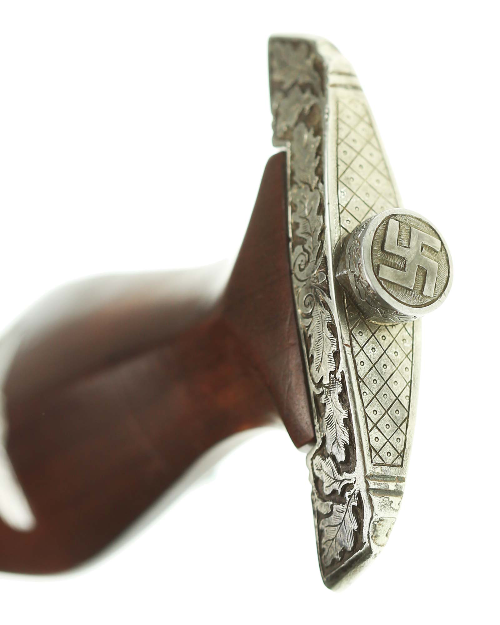 This NSKK [National Socialist Motor Corps] Dagger in EXC++ condition. Model 1933. The total length is 37.4 cm. Early Nickel fittings, lower guard with "Ns" stamp. Maker mark on the blade: August Müller (BISMARCK) Solingen.