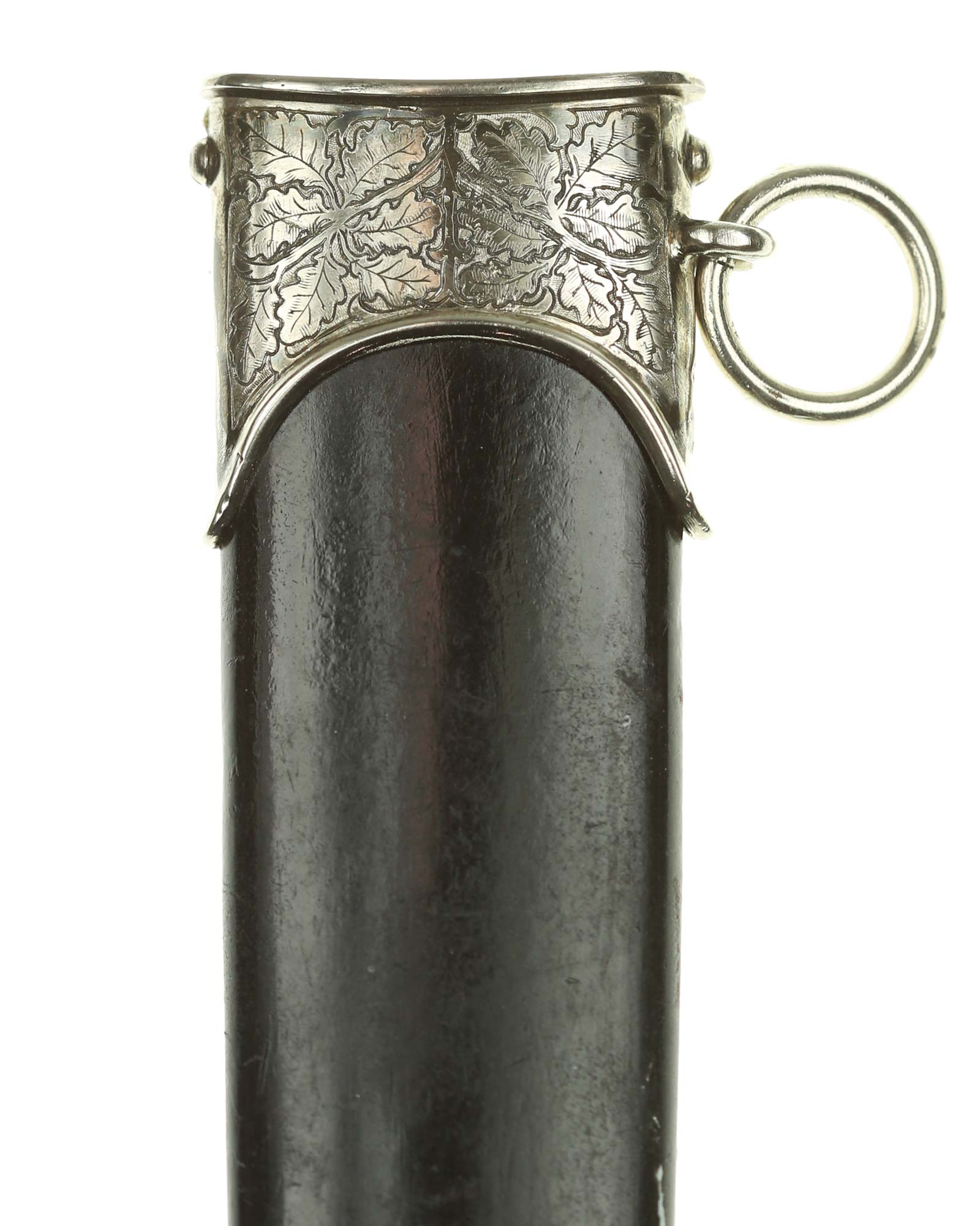 Scabbard: The scabbard shell is a fine example. There is also some original lacquer scattered around the scabbard. A few minor age spots are visible in the finish, but overall it is a pretty nice example. The scabbard mounts are of solid matching nickel, in good condition.
