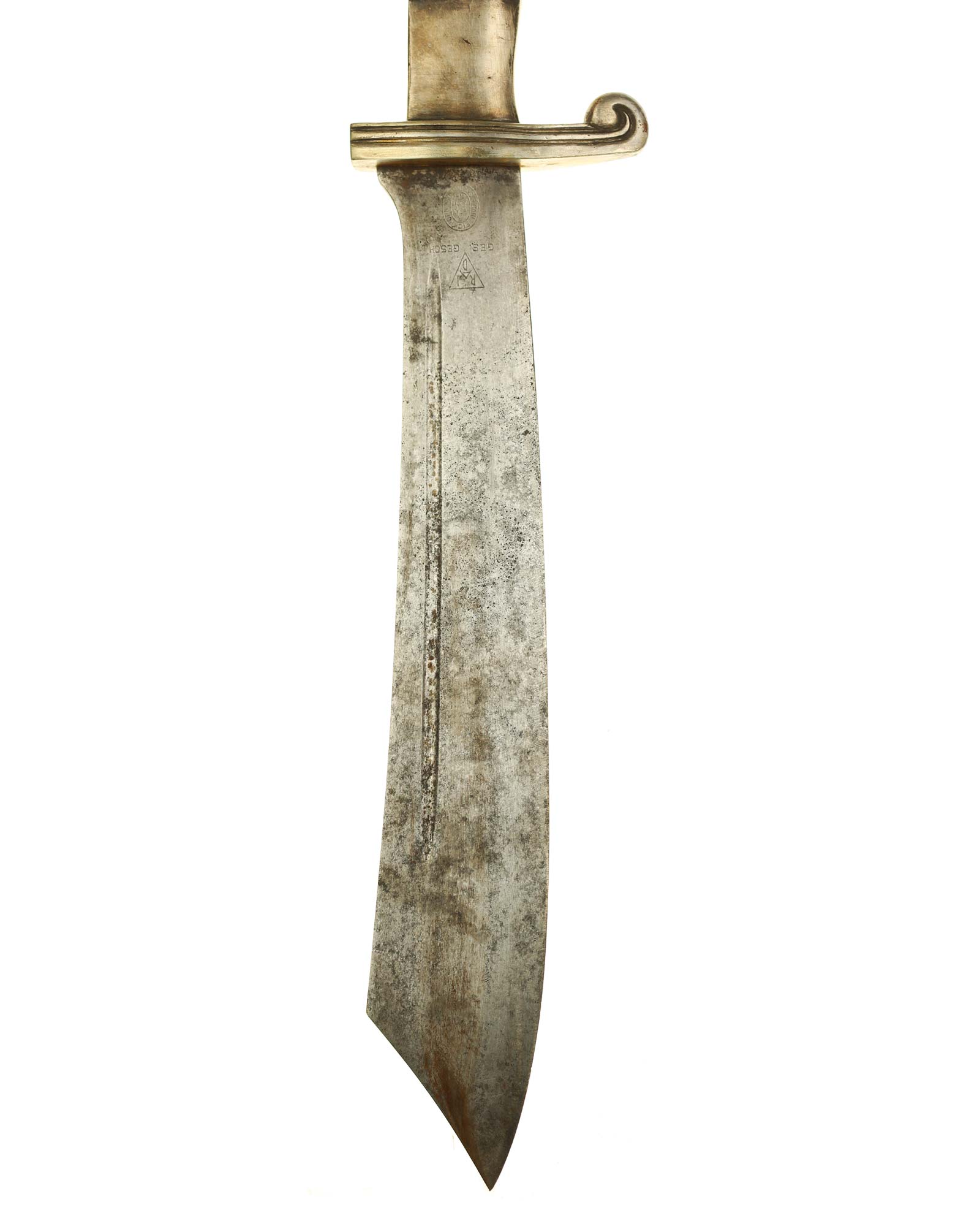 Blade: The blade is in EXC condition and it has the typical matte finish and the Bowie-style end, with a fine narrow fuller. The obverse facing bears the RAD motto, “Arbeit Adelt”. The reverse of this blade is etched with a RAD triangle and the protected patent term “Ges Gesch”.