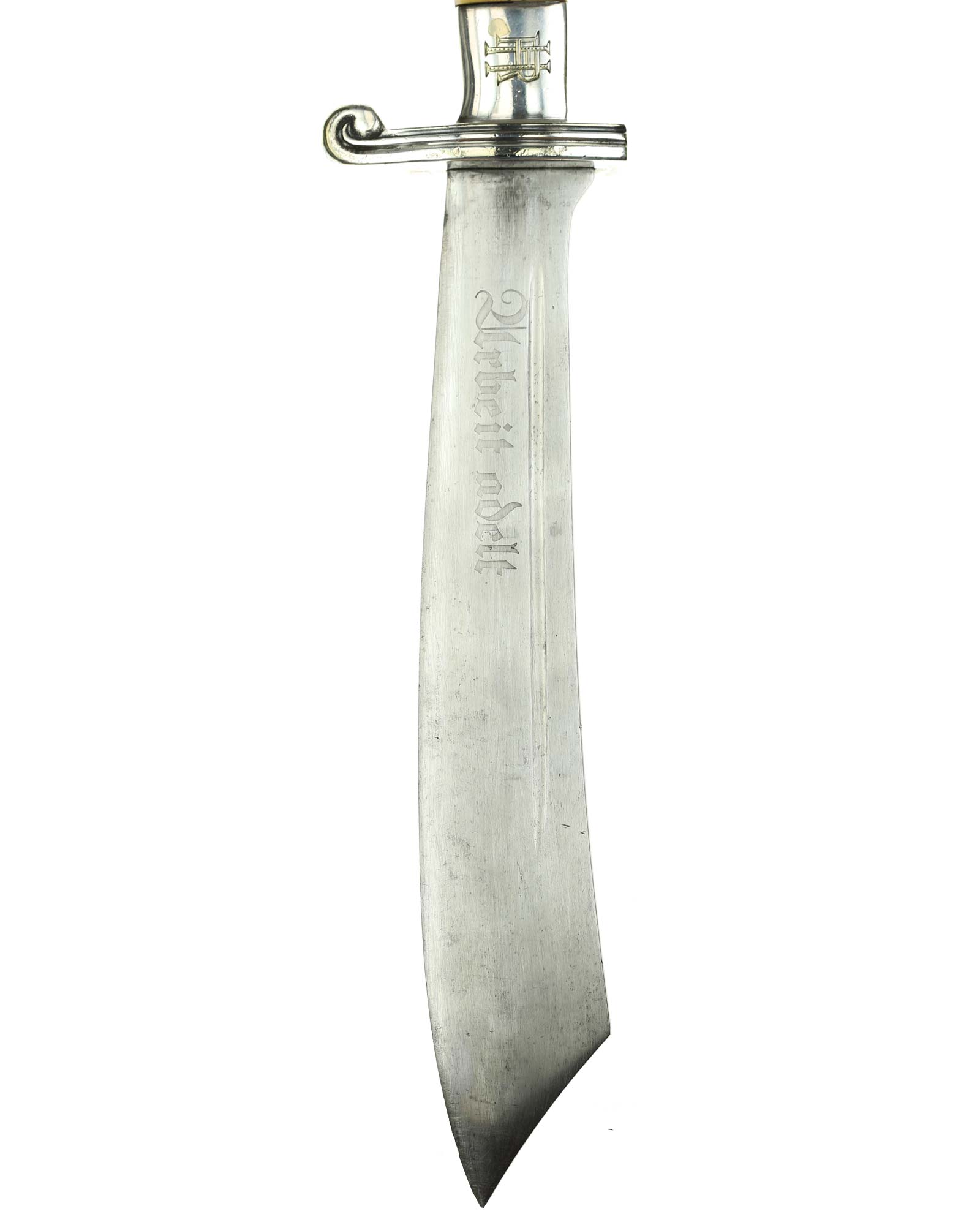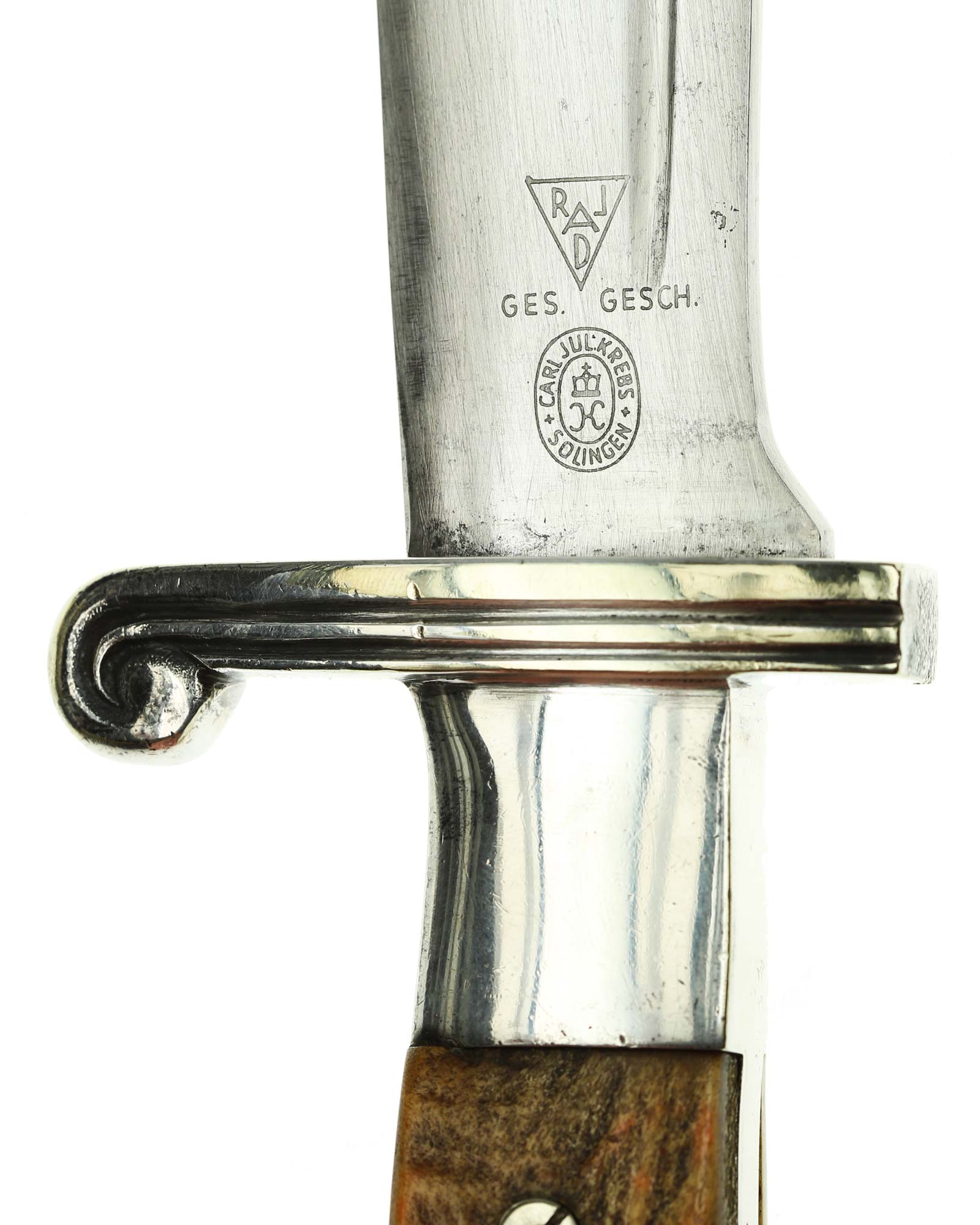 Blade: The blade is in Near Mint condition and it has the typical matte finish and the Bowie-style end, with a fine narrow fuller. The obverse facing bears the RAD motto, “Arbeit Adelt”. The reverse of this blade is etched with maker mark Carl Jul. Krebs Solingen.