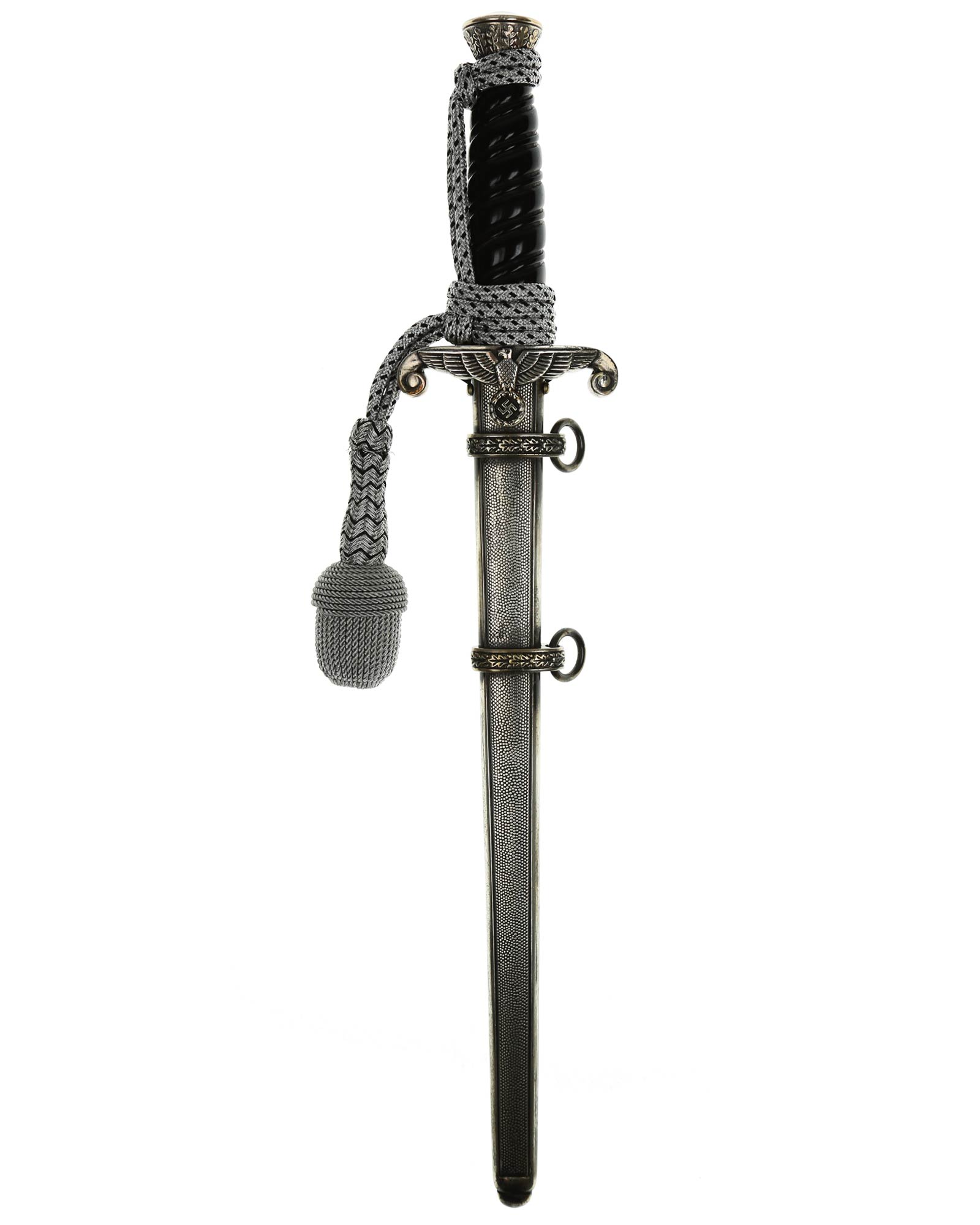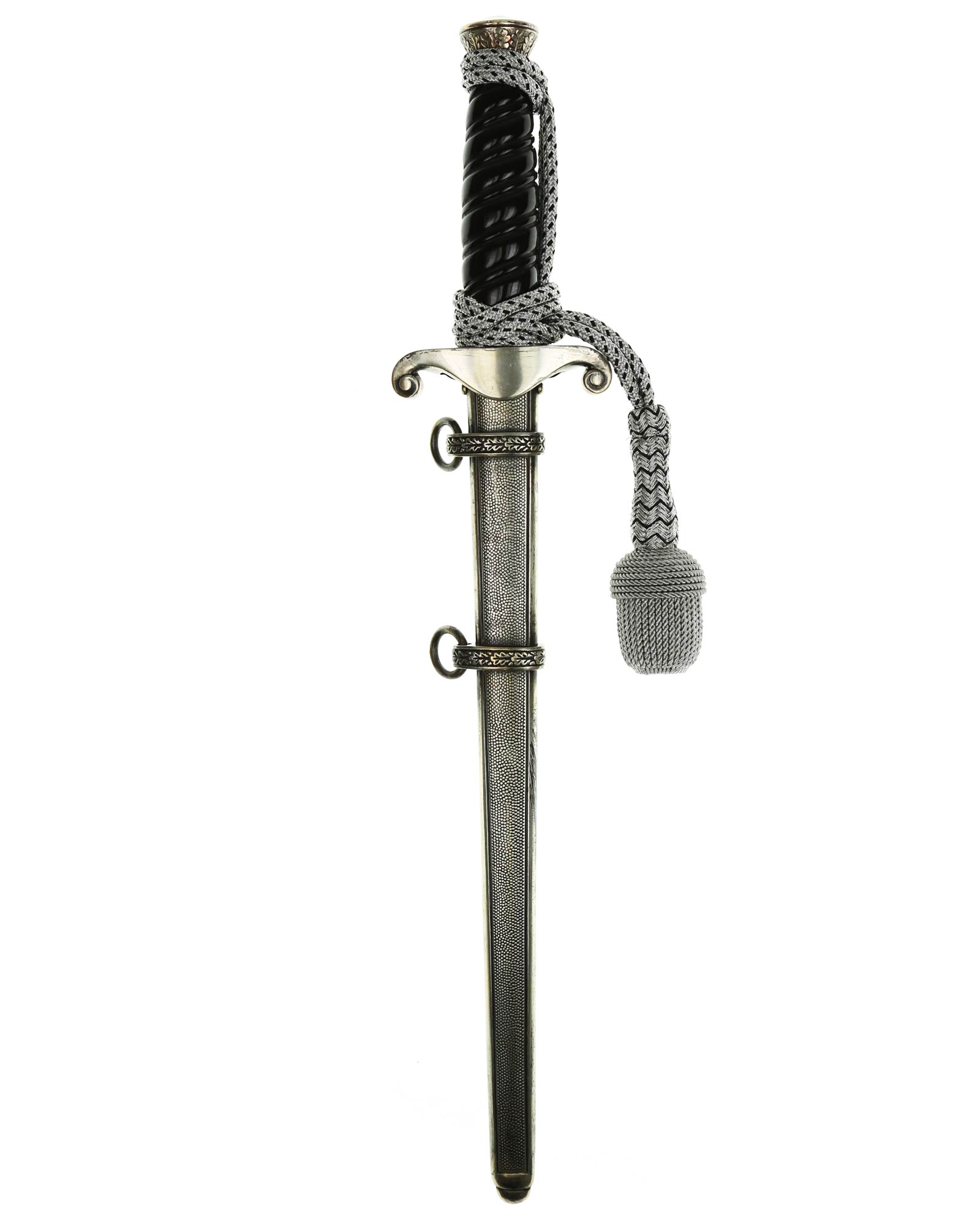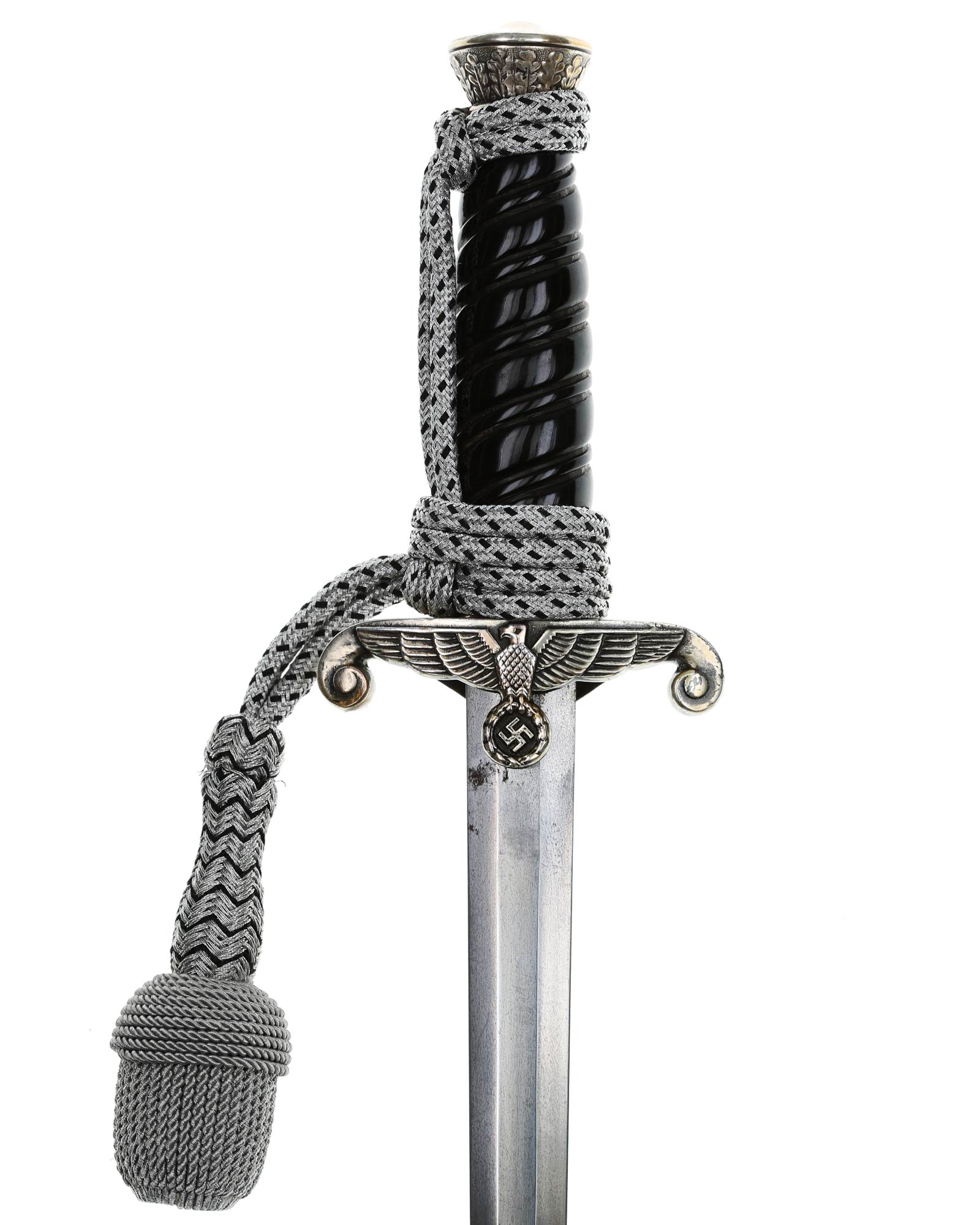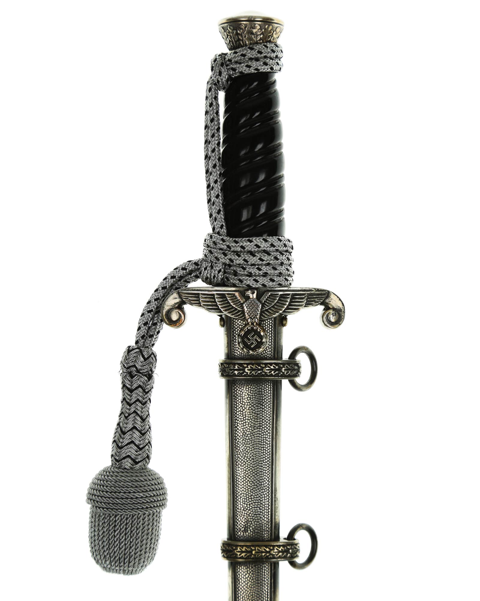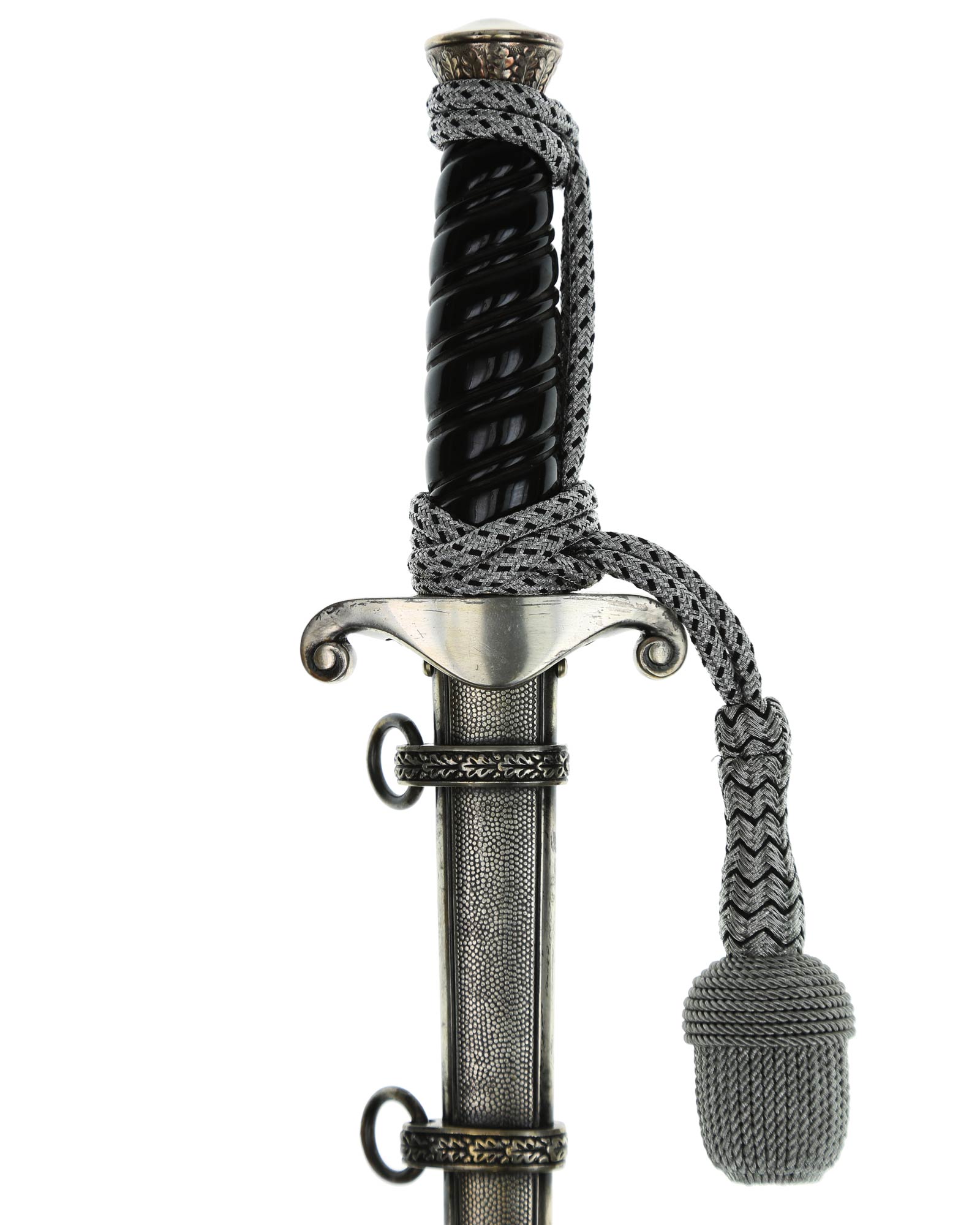 Grip: Black celluloid grip, it is in perfect condition throughout. The crossguard eagle is an outstanding example, showing little wear to the bird, breast and wing feathering, talon, wreath and swastika. The pommel has all of the silvering on the upper surfaces, showing a little thinning to the edge but not noticeably. The standing oak leaves number fourteen, and are separated by acorns.