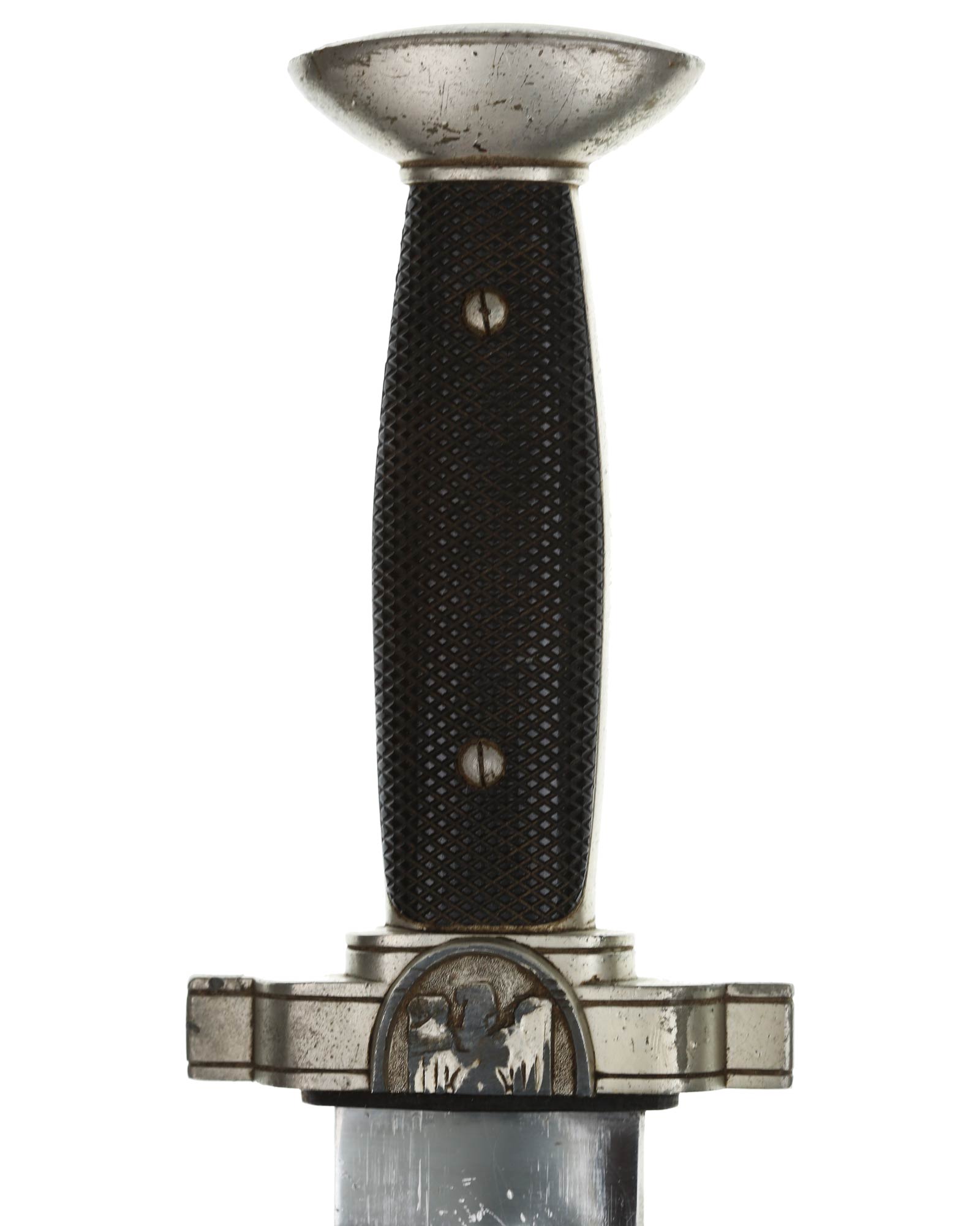 Grip: The pommel cap is crisp throughout its entirety, having all of the plating around the edges. The crossguard area is in EXC+ condition. The crossguard features oval disk on the reverse; the reverse oval is plain.The grip plates are the black Bakelite type. The reverse plate has a smooth surface, while the obverse plate is nicely checkered. These plates are retained by screws with spanner nuts. The screws retain of of their surface plating.