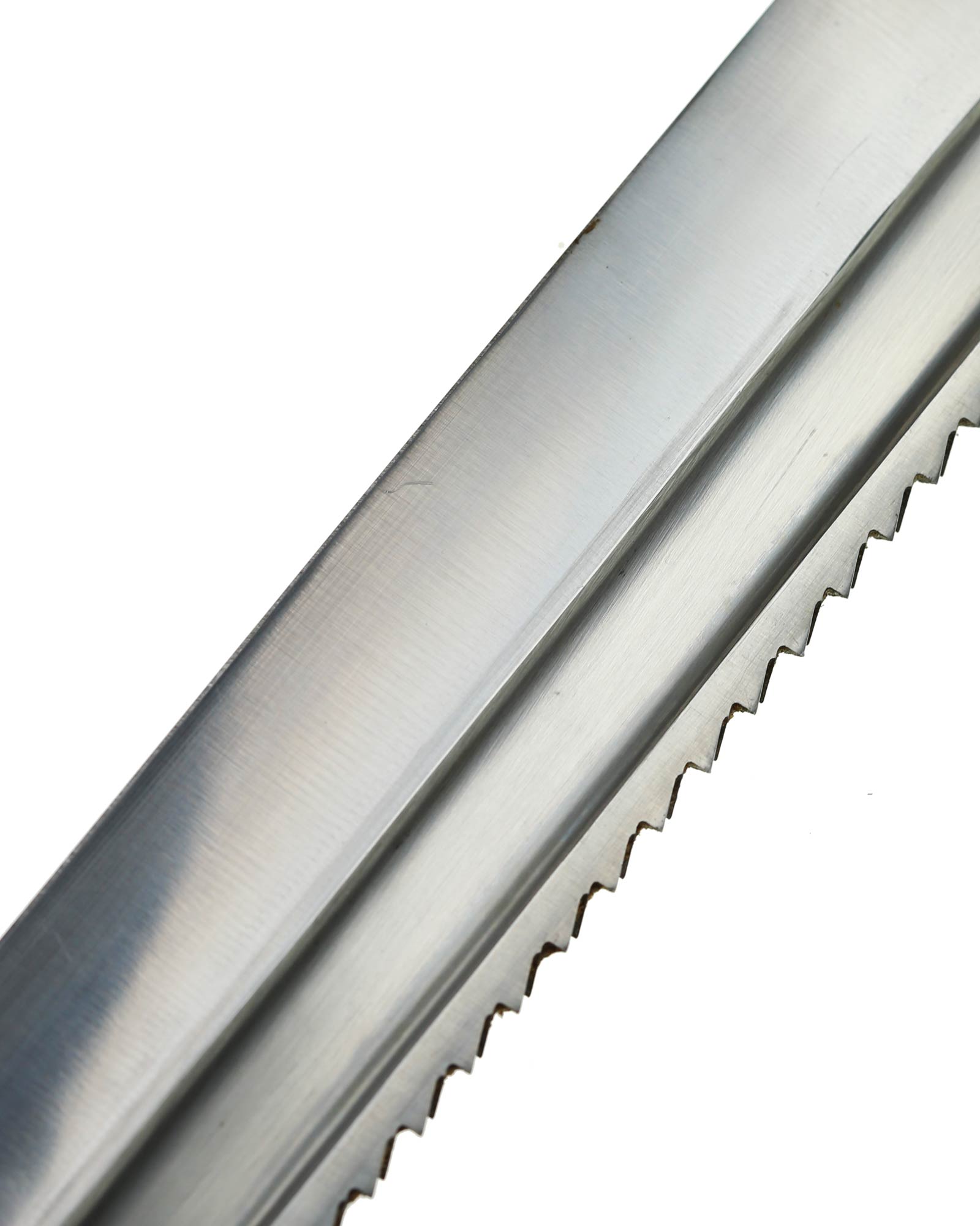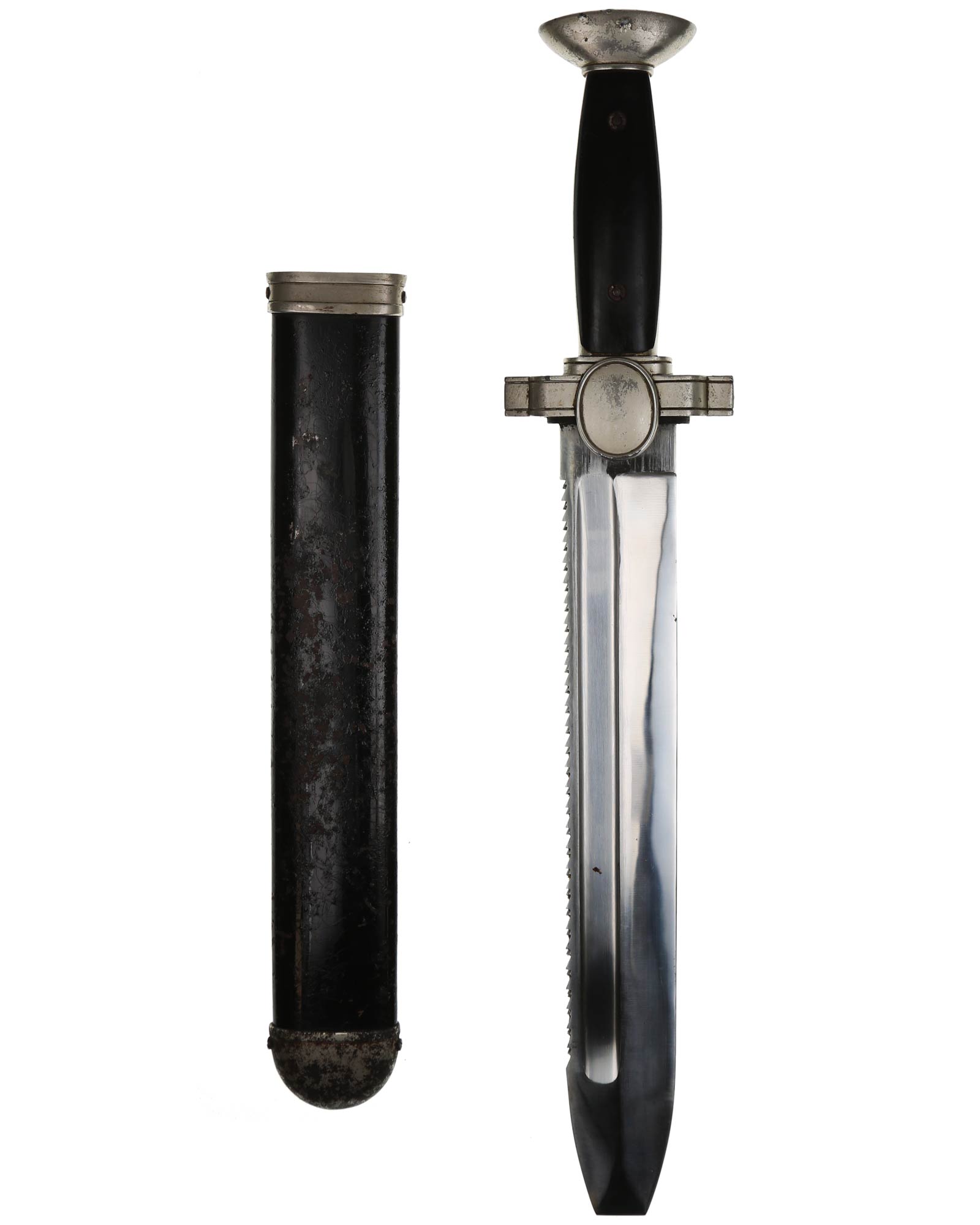 Blade: The blade of this dagger is in MINT condition. It has the characteristic blunted tip and brutal looking sawback spine. The sawback is so sharp that it grabs at your finger with even the lightest touch. The ricasso on this blade is unmarked, and the original black leather blade buffer in in place.