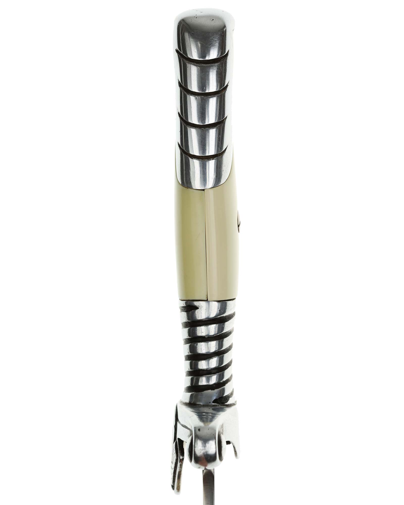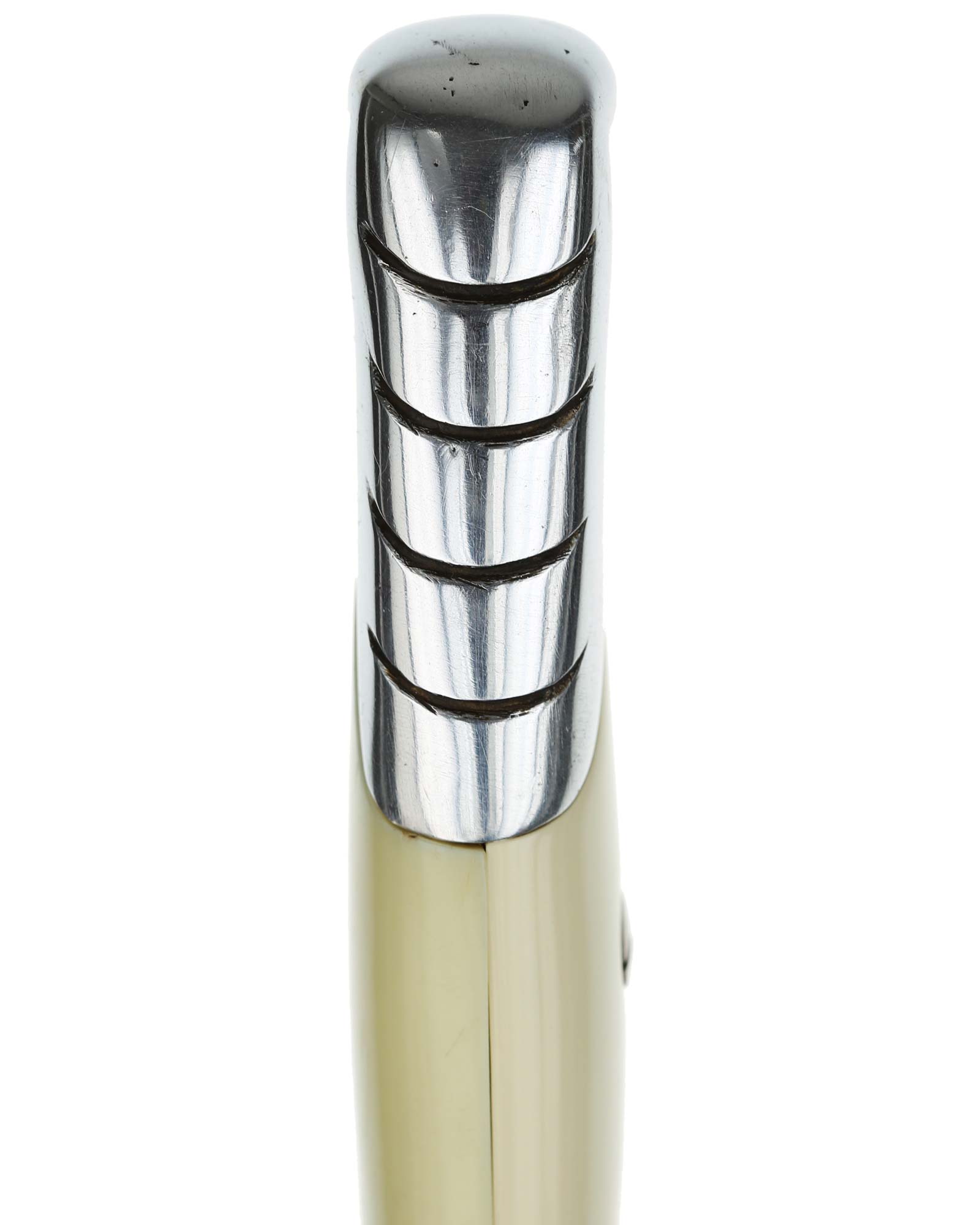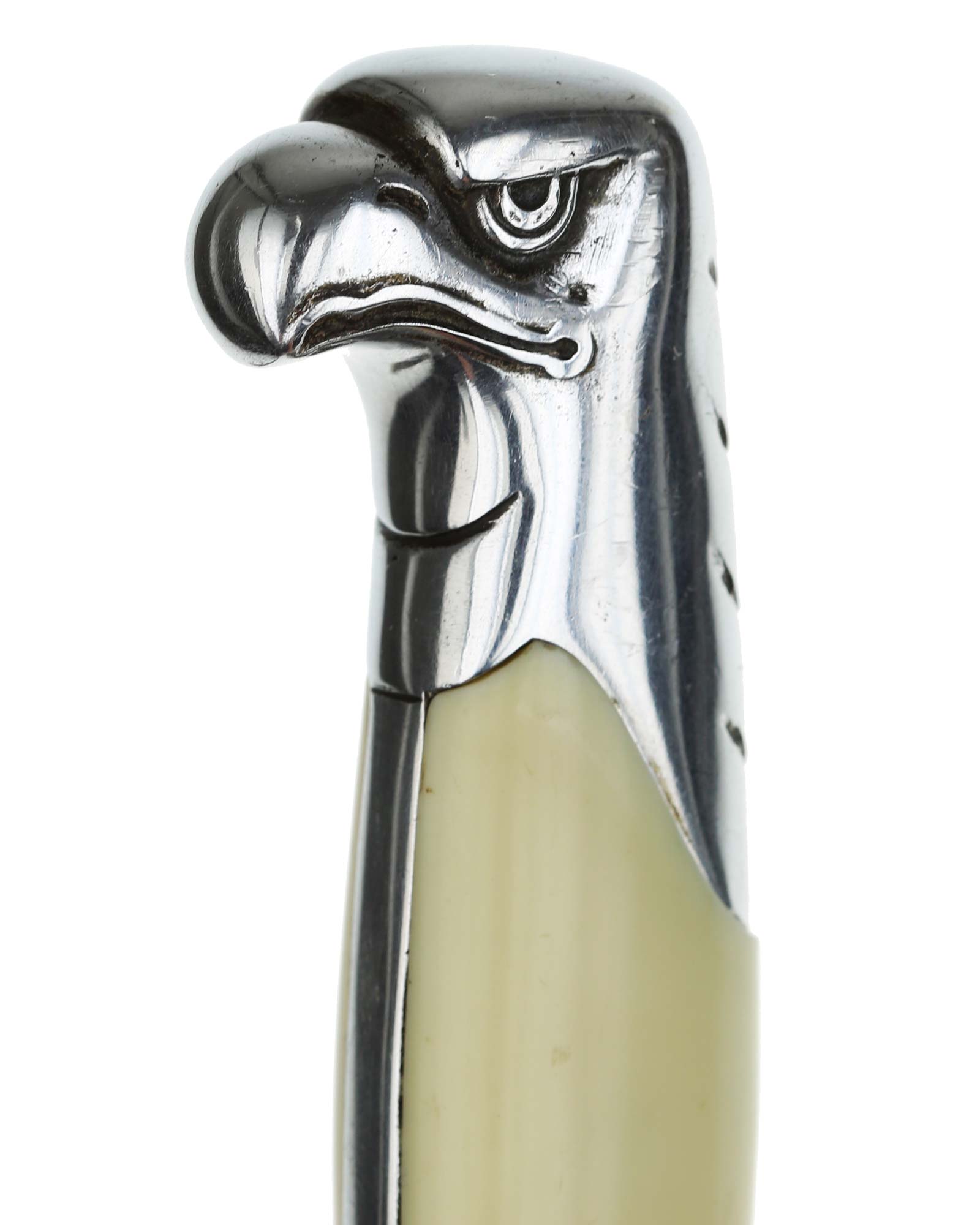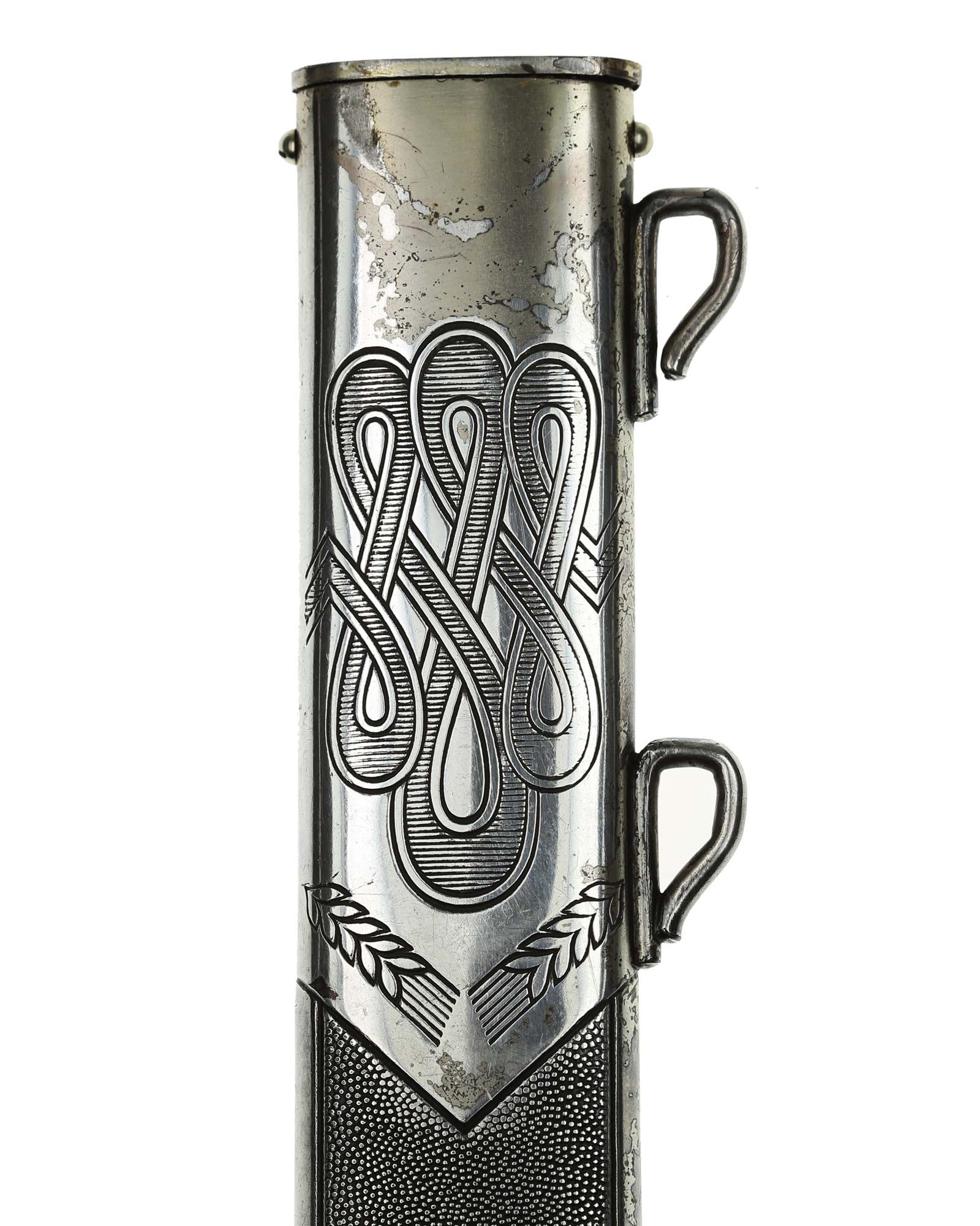 Grip: The hilt plating throughout the noble eagle’s head is all there and also is complete. The pommel has the usual outstanding detail to the eagle’s nasal area, beak, brow and eye. The ferrule has the decorative lines running on forty-five degree angles on the ferrule, each having its original factory darkening in the backgrounds. The crossguard features quillon arms that curl to a swirl at the quillons. The obverse features a spade which is lined and has a superimposed swastika placed between two wheat shafts. The grip plates are a very pleasing off-white color and both remain in 100% condition.