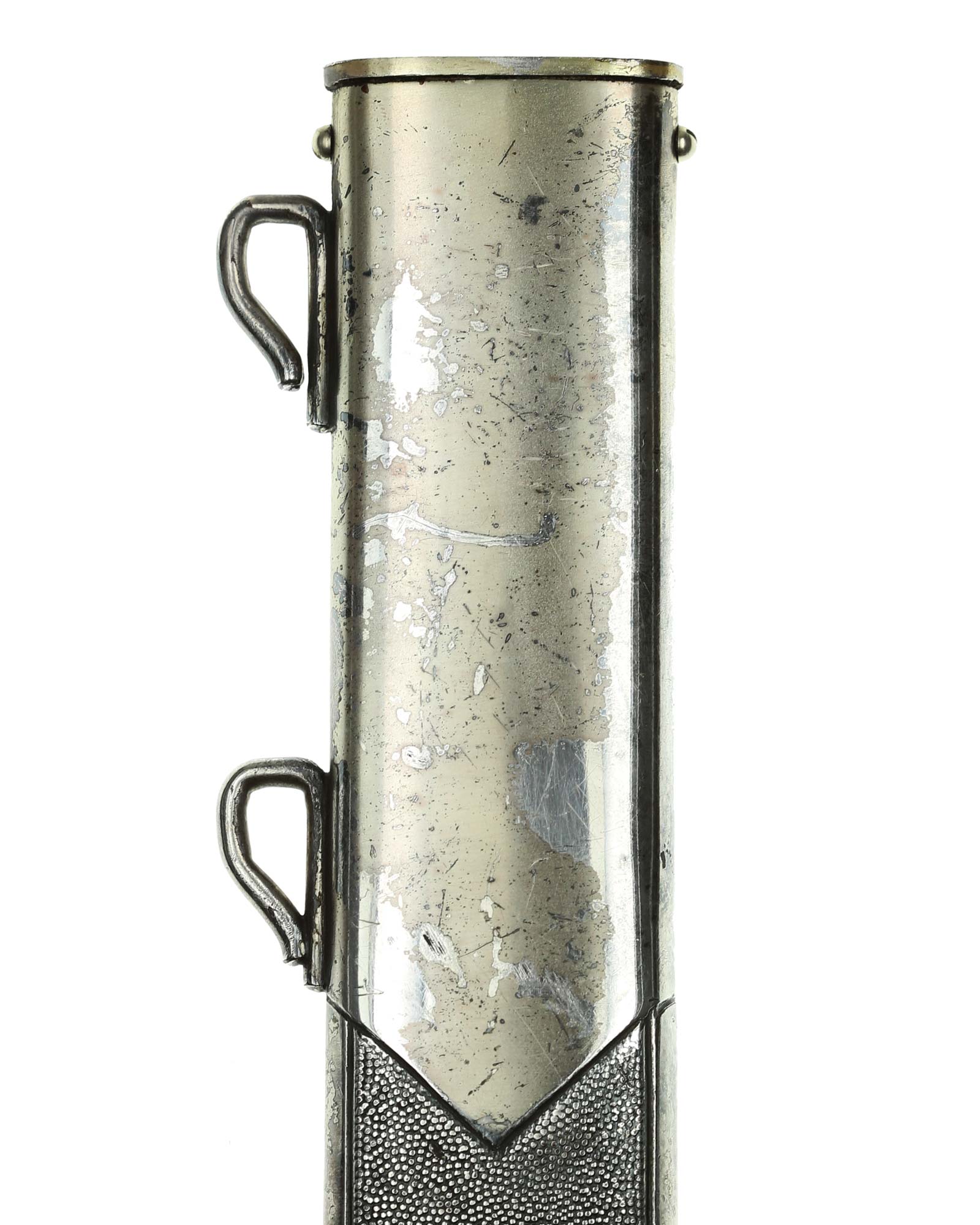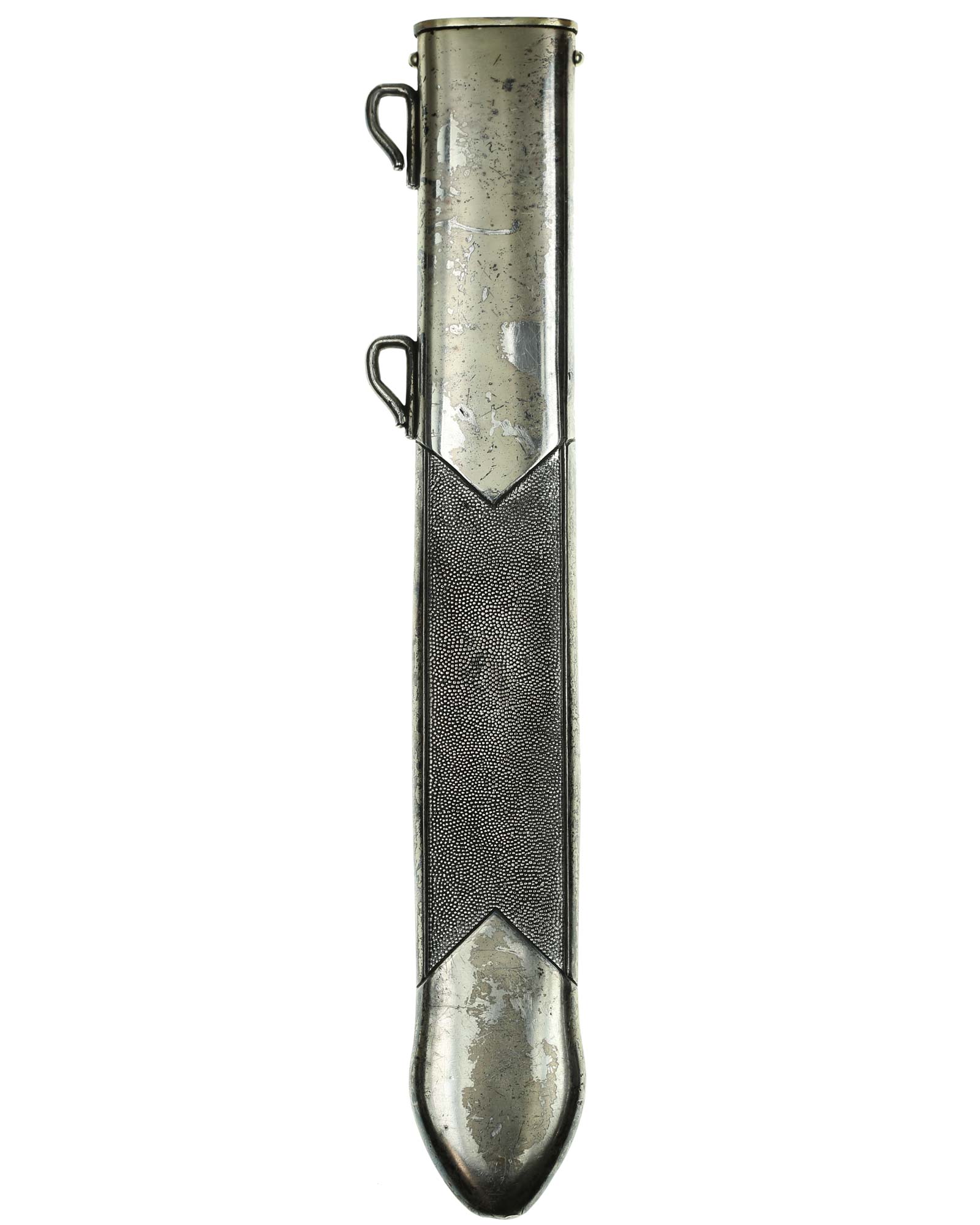 Scabbard: The scabbard has a good crisp pebble pattern on both sides. The scabbard features the curl designs on the upper portion and below the curls are two touching wheat shafts. The throat is retained by two flatter head side screws.