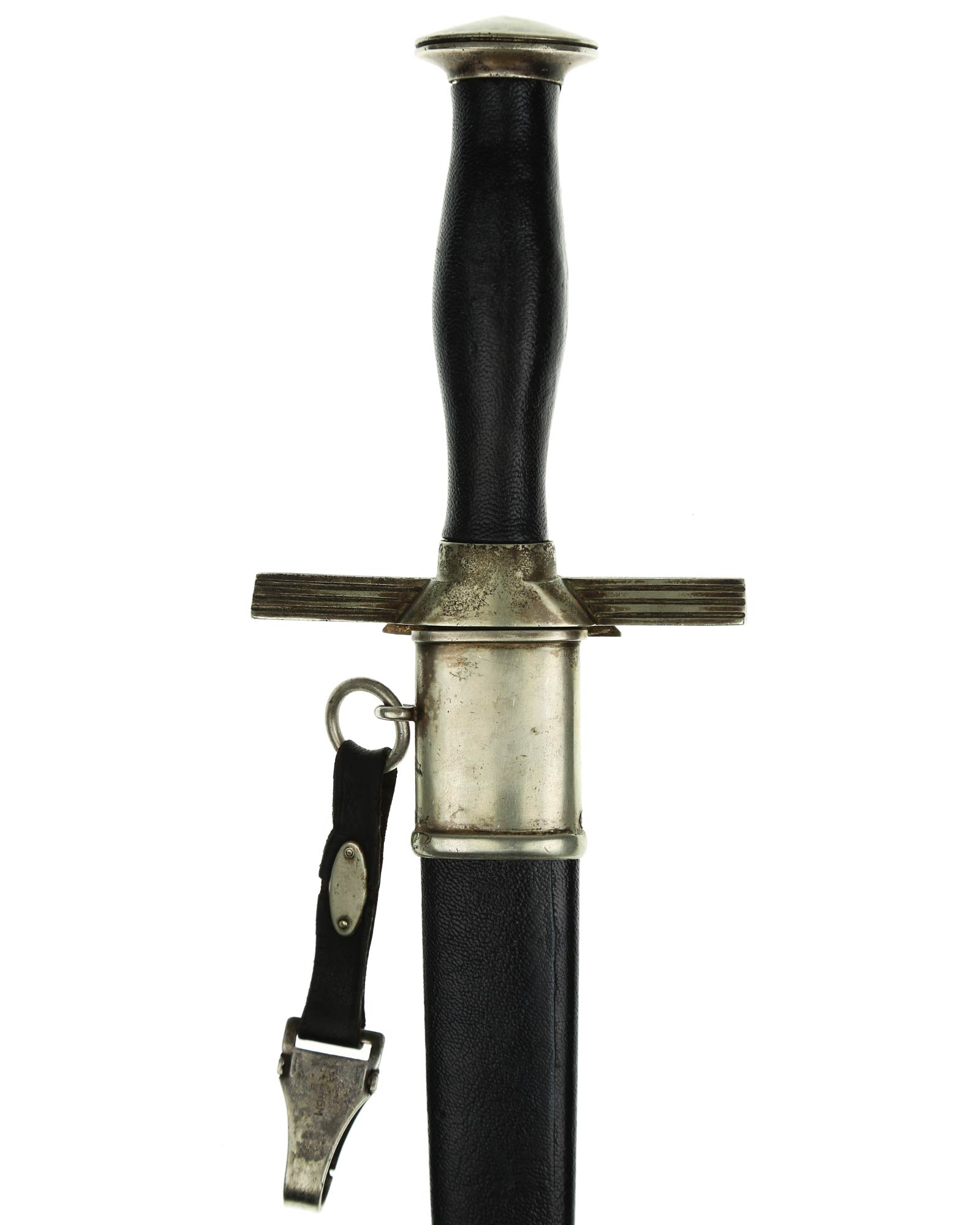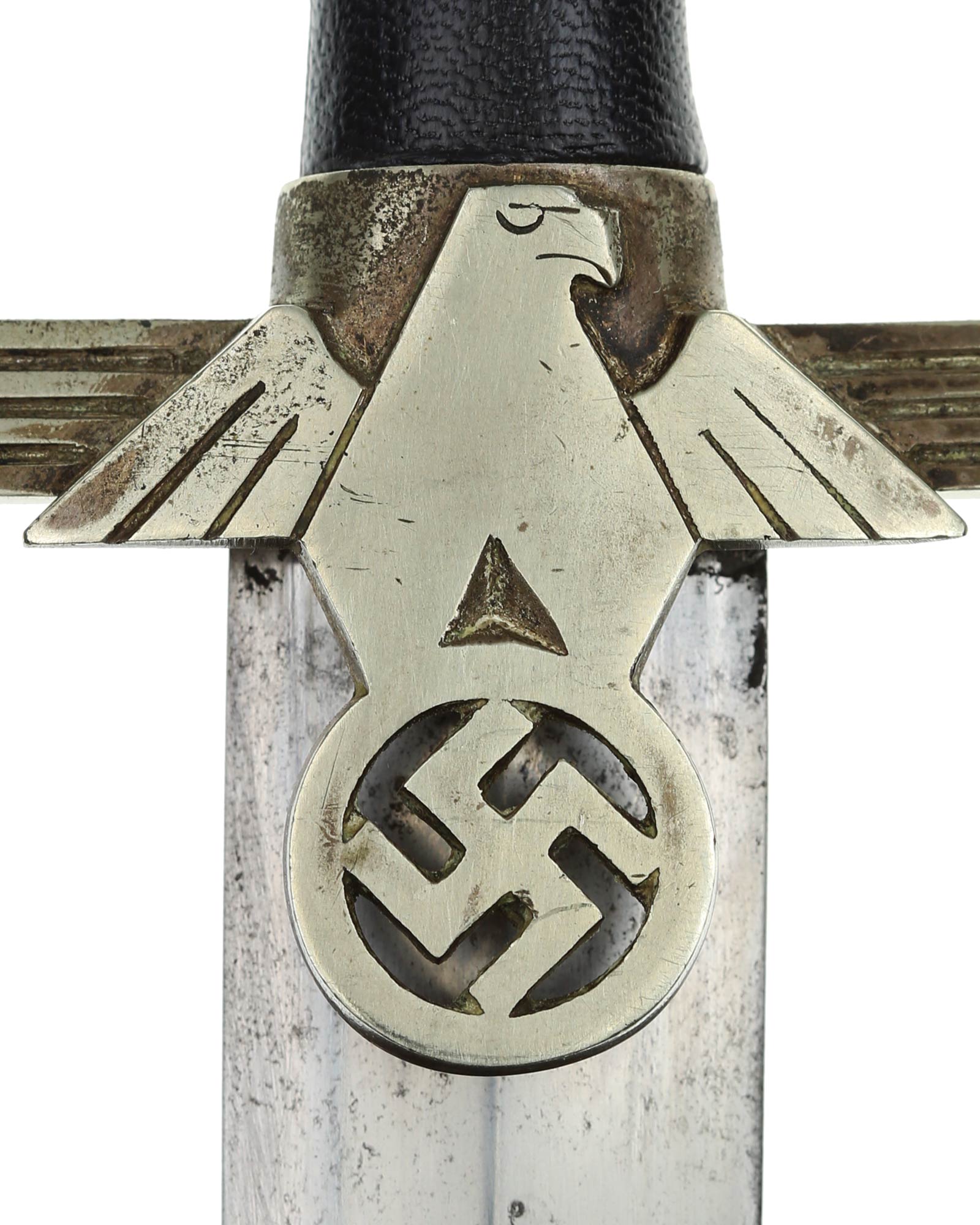 Grip: The pommel still has all of the plating across the surfaces. The grip is a carved wood base. The 1st Model RLB button is an excellent example, having the sunburst style edges. In the center are the initials of the organization, raised out in blue enamel. The enamel still appears to be intact within the depths of the letters. Below the initials is a blue enamel, raised mobile swastika. The nickel crossguard is with a short winged, Art Deco style eagle that looks to the viewer's right. The eagle's eye, beak, and feathering has all been hand-enhanced, and the plain wreath which carries a mobile swastika. The triangular quillon arms have three accent grooves cut into the obverse facings.