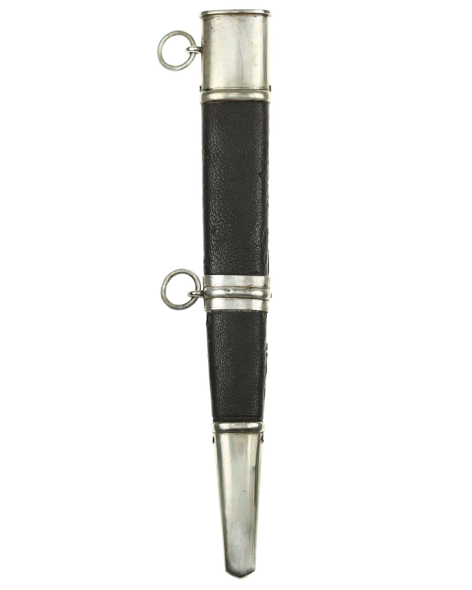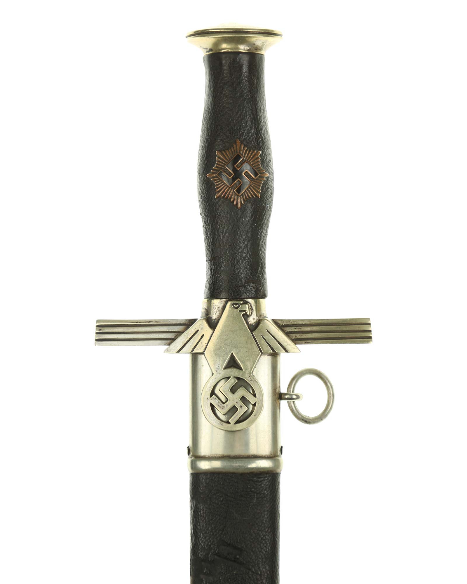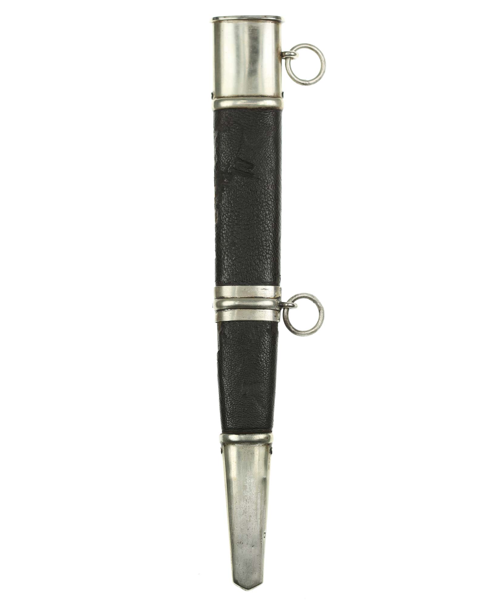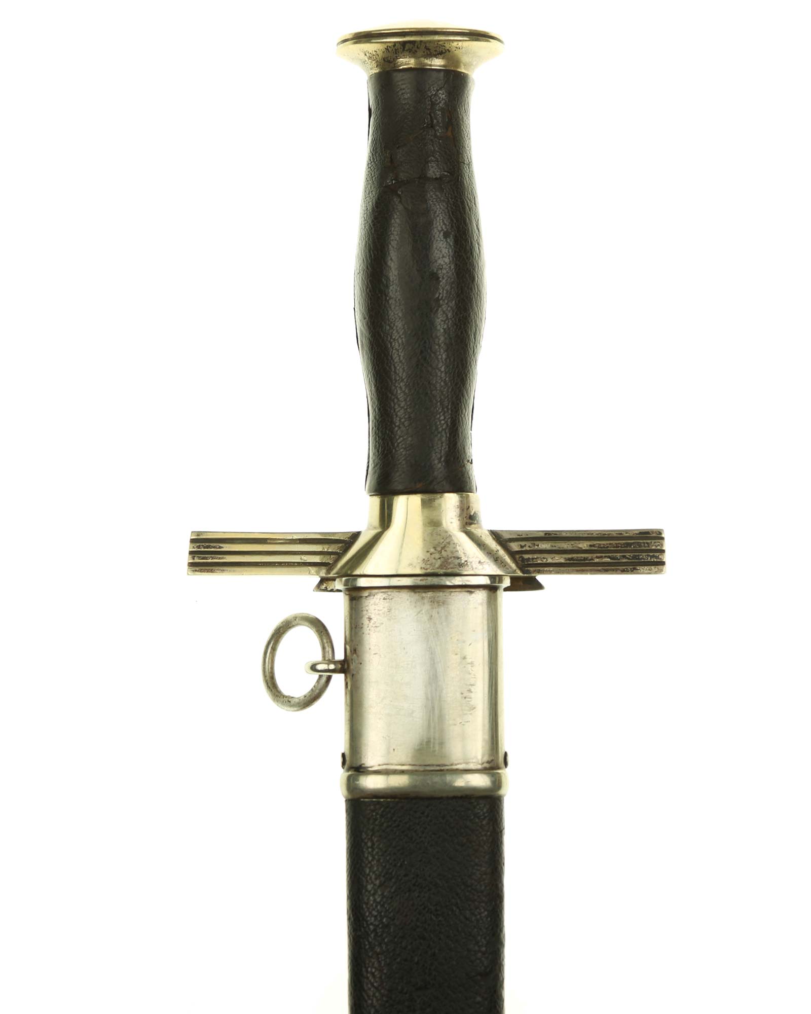 Grip: It is a fine piece having solid nickel silver plated hilt mounts. The pommel cap still has its original pointy top and the top surfaces as well as the edges around the pommel are in good condition. The edge of the pommel has a decorative groove that runs around the circumference. The crossguard features the stubby winged, art deco eagle which looks to the viewer’s right. This bird grasps a wreath with a open swastika within the wreath. The crossguard arms are a triangular shape and each arm has three grooves in its surfaces. The grip is a wood base. It is bulbous in the center and tapers on both ends. The leather shows some usage signs. All of the original grain is still intact. The grip features a button having a sunburst in the backgrounds. The original silvering still appears to be intact throughout the sunburst.