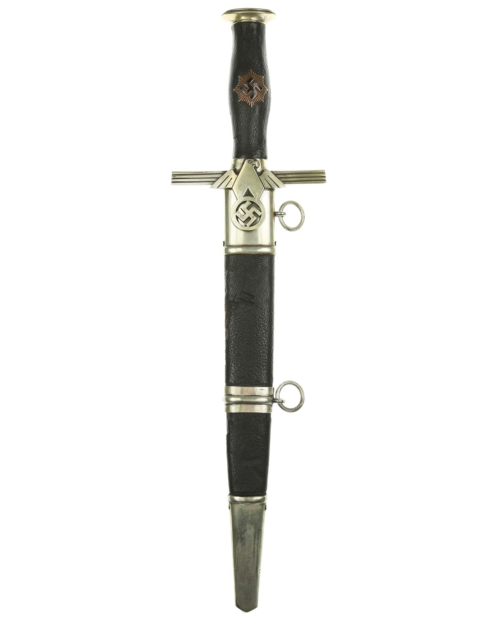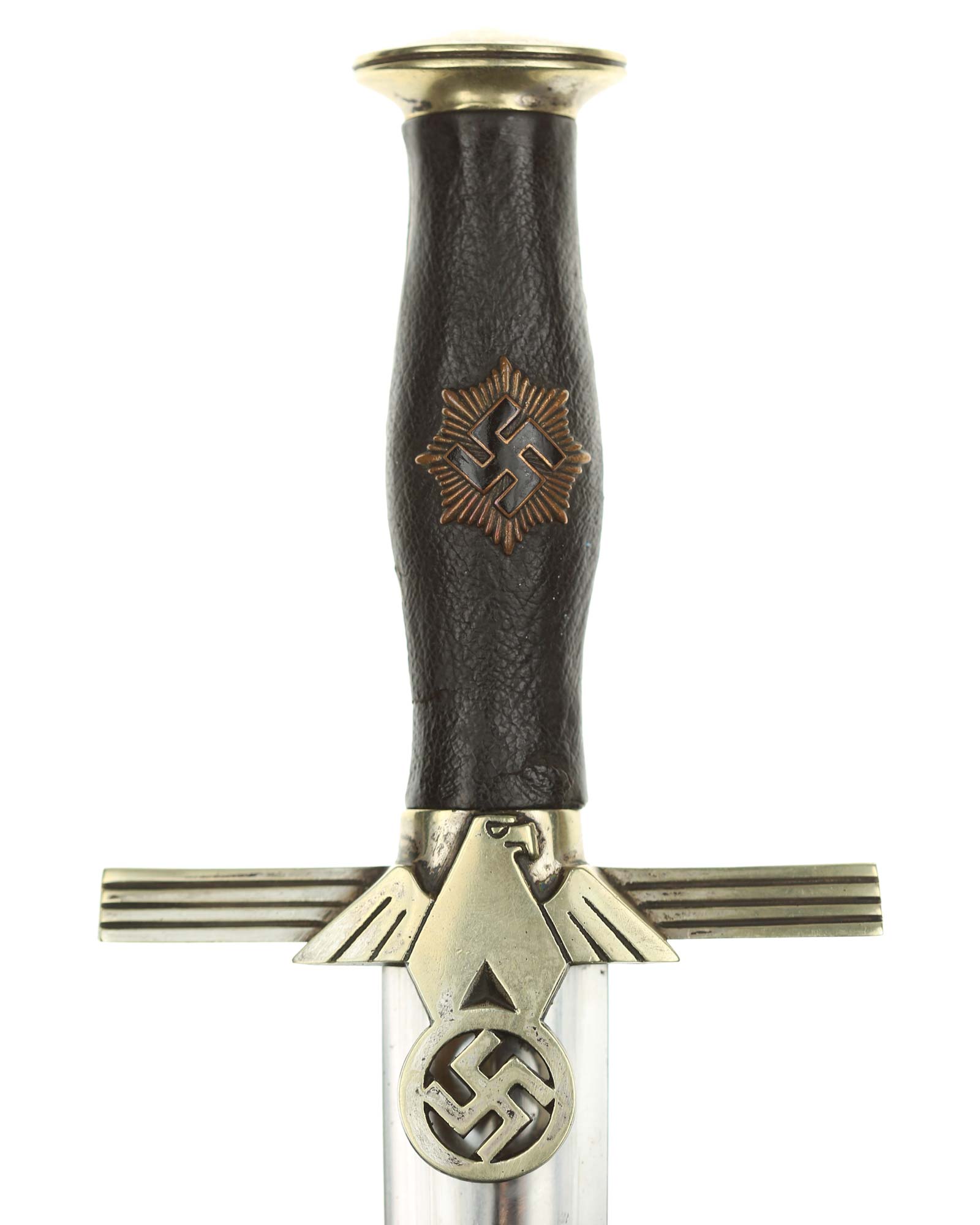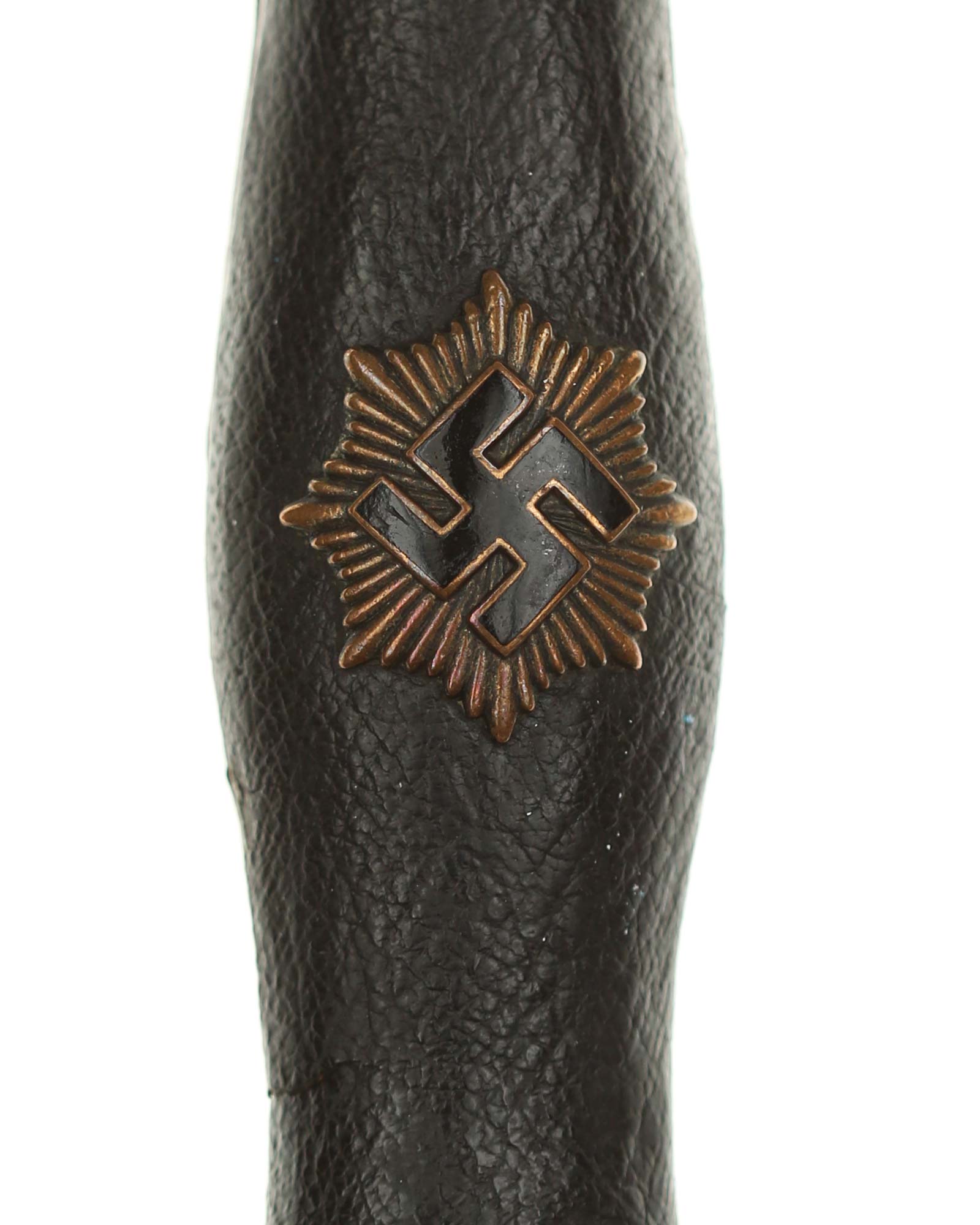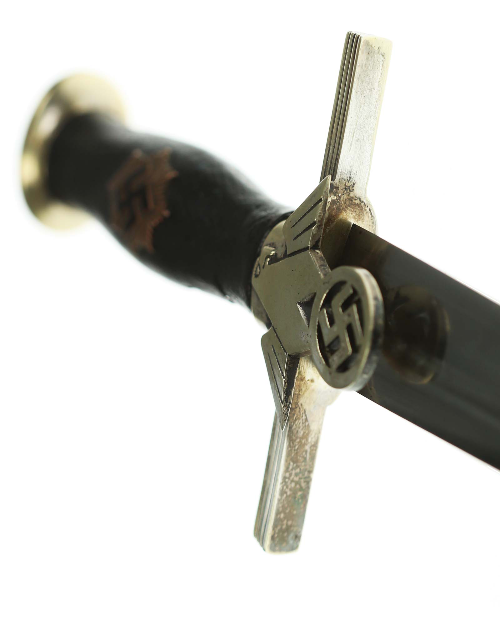 Grip: It is a fine piece having solid nickel silver plated hilt mounts. The pommel cap still has its original pointy top and the top surfaces as well as the edges around the pommel are in good condition. The edge of the pommel has a decorative groove that runs around the circumference. The crossguard features the stubby winged, art deco eagle which looks to the viewer’s right. This bird grasps a wreath with a open swastika within the wreath. The crossguard arms are a triangular shape and each arm has three grooves in its surfaces. The grip is a wood base. It is bulbous in the center and tapers on both ends. The leather shows some usage signs. All of the original grain is still intact. The grip features a button having a sunburst in the backgrounds. The original silvering still appears to be intact throughout the sunburst.