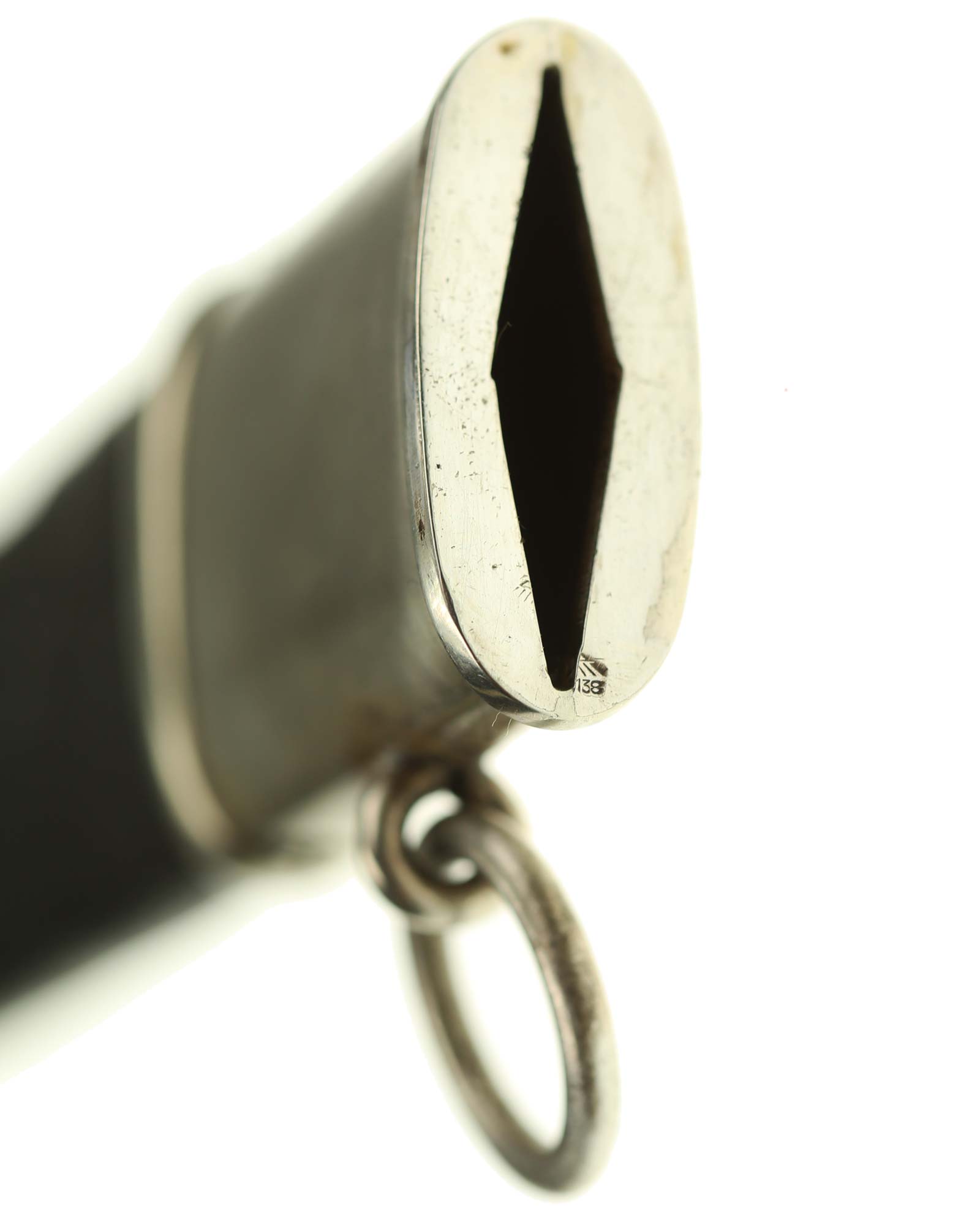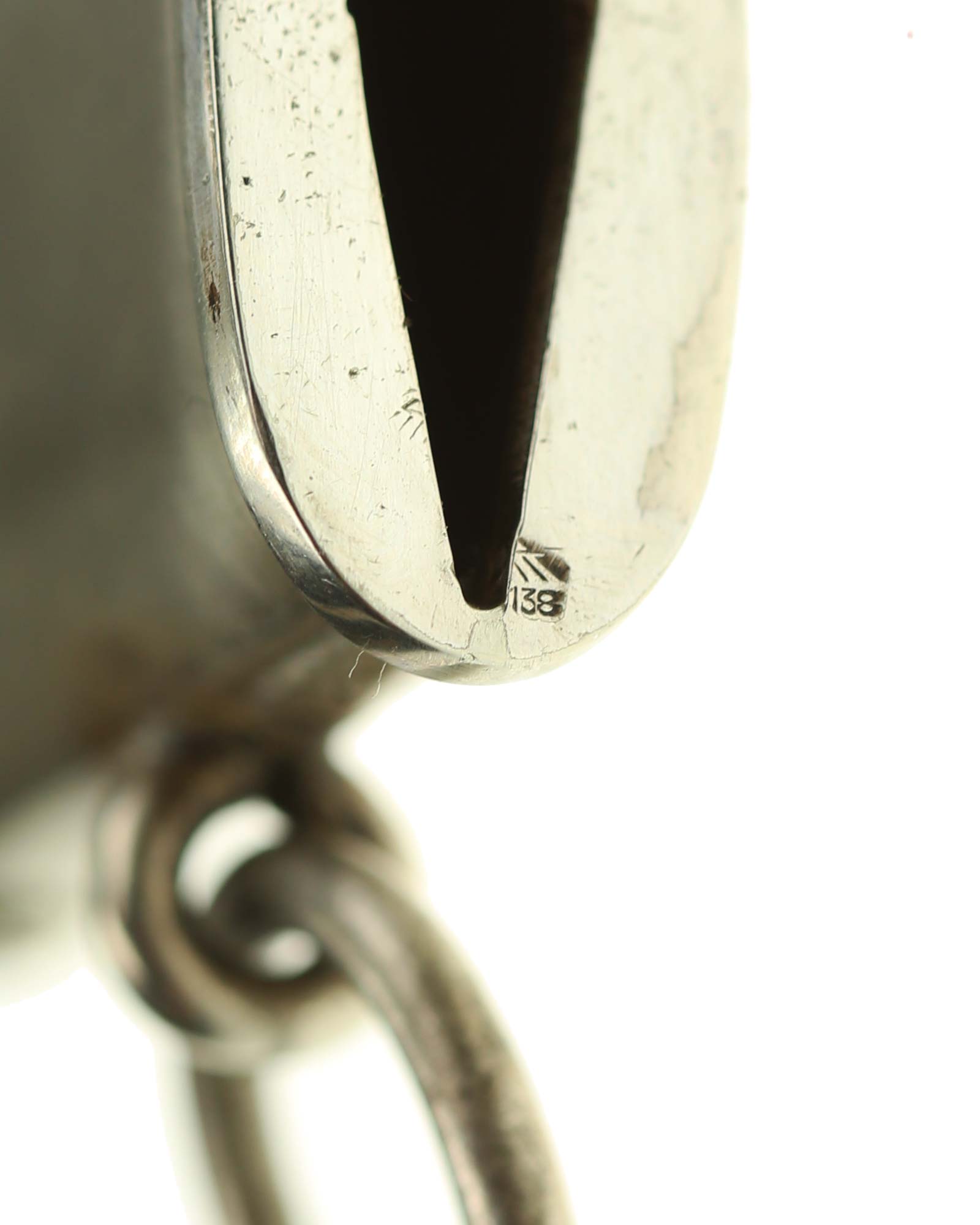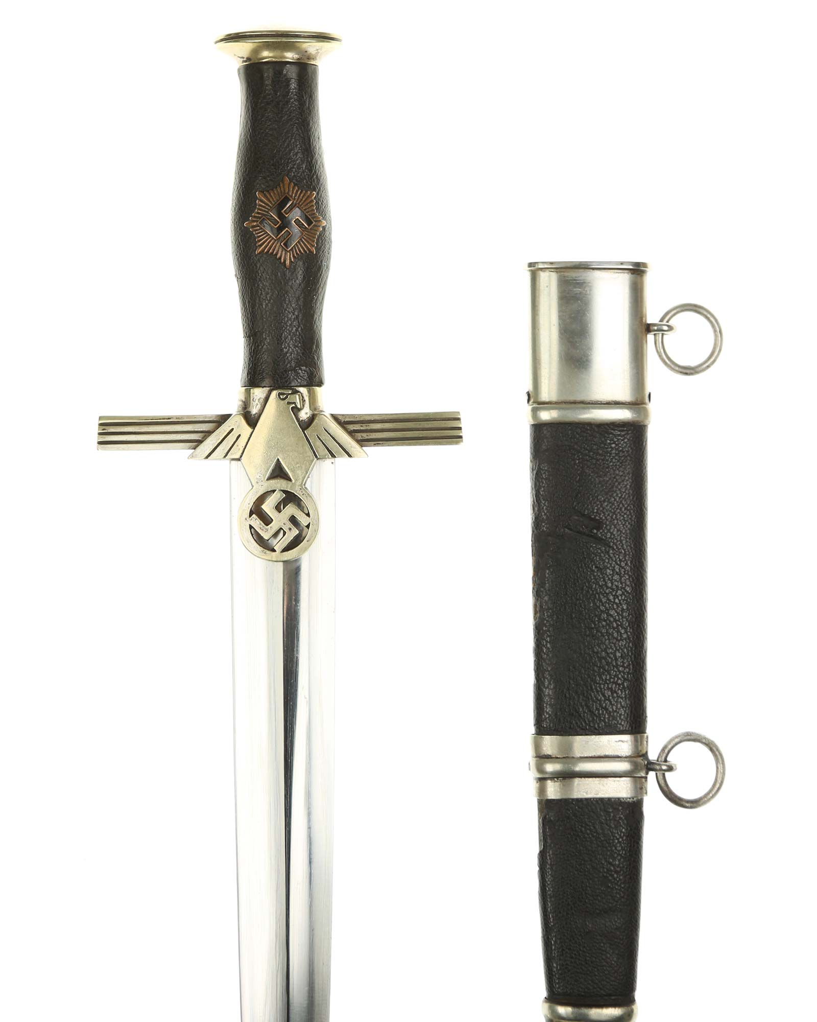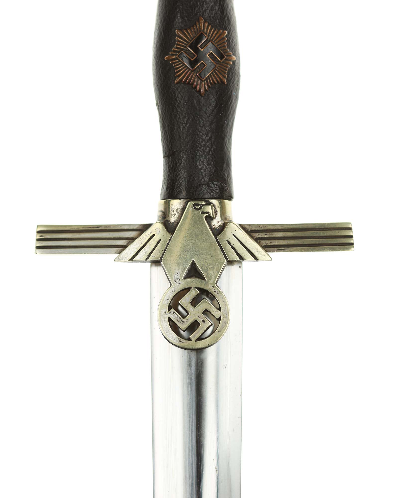 Grip: It is a fine piece having solid nickel silver plated hilt mounts. The pommel cap still has its original pointy top and the top surfaces as well as the edges around the pommel are in good condition. The edge of the pommel has a decorative groove that runs around the circumference. The crossguard features the stubby winged, art deco eagle which looks to the viewer’s right. This bird grasps a wreath with a open swastika within the wreath. The crossguard arms are a triangular shape and each arm has three grooves in its surfaces. The grip is a wood base. It is bulbous in the center and tapers on both ends. The leather shows some usage signs. All of the original grain is still intact. The grip features a button having a sunburst in the backgrounds. The original silvering still appears to be intact throughout the sunburst.