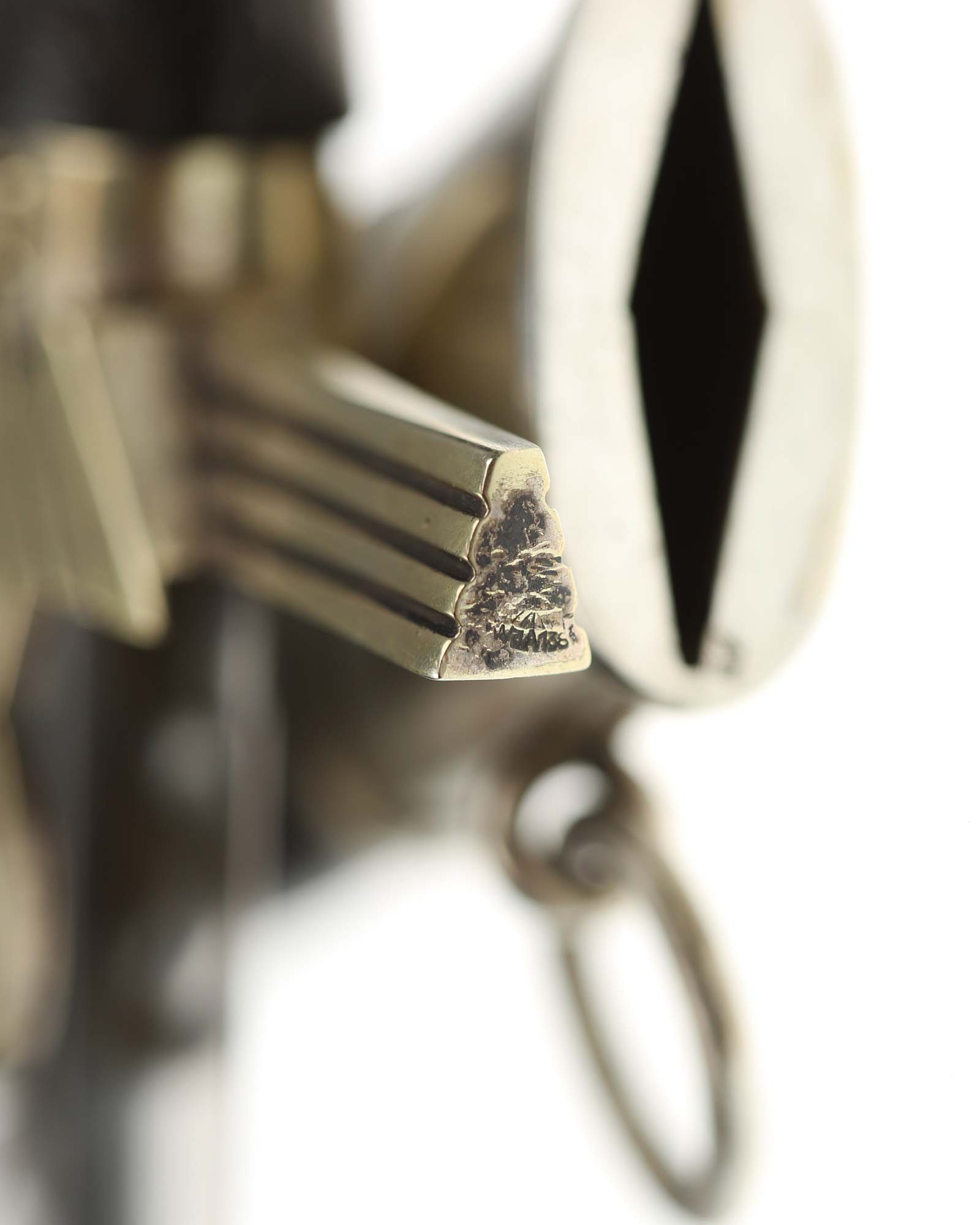 Scabbard: The scabbard shell is straight throughout. This metal shell is covered with leather. The scabbard mounts are the silver-plated steel base type. This would indicate that this piece was made as a 2nd Model and was not converted from a 1st. The center and upper mount are equipped with eyelets and hanging rings.