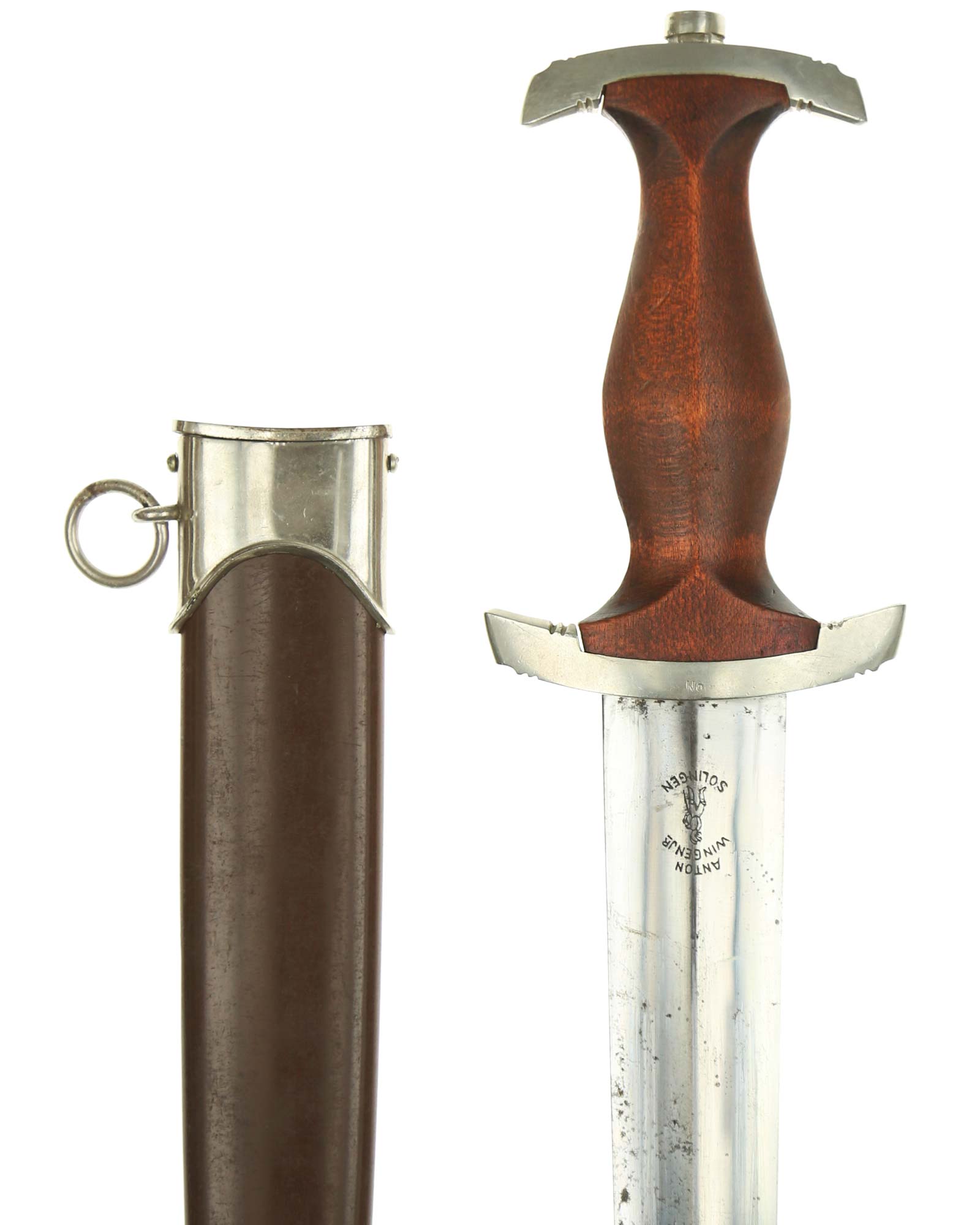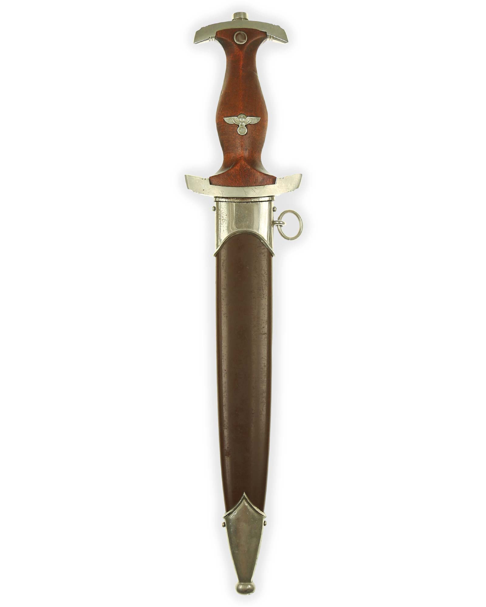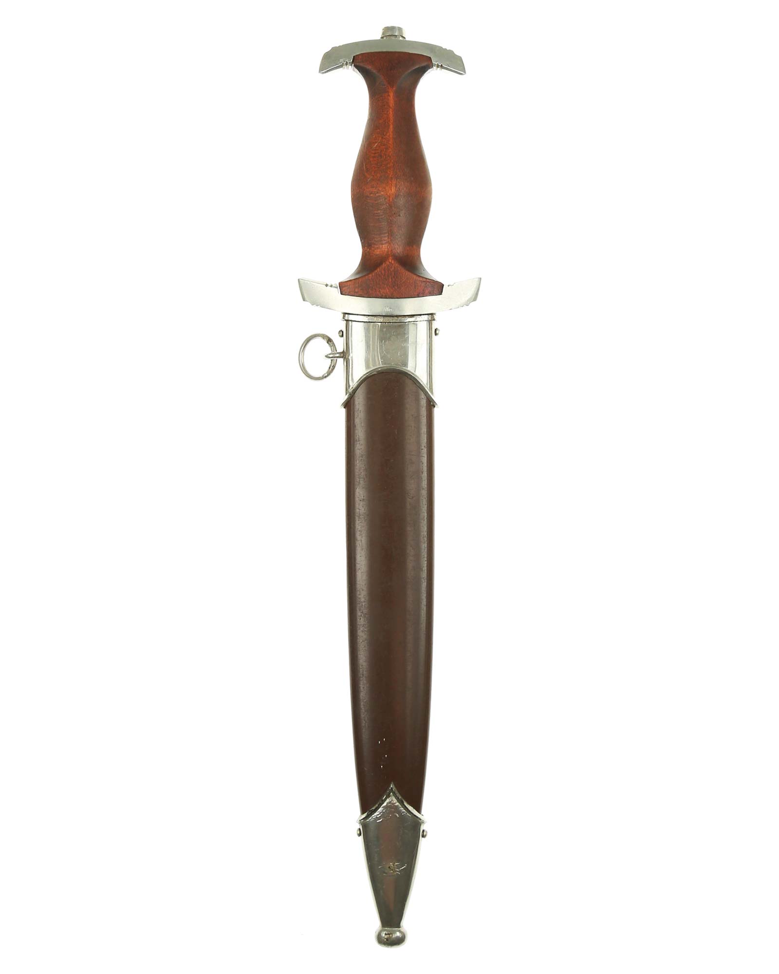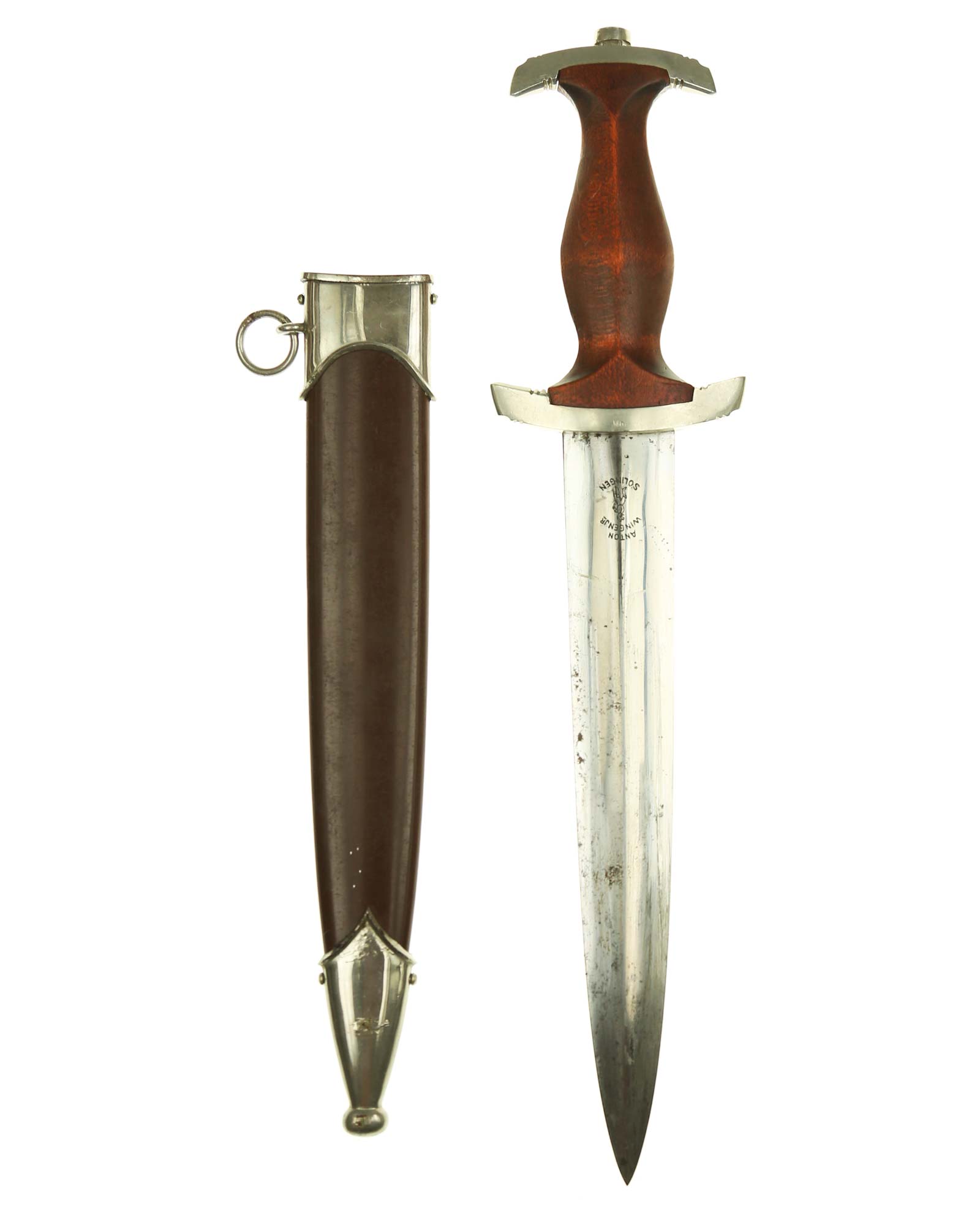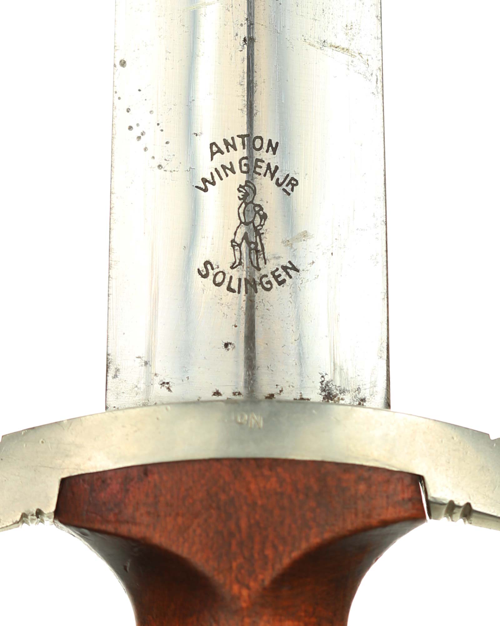 This SA [Sturmabteilung] Wingen Dagger in EXC++ condition. Model 1933. The total length is 38.0 cm. Early Nickel fittings, lower guard with "No" stamp. The Dagger has the maker mark on the blade: Anton Wingen Jr., Solingen.