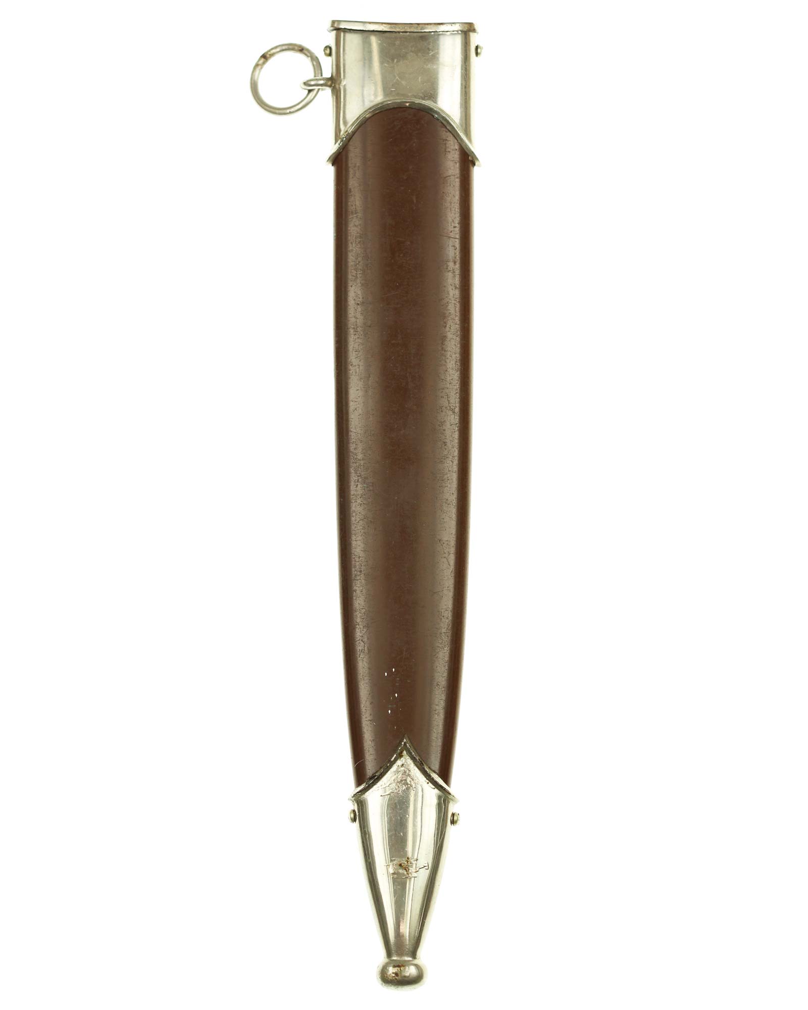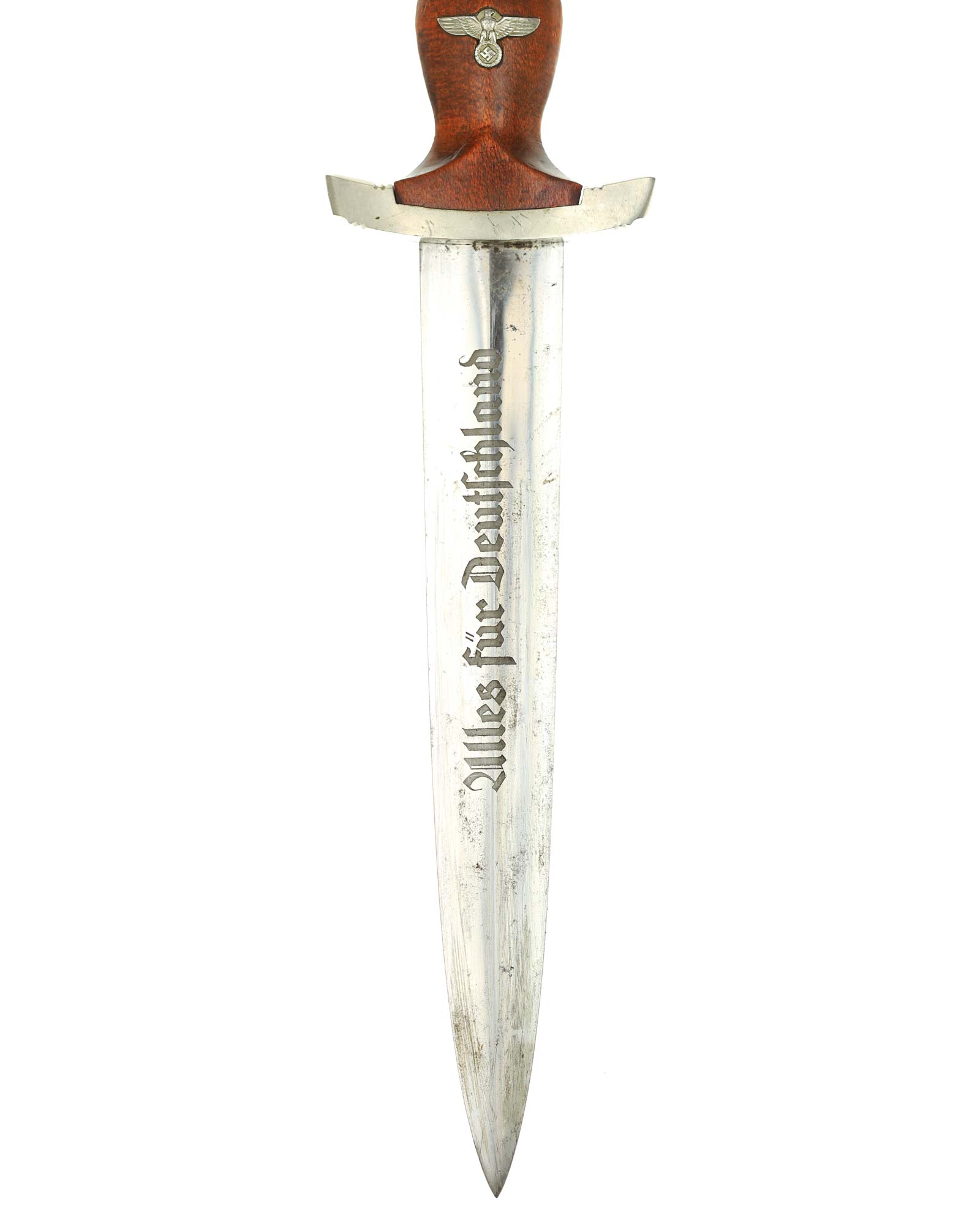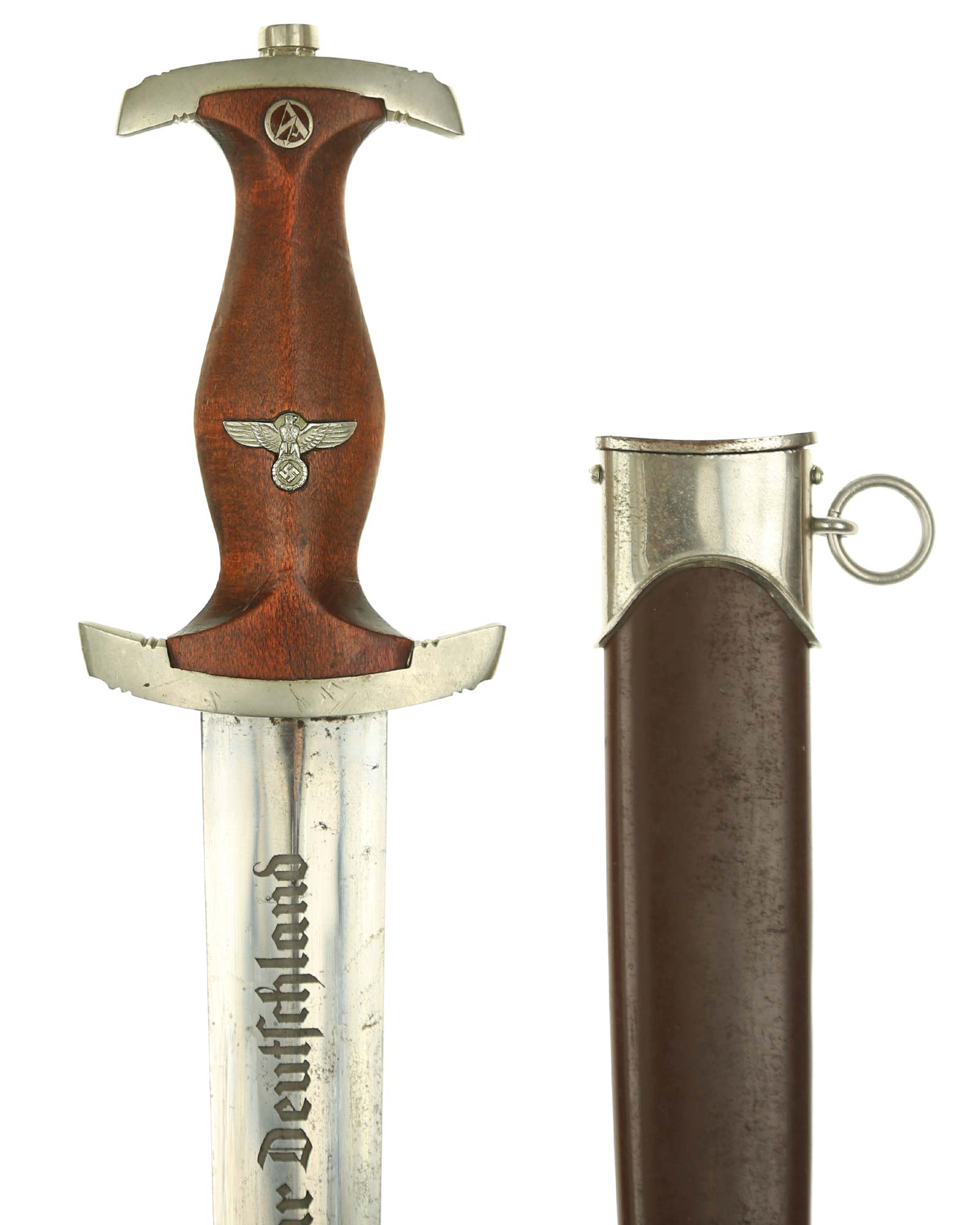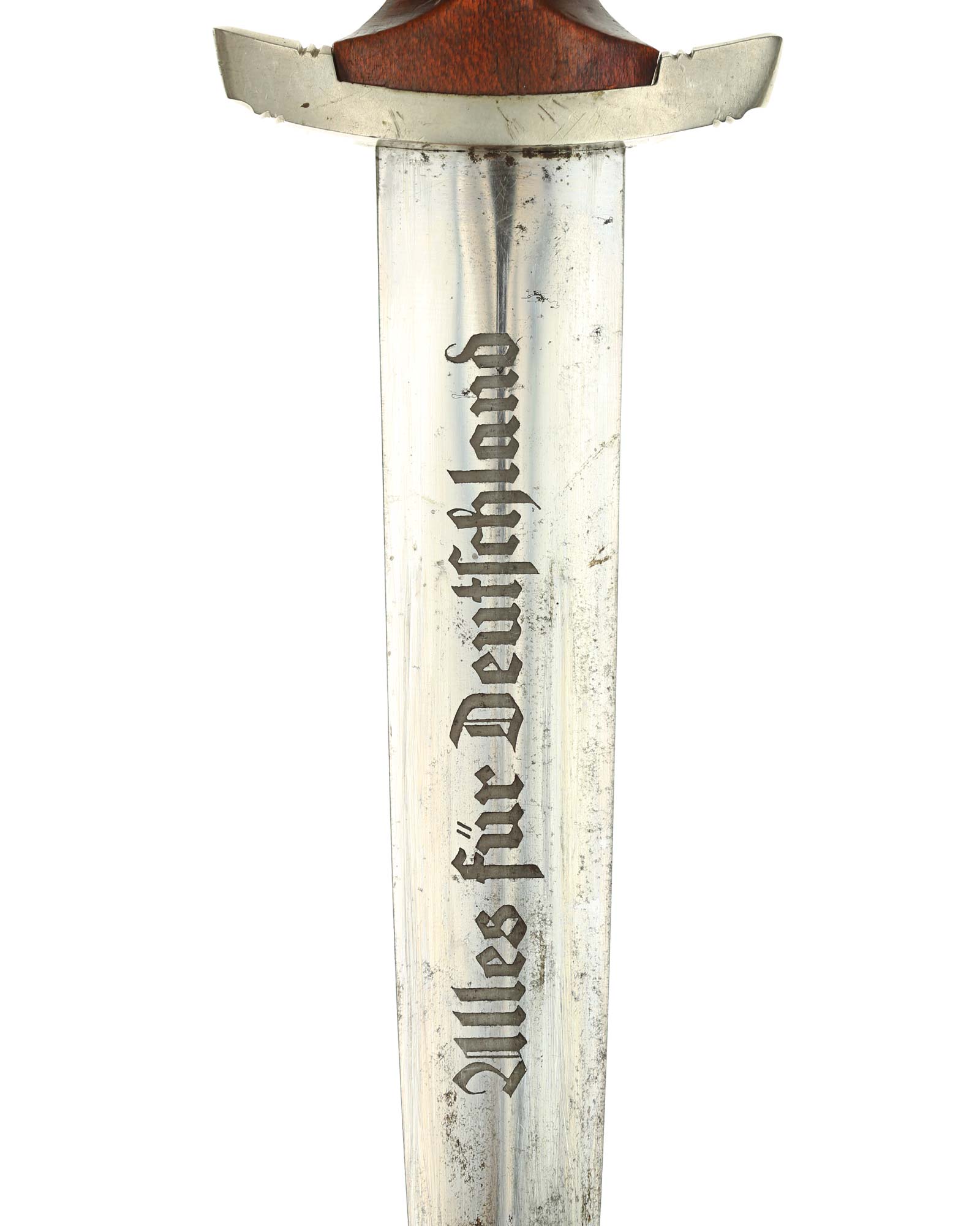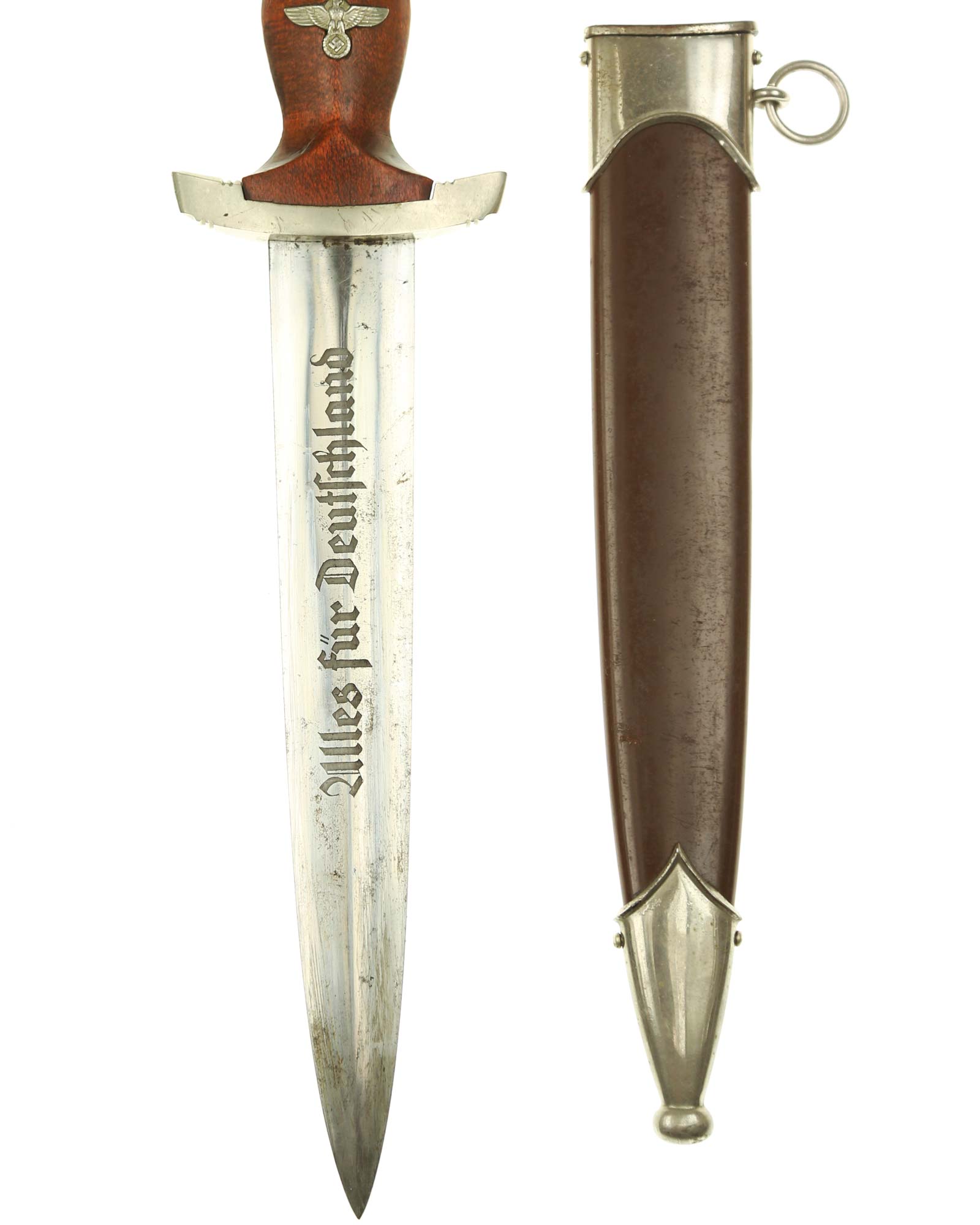 This SA [Sturmabteilung] Wingen Dagger in EXC++ condition. Model 1933. The total length is 38.0 cm. Early Nickel fittings, lower guard with "No" stamp. The Dagger has the maker mark on the blade: Anton Wingen Jr., Solingen.