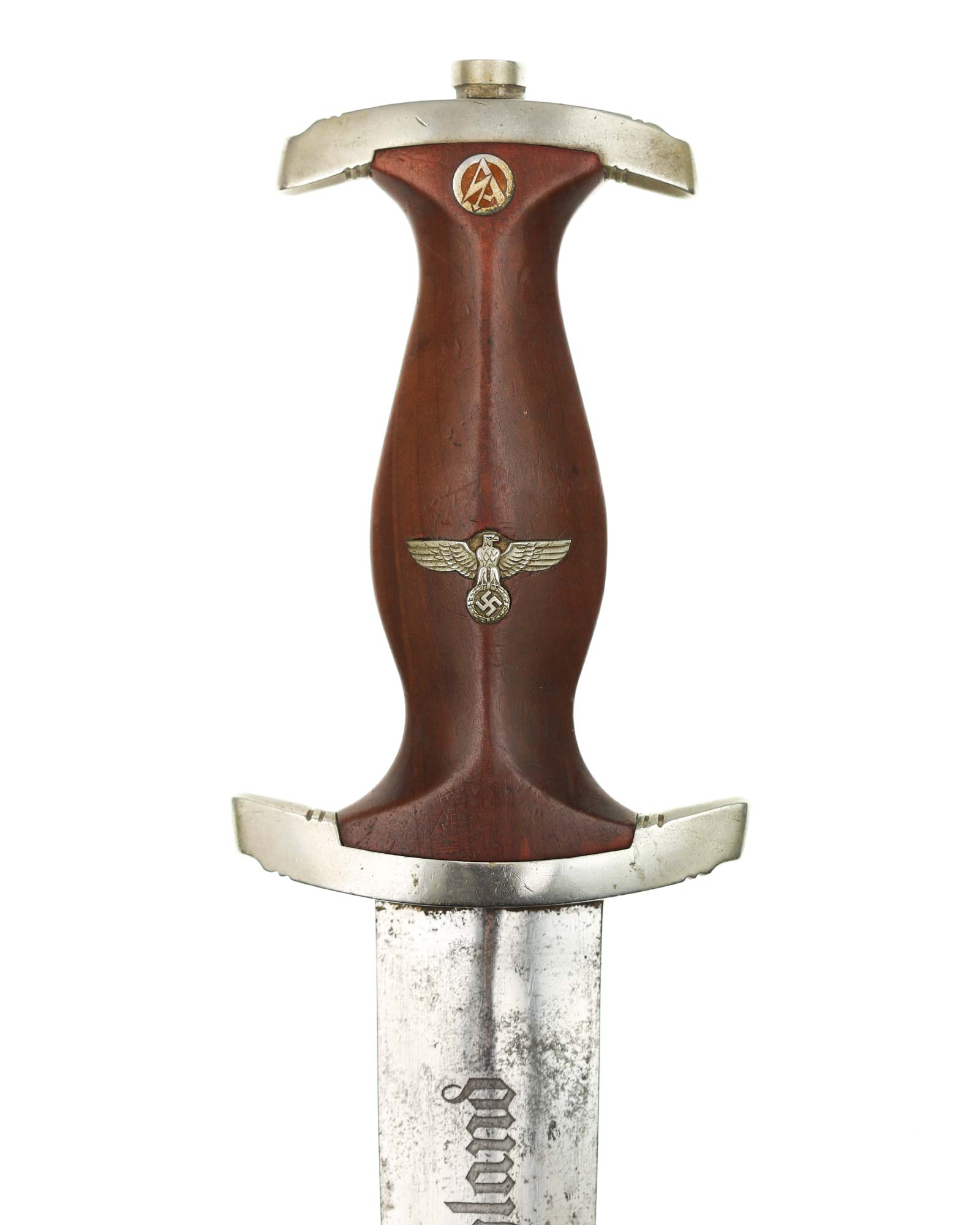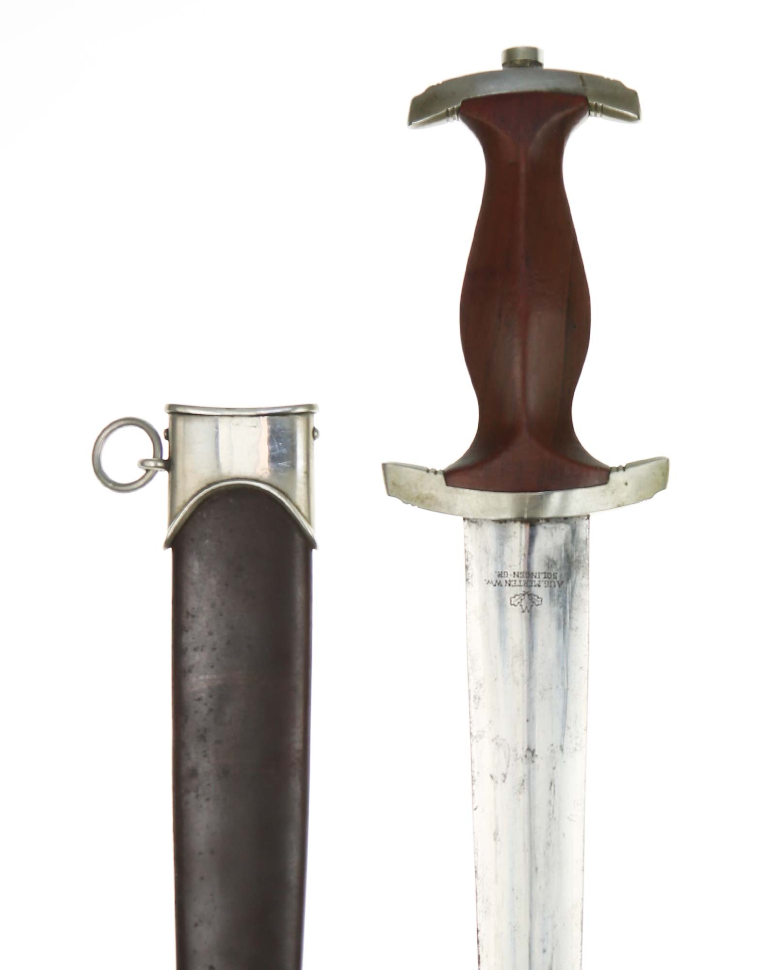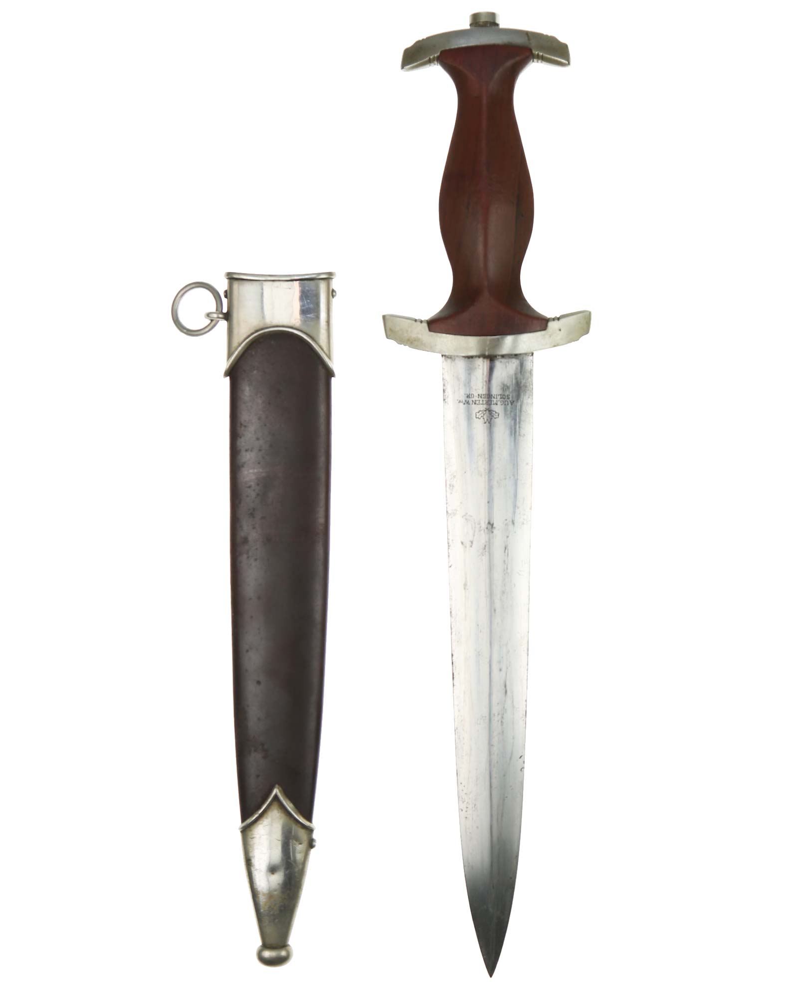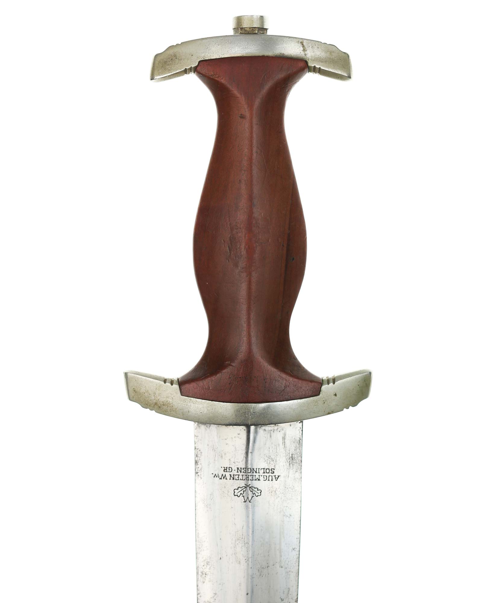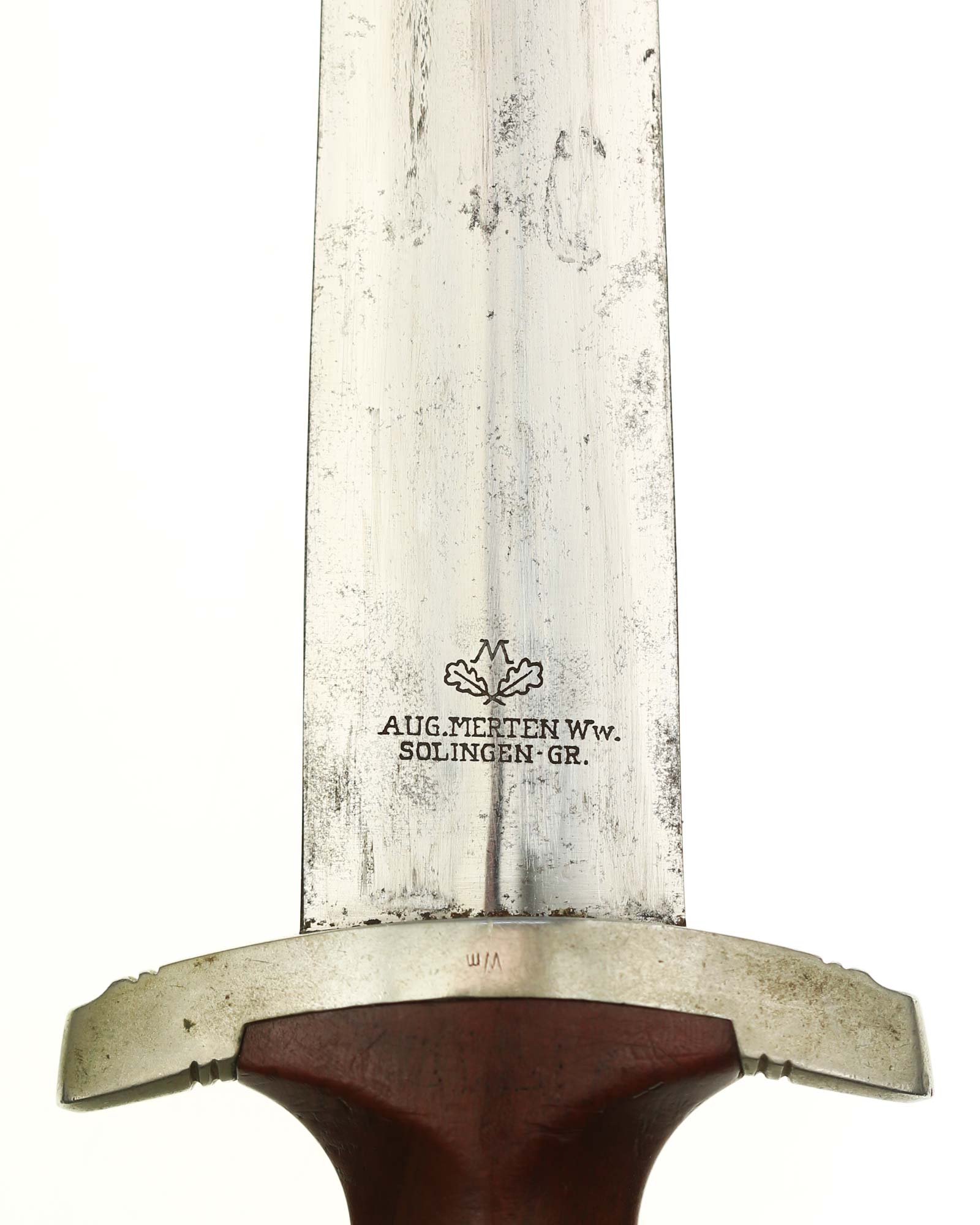 This SA [Sturmabteilung] Dagger in EXC+ condition. Model 1933. The total length is 37.3 cm. Early Nickel fittings, lower guard with «Wm» stamp. The Dagger has the maker mark on the blade: Aug. Merten Solingen.