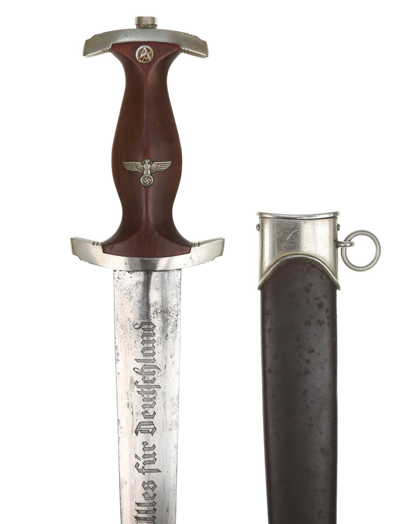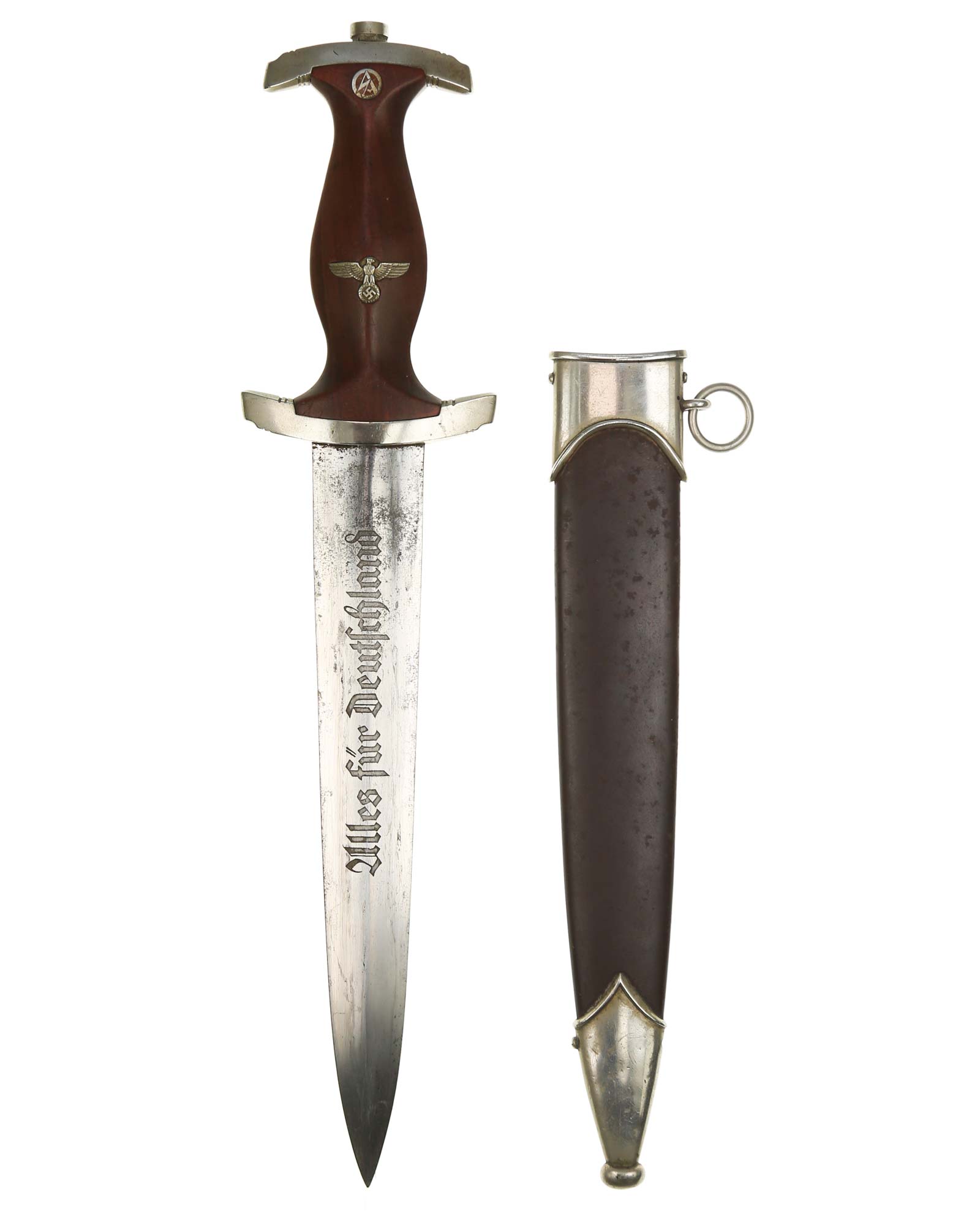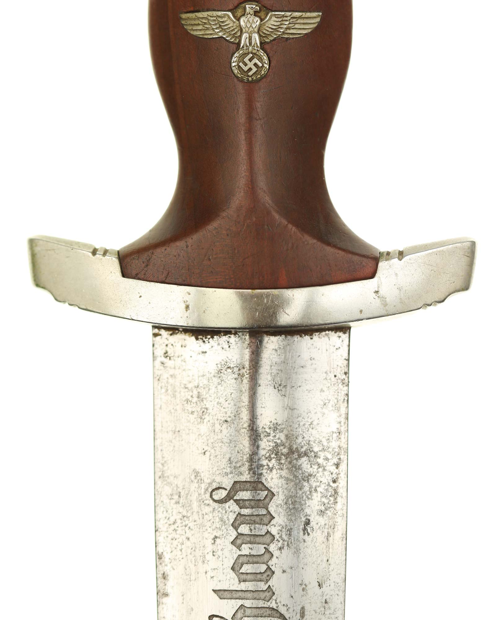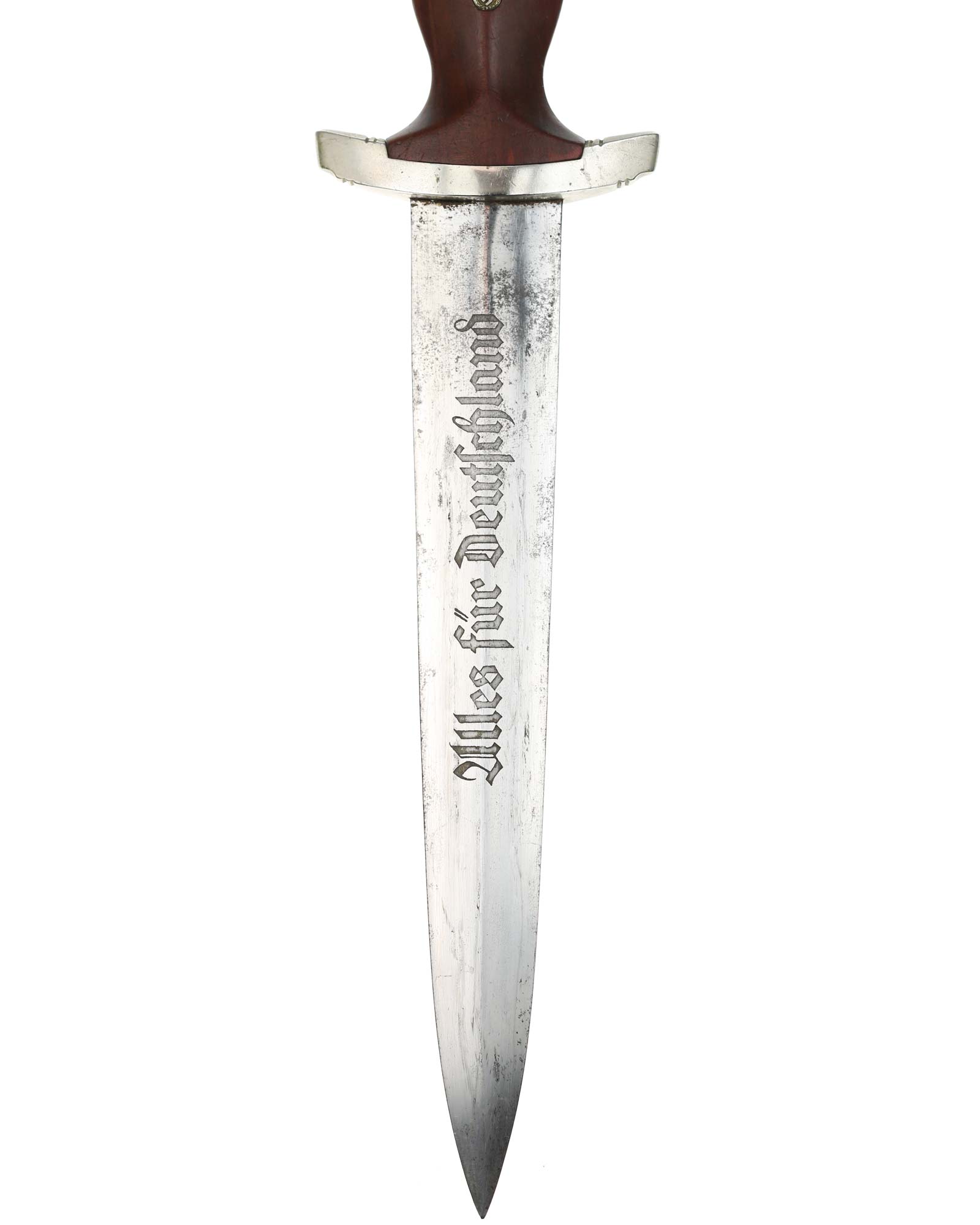 This SA [Sturmabteilung] Dagger in EXC+ condition. Model 1933. The total length is 37.3 cm. Early Nickel fittings, lower guard with «Wm» stamp. The Dagger has the maker mark on the blade: Aug. Merten Solingen.