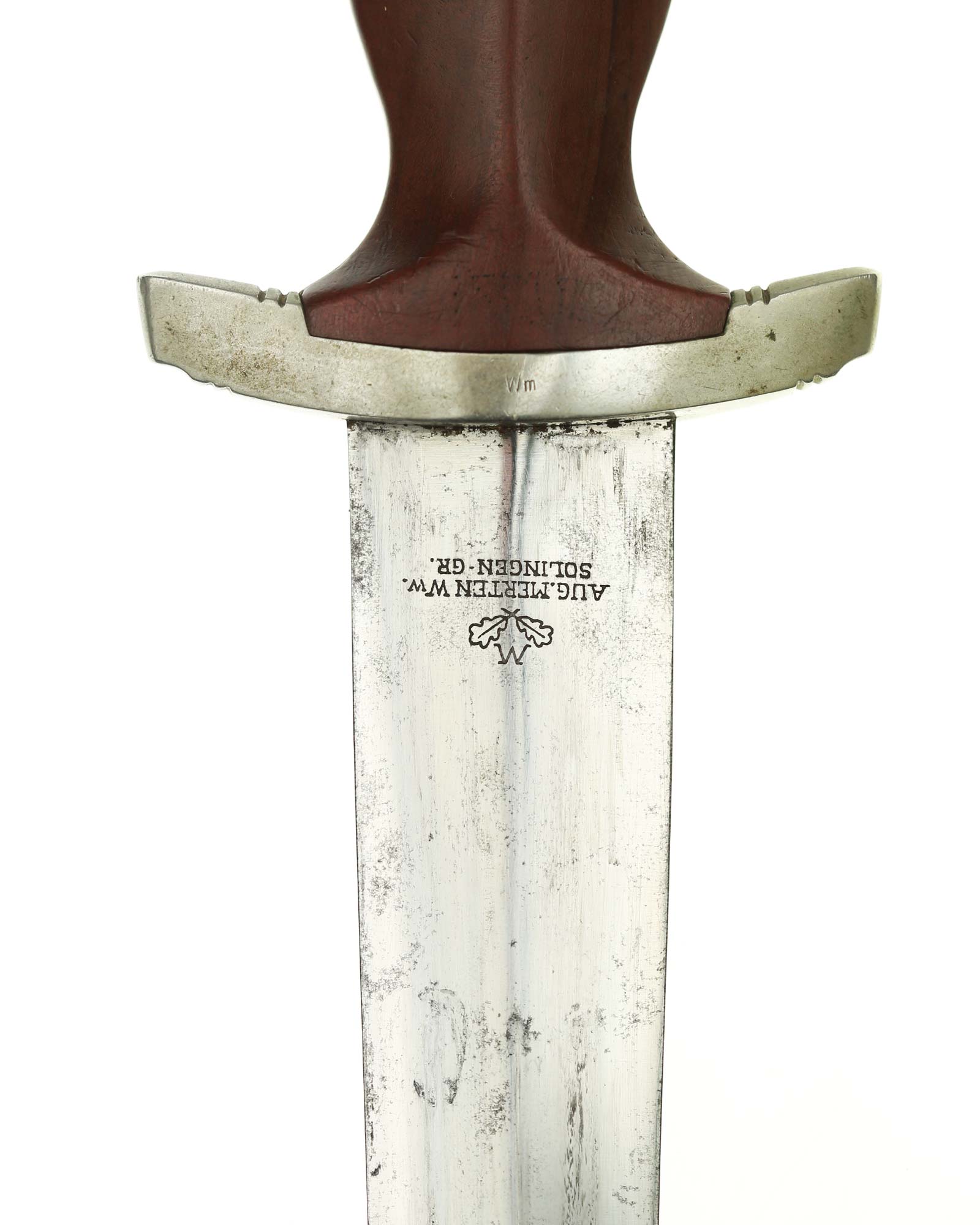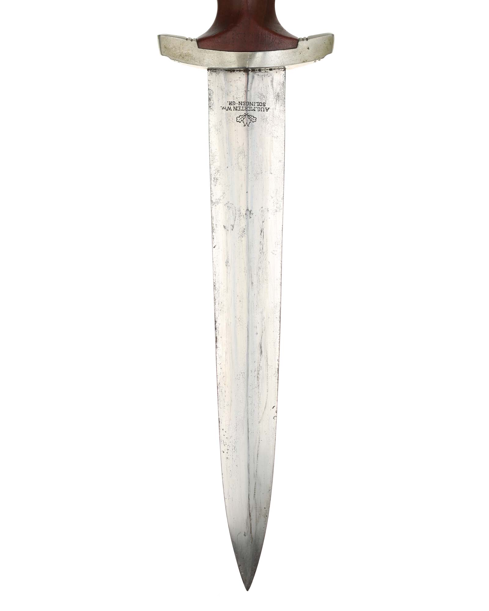Blade: The blade is double-edged. The tip remains needle-like. The reverse is marked Aug. Merten Ww. Solingen-Gr. The blade shoulders perfectly meet the lower crossguard contour.