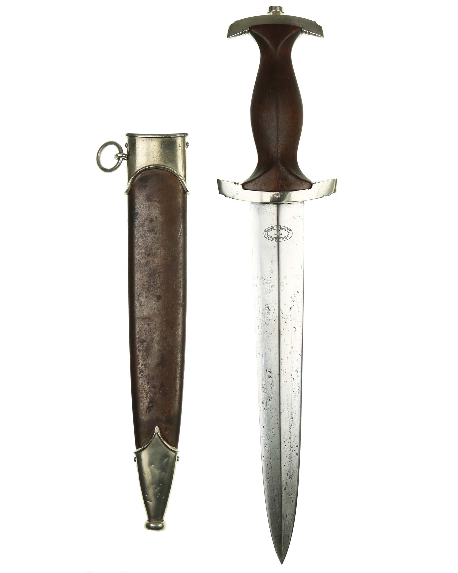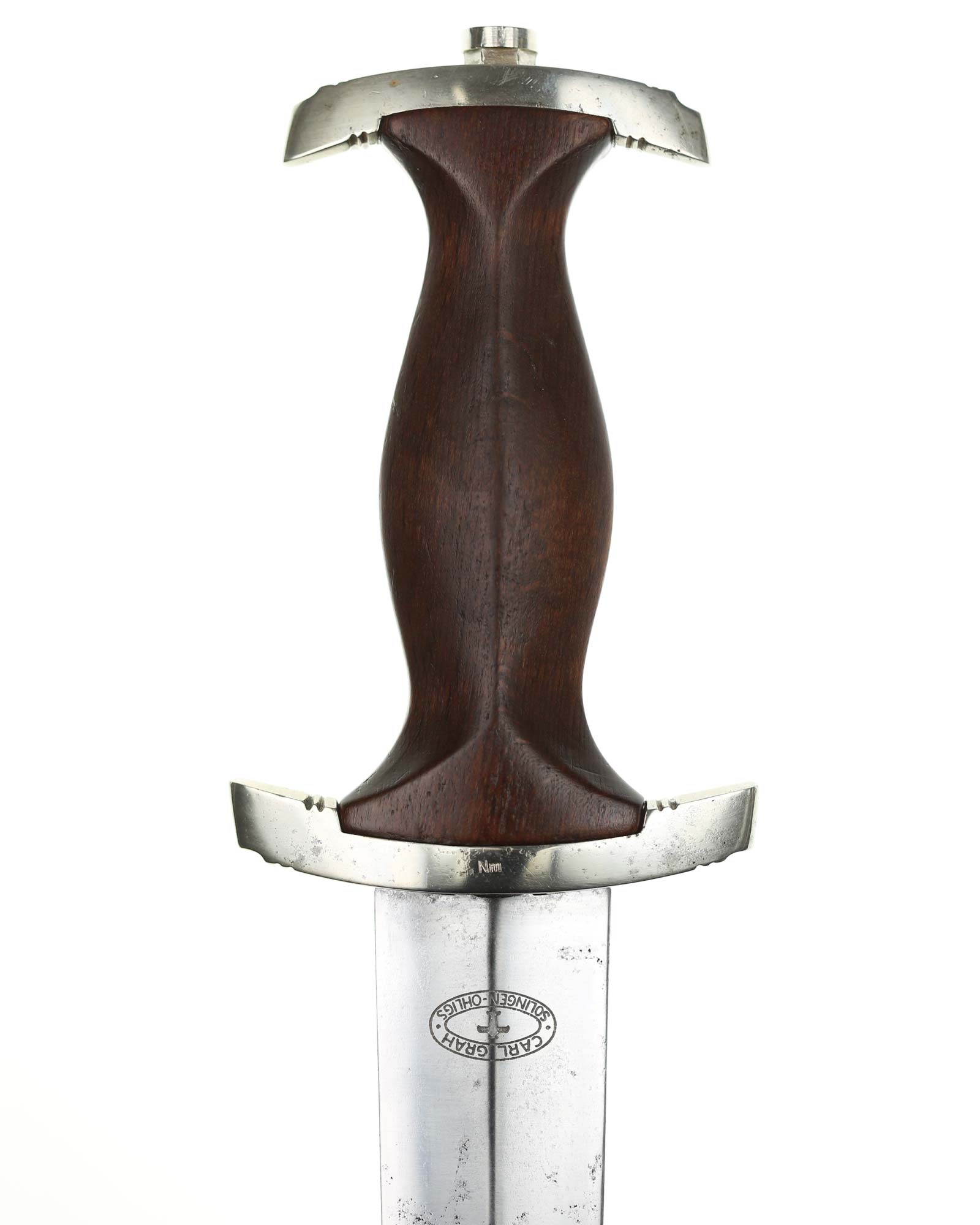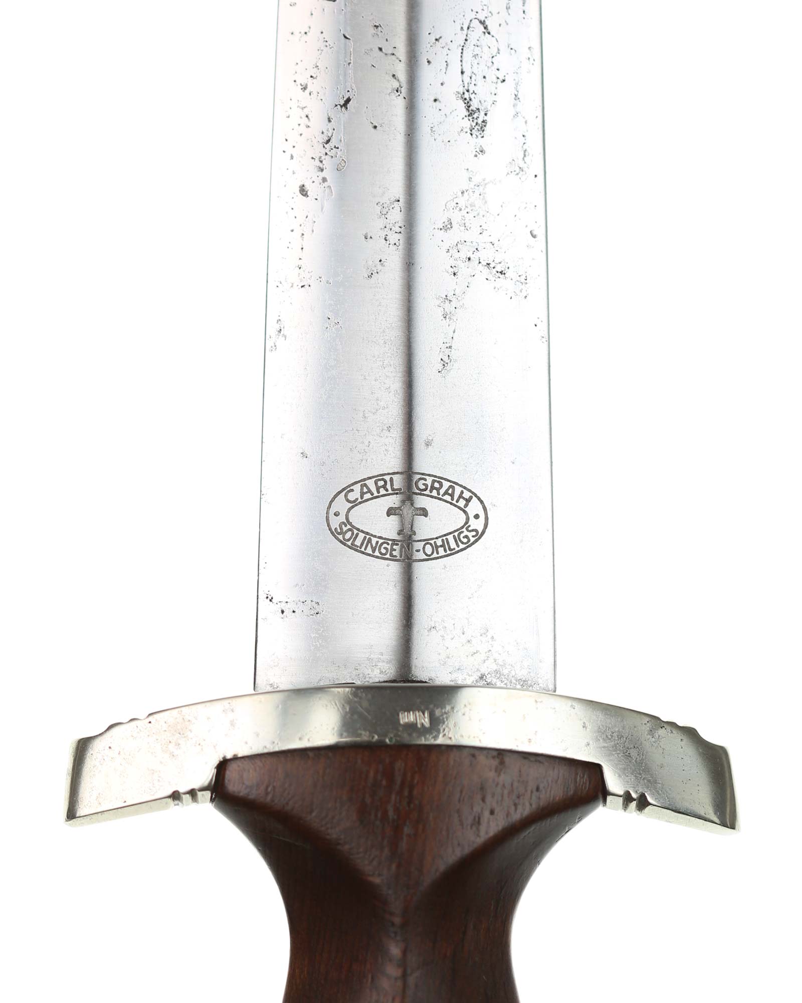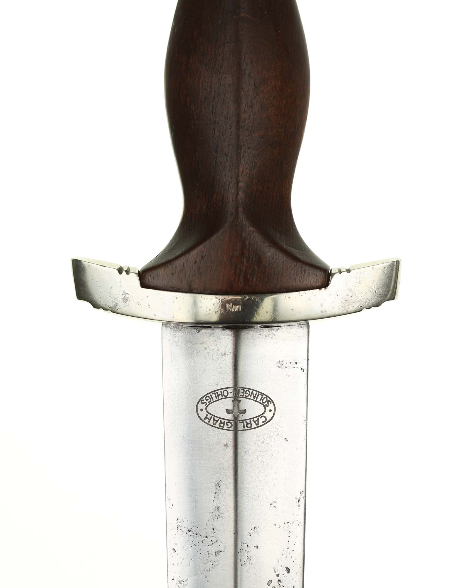 This SA [Sturmabteilung] Dagger in near mint condition. Model 1933. The total length is 37.0 cm. Early Nickel fittings. The Dagger has the maker mark on the blade: Carl Grah Solingen-Ohligs.