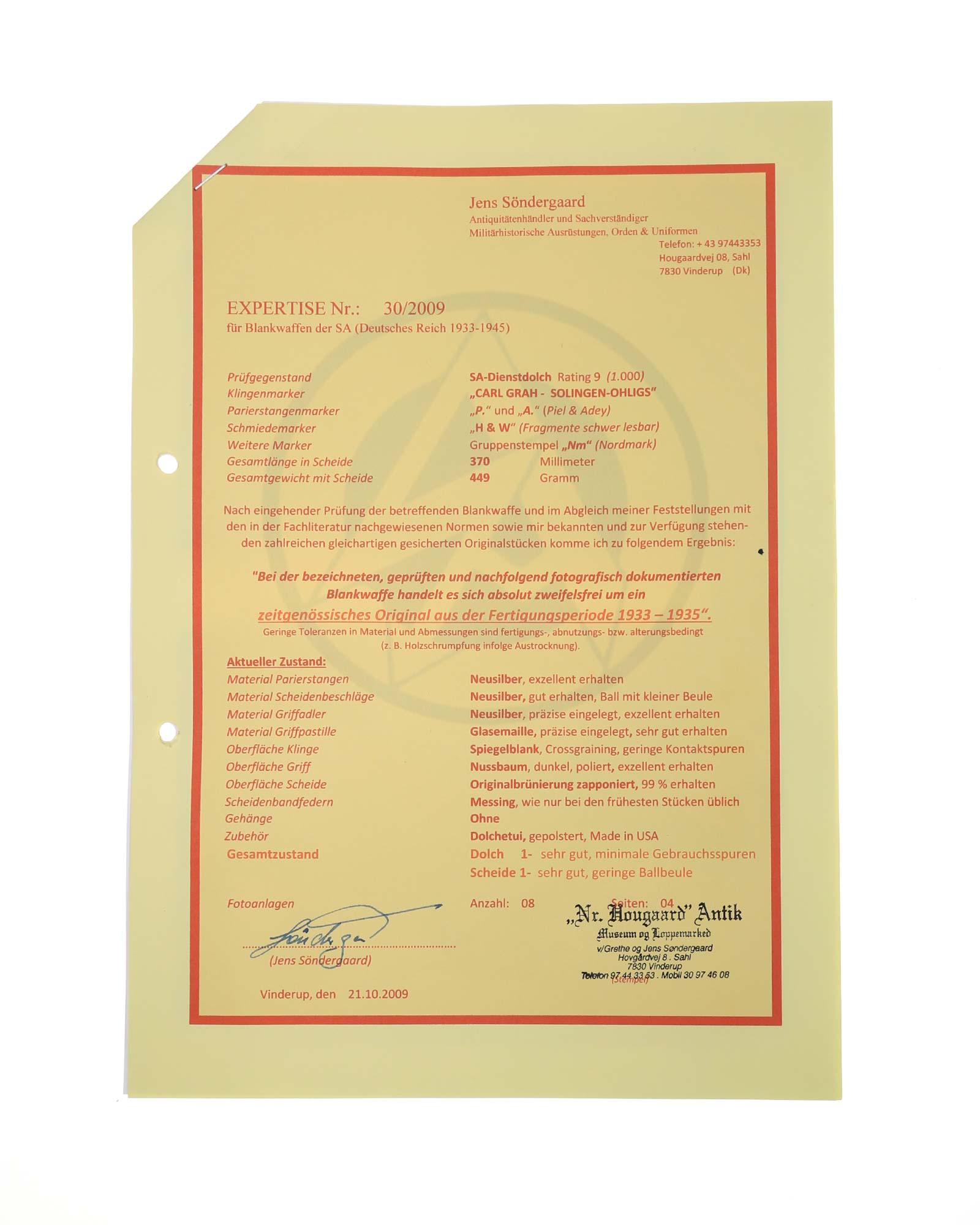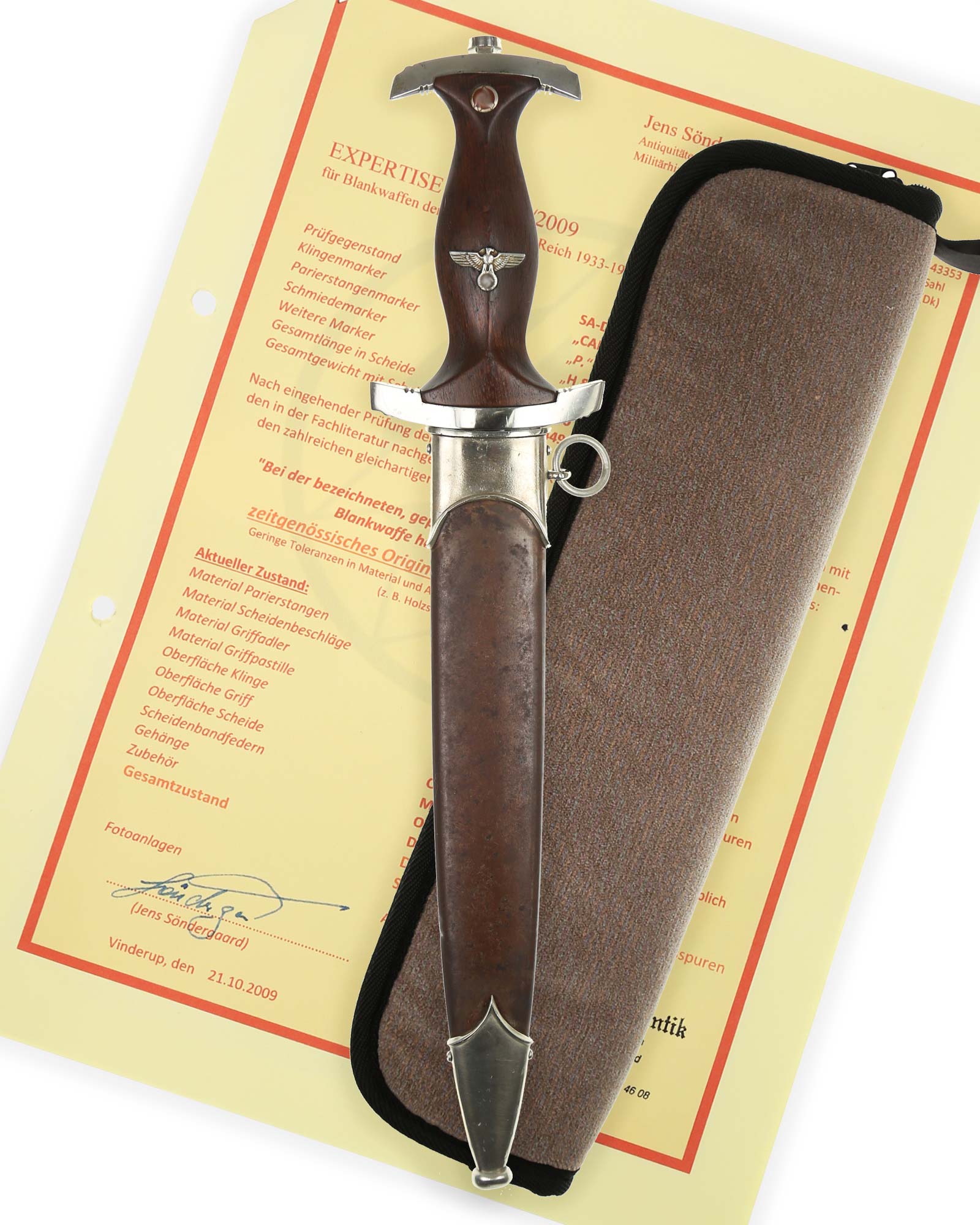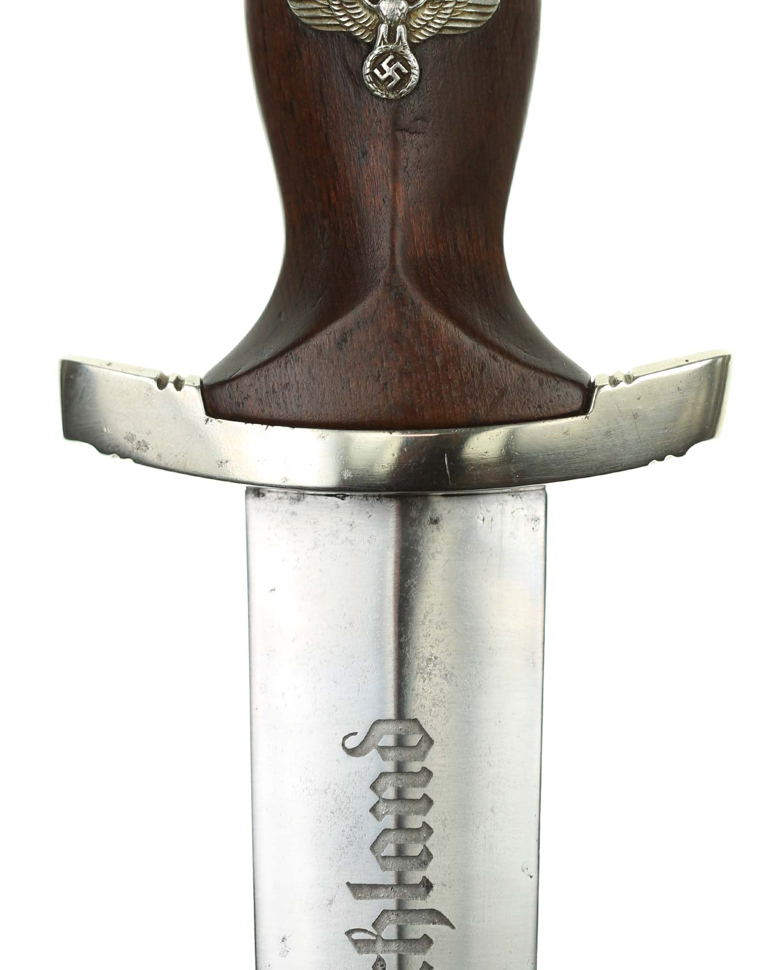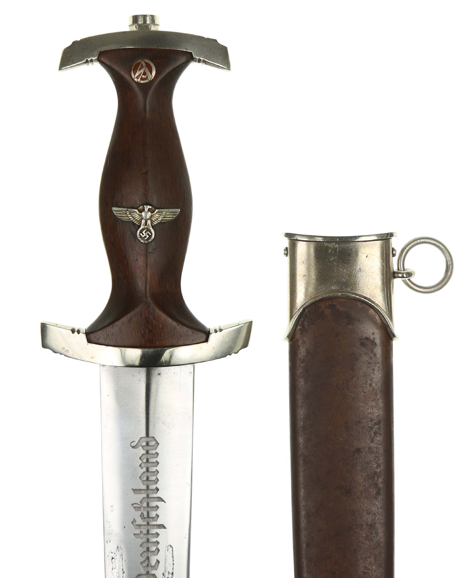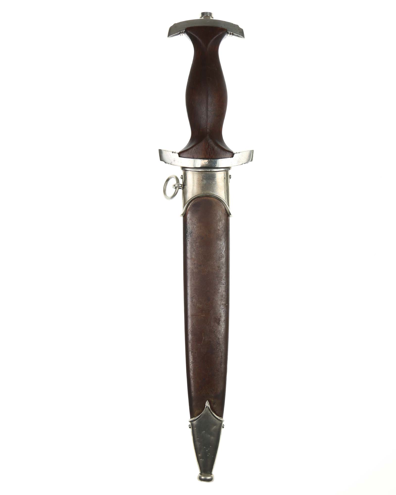 This SA [Sturmabteilung] Dagger in near mint condition. Model 1933. The total length is 37.0 cm. Early Nickel fittings. The Dagger has the maker mark on the blade: Carl Grah Solingen-Ohligs.