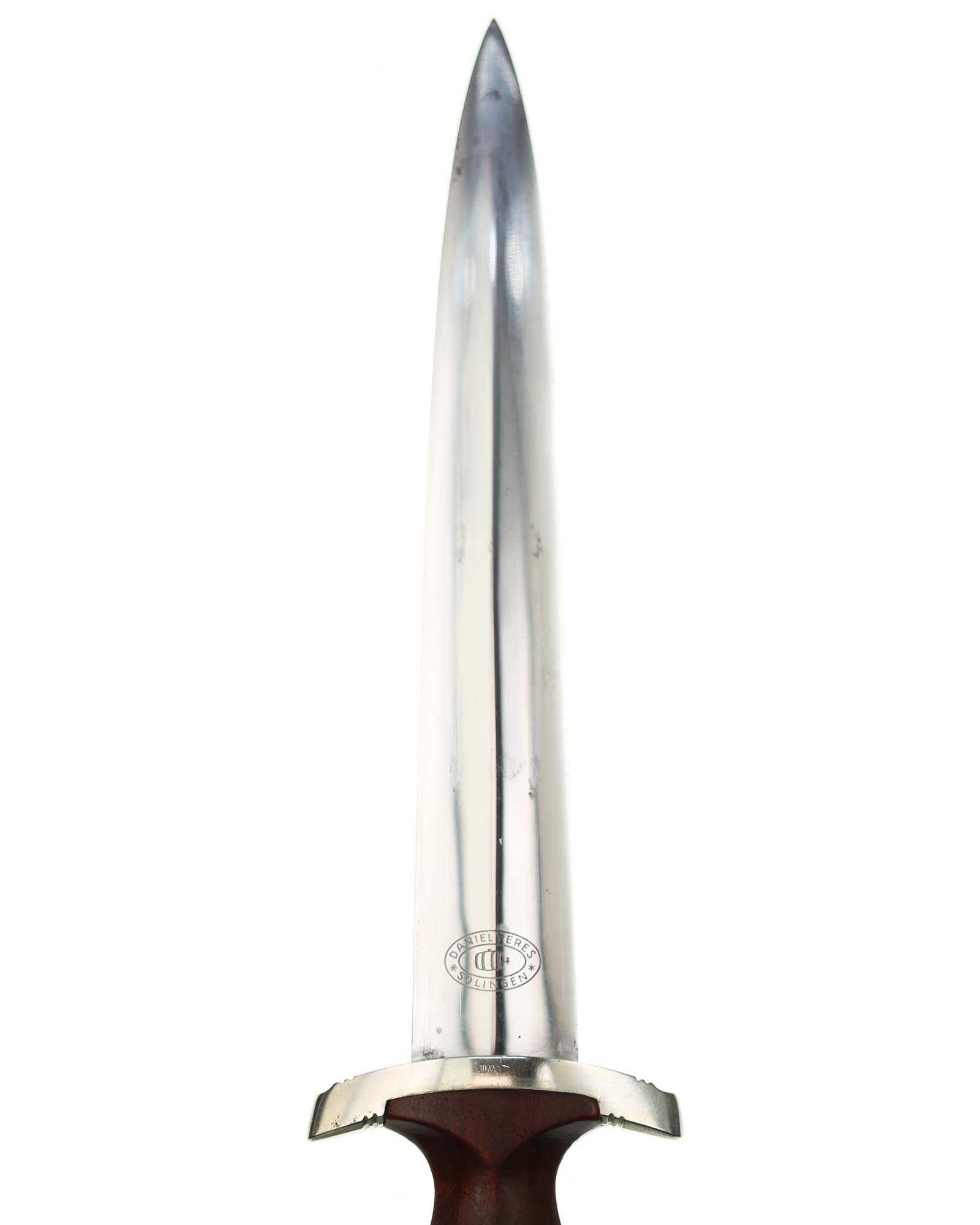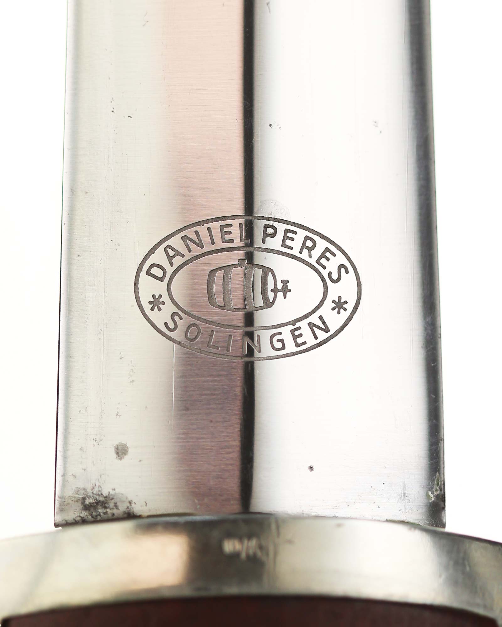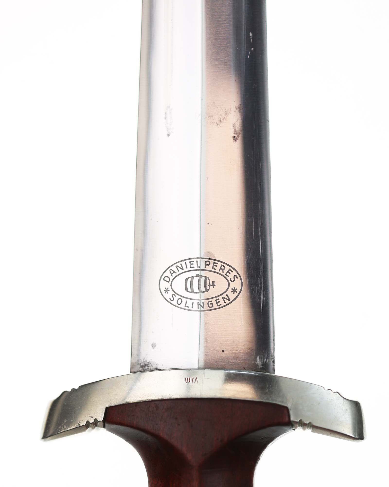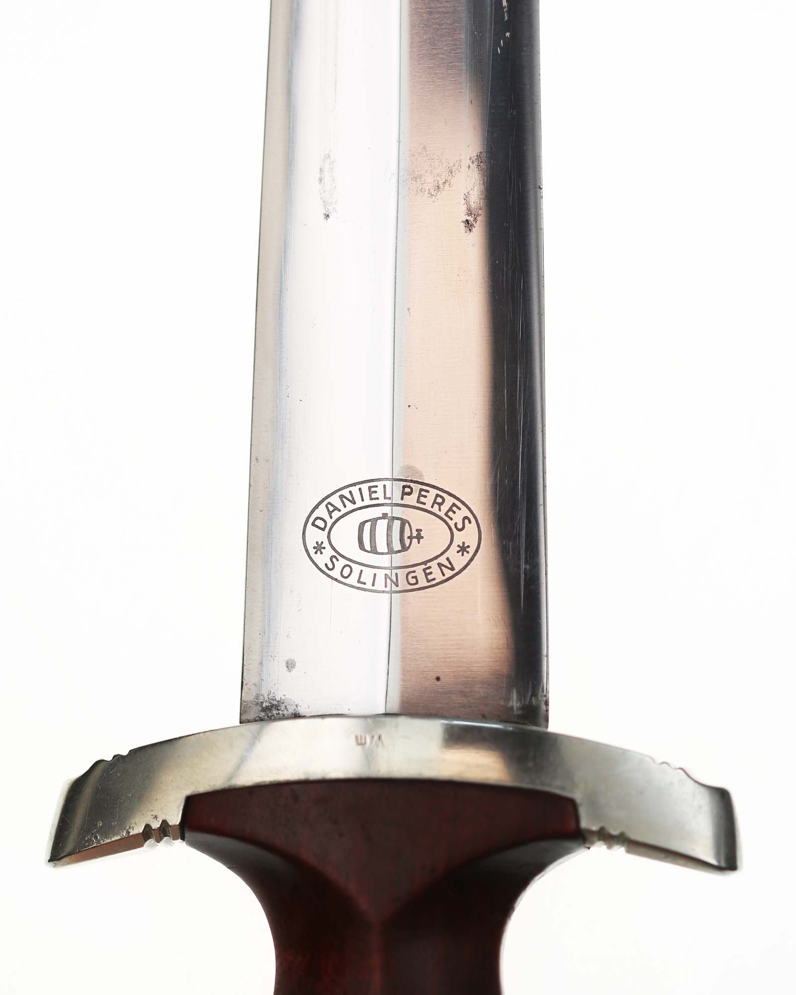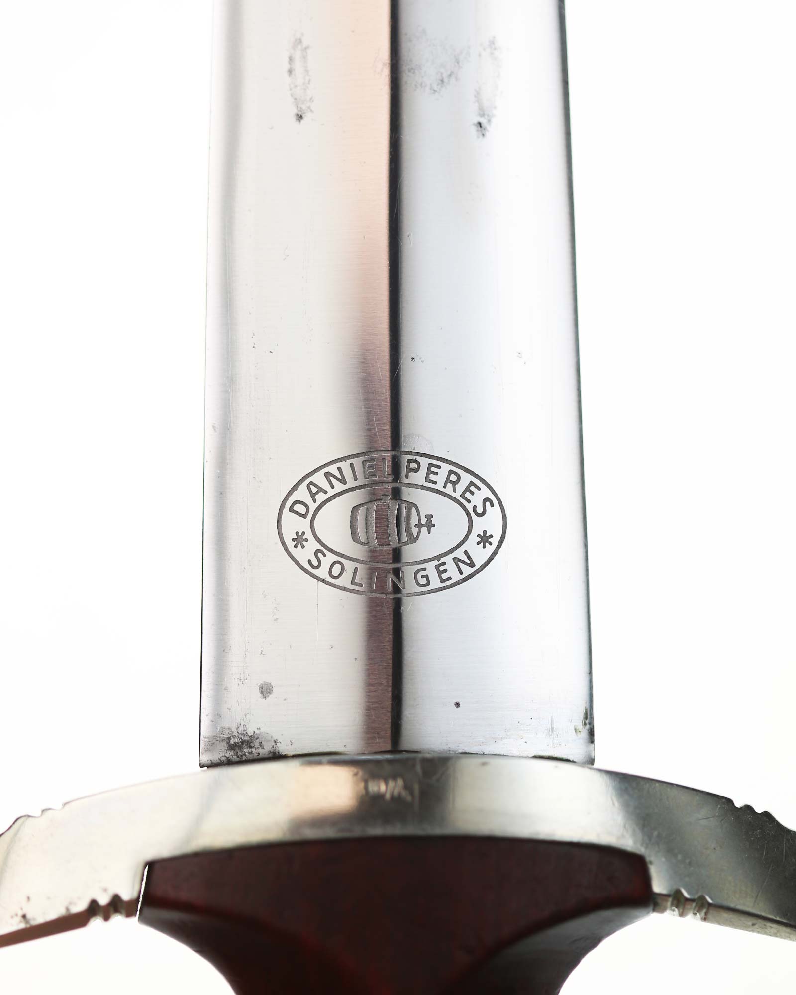 This SA [Sturmabteilung] Dagger in NEAR MINT condition. Model 1933. Early Nickel fittings, lower guard with «Wm» stamp. The Dagger has the very rare maker mark [4 of 5] on the blade: Daniel Peres Solingen. The total length is 37.5 cm.