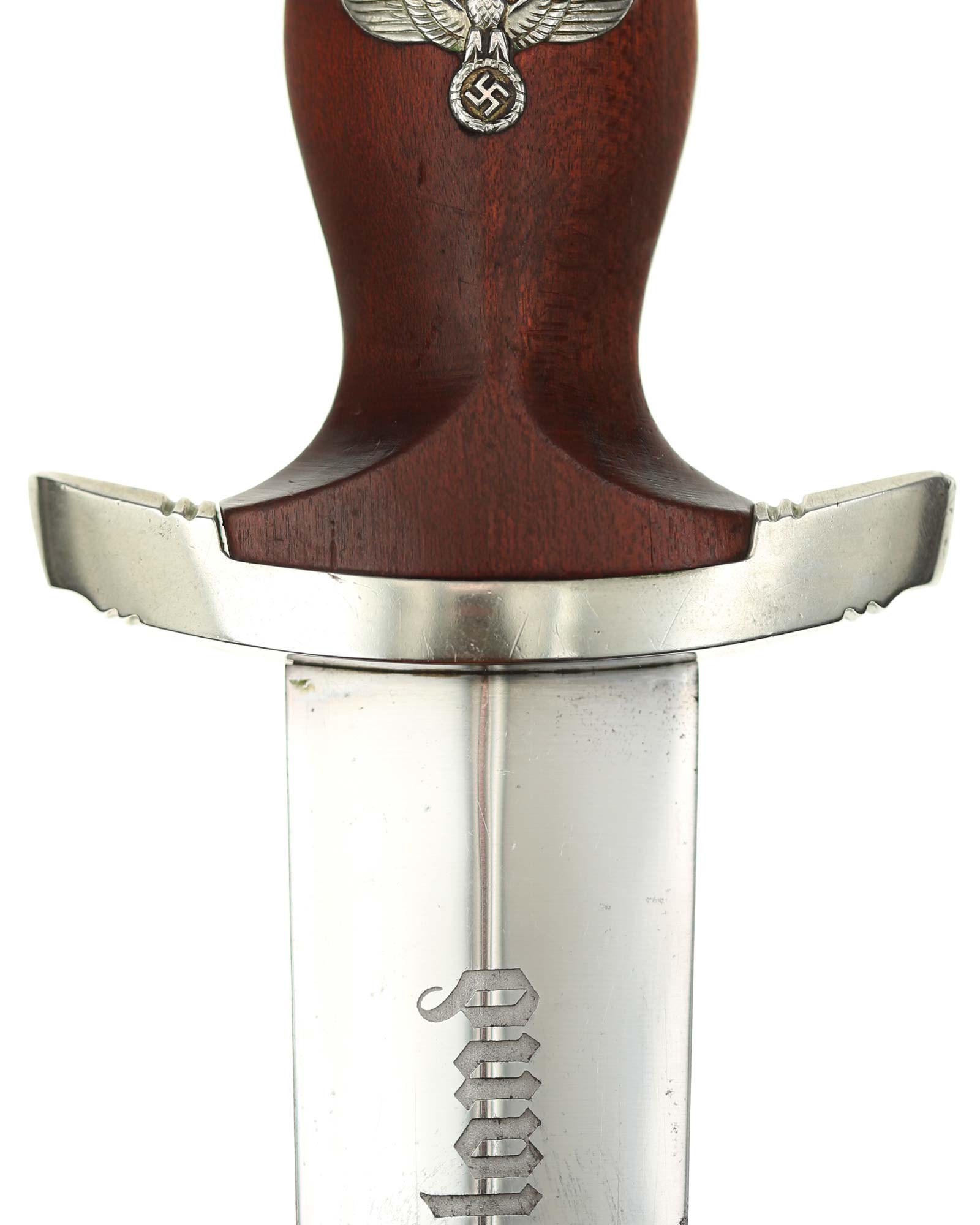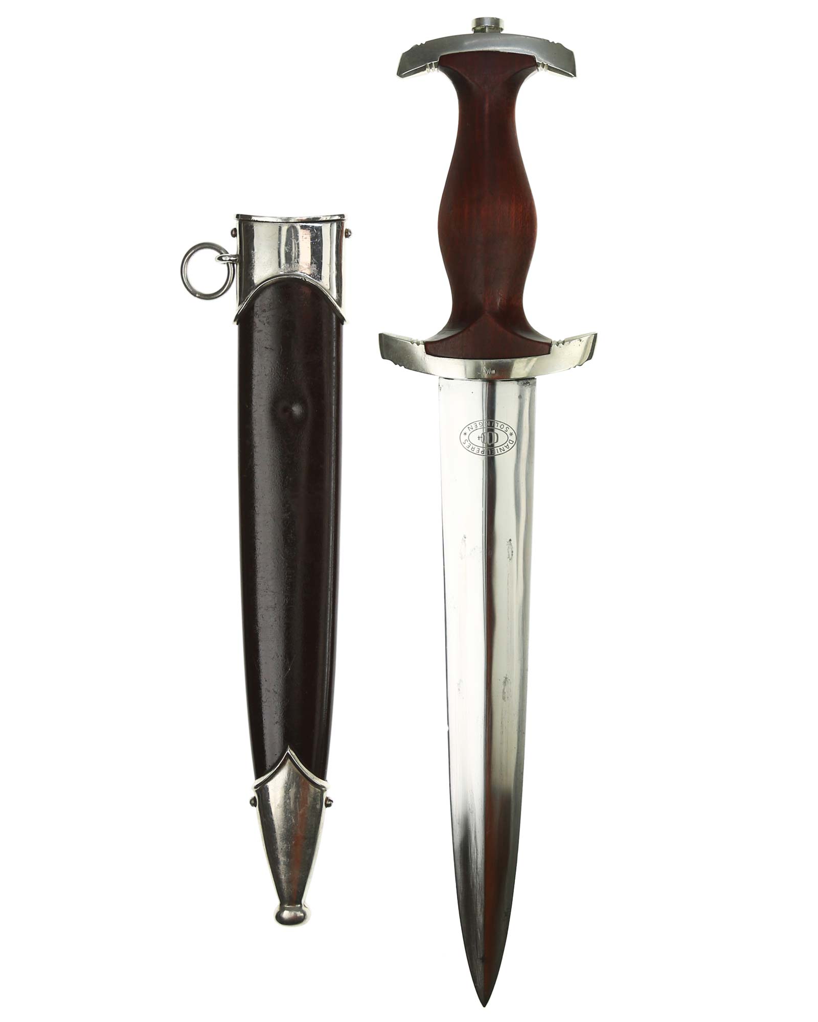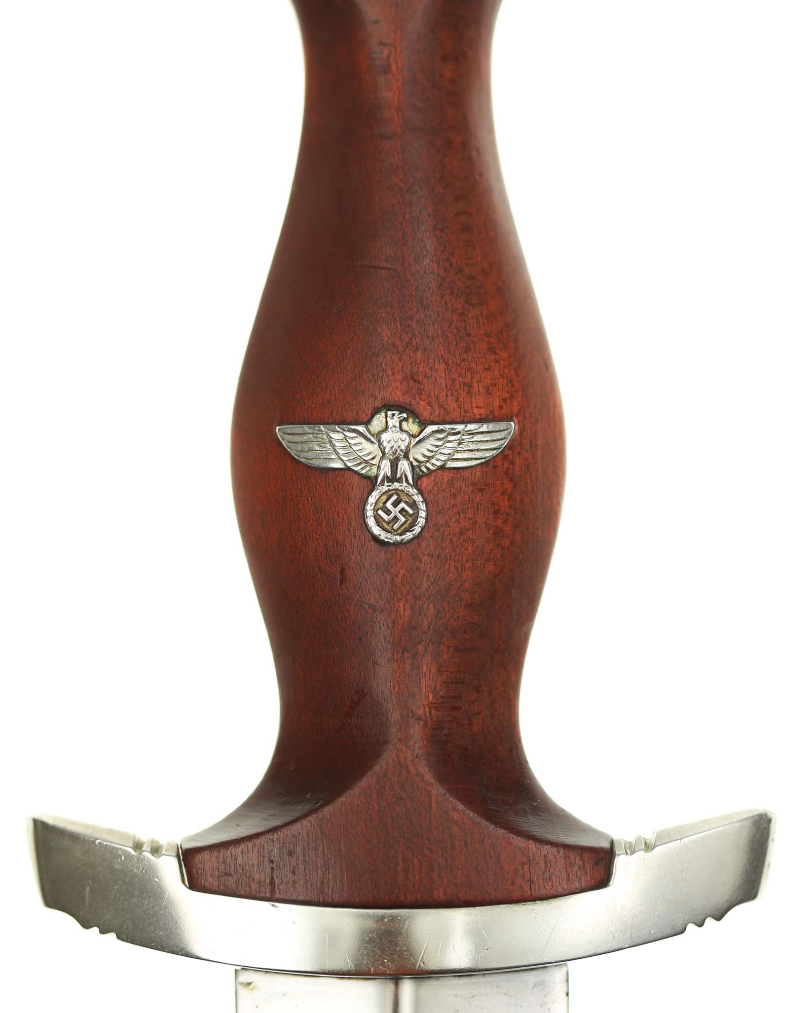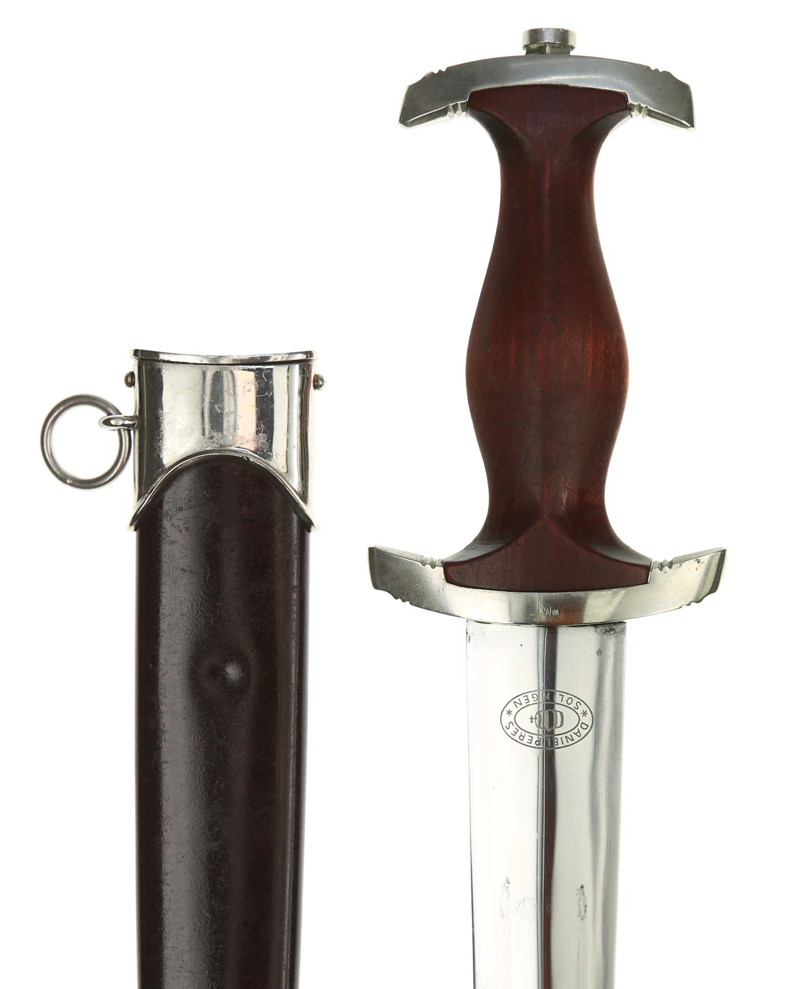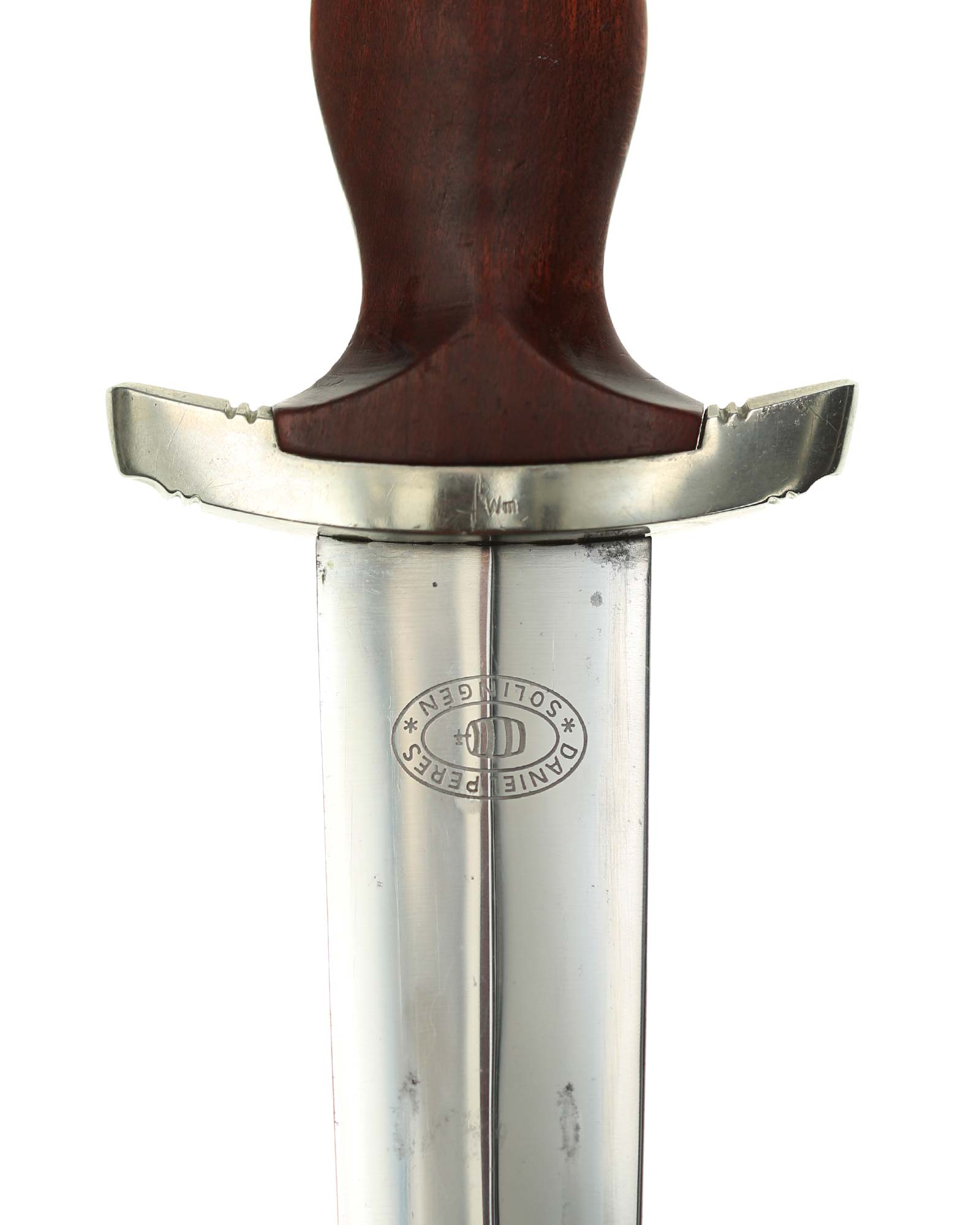 This SA [Sturmabteilung] Dagger in NEAR MINT condition. Model 1933. Early Nickel fittings, lower guard with «Wm» stamp. The Dagger has the very rare maker mark [4 of 5] on the blade: Daniel Peres Solingen. The total length is 37.5 cm.