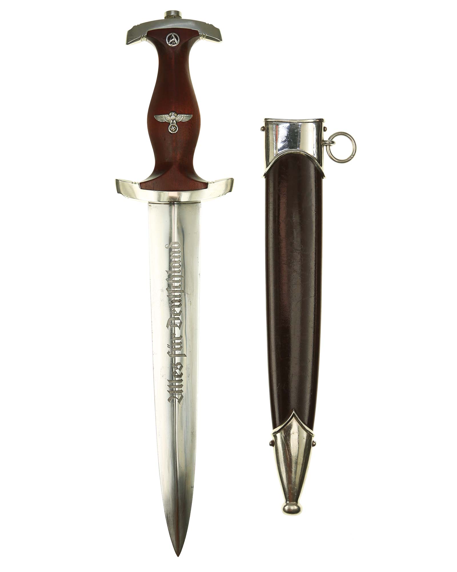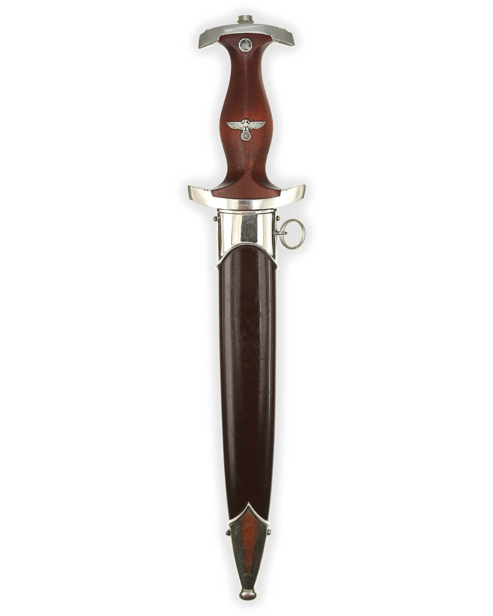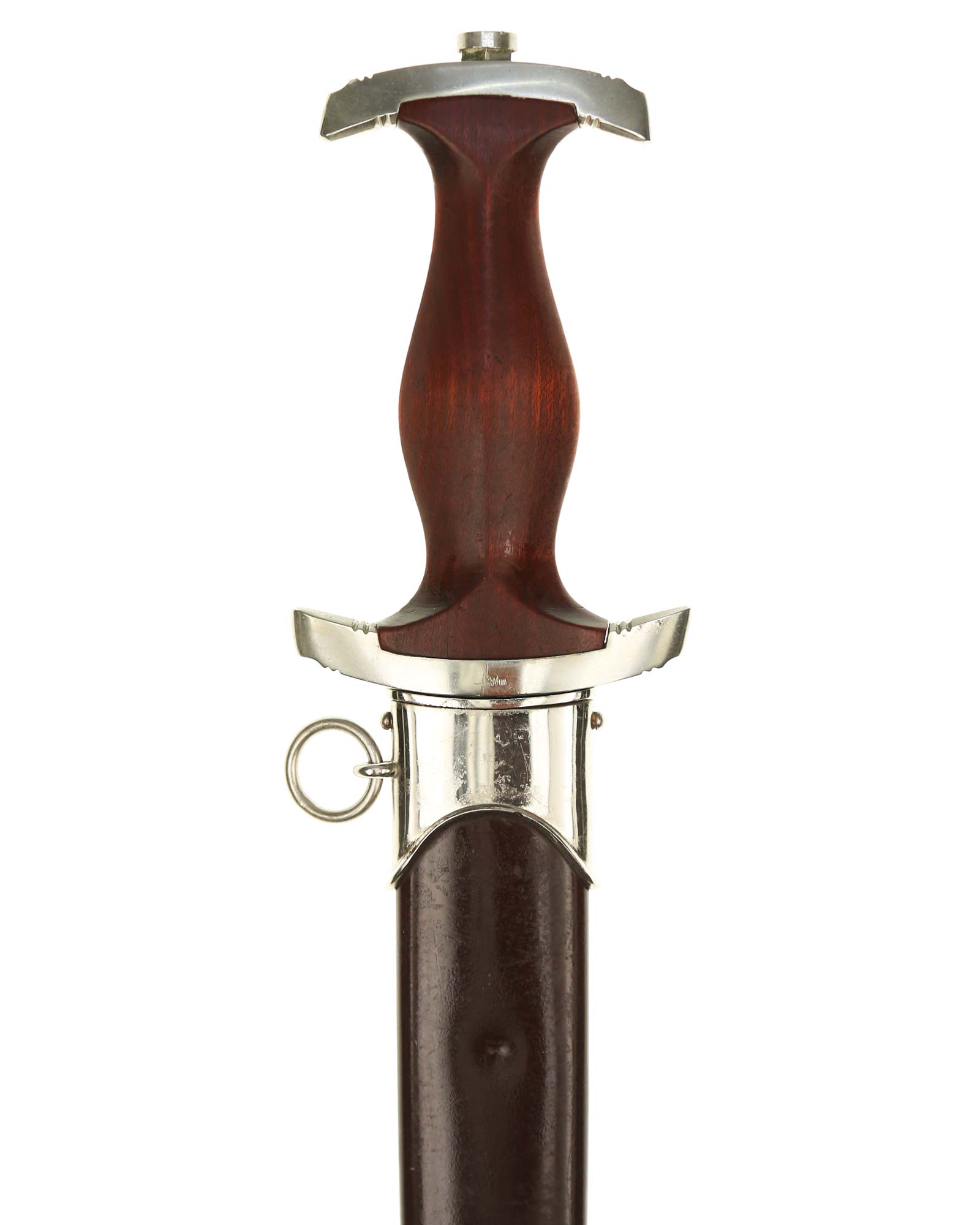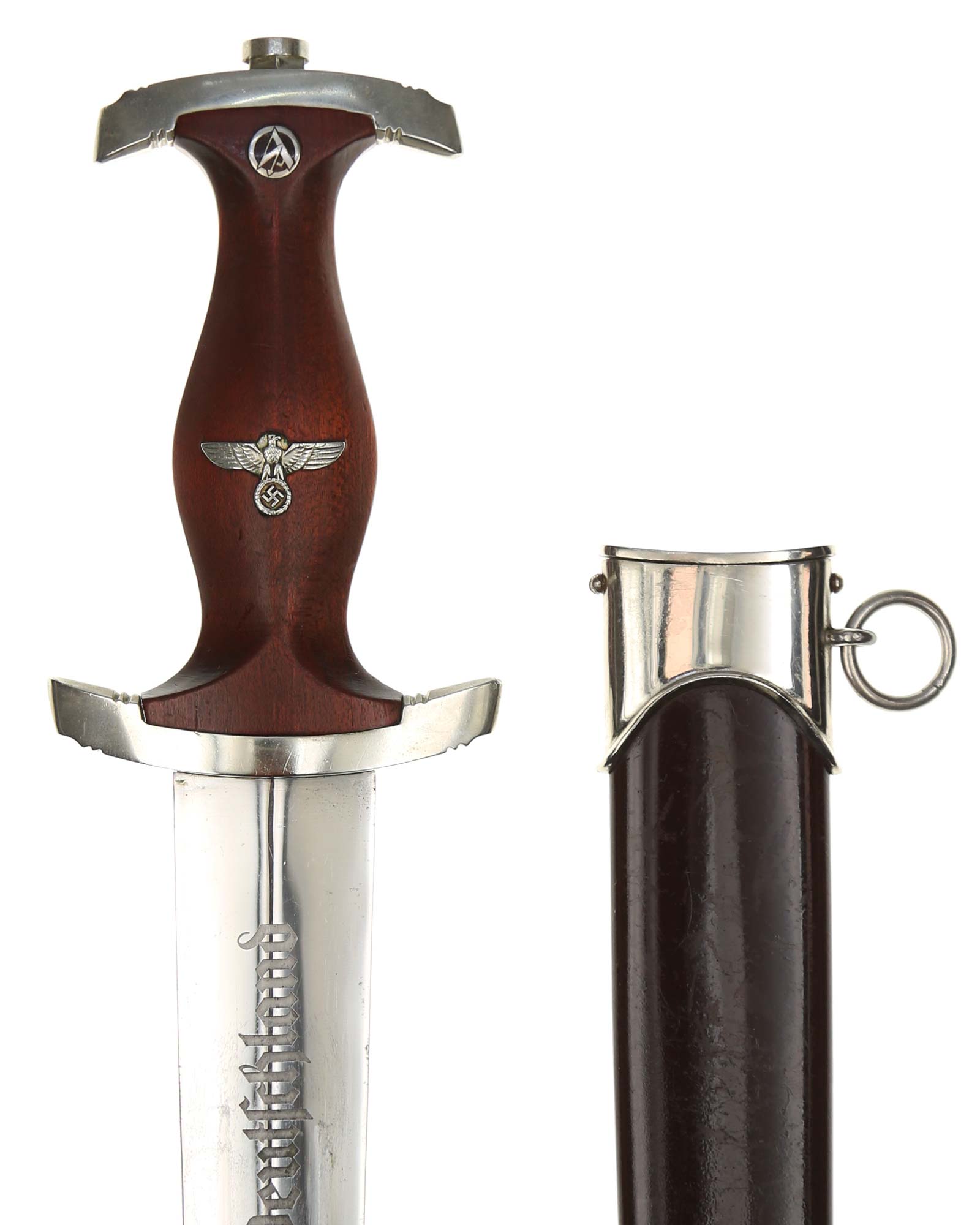 This SA [Sturmabteilung] Dagger in NEAR MINT condition. Model 1933. Early Nickel fittings, lower guard with «Wm» stamp. The Dagger has the very rare maker mark [4 of 5] on the blade: Daniel Peres Solingen. The total length is 37.5 cm.