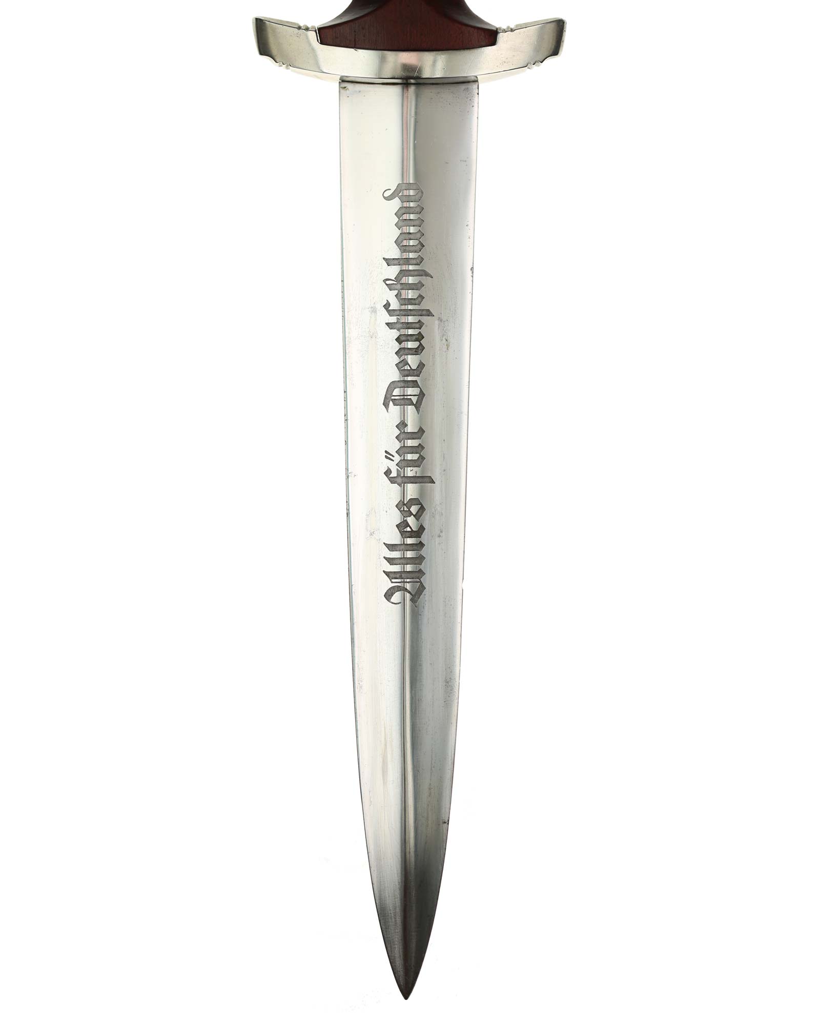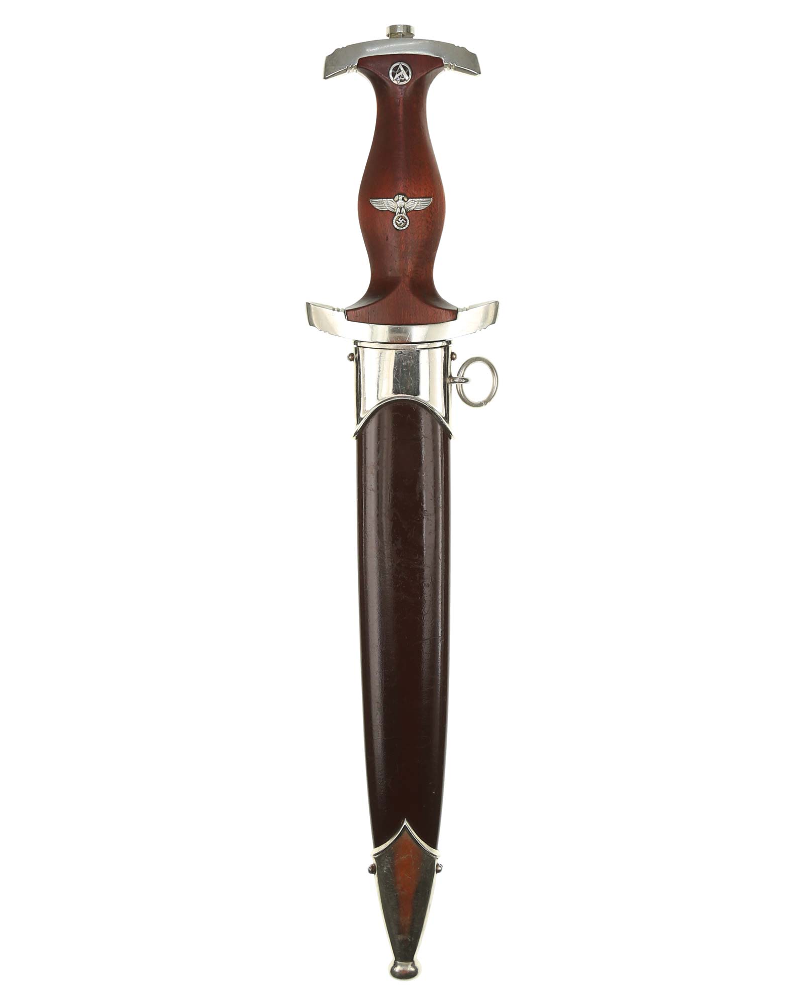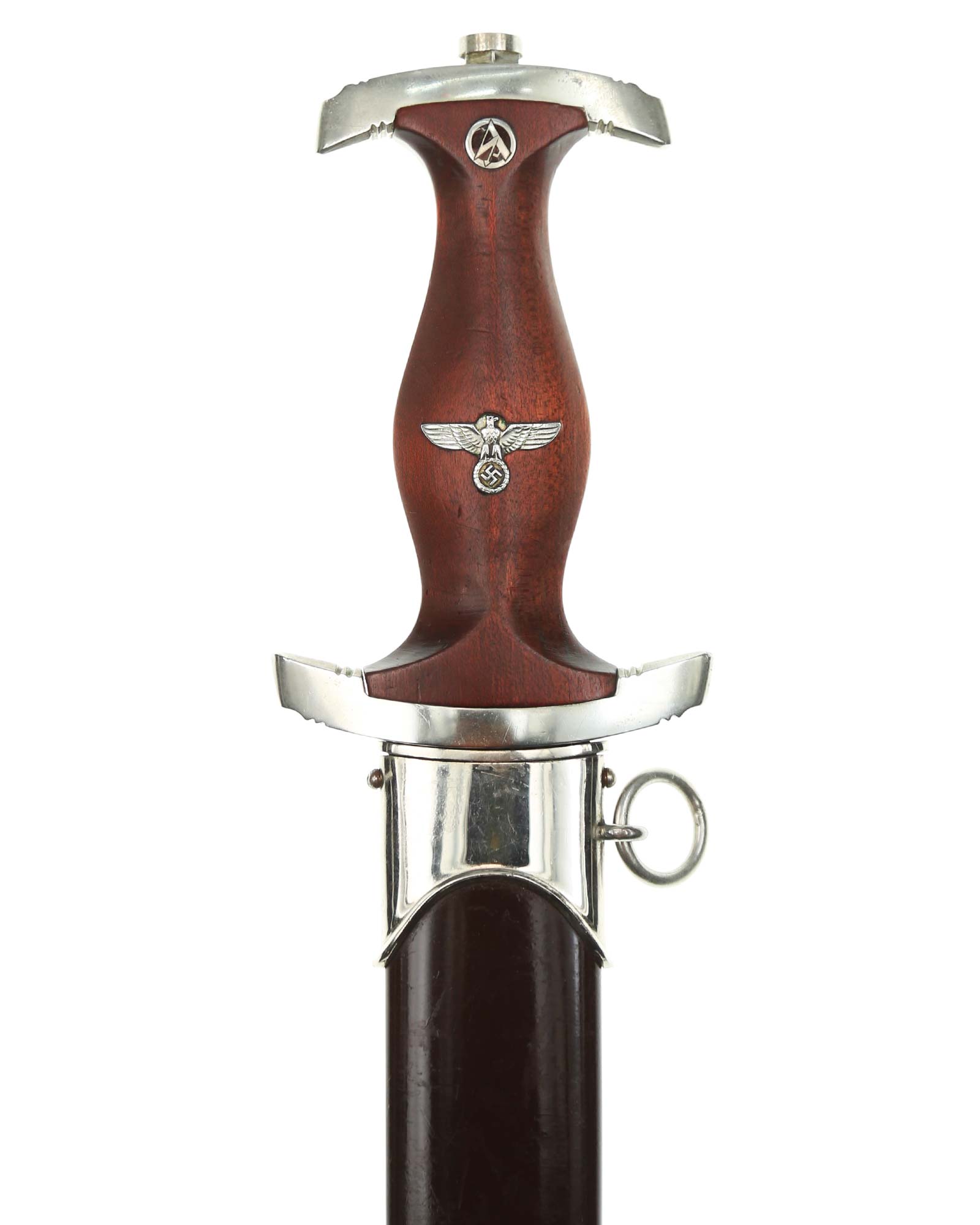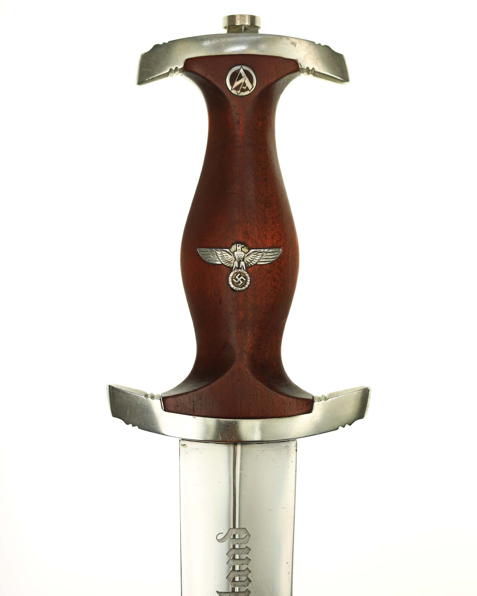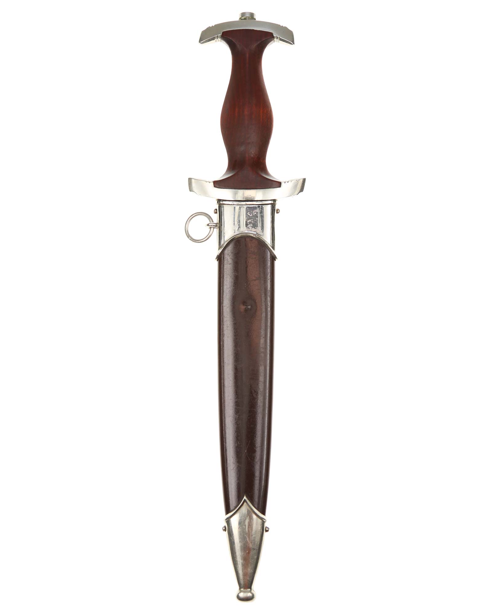 This SA [Sturmabteilung] Dagger in NEAR MINT condition. Model 1933. Early Nickel fittings, lower guard with «Wm» stamp. The Dagger has the very rare maker mark [4 of 5] on the blade: Daniel Peres Solingen. The total length is 37.5 cm.