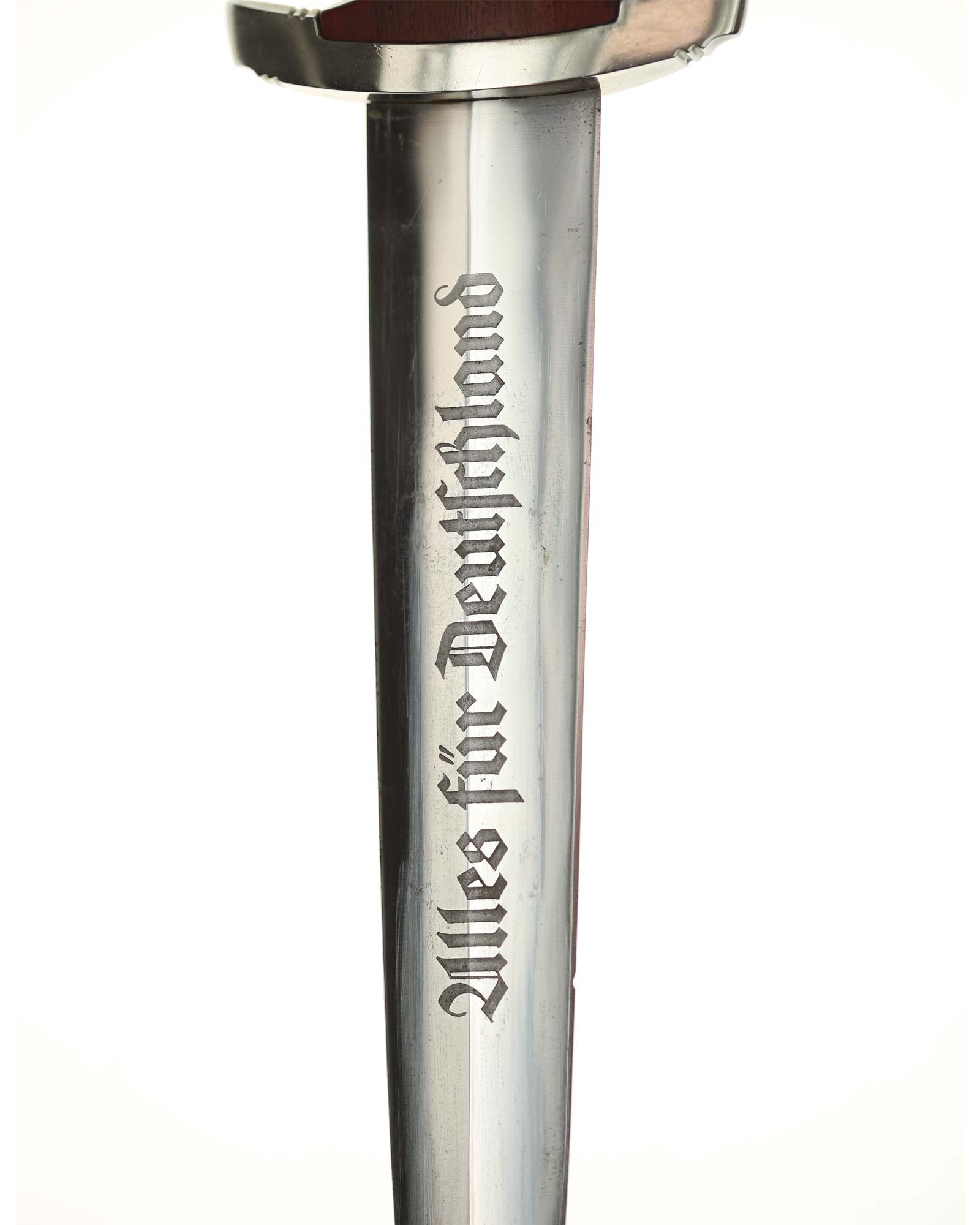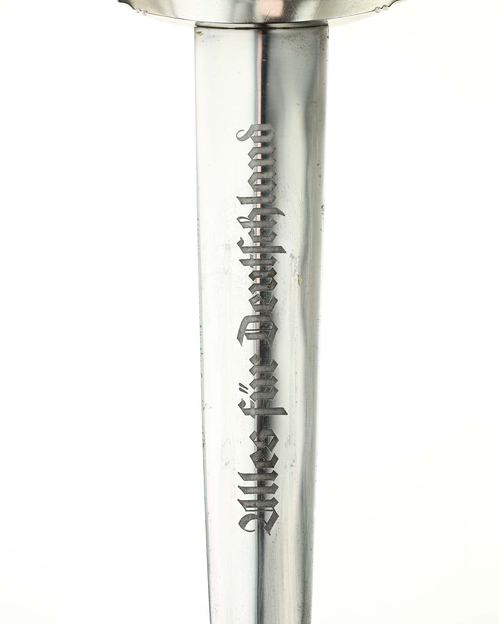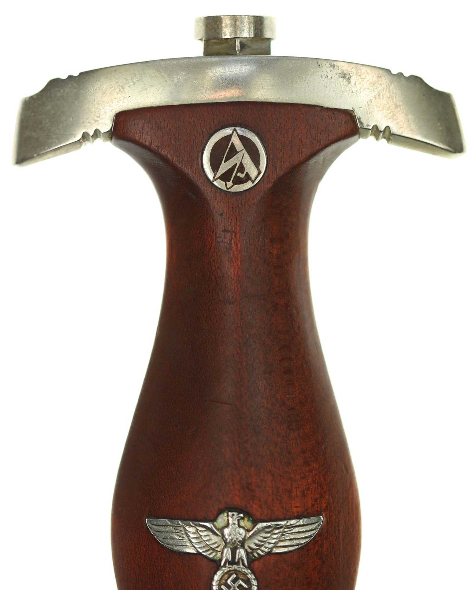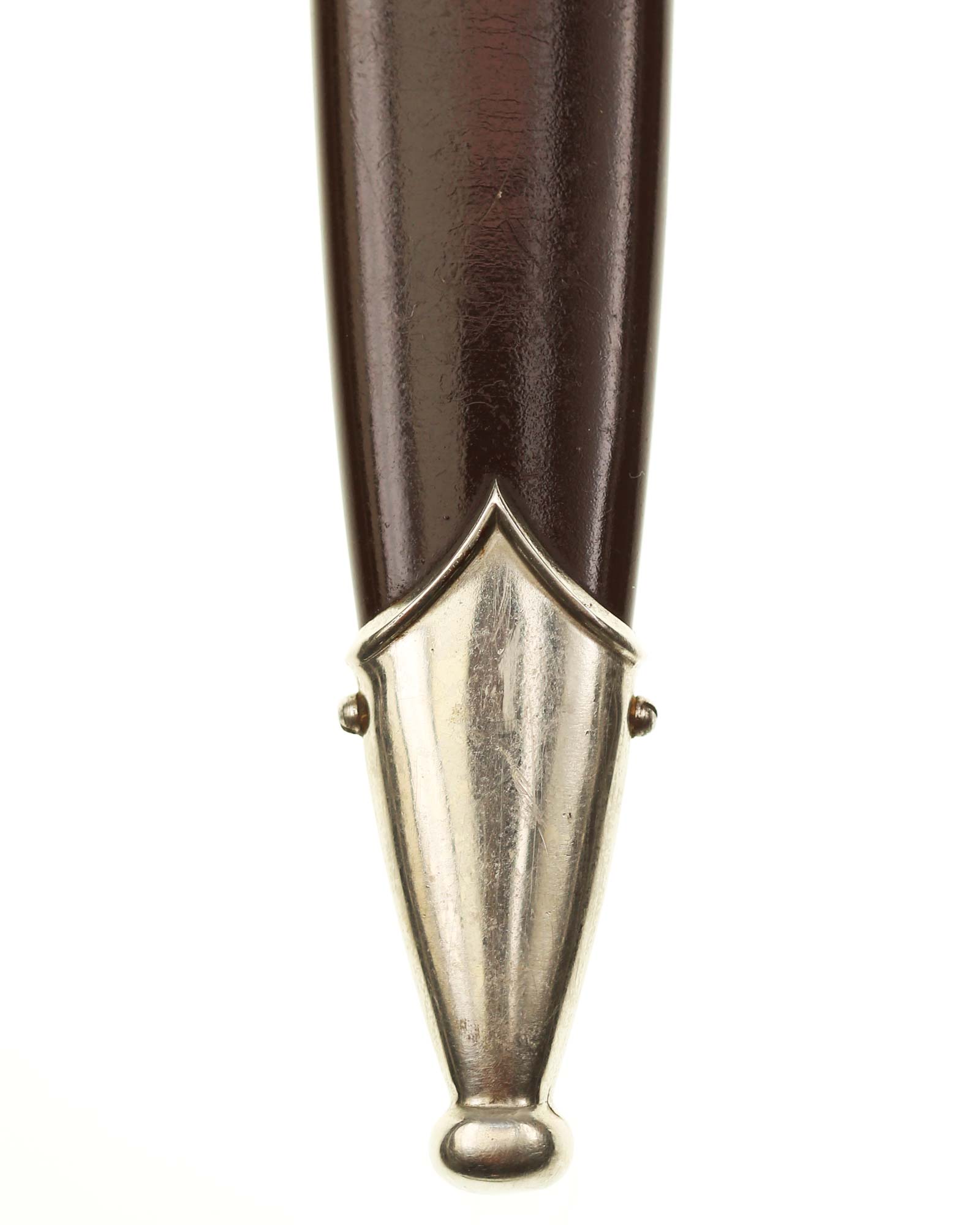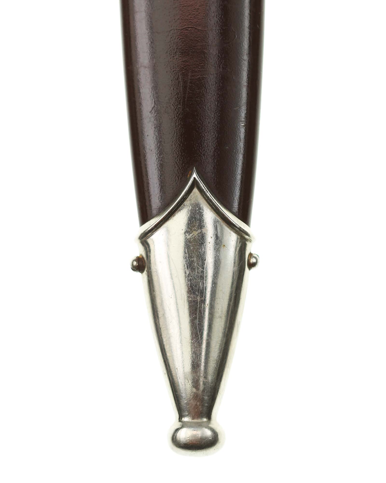 This SA [Sturmabteilung] Dagger in NEAR MINT condition. Model 1933. Early Nickel fittings, lower guard with «Wm» stamp. The Dagger has the very rare maker mark [4 of 5] on the blade: Daniel Peres Solingen. The total length is 37.5 cm.