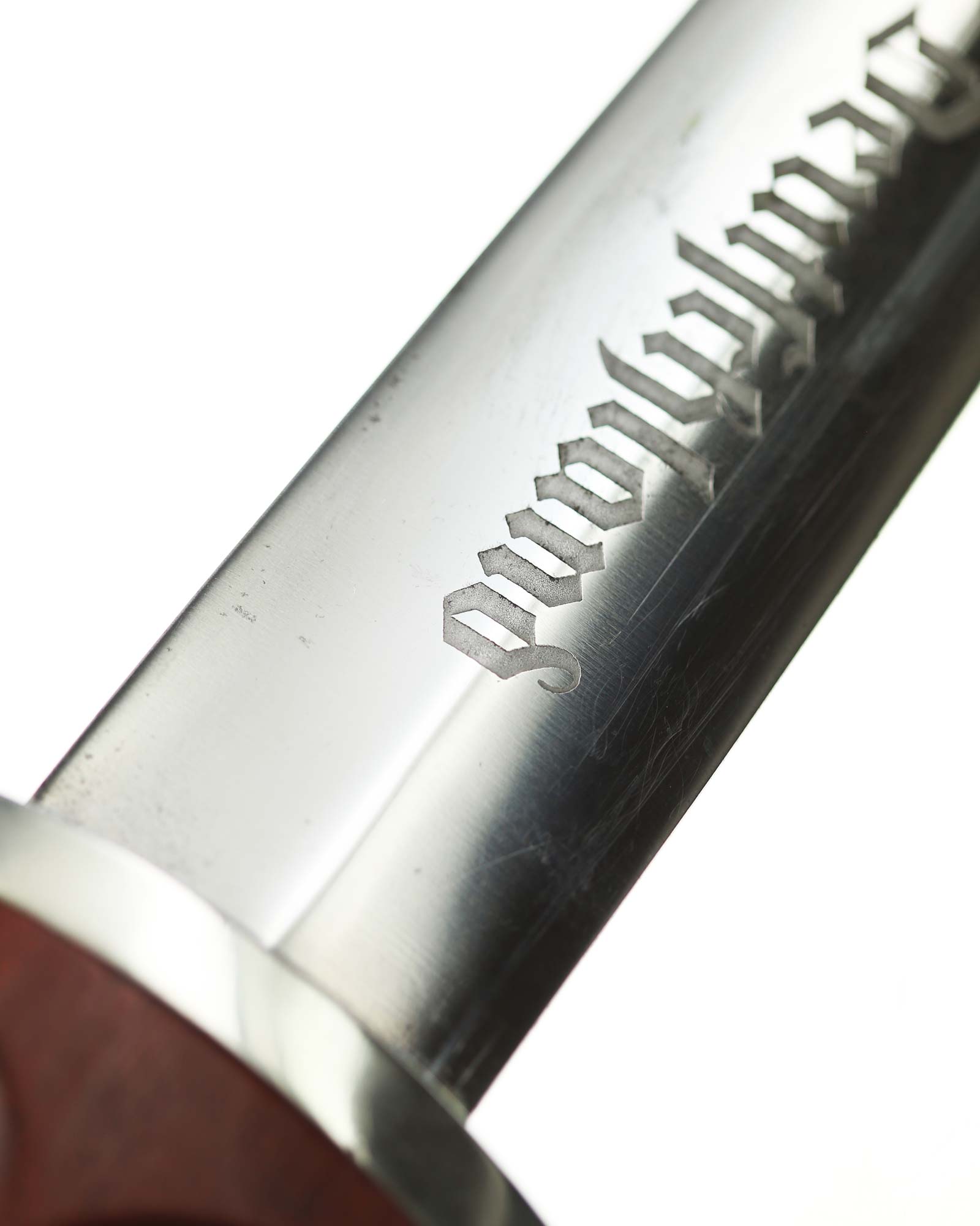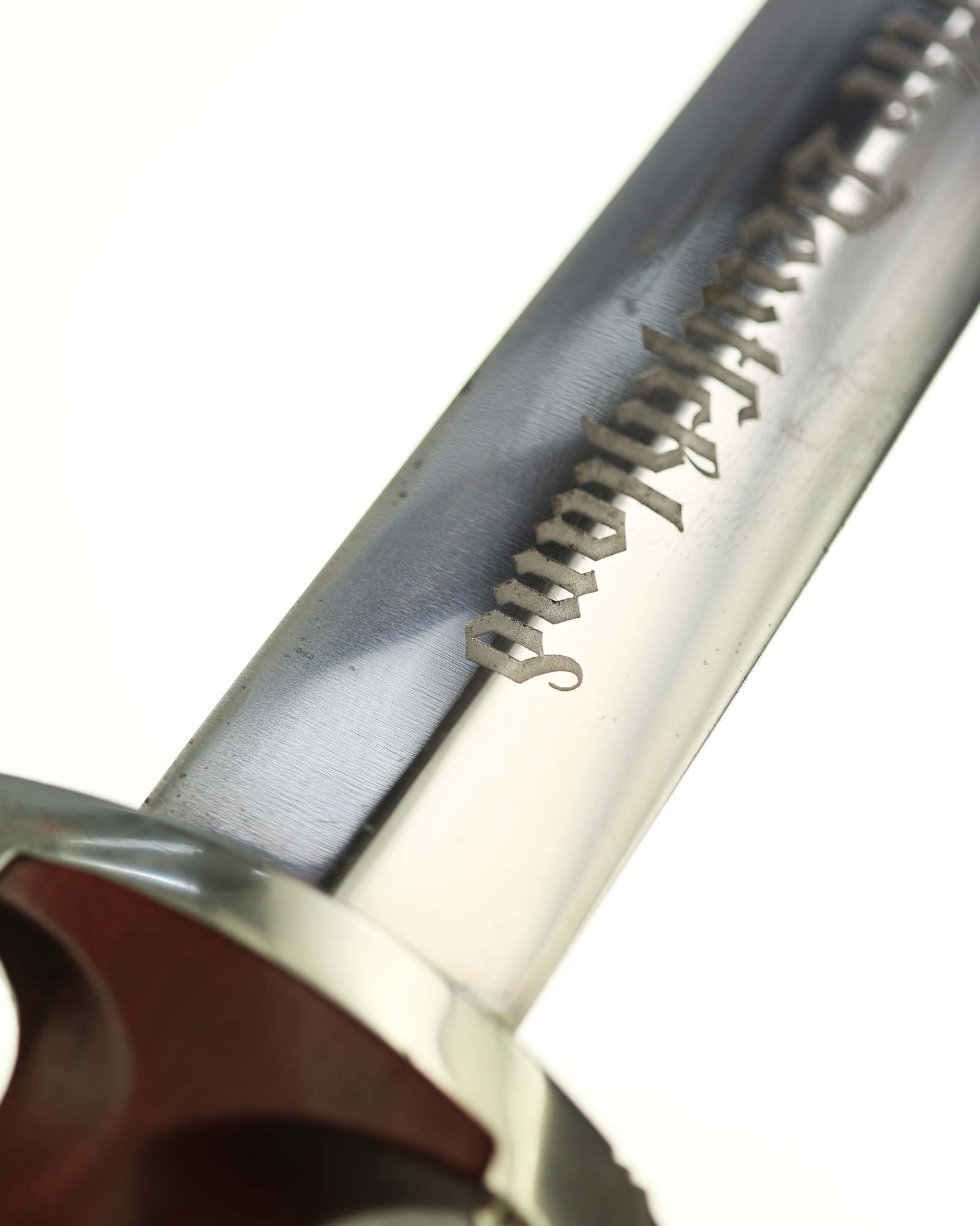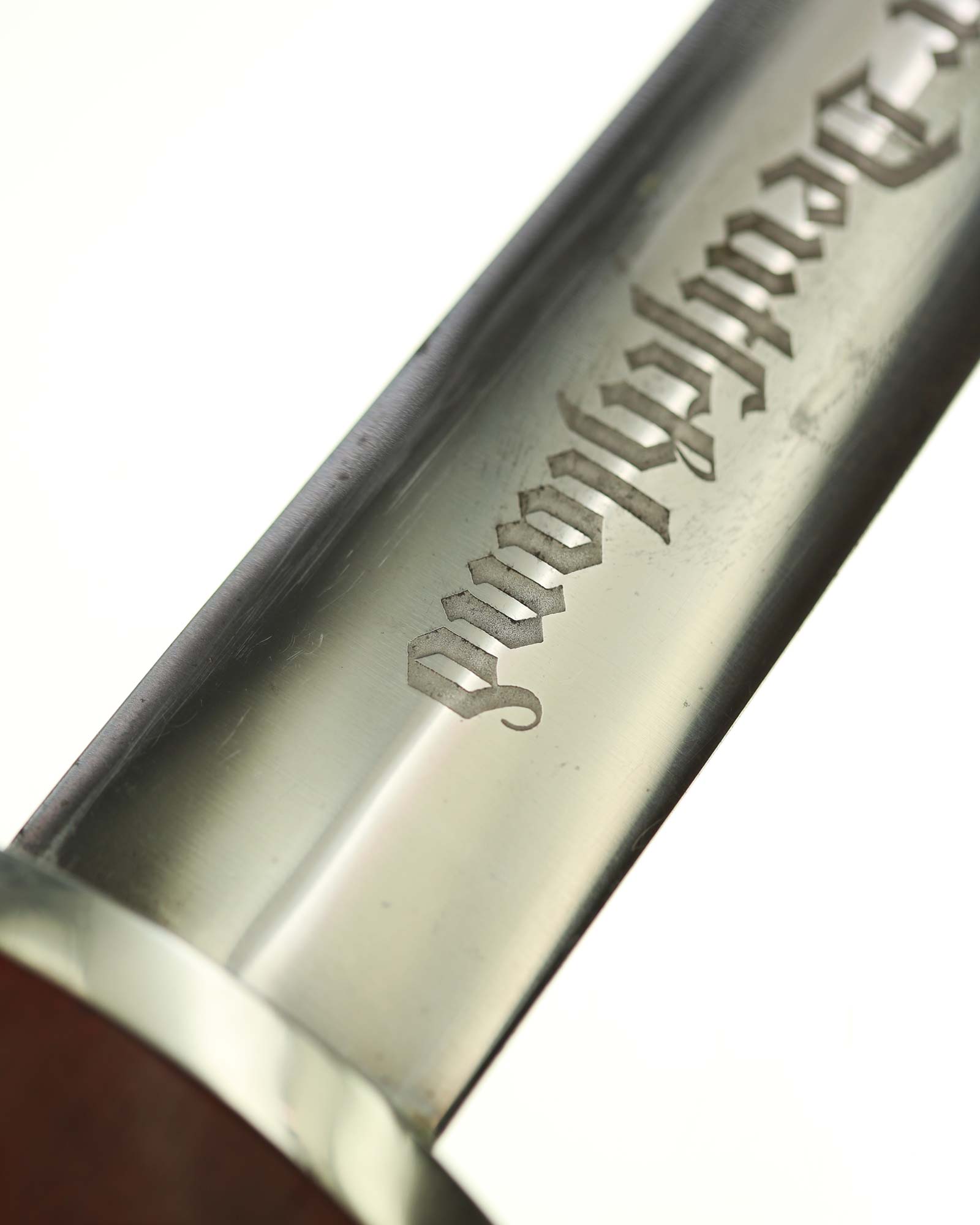 Grip: The High Ridge construction grip is in perfect condition, fitting the guards like a glove. The SA runes button is nicely placed and retains perfect enamel. The nickel grip eagle is the style with a slightly upturned beak. This bird retains full detailing throughout the head, breast and wing feathering, talons and wreathed mobile swastika. The nickel crossguards are in beautiful condition throughout, and the tang nut looks to have been out only once or twice. The lower reverse crossguard is Gruppe marked «Wm» Westmark.