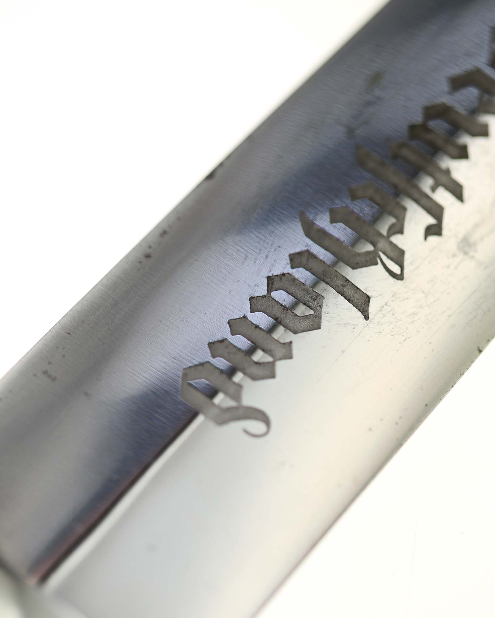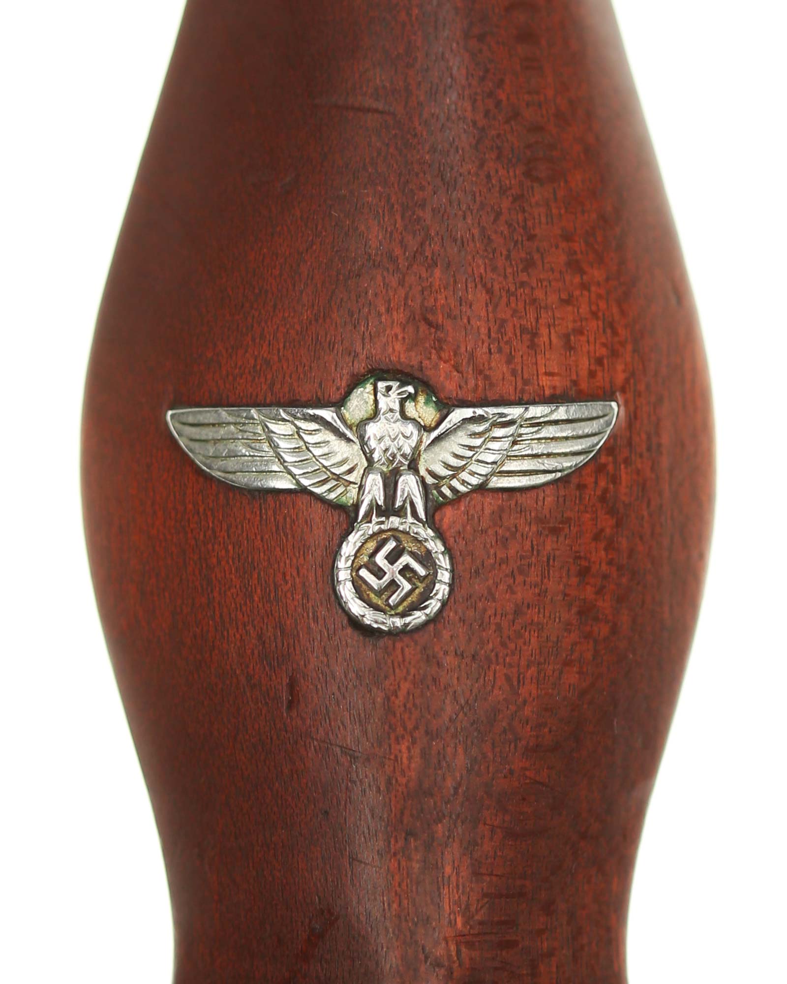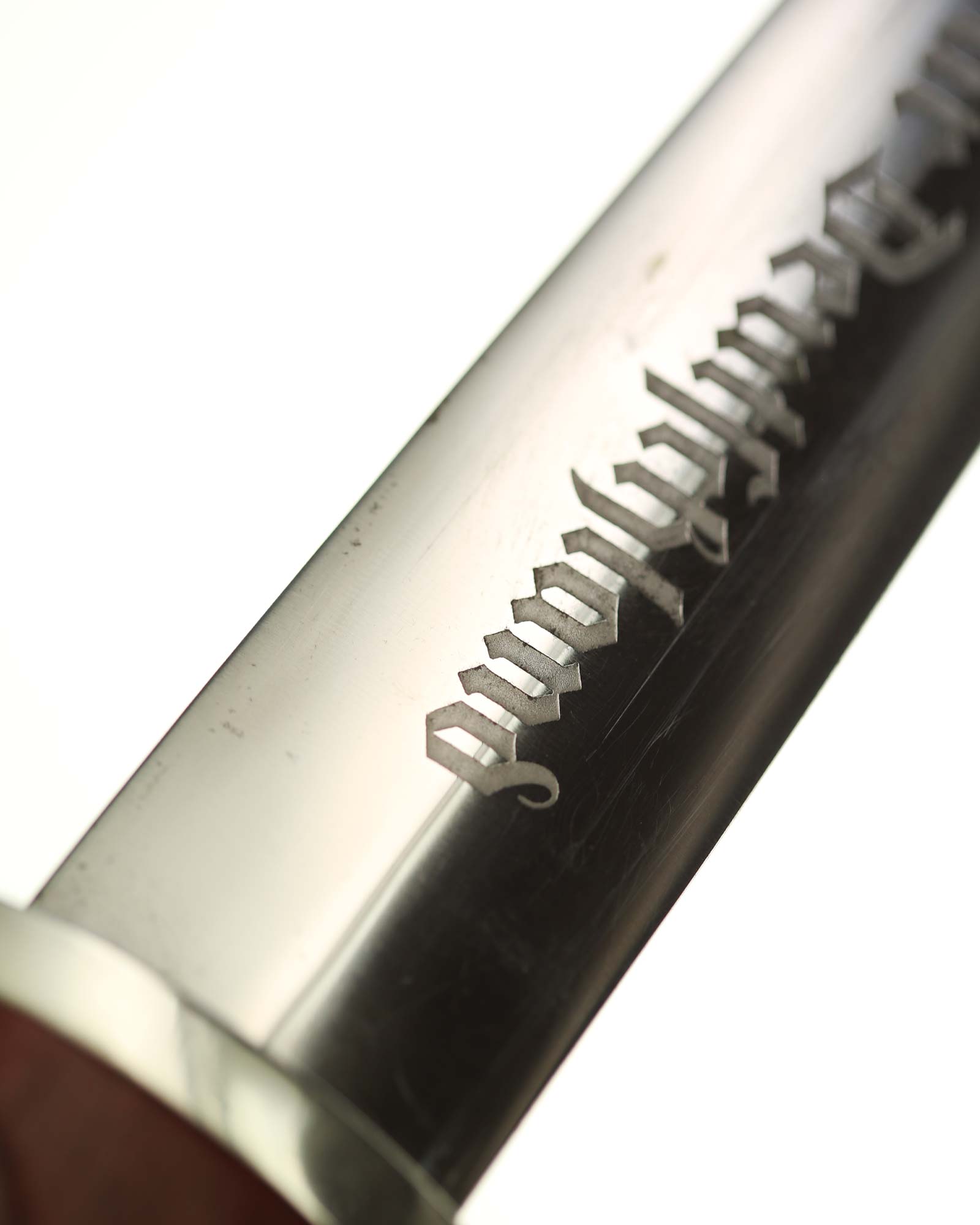 Grip: The High Ridge construction grip is in perfect condition, fitting the guards like a glove. The SA runes button is nicely placed and retains perfect enamel. The nickel grip eagle is the style with a slightly upturned beak. This bird retains full detailing throughout the head, breast and wing feathering, talons and wreathed mobile swastika. The nickel crossguards are in beautiful condition throughout, and the tang nut looks to have been out only once or twice. The lower reverse crossguard is Gruppe marked «Wm» Westmark.