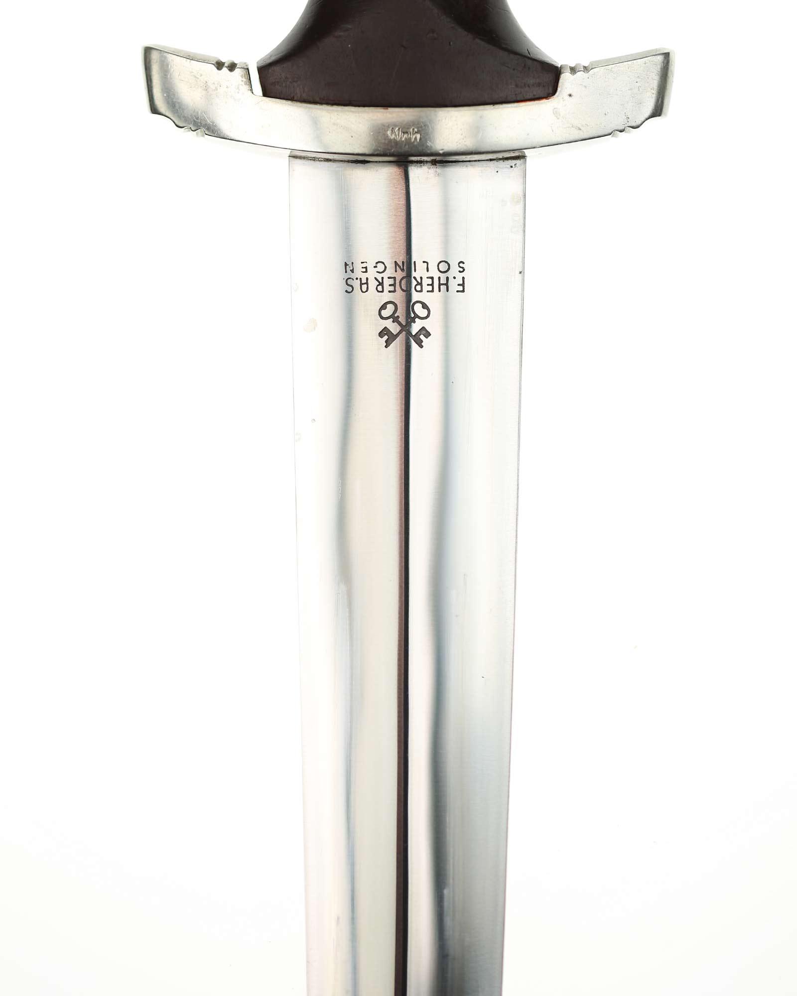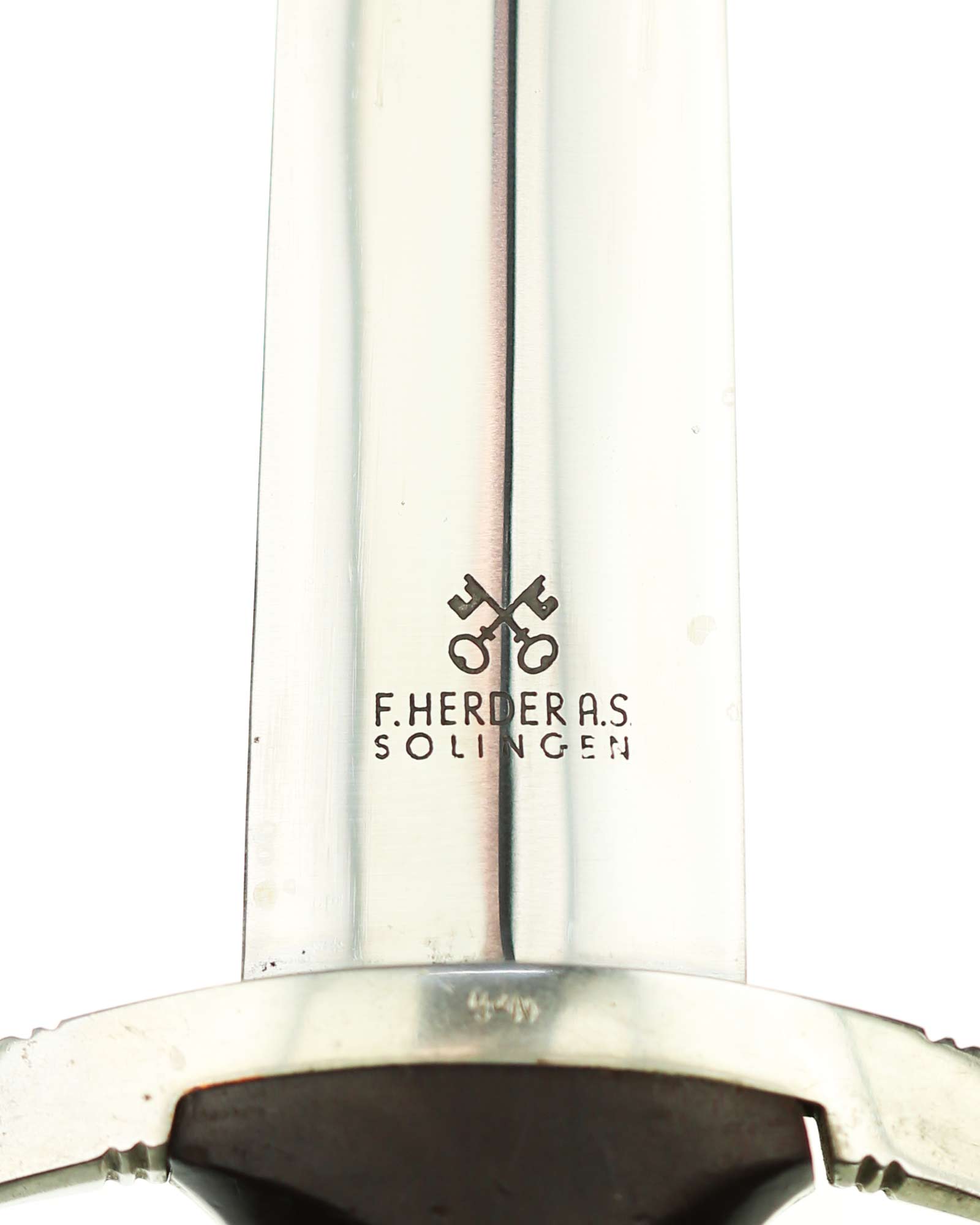 Blade: The blade of this example is still grades at about mint. The SA motto Alles für Deutschland «Everything for Germany» is deep. The company logo is on the reverse ricasso: F. Herder A. & S. Solingen. The blade shoulders meet the crossguard contour.