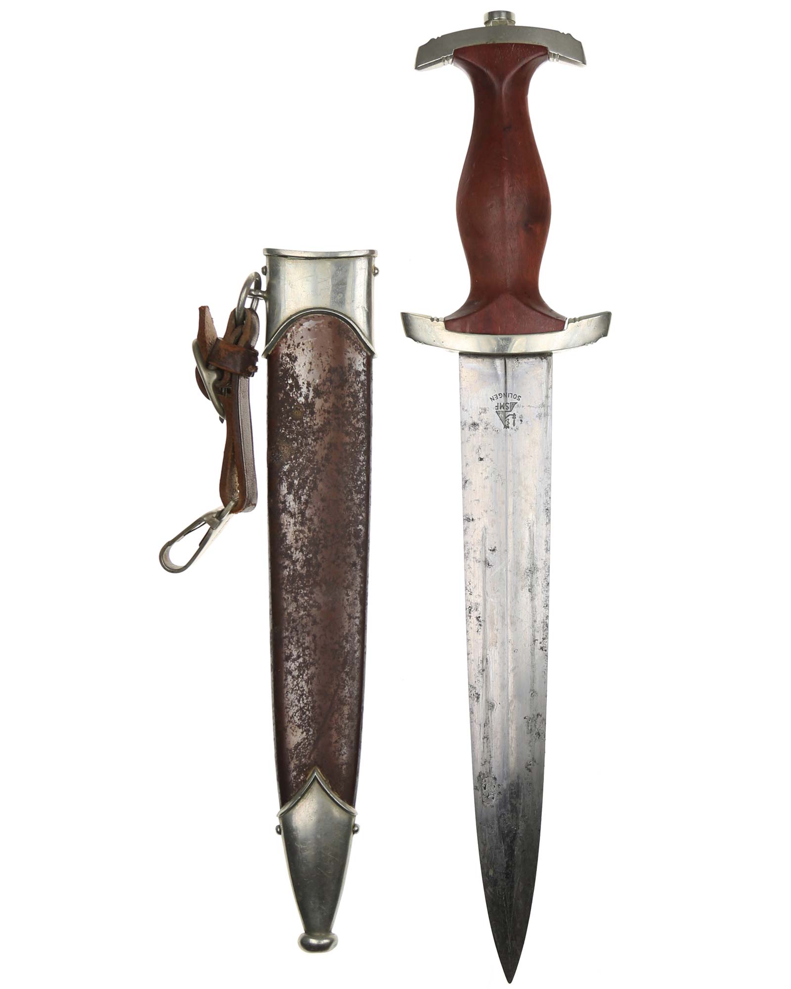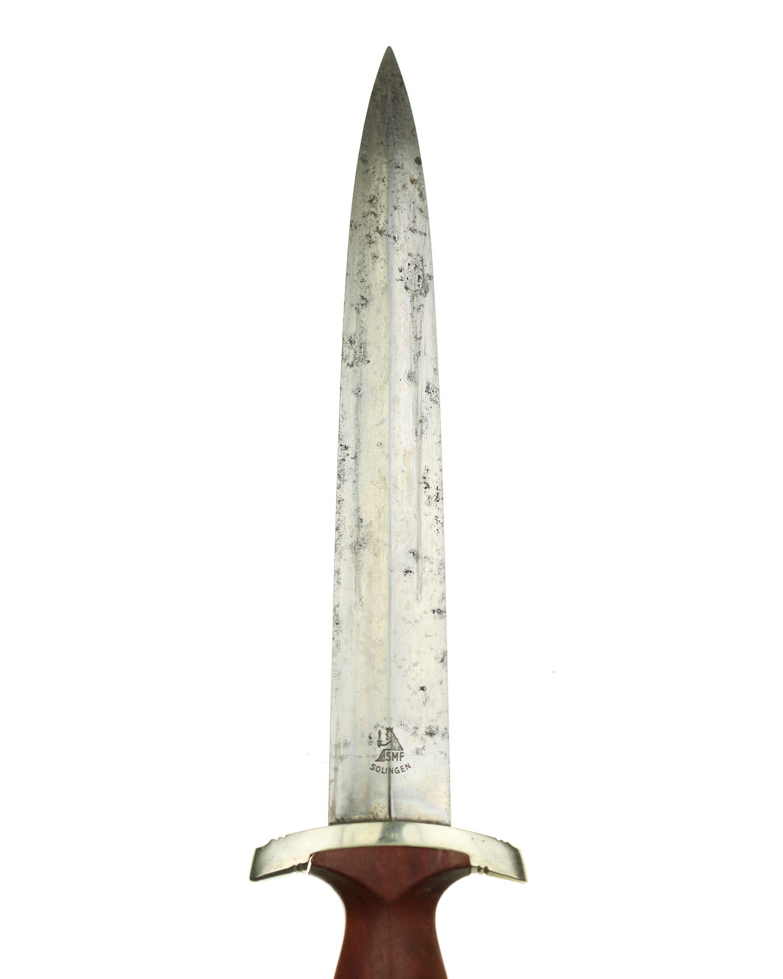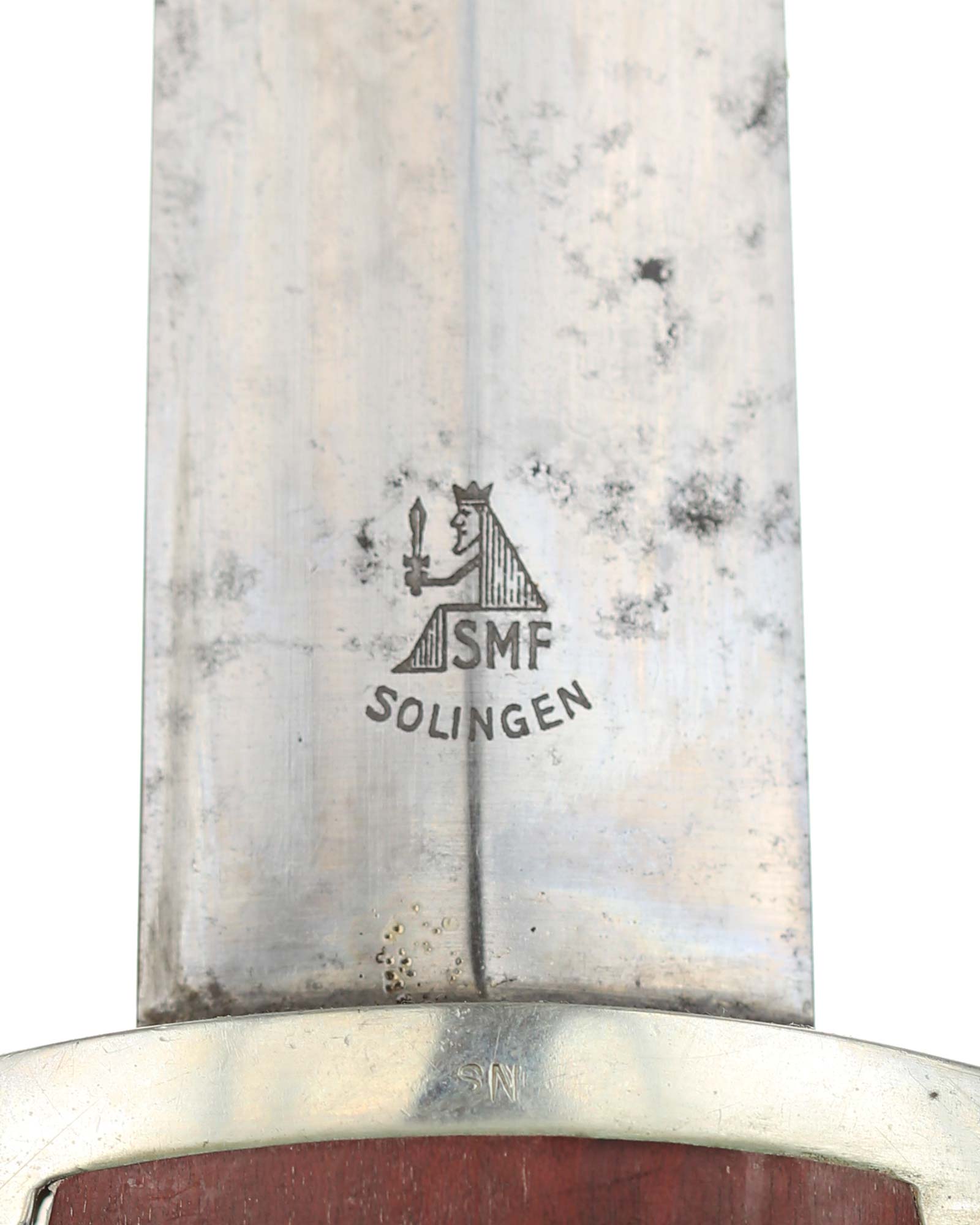 This SA [Sturmabteilung] Dagger in EXC+ condition. Model 1933. The total length is 37.2 cm. Early Nickel fittings, lower guard with "Ns" stamp. The Dagger has the maker mark on the blade: SMF Solingen.
