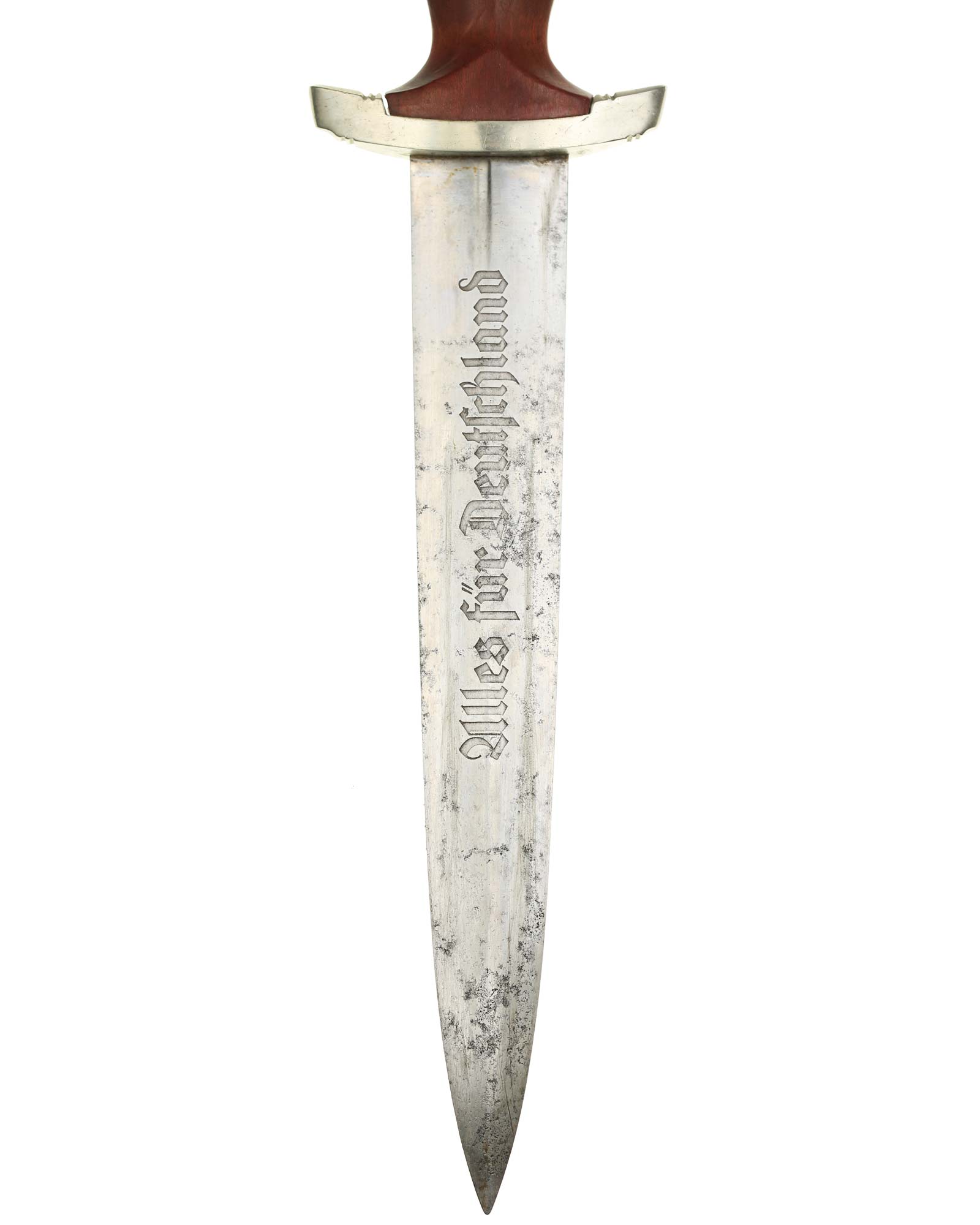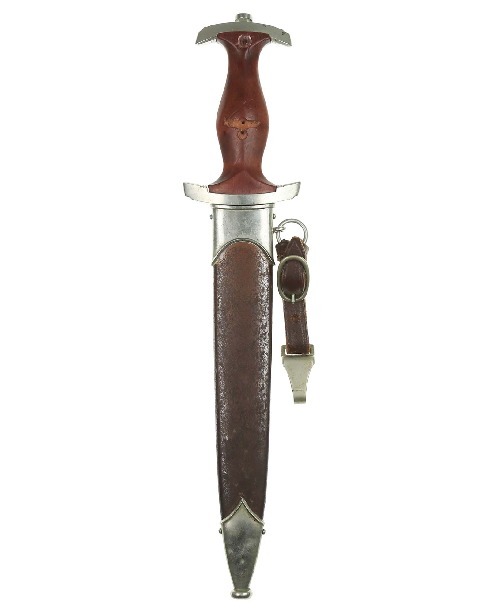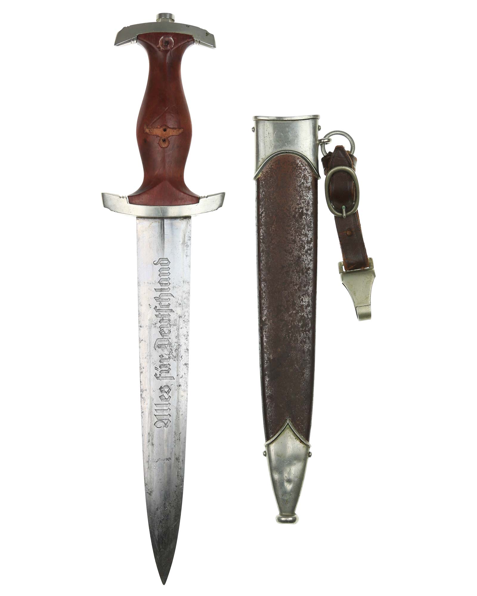 This SA [Sturmabteilung] Dagger in EXC+ condition. Model 1933. The total length is 37.2 cm. Early Nickel fittings, lower guard with "Ns" stamp. The Dagger has the maker mark on the blade: SMF Solingen.