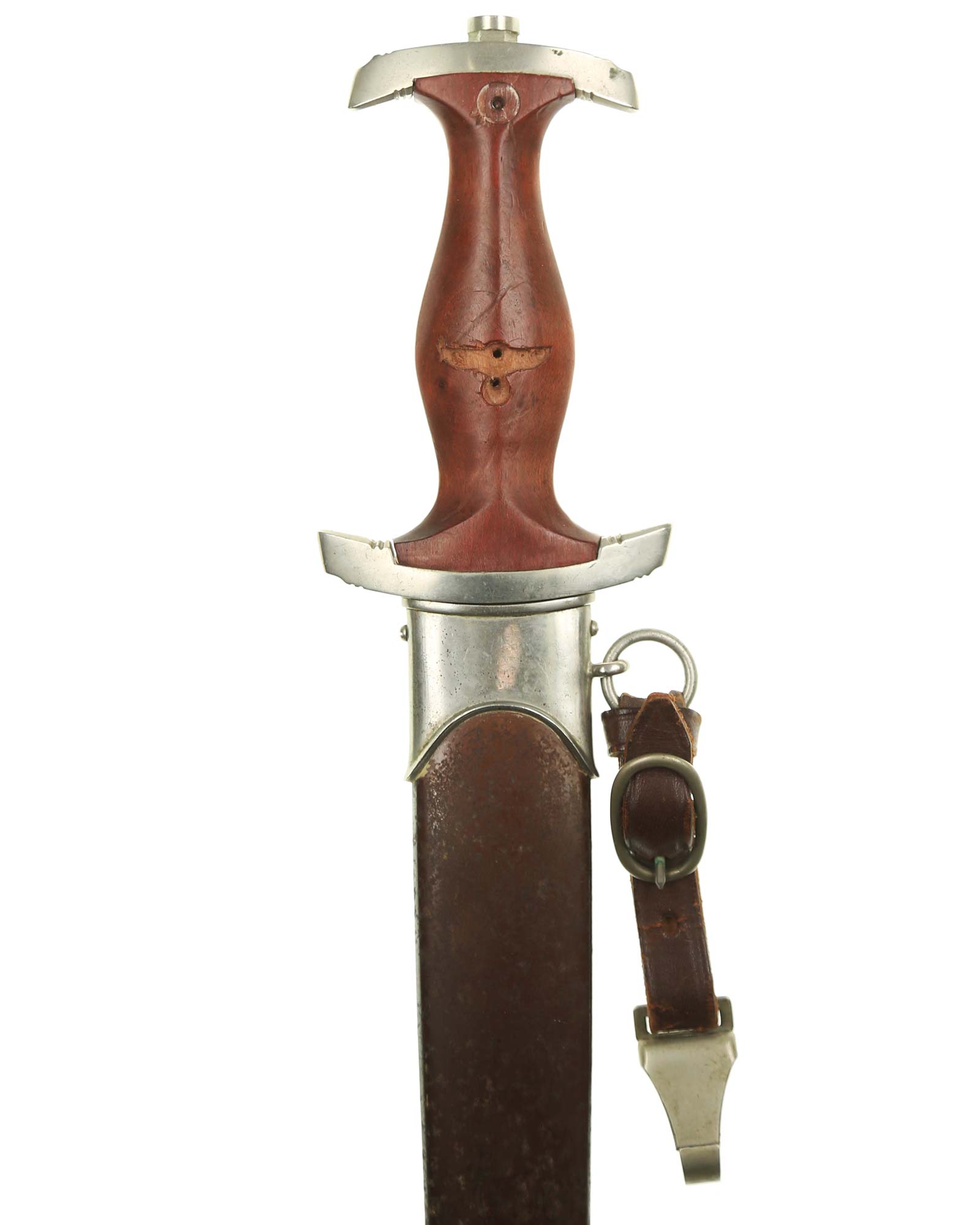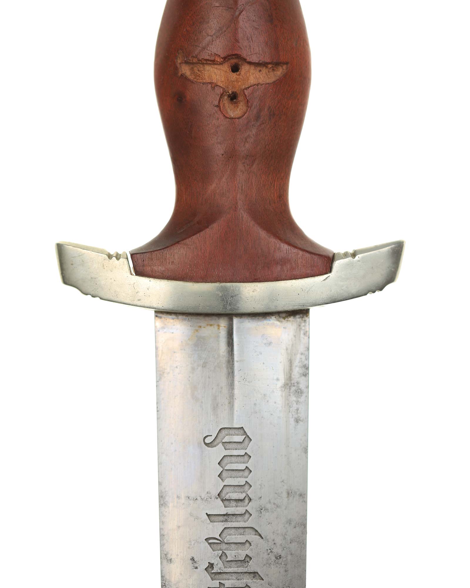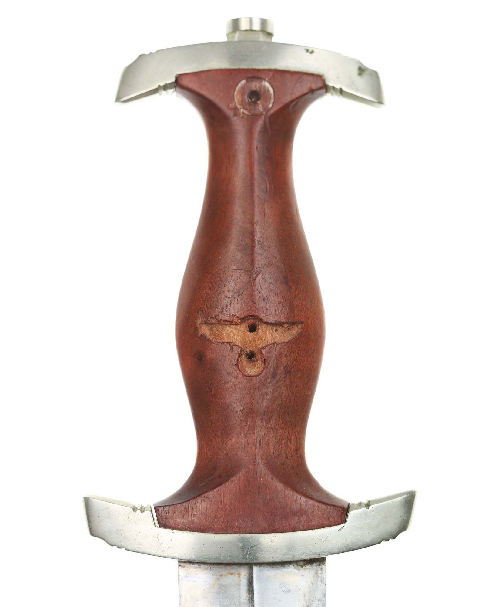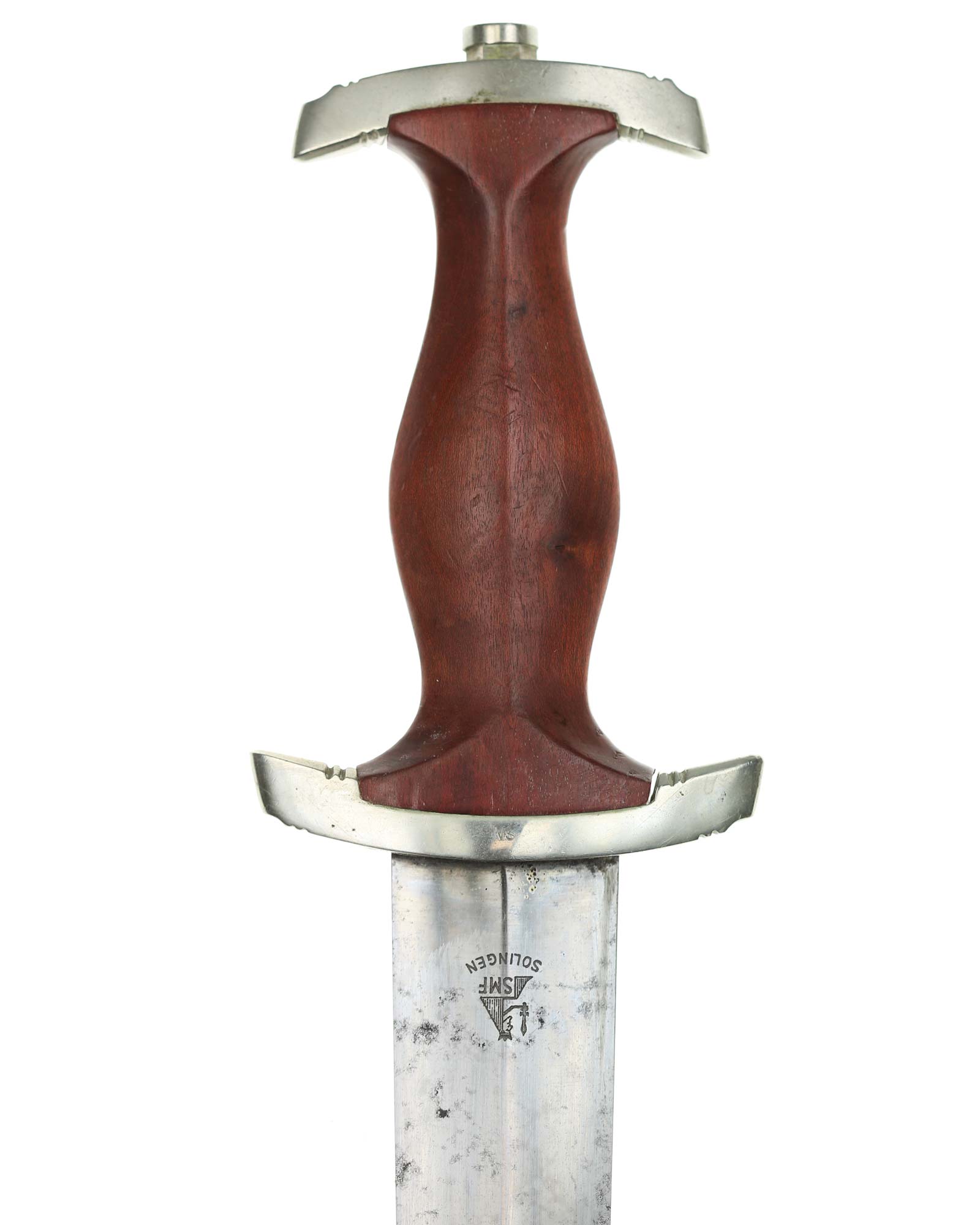Grip: Nickel silver hilt fittings show light surface age patina with lower reverse crossguard group marked, «Ns» Lower Saxony. Light brown, wooden grip shows some wear and features early production quality grip-to-crossguard fit. Grip is without silver grip eagle and SA emblem.