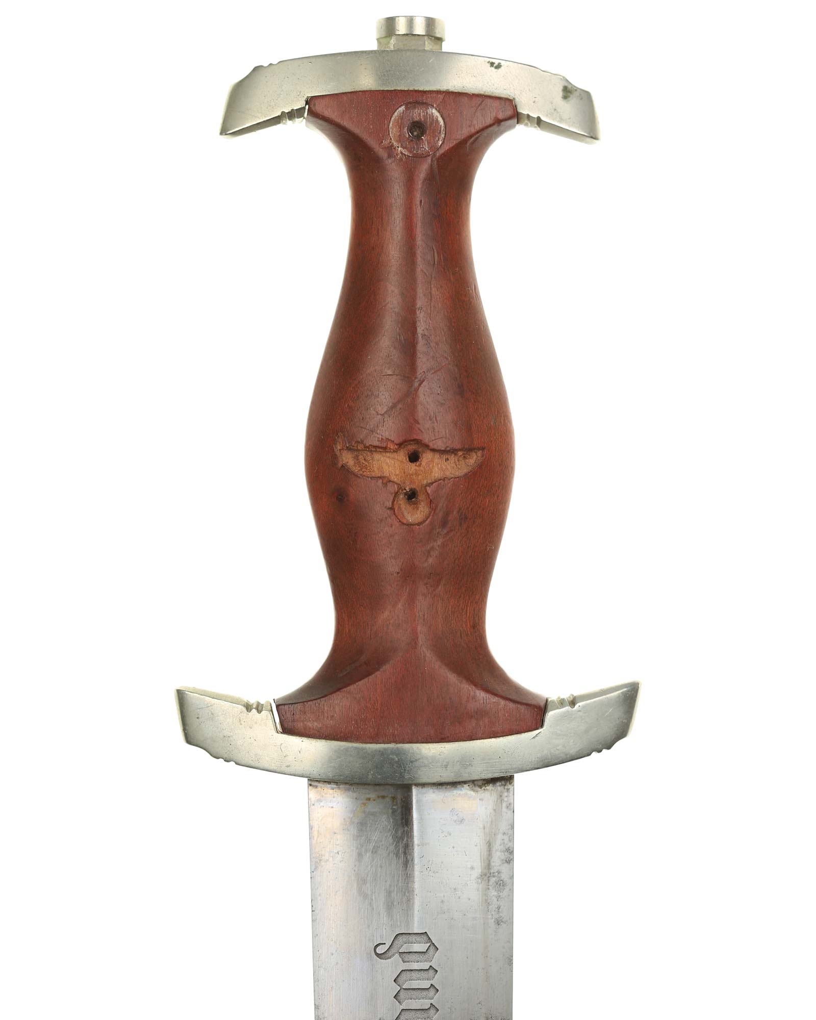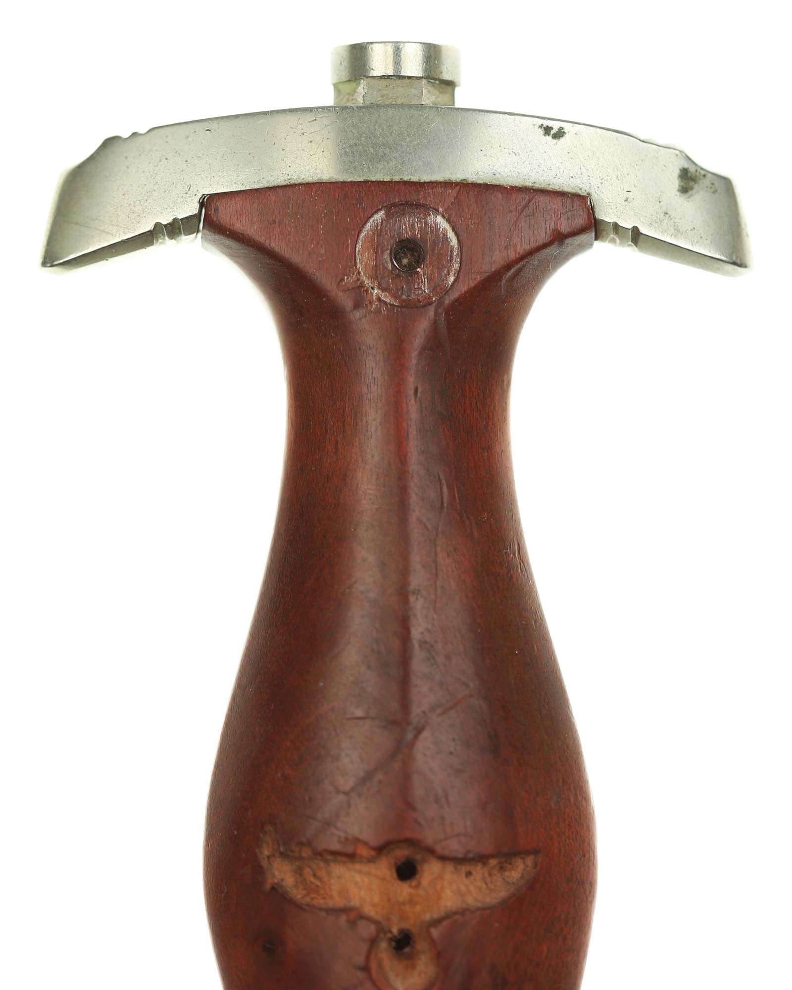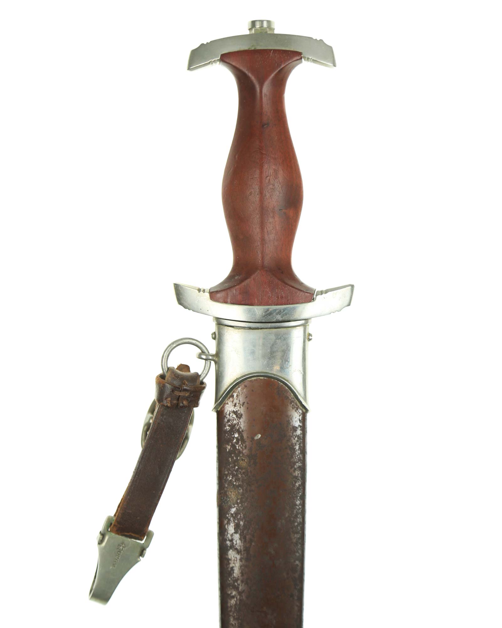 Grip: Nickel silver hilt fittings show light surface age patina with lower reverse crossguard group marked, «Ns» Lower Saxony. Light brown, wooden grip shows some wear and features early production quality grip-to-crossguard fit. Grip is without silver grip eagle and SA emblem.