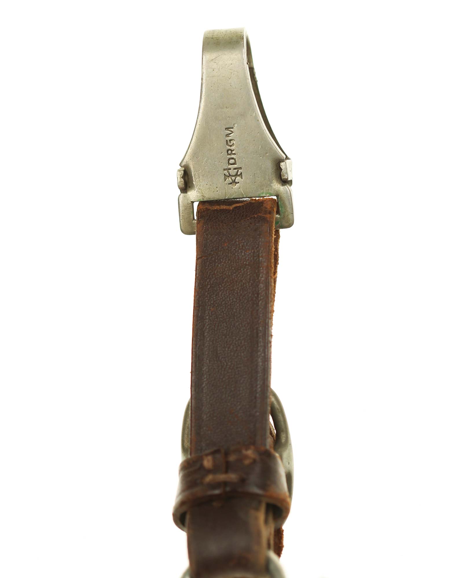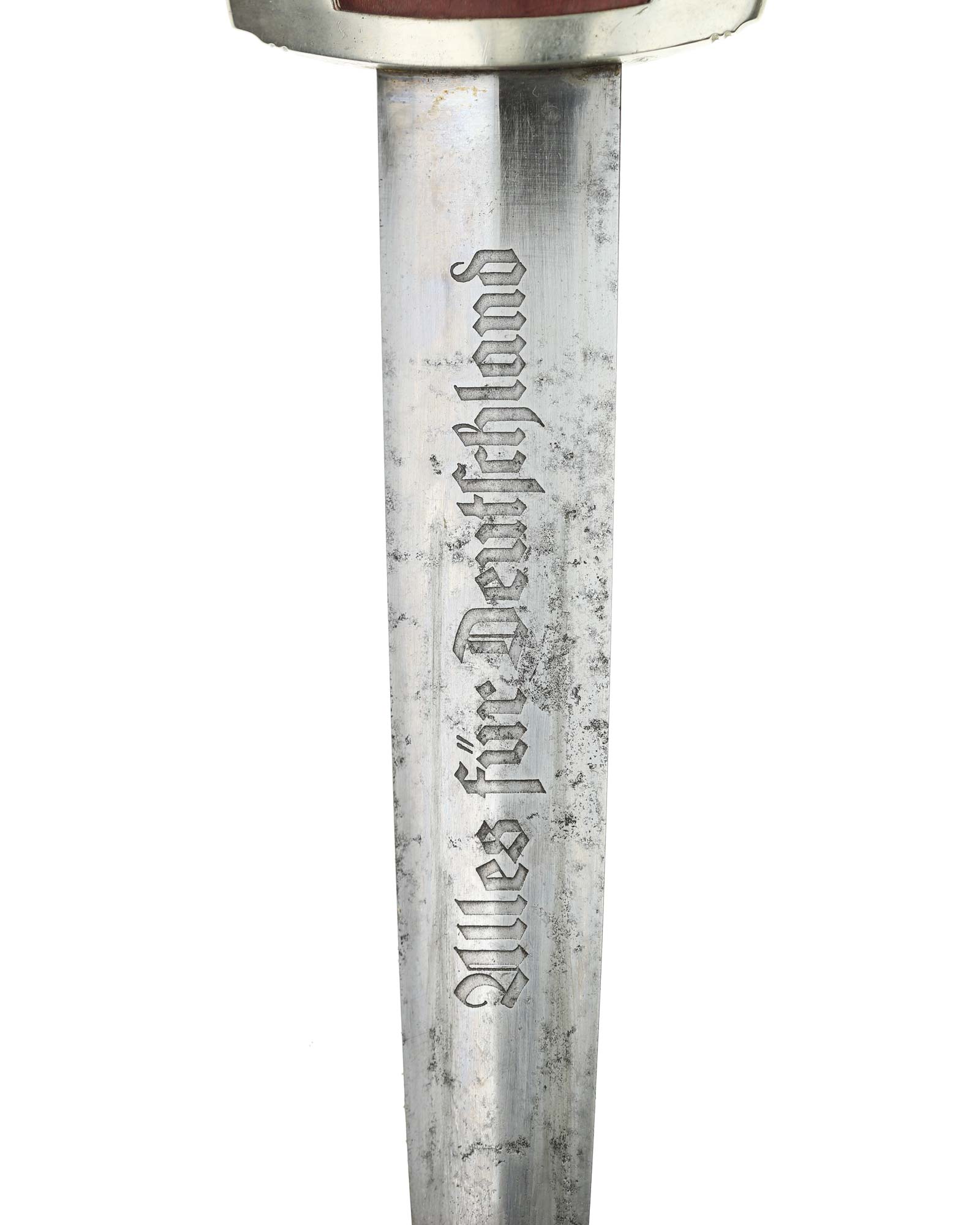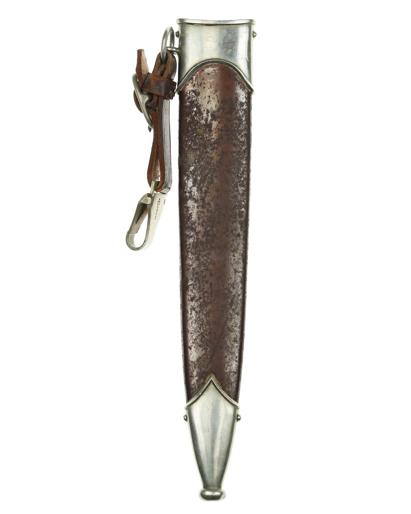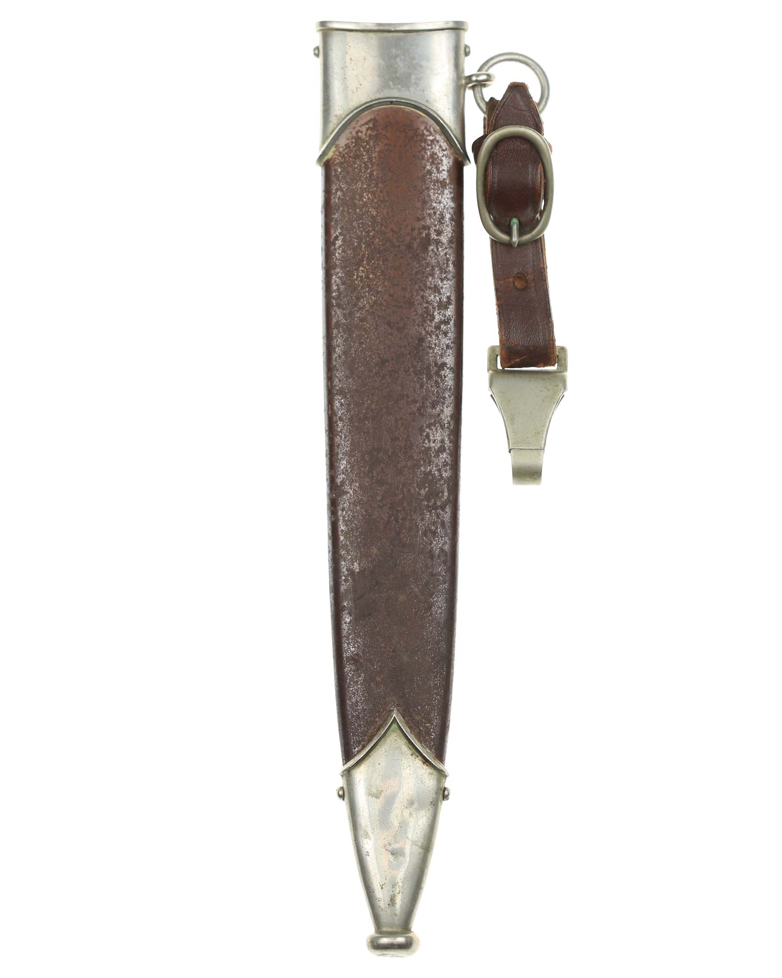 Grip: Nickel silver hilt fittings show light surface age patina with lower reverse crossguard group marked, «Ns» Lower Saxony. Light brown, wooden grip shows some wear and features early production quality grip-to-crossguard fit. Grip is without silver grip eagle and SA emblem.