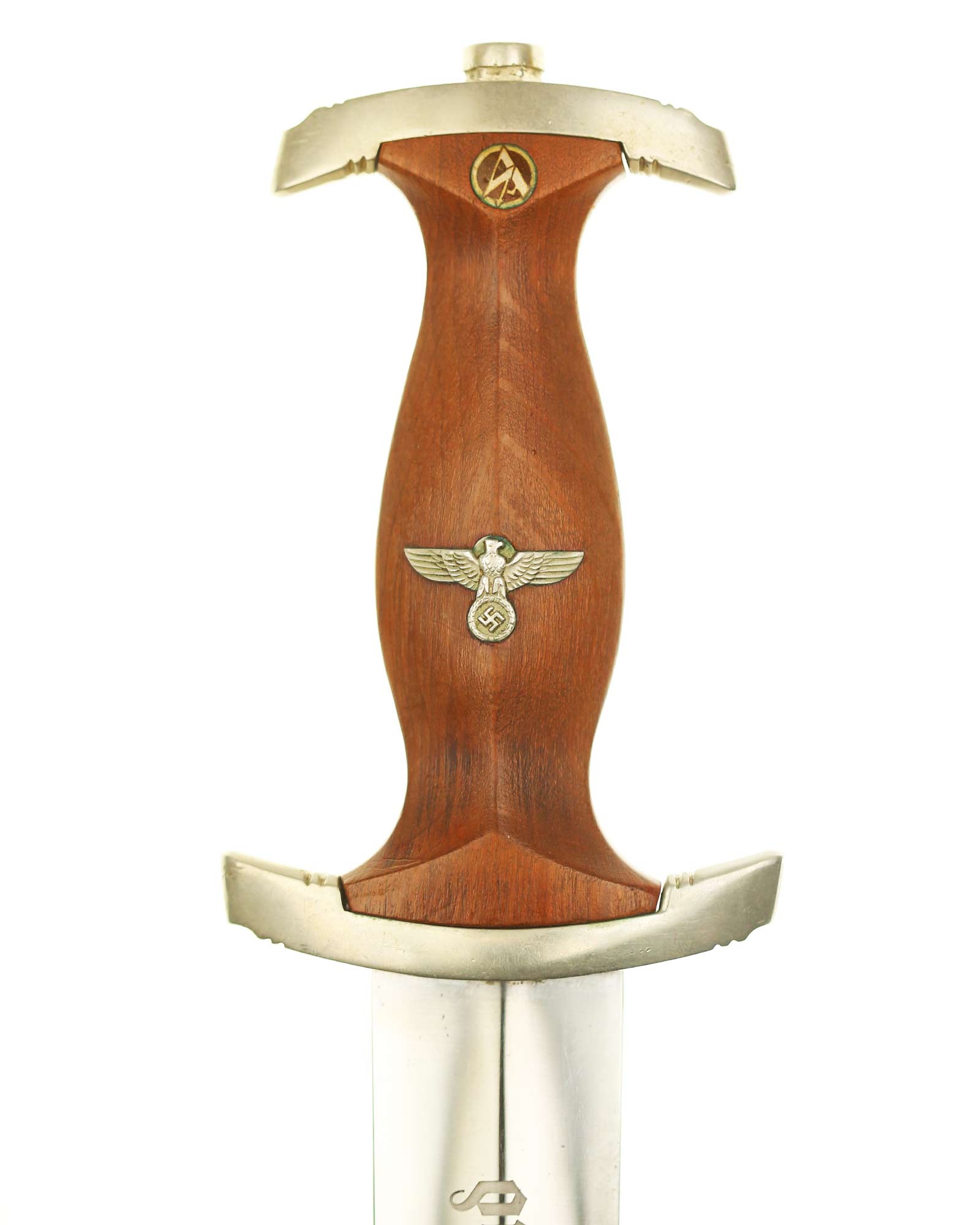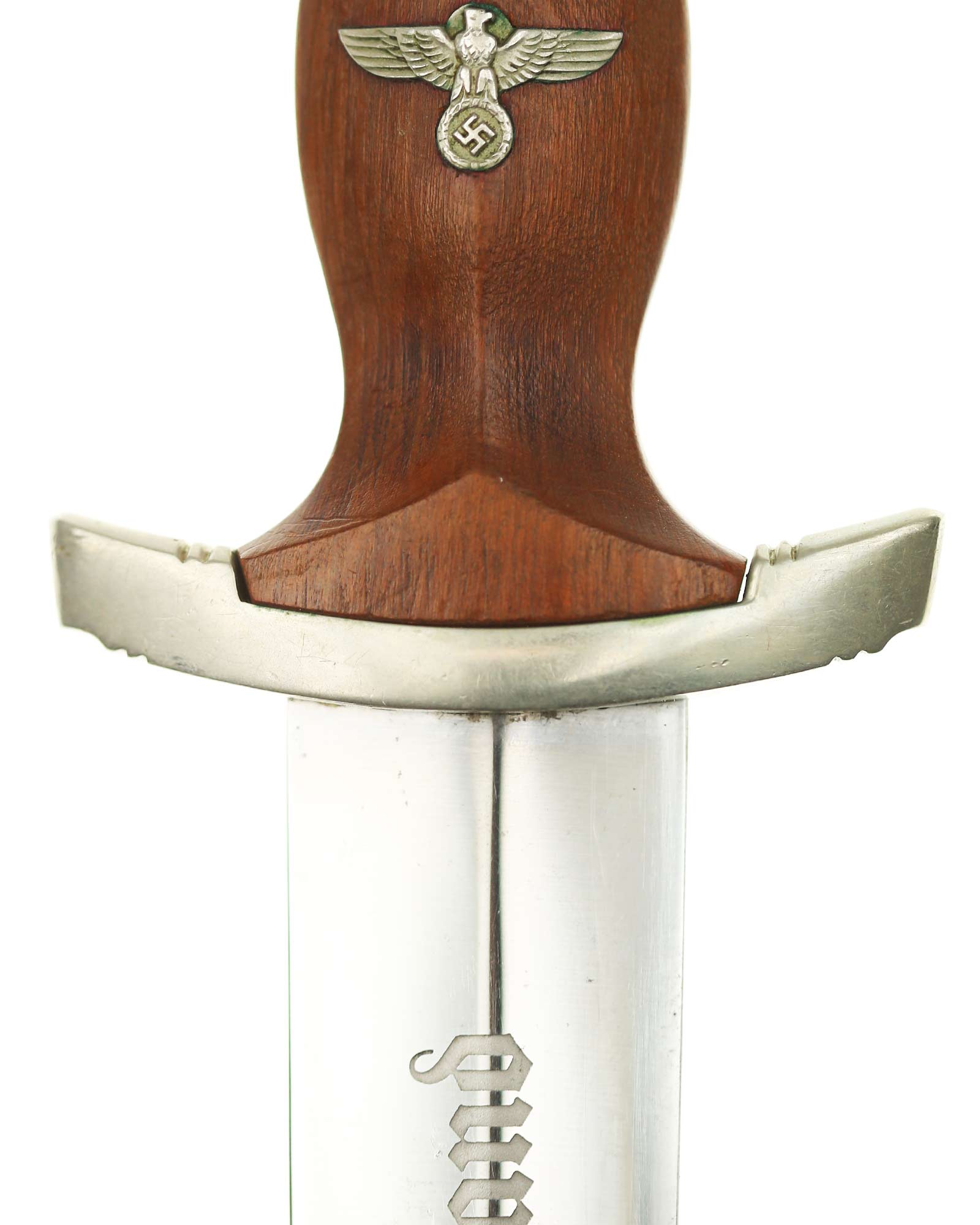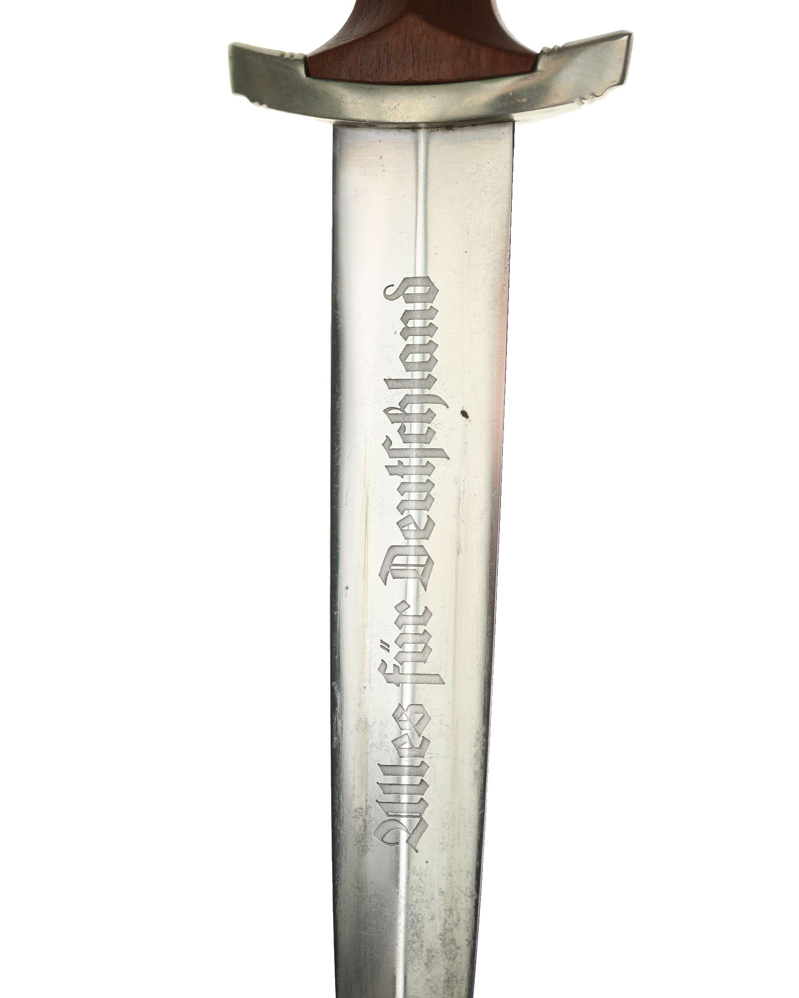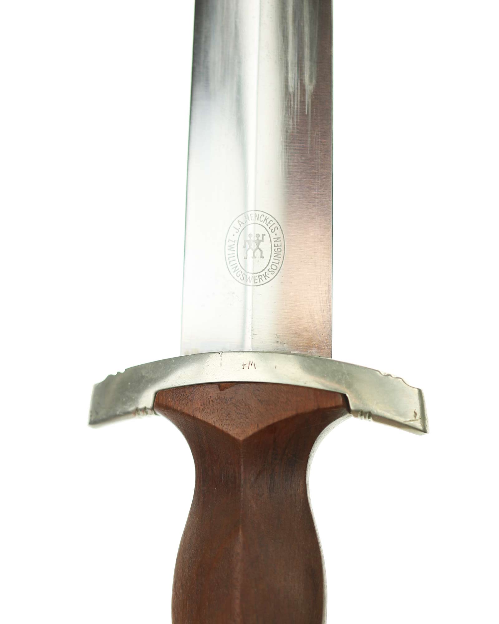 Blade: The blade of this example is still grades at about NEAR MINT. The SA motto Alles für Deutschland «Everything for Germany» is deep. The company logo is on the reverse ricasso: J.A. Henckels (Zwillingswerk) Solingen. The blade shoulders meet the crossguard contour.