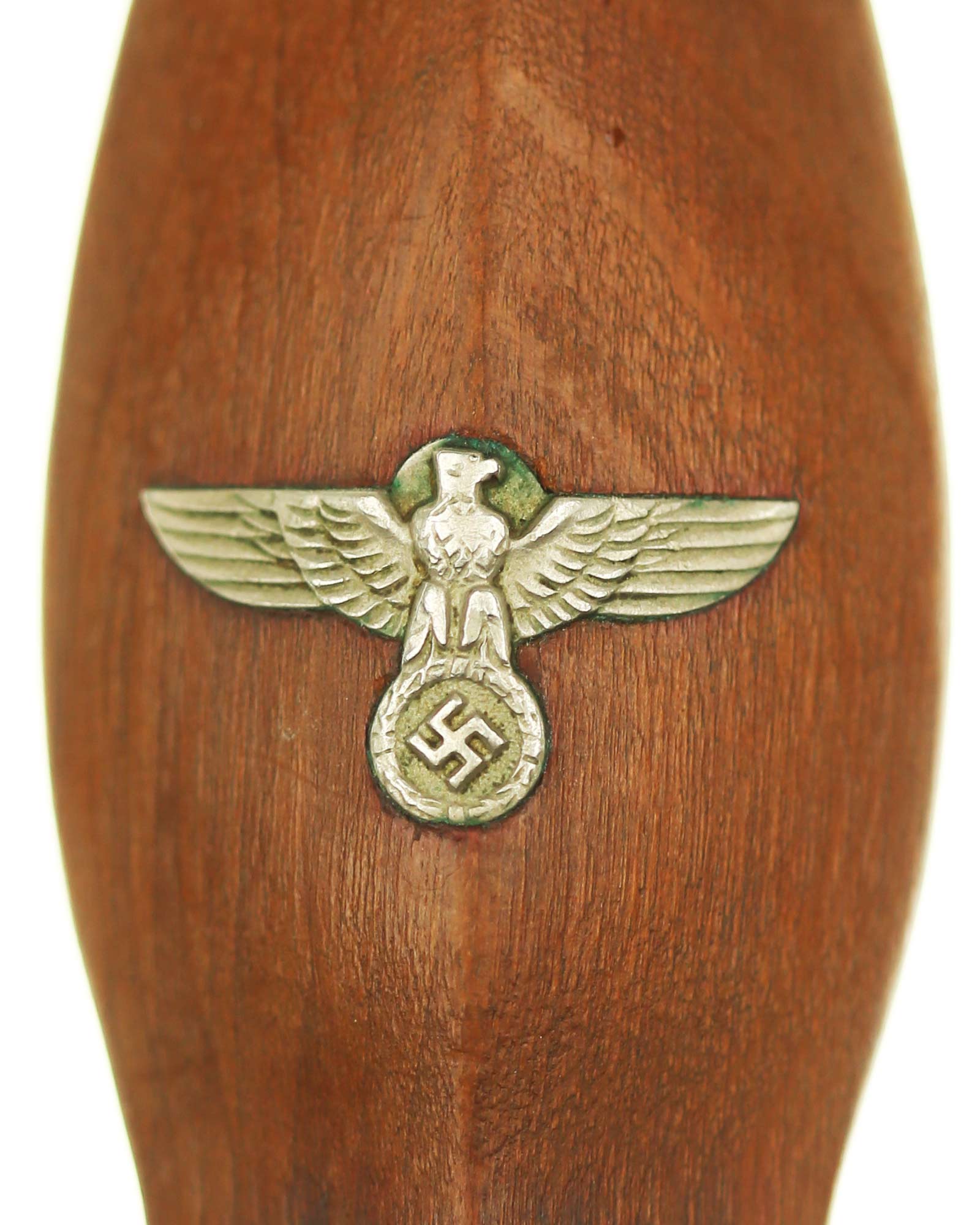 Grip: This grip appears to be in fine condition beneath the coating and is a medium contour ridge constructed. The grip perfectly fits the crossguards. The grip eagle is the “high-necked” type. The wing feathering, wreath and swastika are still quite crisp.