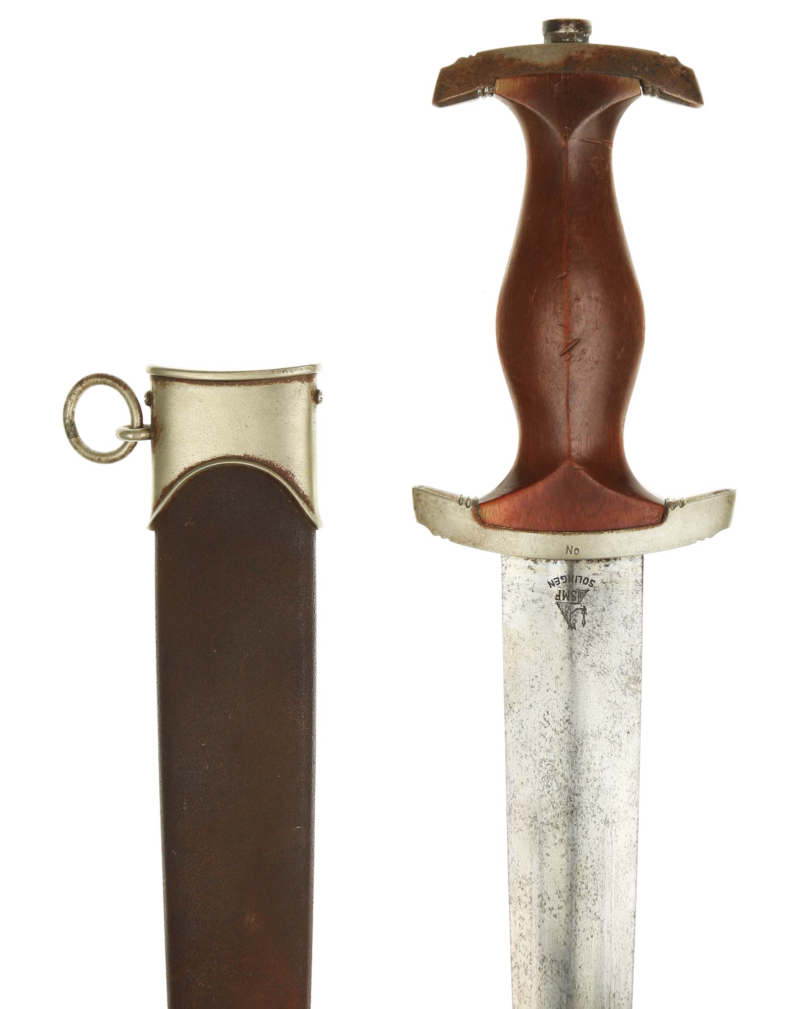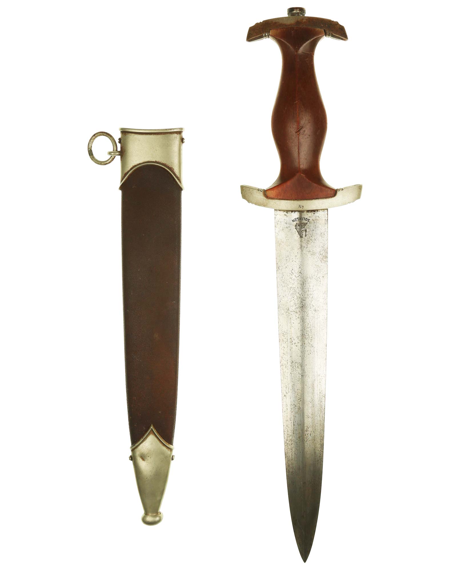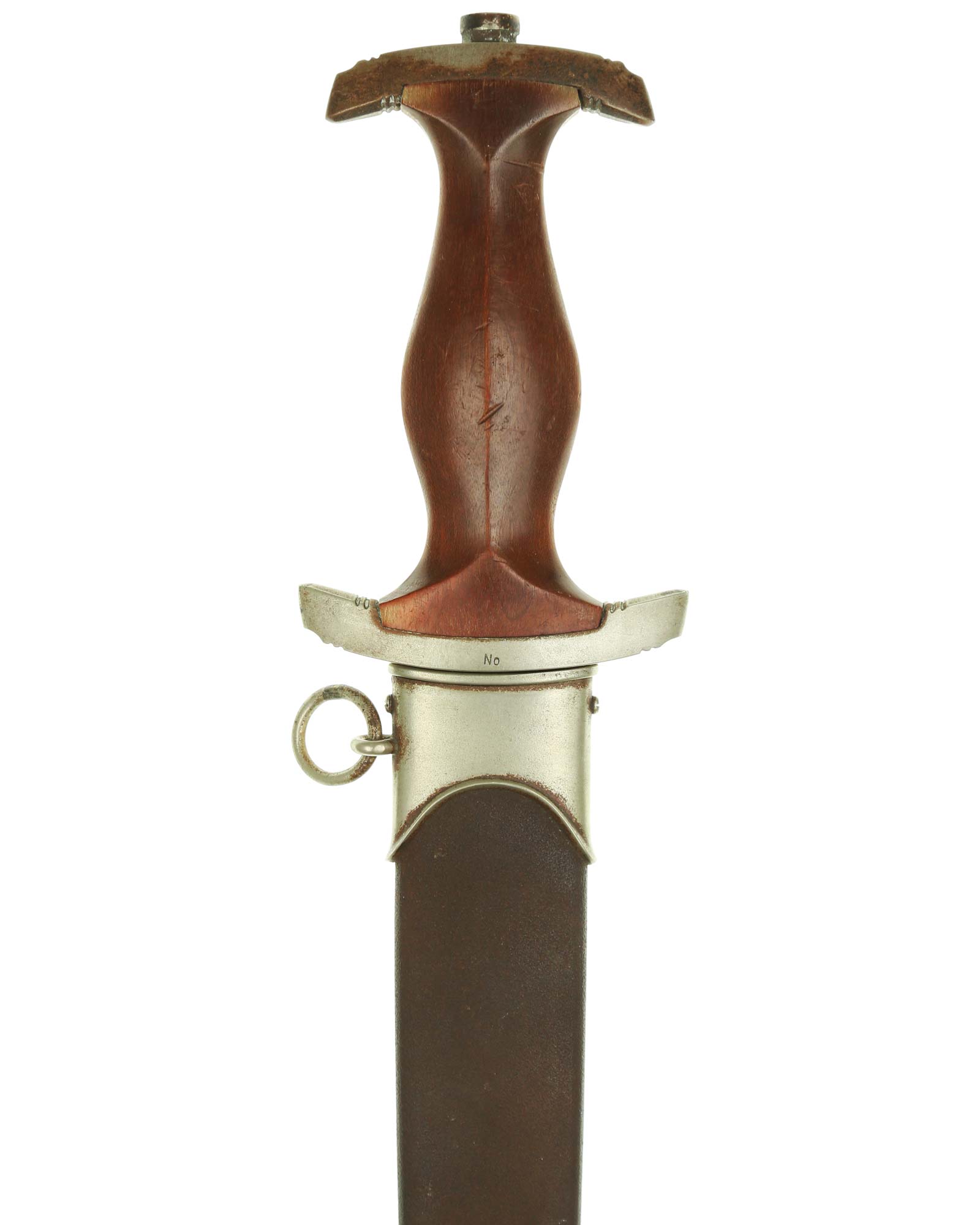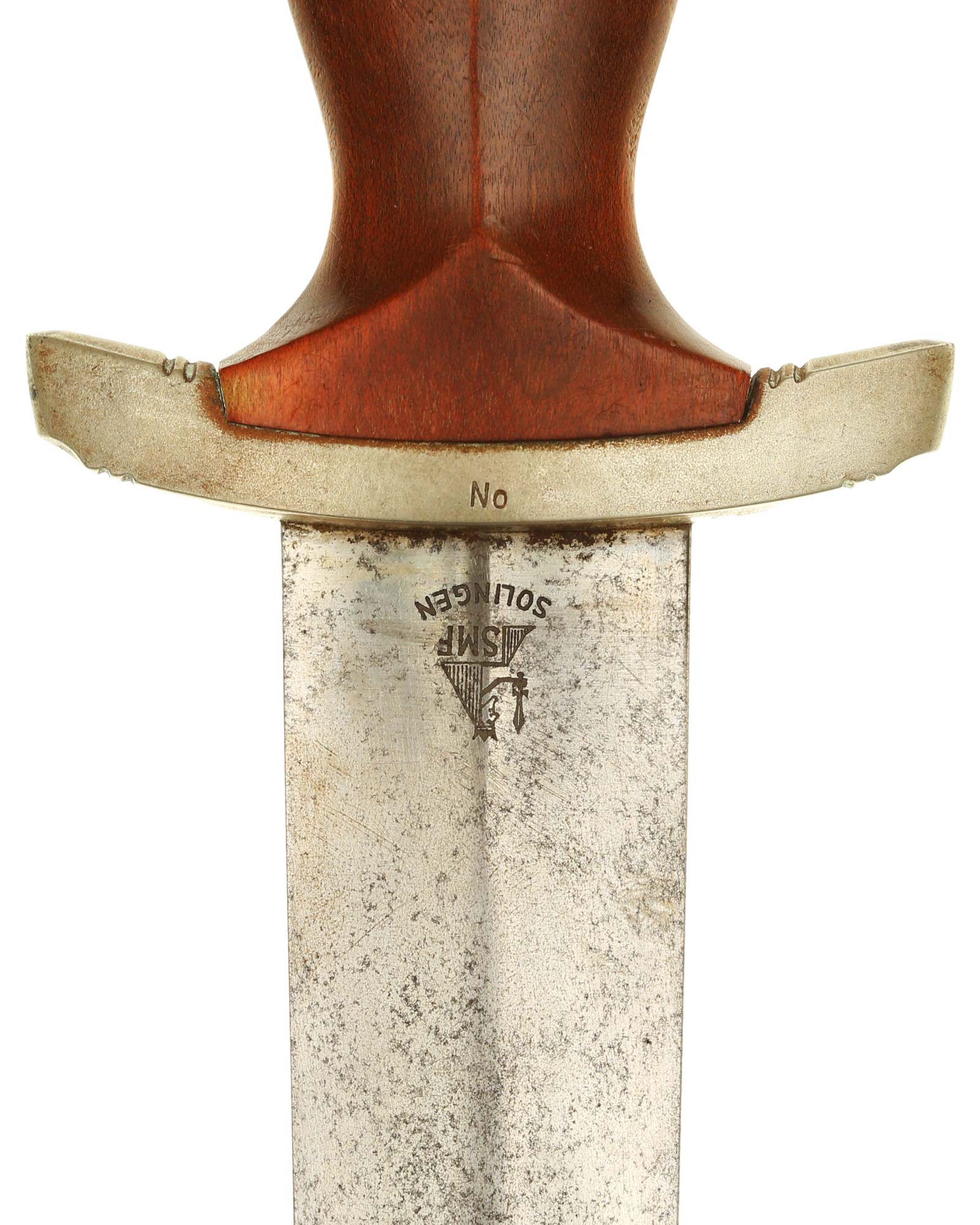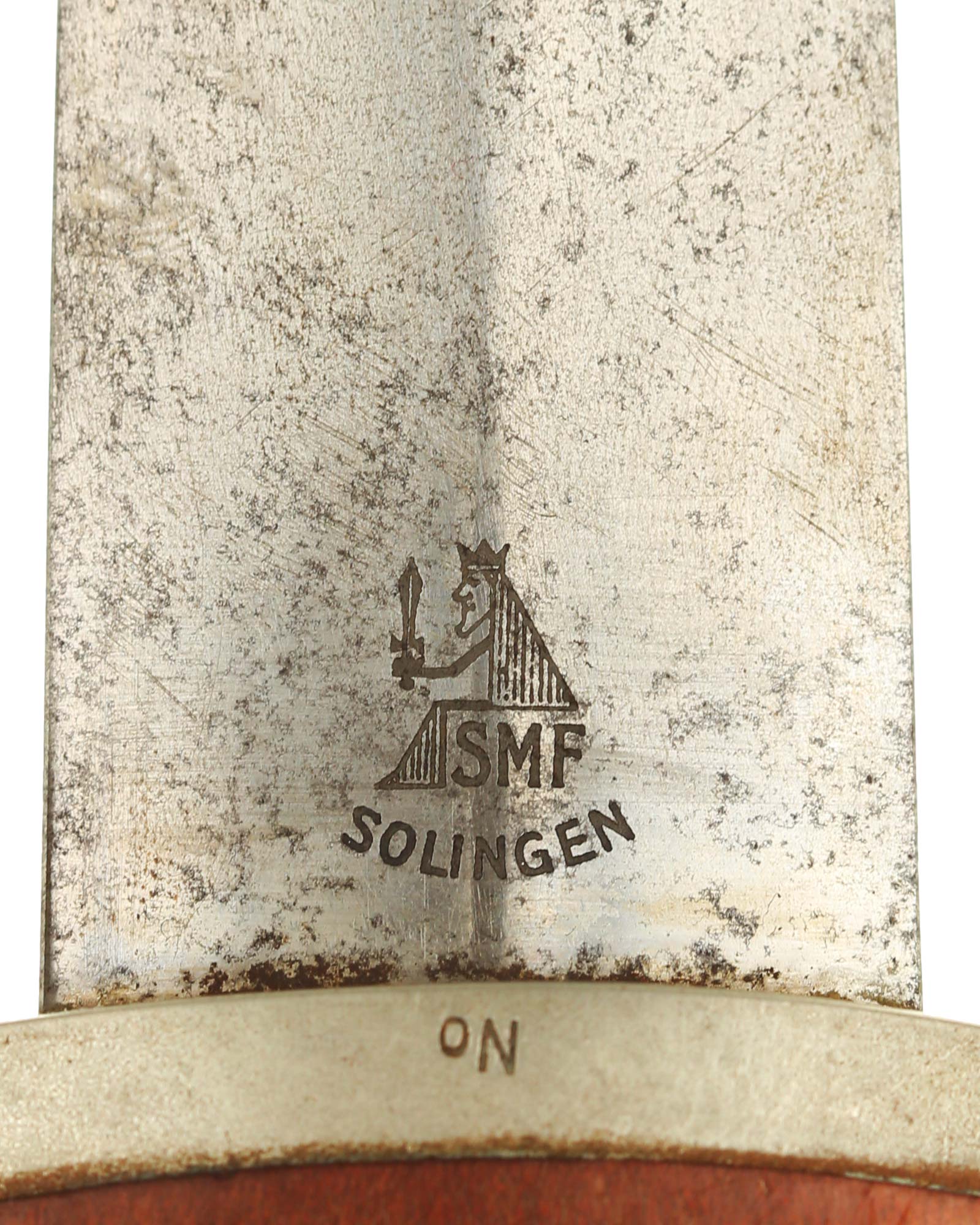 This SA [Sturmabteilung] Dagger in EXC+ condition. Model 1933. The total length is 37.5 cm. Early Nickel fittings, lower guard with "No" stamp. The Dagger hasthe maker mark on the blade: SMF Solingen.