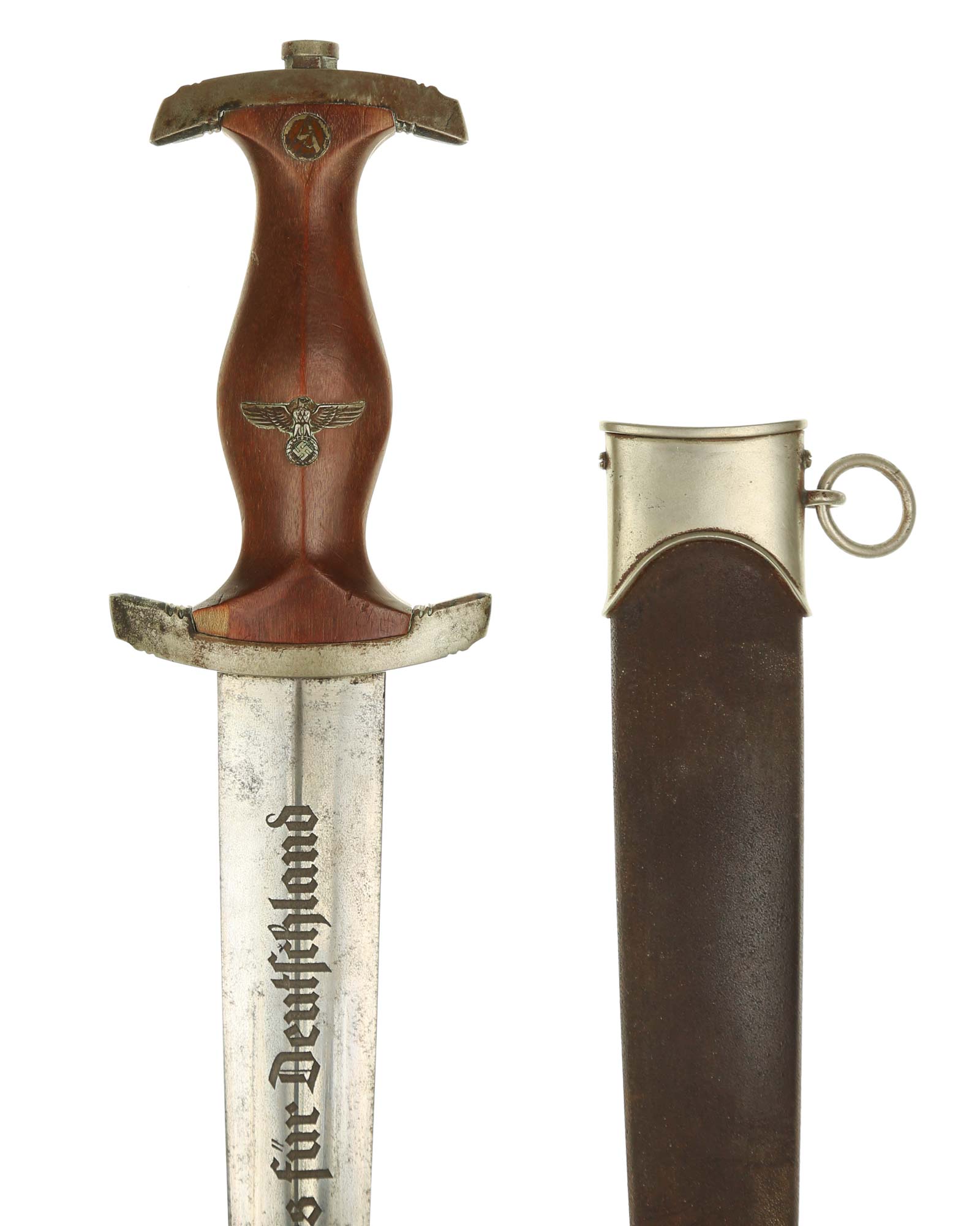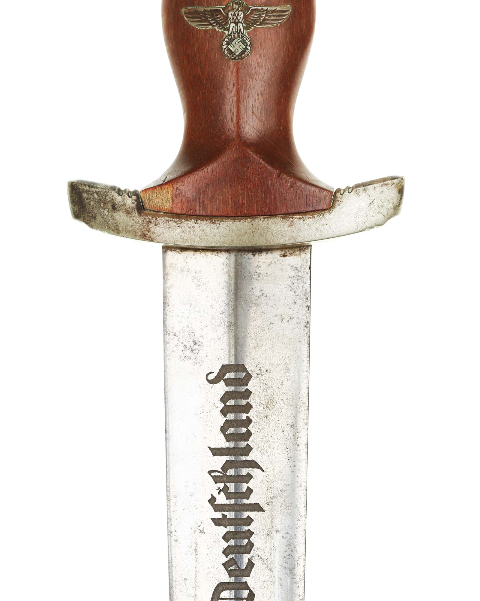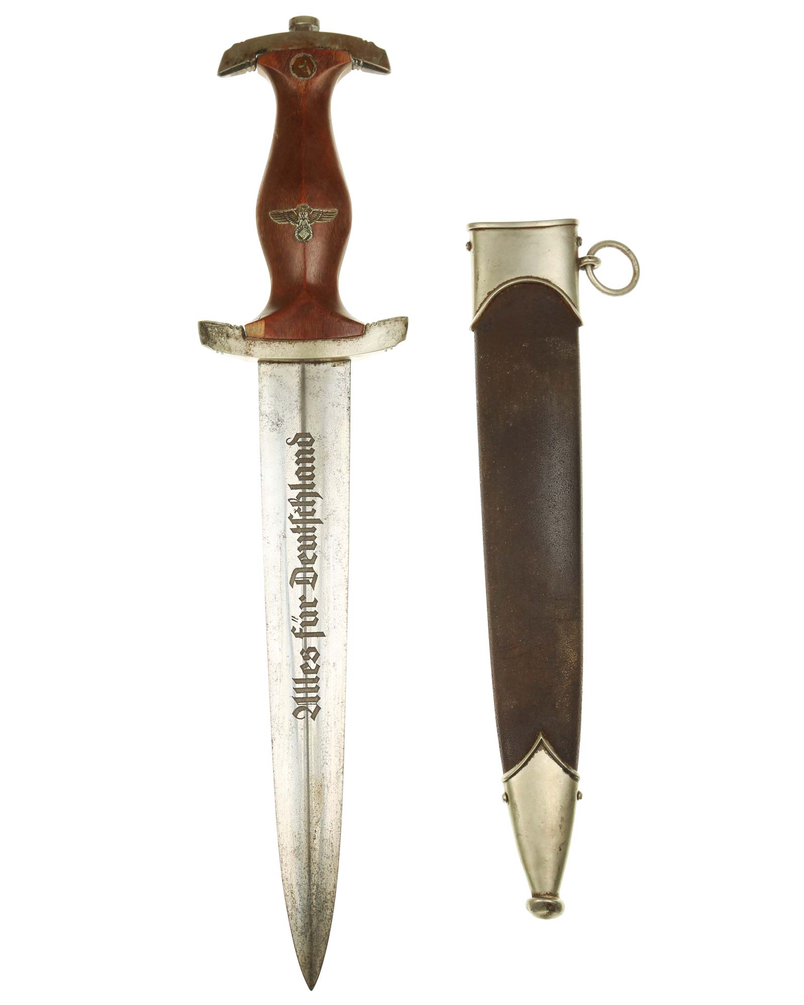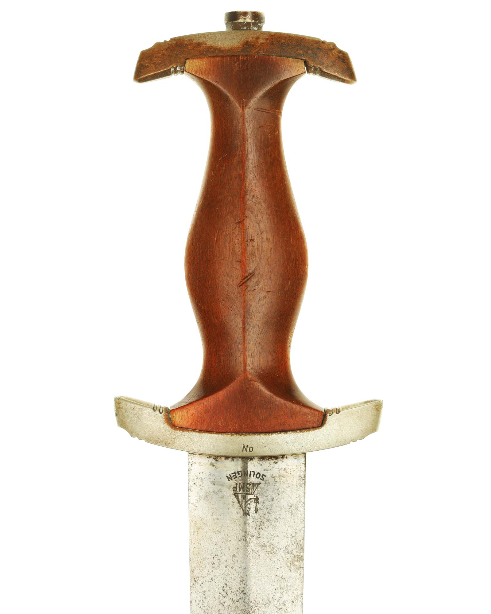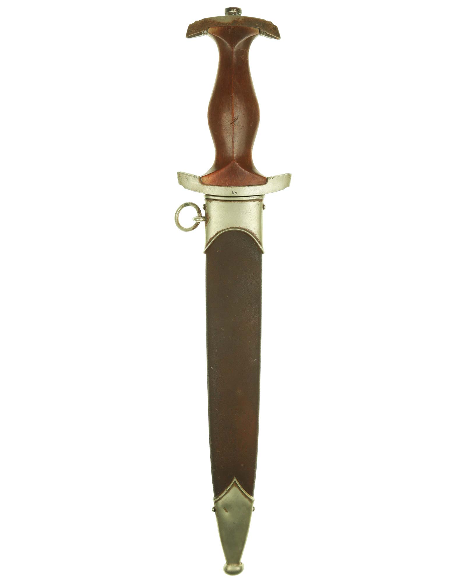 This SA [Sturmabteilung] Dagger in EXC+ condition. Model 1933. The total length is 37.5 cm. Early Nickel fittings, lower guard with "No" stamp. The Dagger hasthe maker mark on the blade: SMF Solingen.