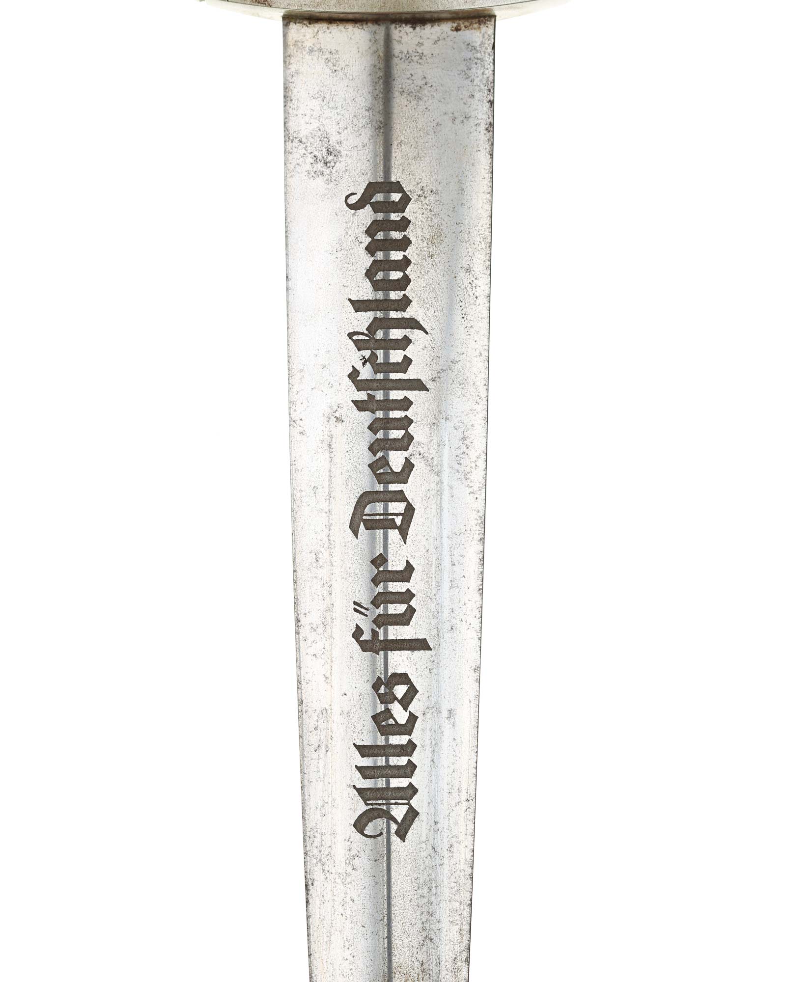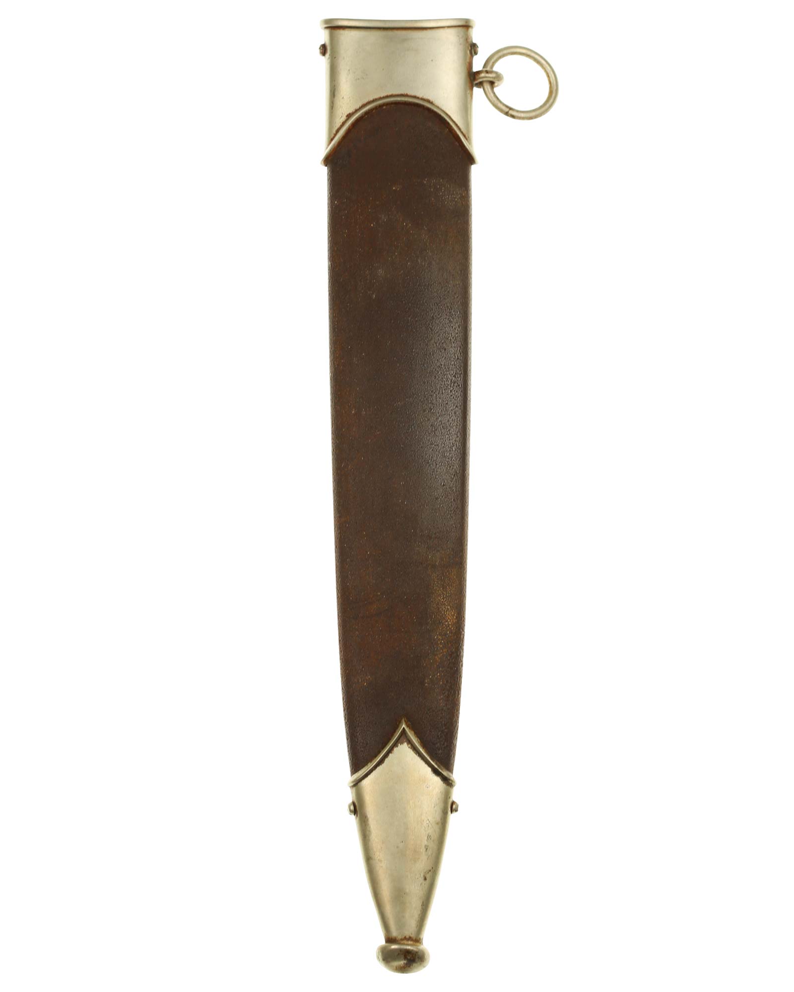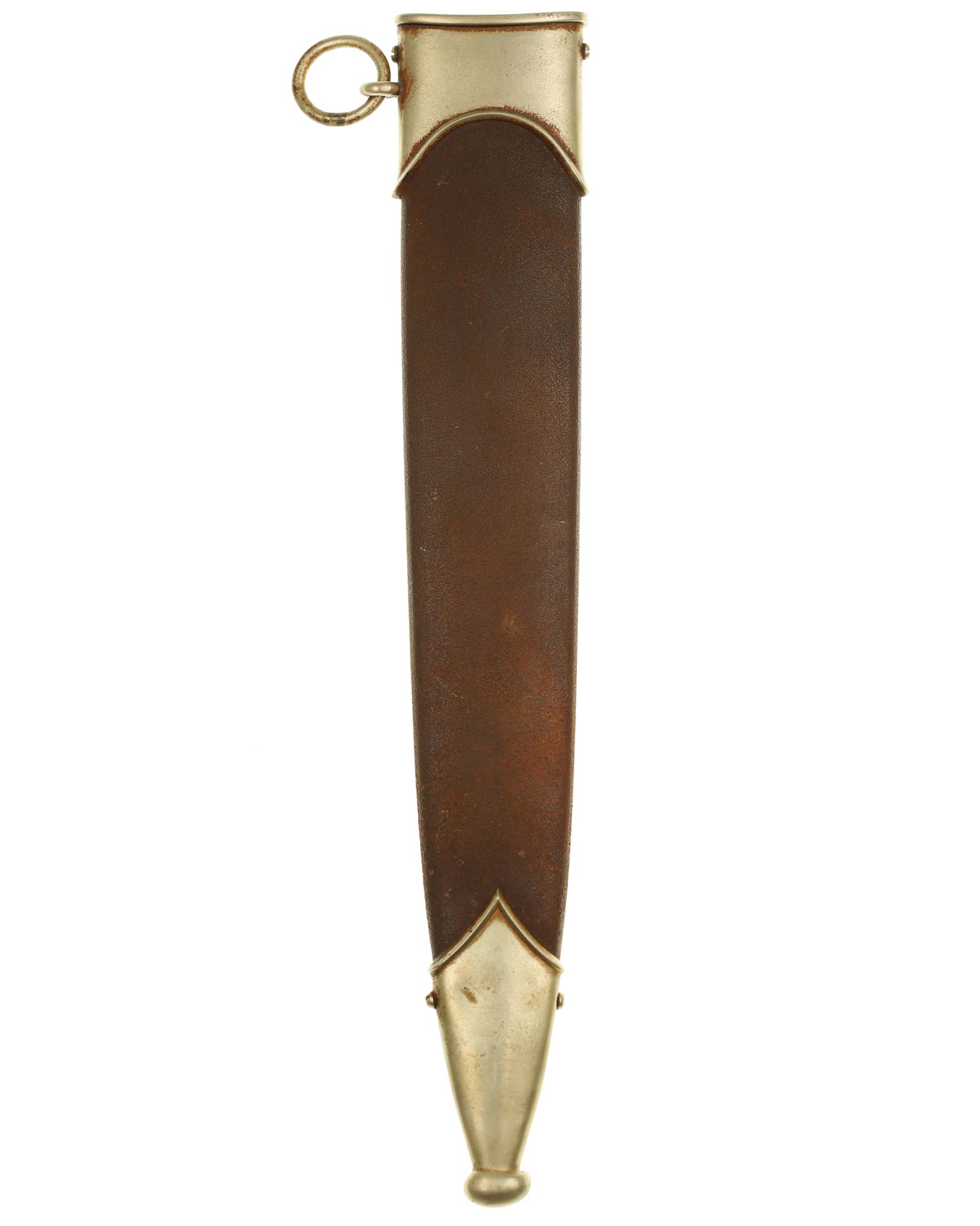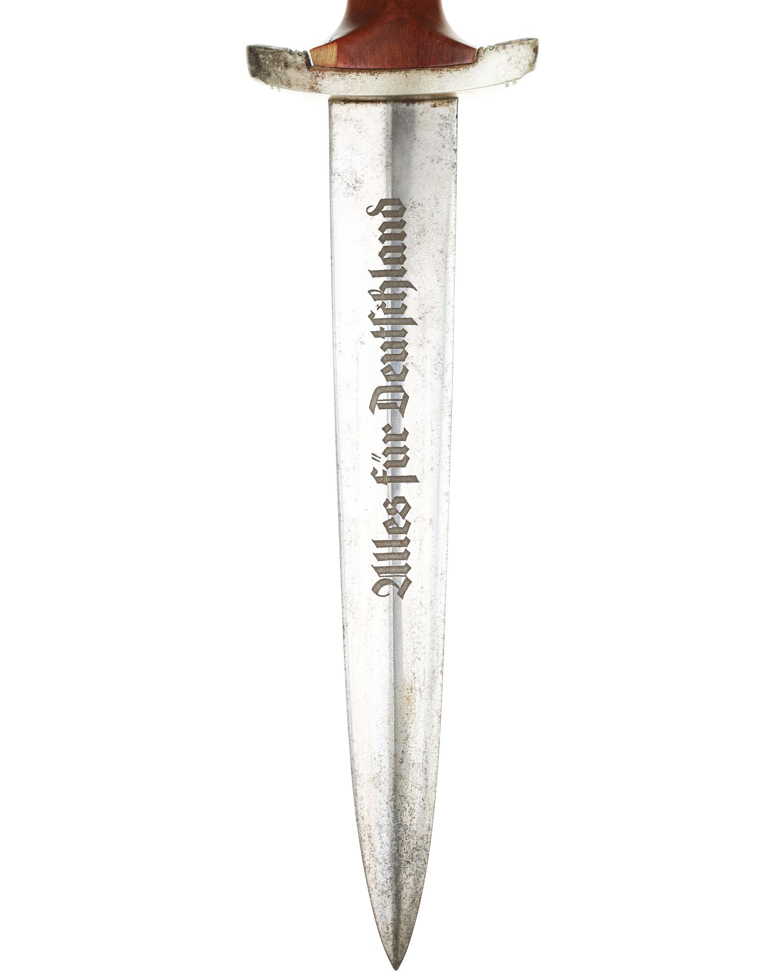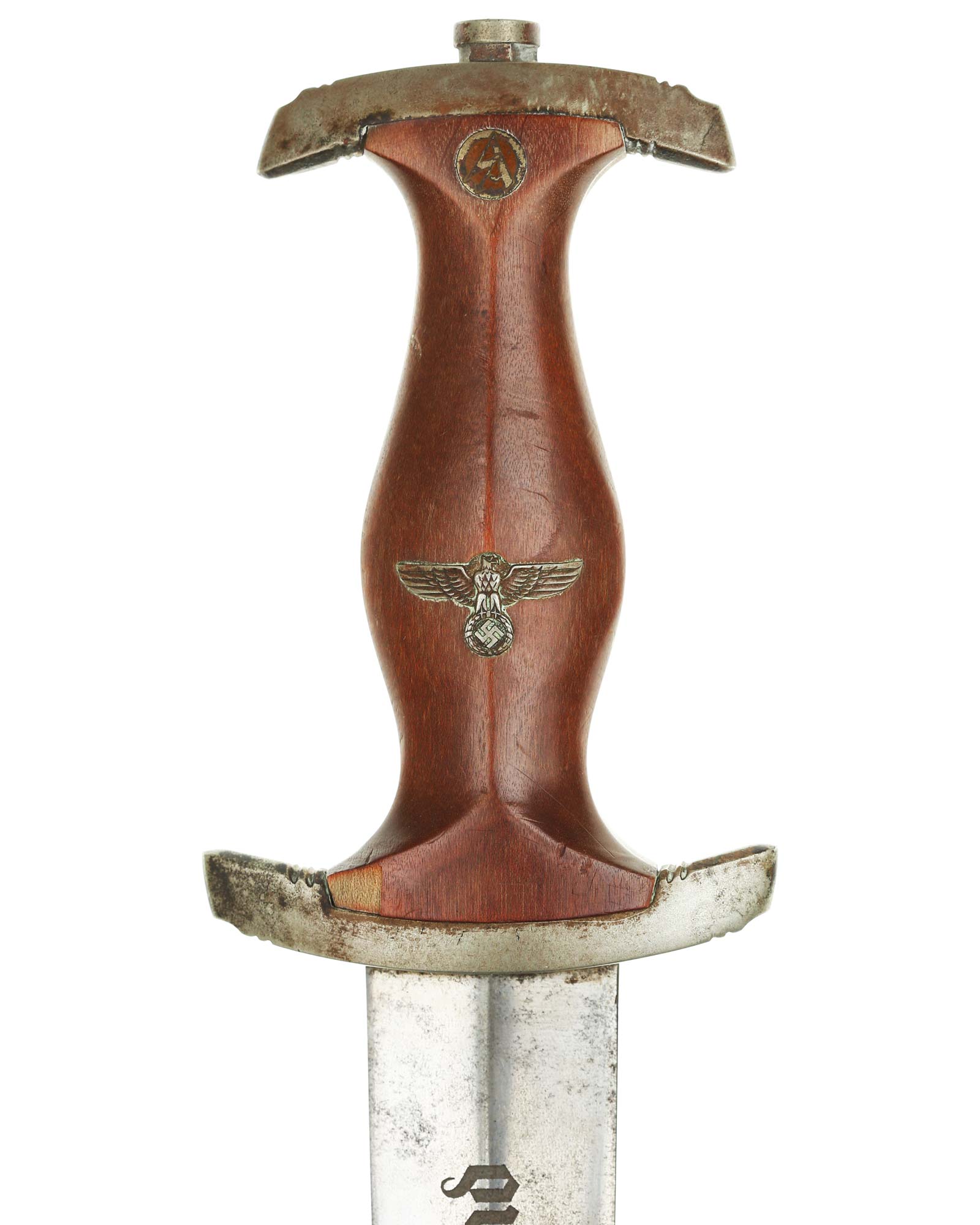 This SA [Sturmabteilung] Dagger in EXC+ condition. Model 1933. The total length is 37.5 cm. Early Nickel fittings, lower guard with "No" stamp. The Dagger hasthe maker mark on the blade: SMF Solingen.