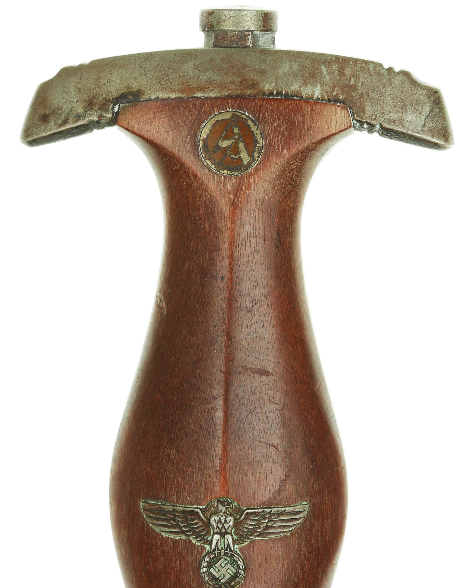 Blade: The blade is in EXC+ condition. The SA motto Alles für Deutschland «Everything for Germany» is crisp. The ricasso area still has the full trademark: SMF Solingen. The blade shoulders perfectly meet the lower crossguard contour.