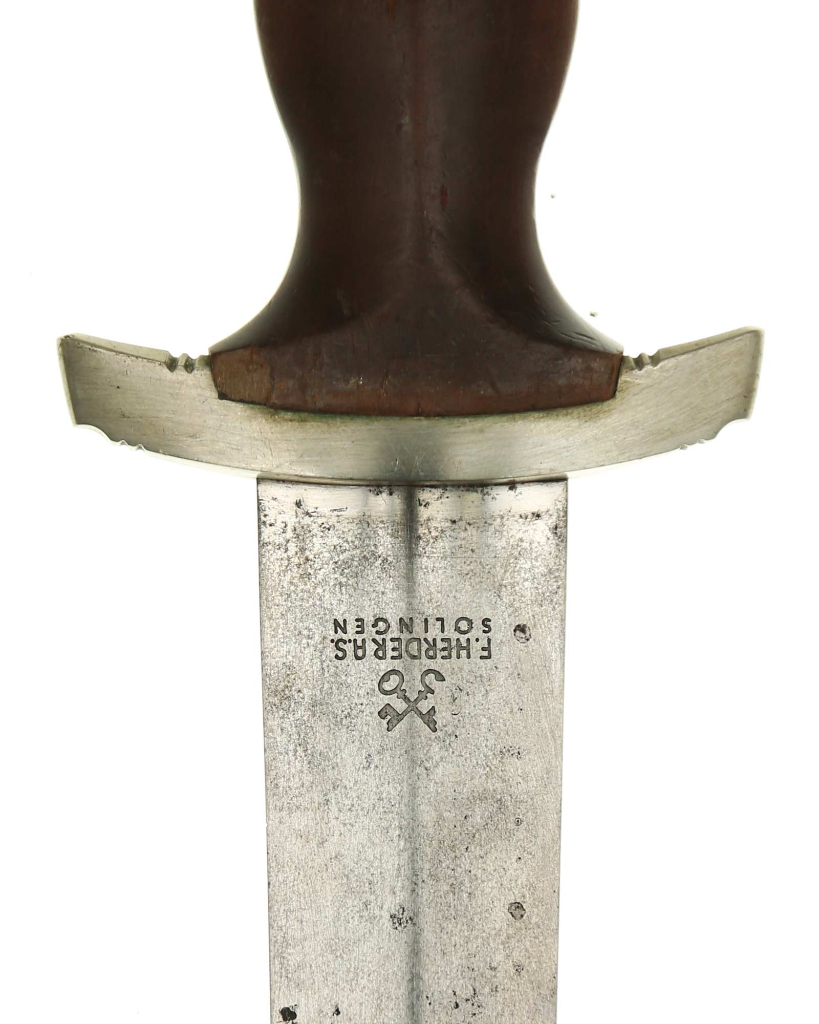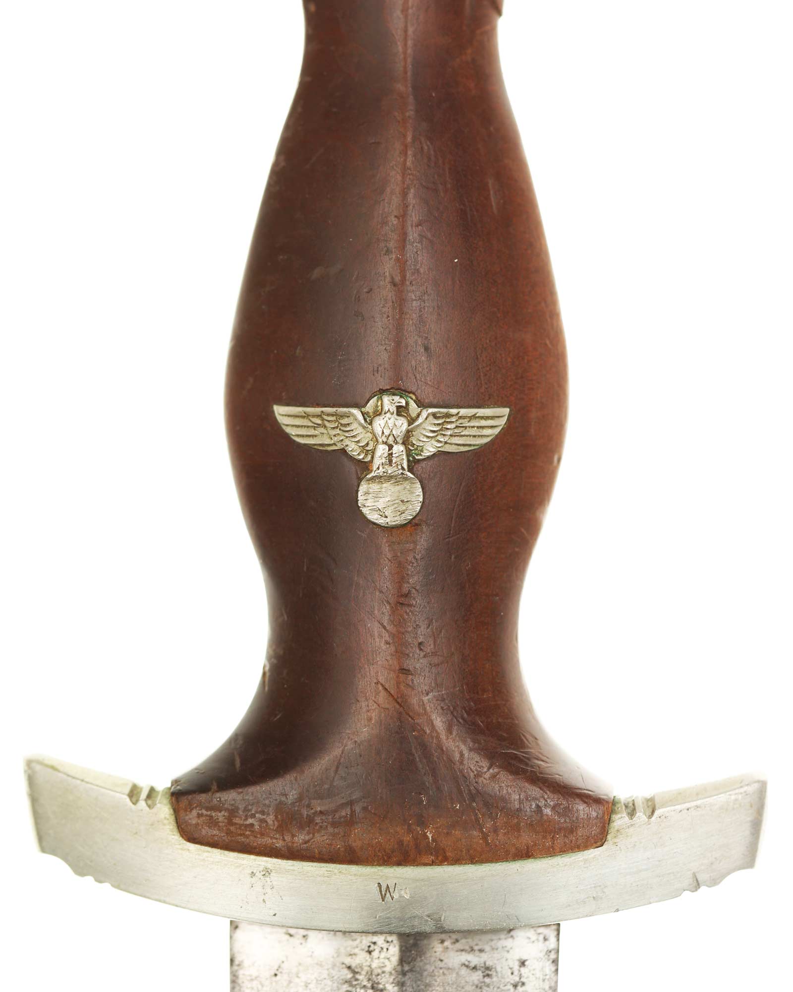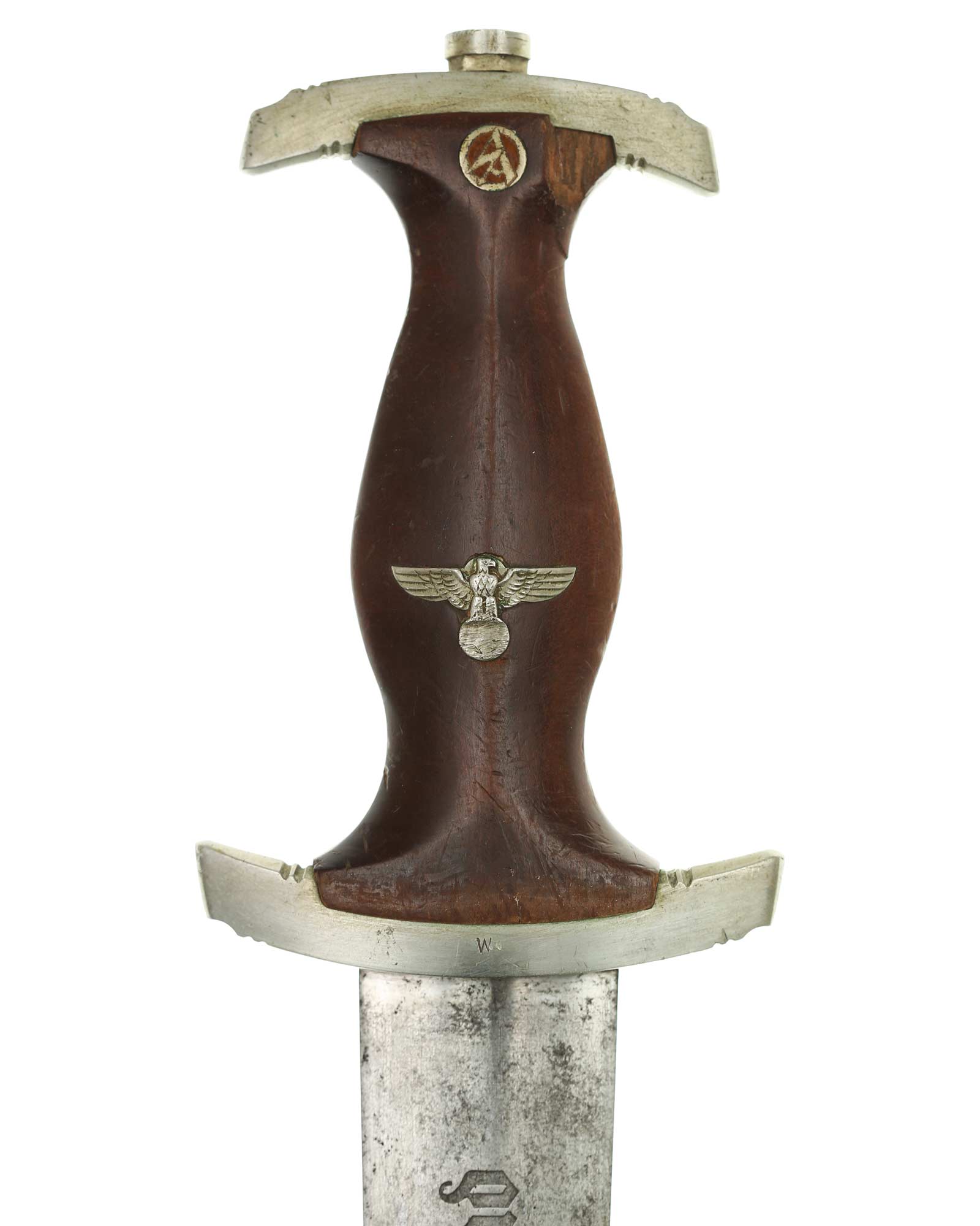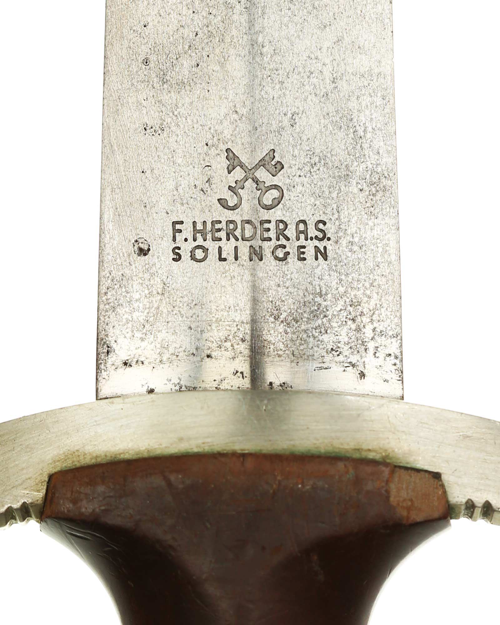 This SA [Sturmabteilung] Dagger in EXC condition. Model 1933. The total length is 34.3 cm. Early Nickel fittings, lower guard with «Wm» stamp. The Dagger has the maker mark on the blade: F. Herder A.S. Solingen. Dagger without Scabbard.