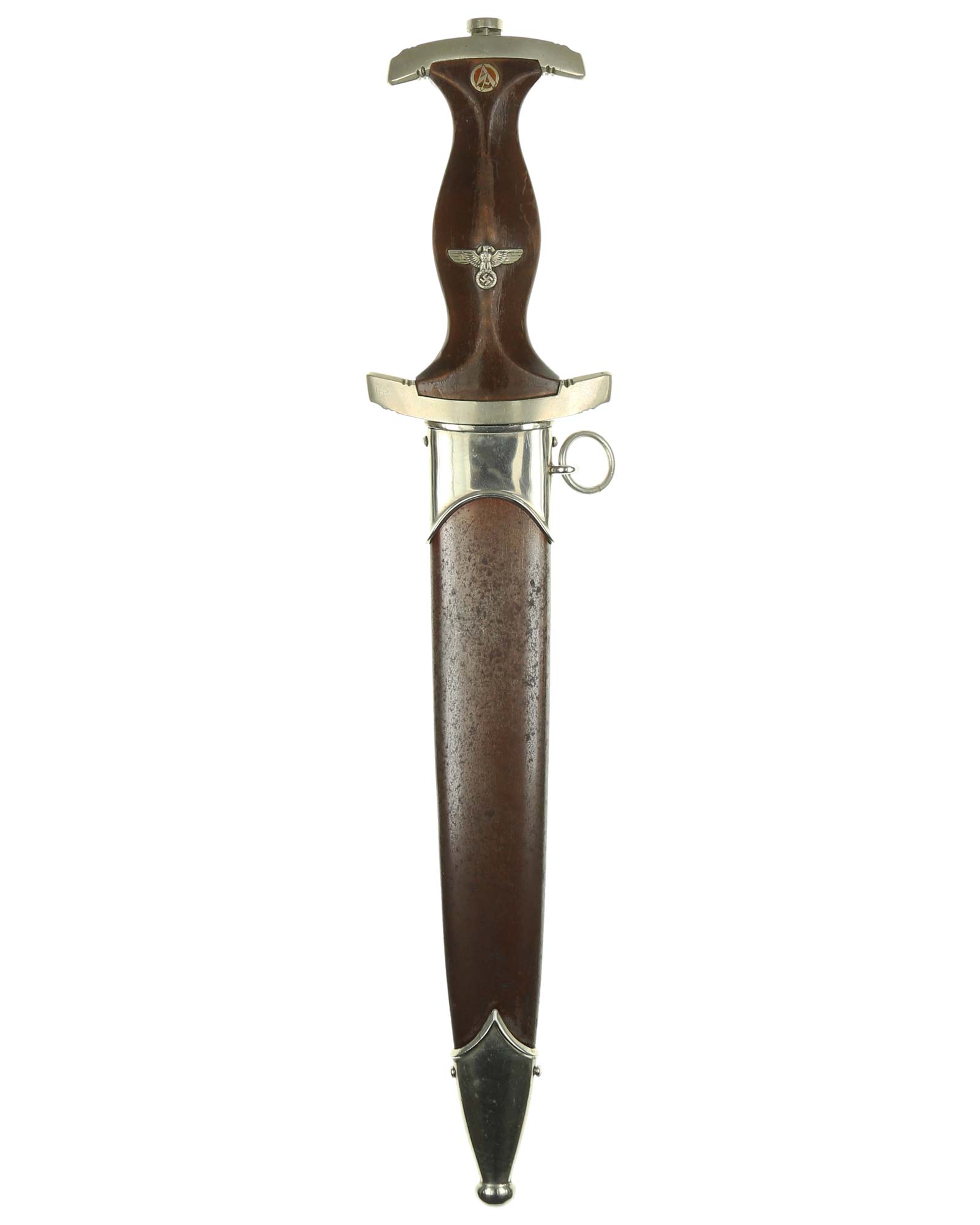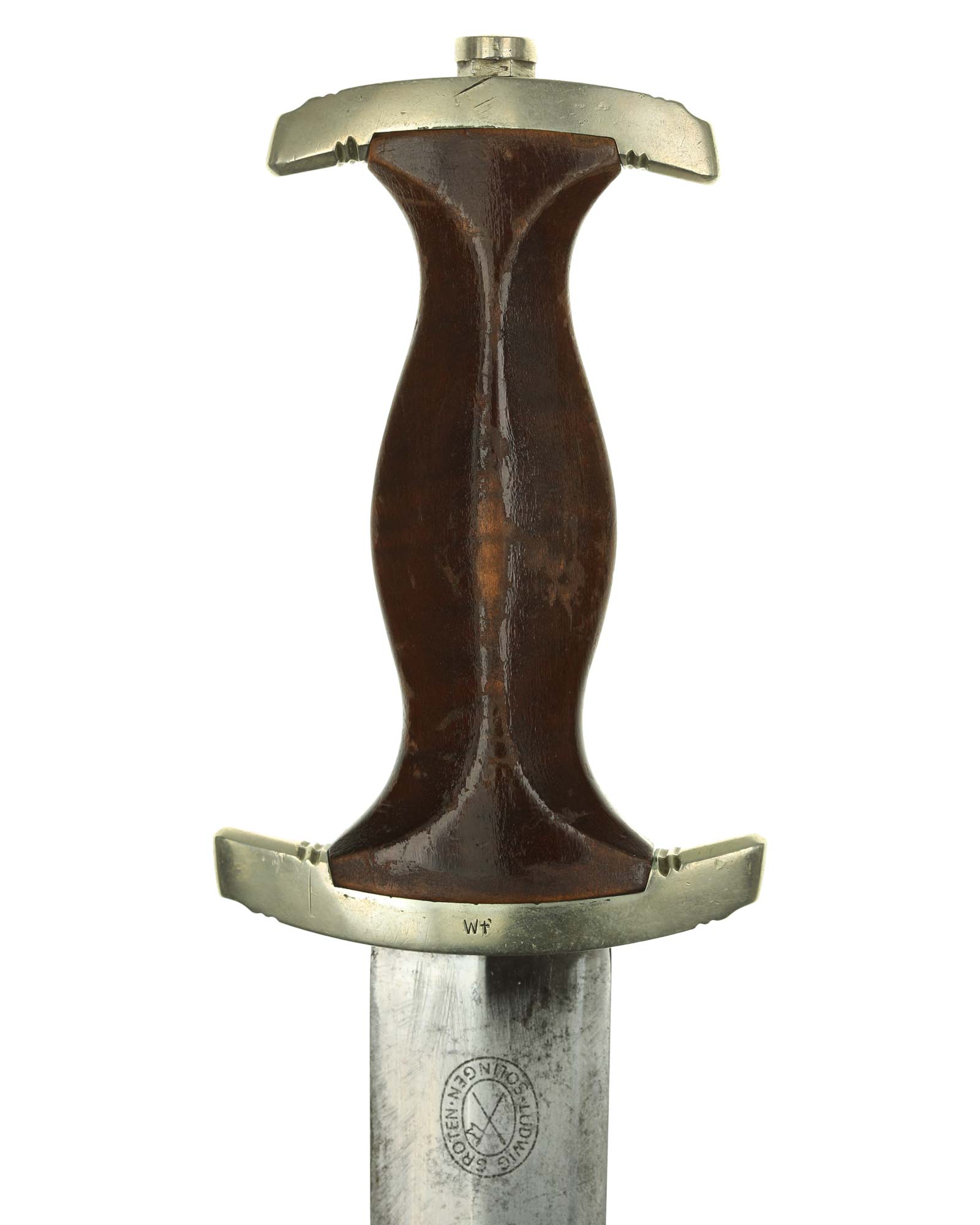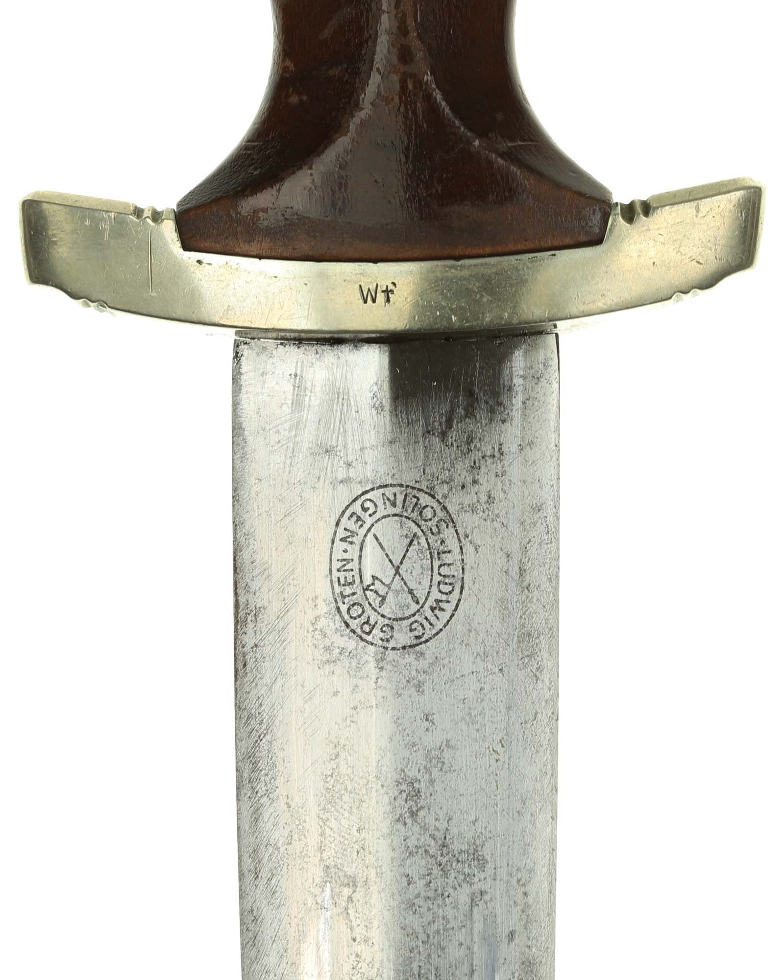 This SA [Sturmabteilung] Dagger in EXC+ condition. Model 1933. The total length is 37.1 cm. Early Nickel fittings, lower guard with "Wf" stamp. The Dagger has the maker mark on the blade: Ludwig Groten Solingen.