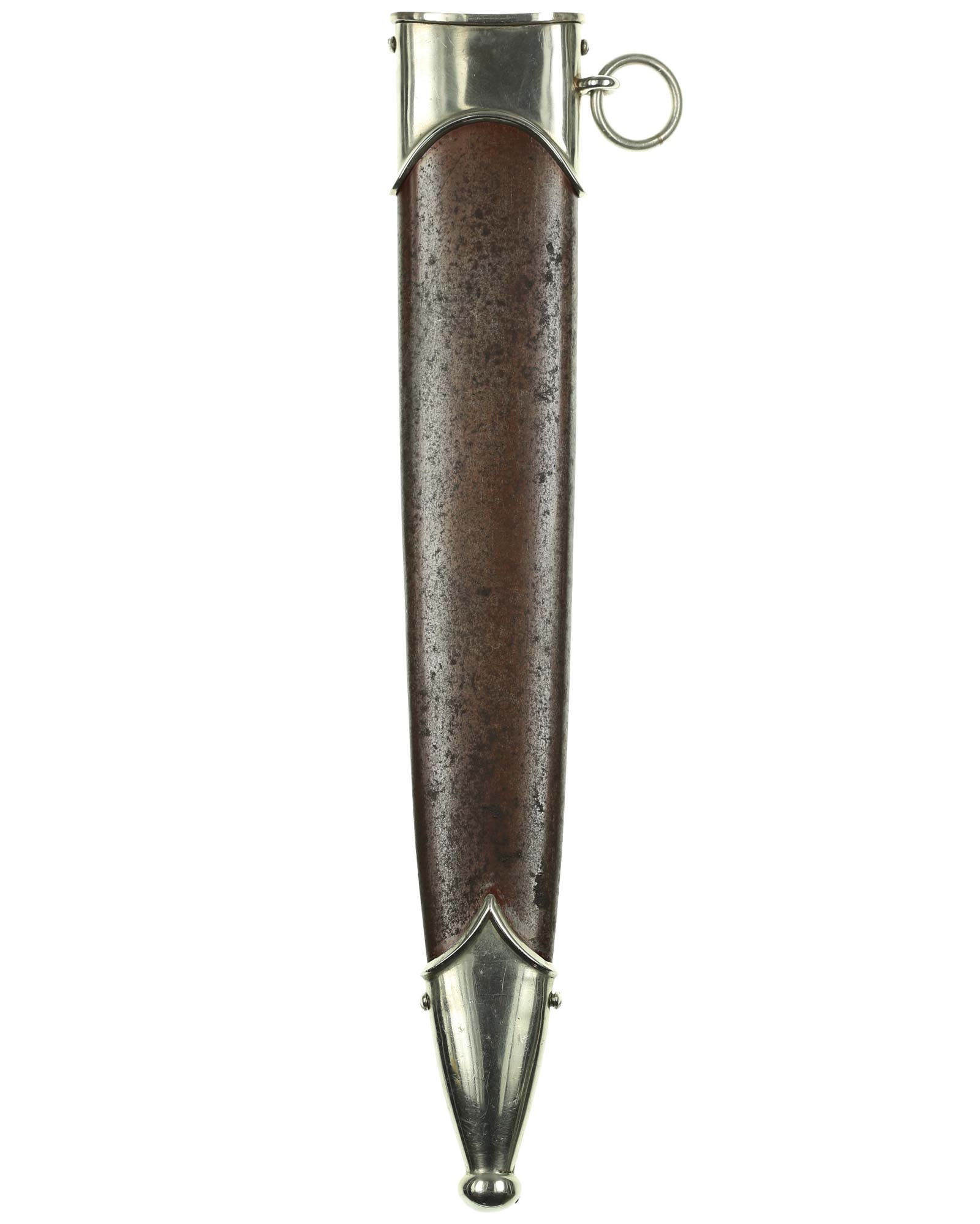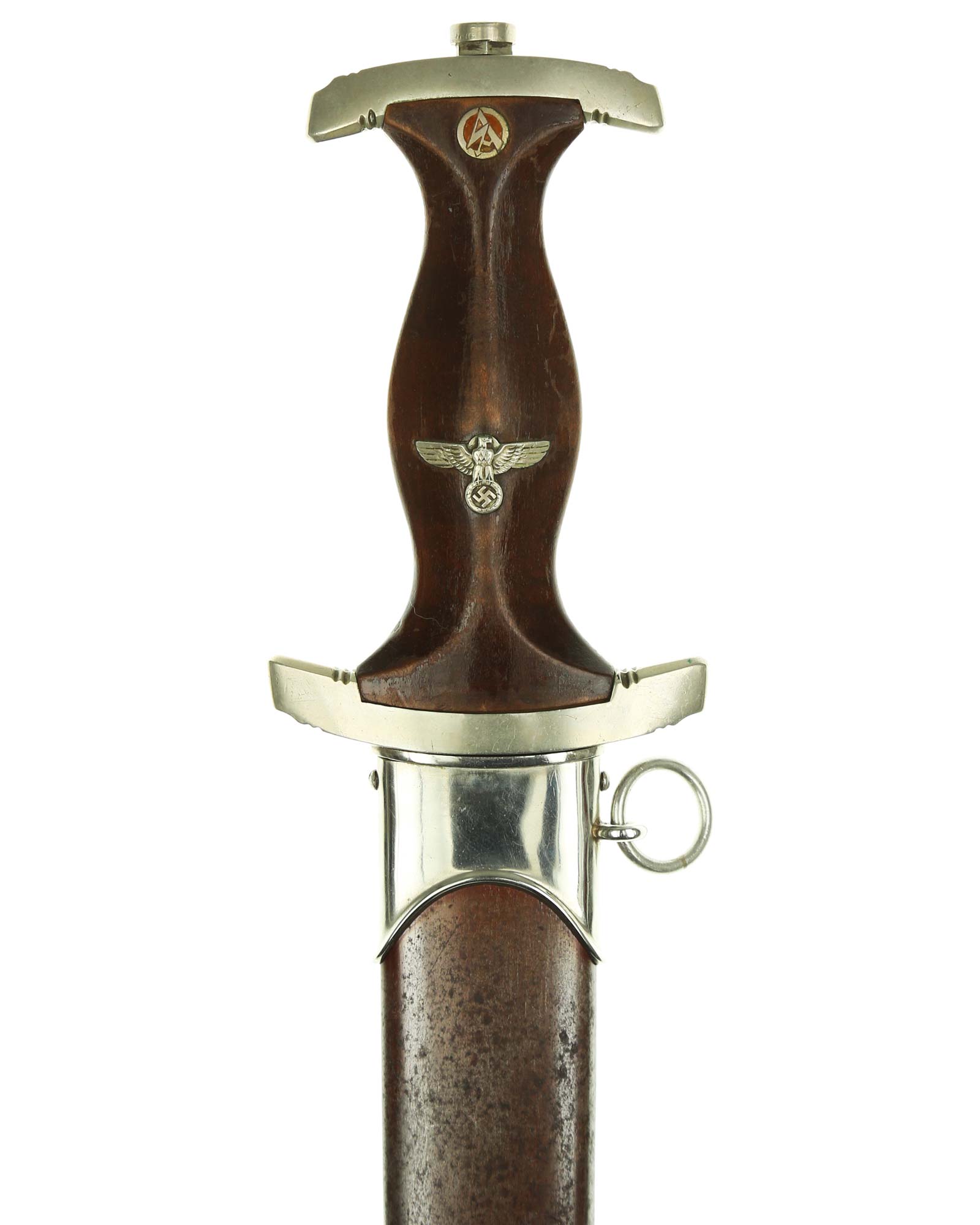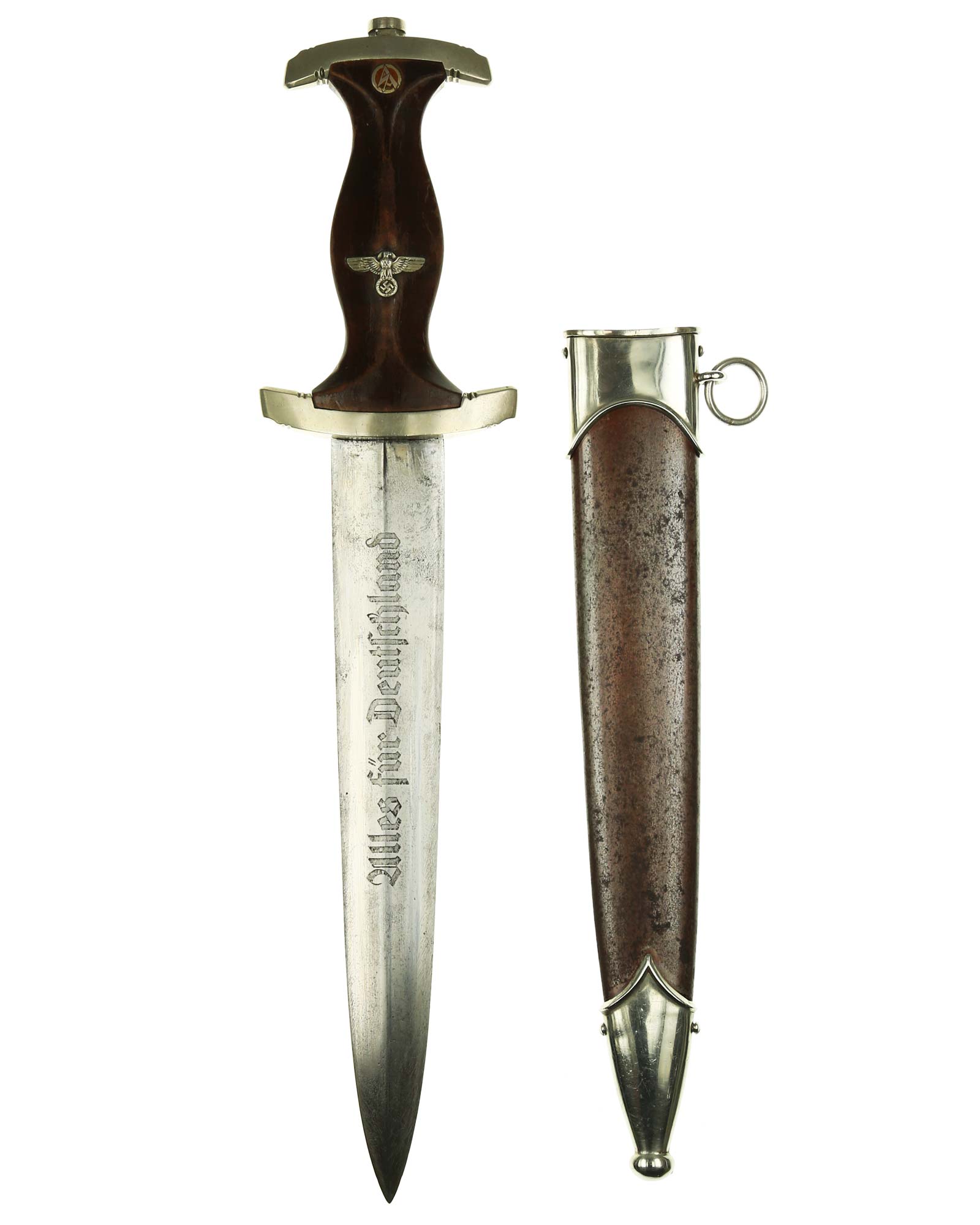 This SA [Sturmabteilung] Dagger in EXC+ condition. Model 1933. The total length is 37.1 cm. Early Nickel fittings, lower guard with "Wf" stamp. The Dagger has the maker mark on the blade: Ludwig Groten Solingen.