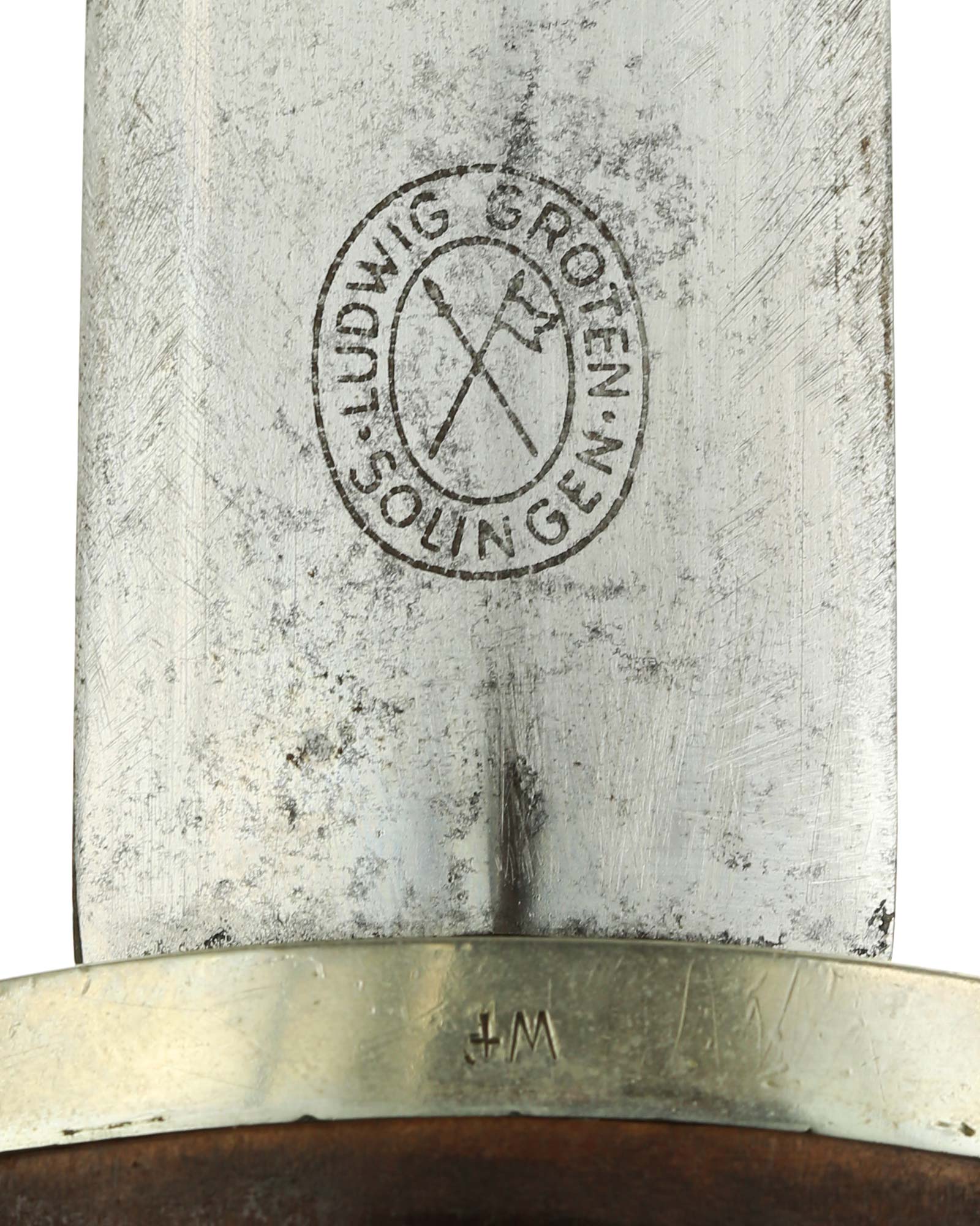 Blade: The blade of this example is still grades at about EXC. The SA motto Alles für Deutschland «Everything for Germany» is deep. The company logo is on the reverse ricasso: Ludwig Groten Solingen. The blade shoulders meet the crossguard contour.