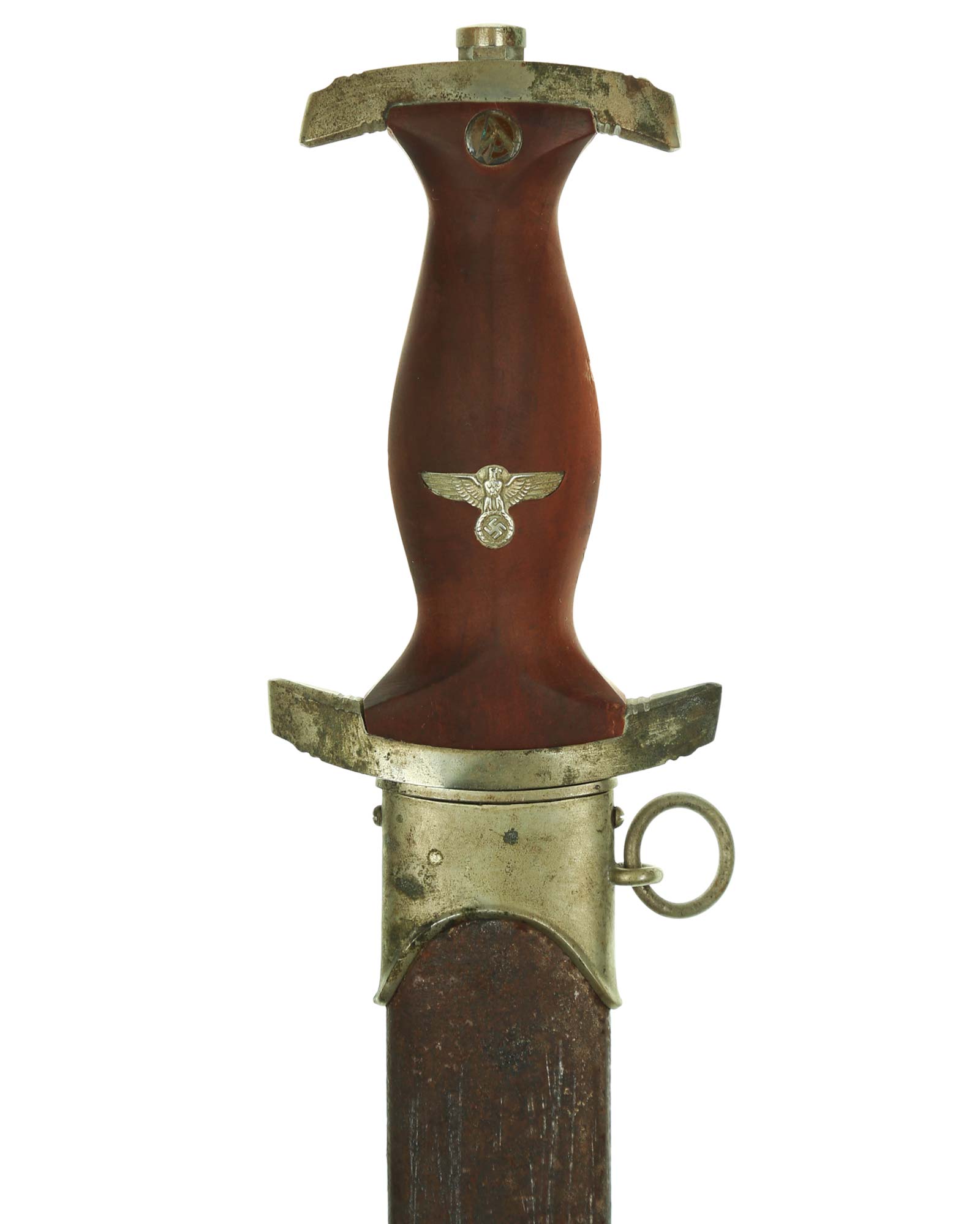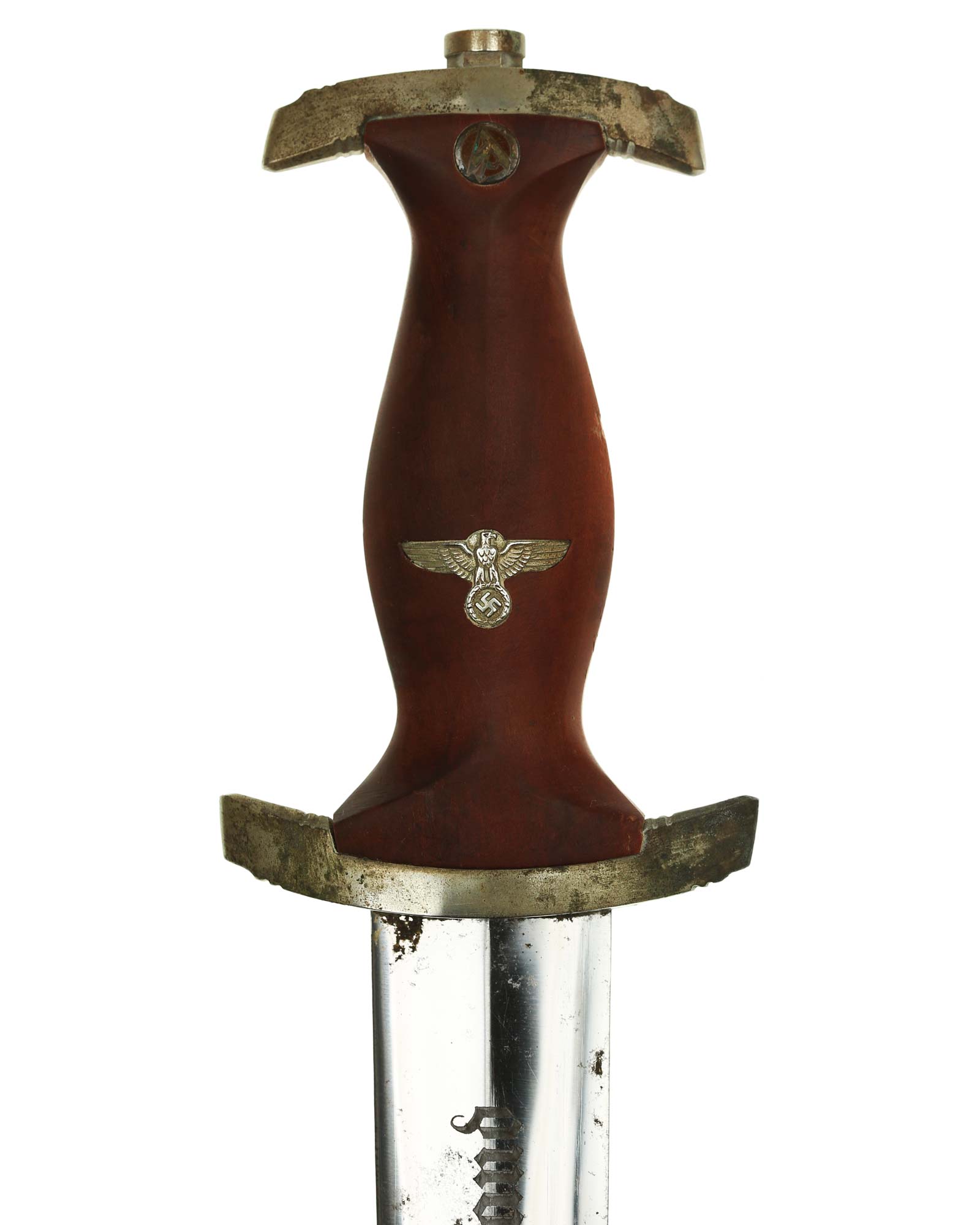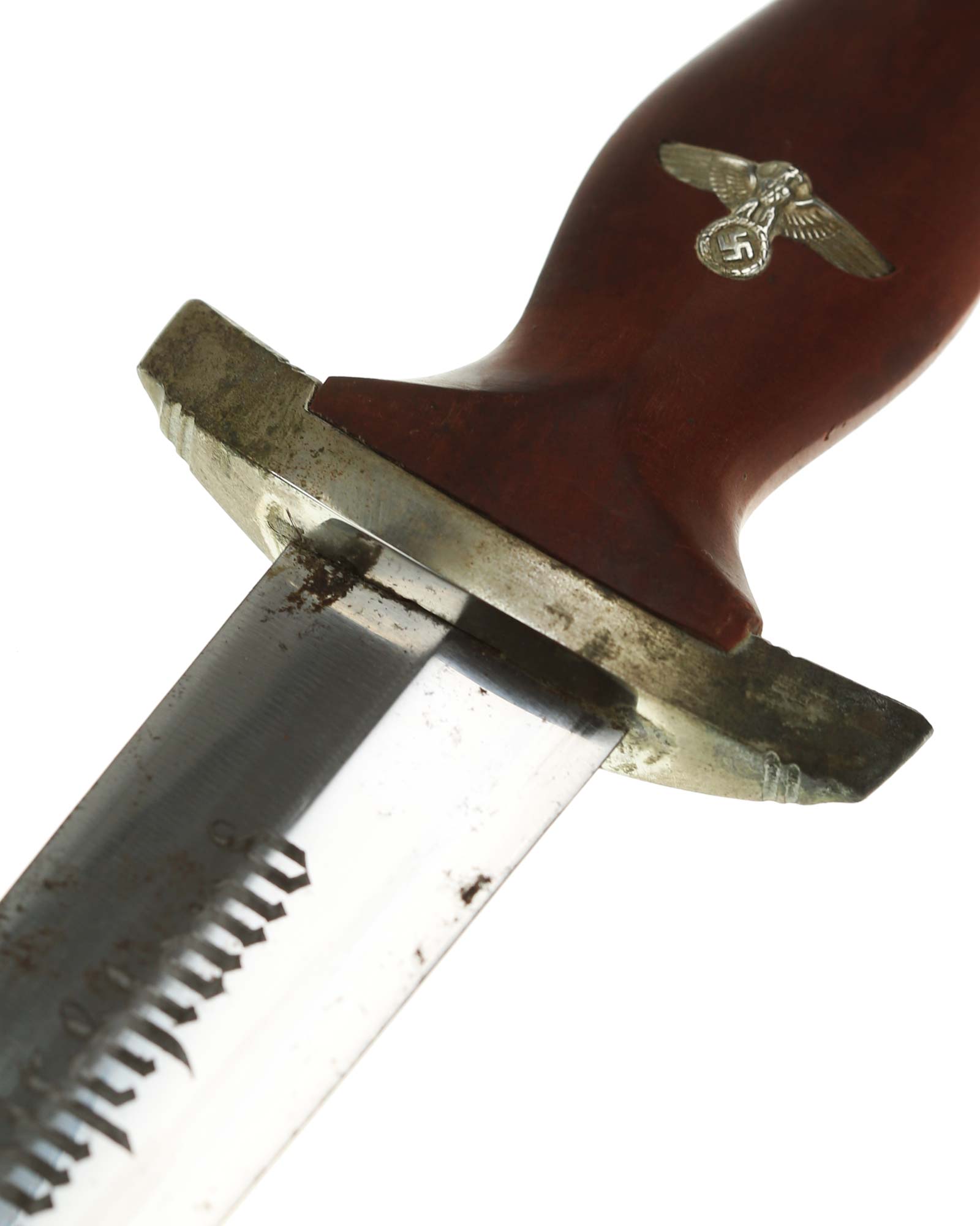 Grip: The mounts on this example are all solid nickel. The lower crossguard is Gruppe marked, “He”. The grip is a fine furniture-like wood. This grip is of medium contour construction and is in fine condition exactly meeting the crossguards. The SA runes button has good enamel and is perfectly placed. This eagle is in fine condition throughout having full details to its head, eye, breast and wing feathering, talons, wreath and mobile swastika.