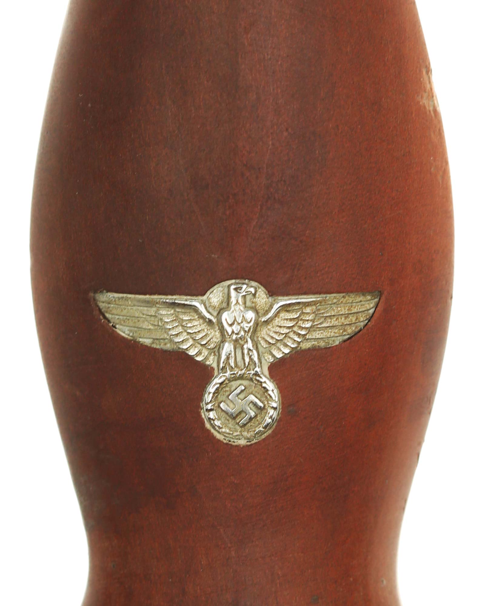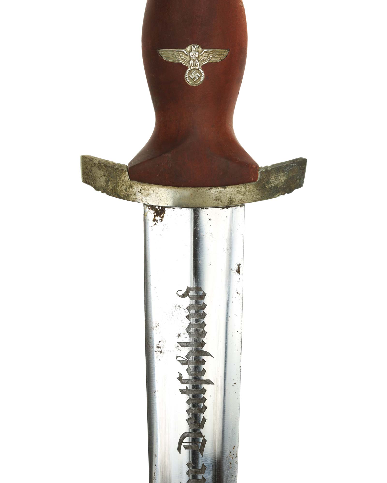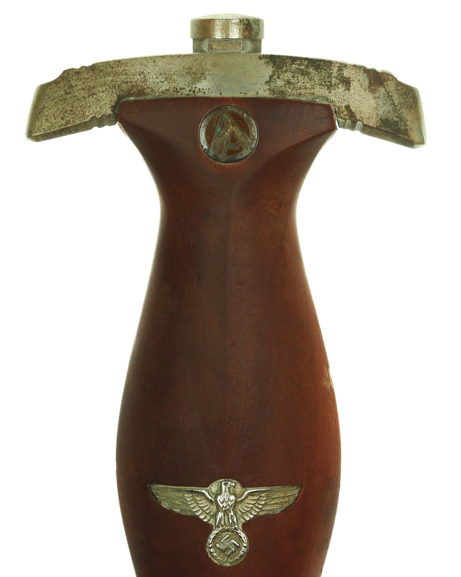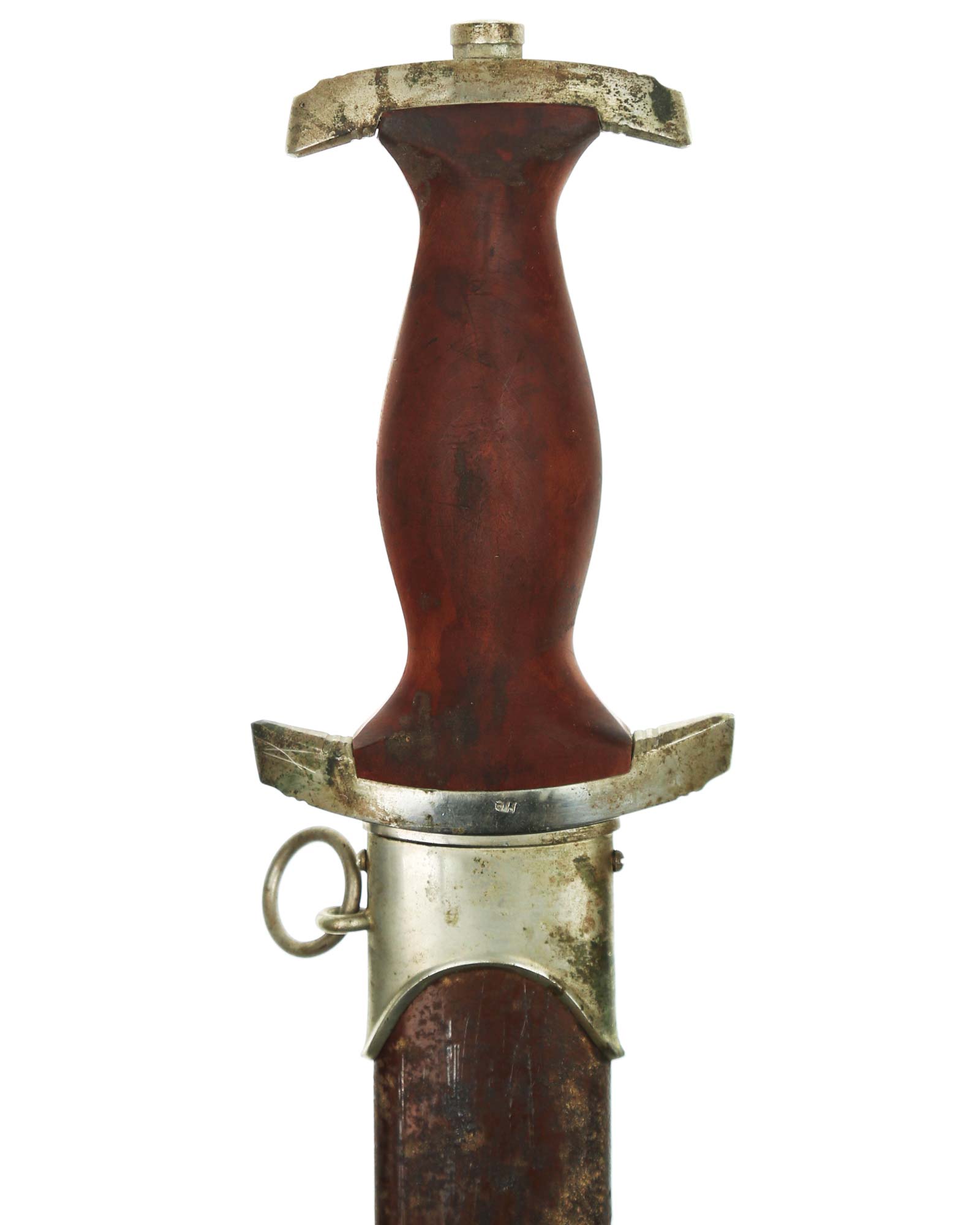 Grip: The mounts on this example are all solid nickel. The lower crossguard is Gruppe marked, “He”. The grip is a fine furniture-like wood. This grip is of medium contour construction and is in fine condition exactly meeting the crossguards. The SA runes button has good enamel and is perfectly placed. This eagle is in fine condition throughout having full details to its head, eye, breast and wing feathering, talons, wreath and mobile swastika.